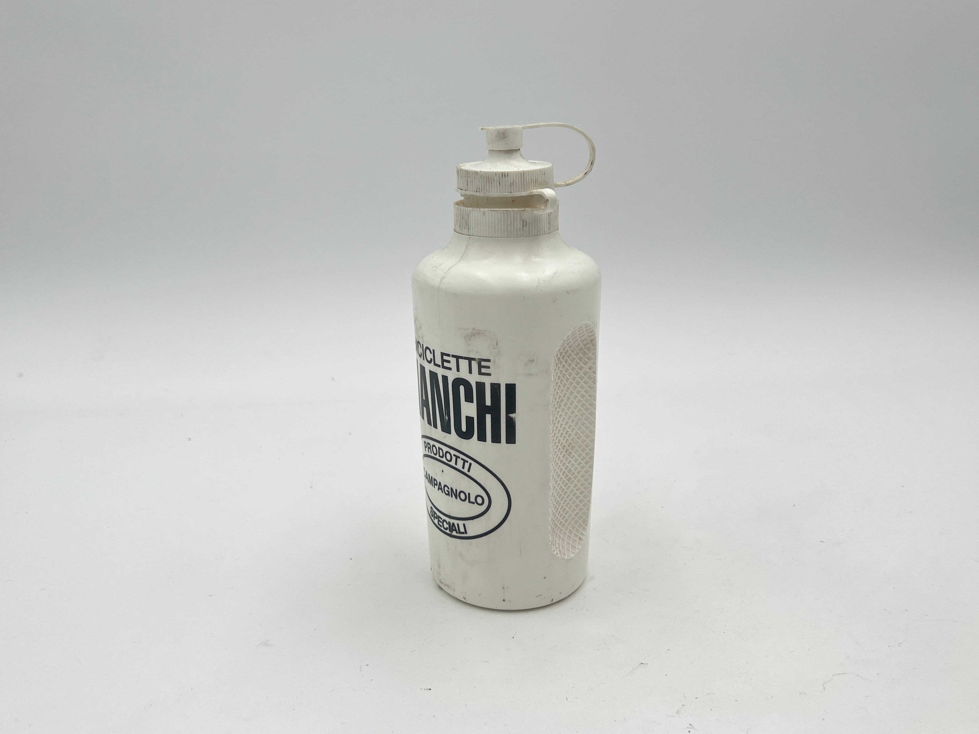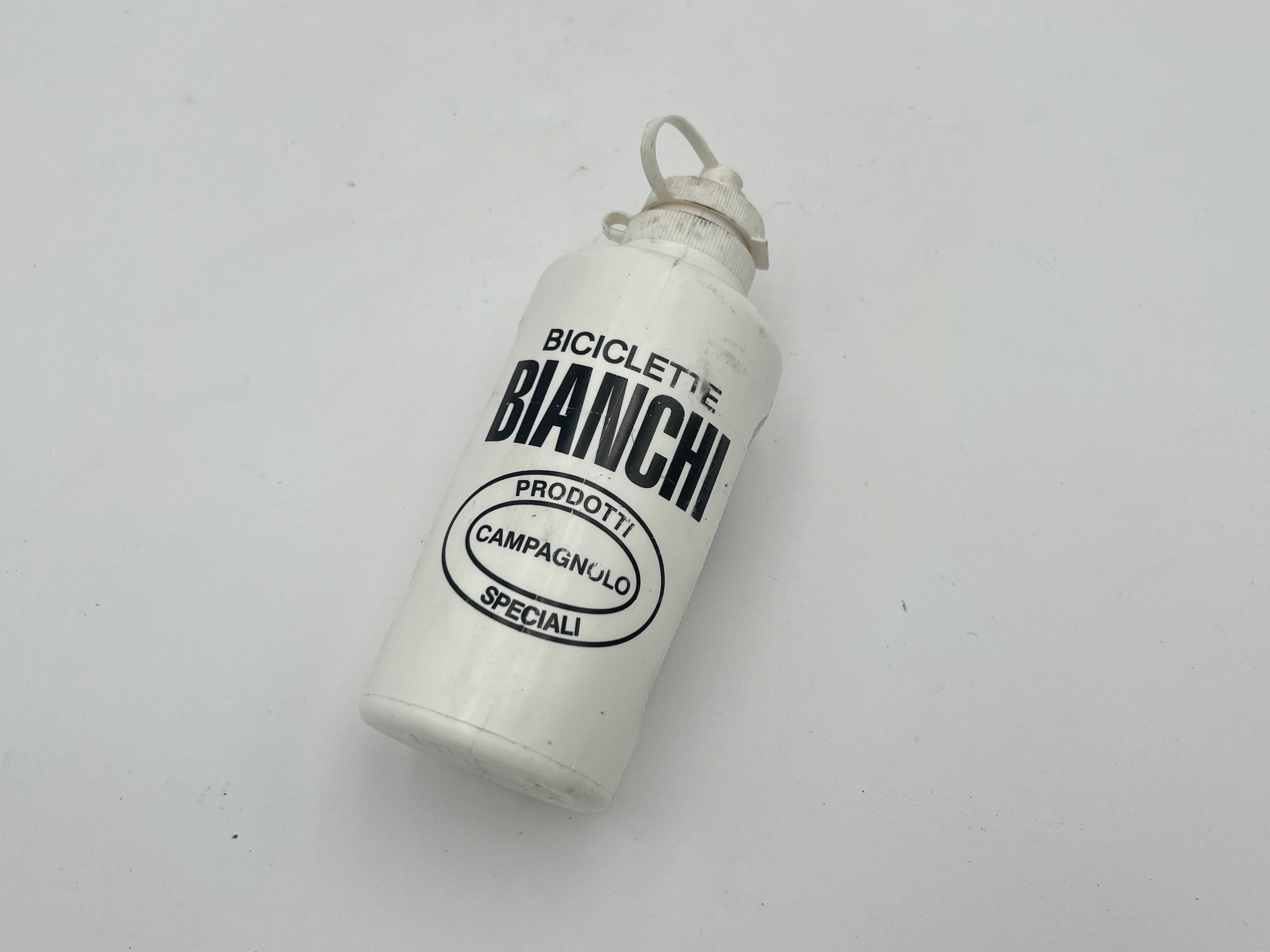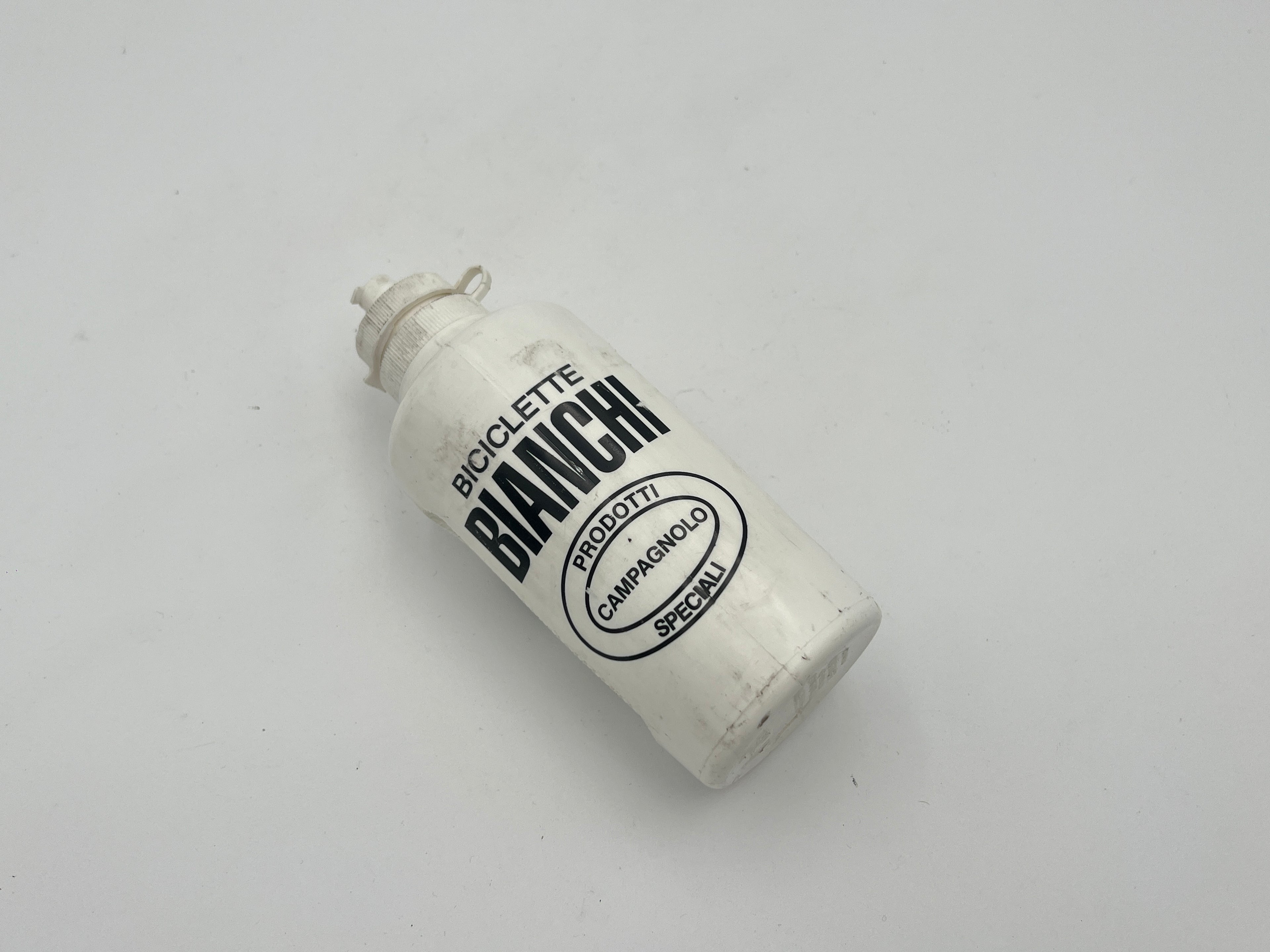Great Bianchi Water Bottle. The perfect bottle to finish your roadbike. It's a white bottle with Bianchi and Campagnolo signs on it. Used but clean condition.