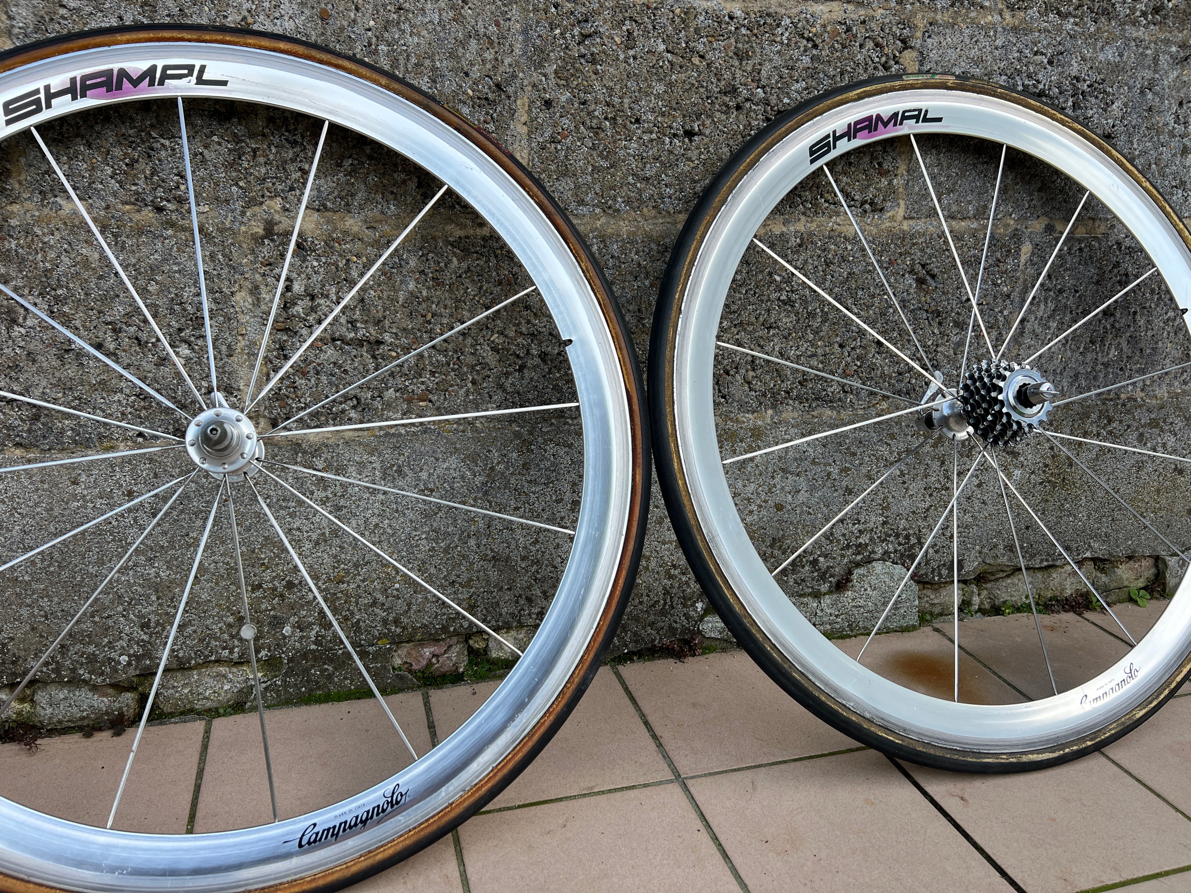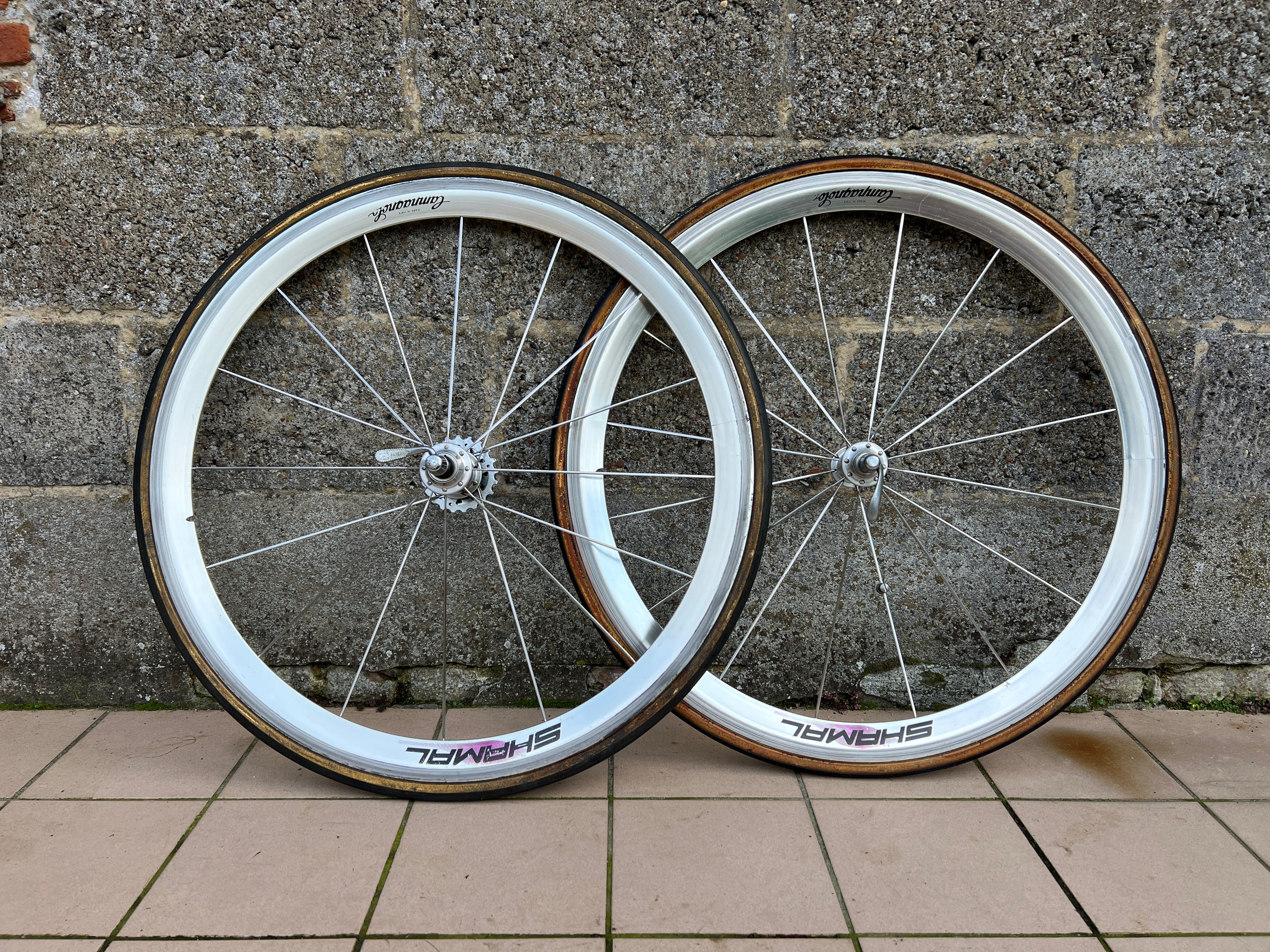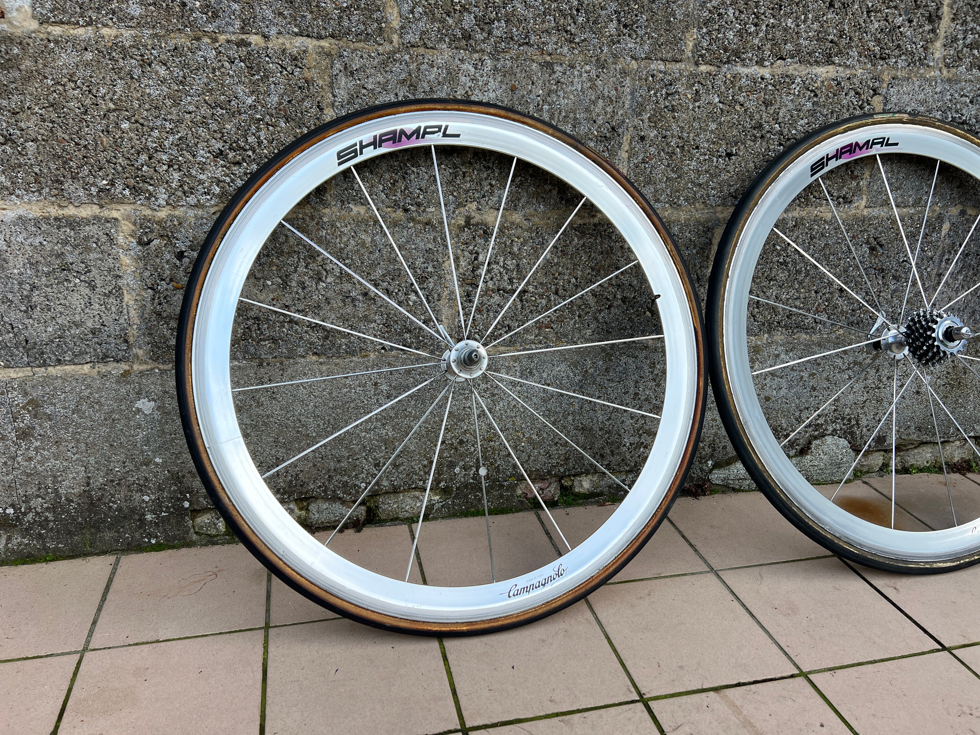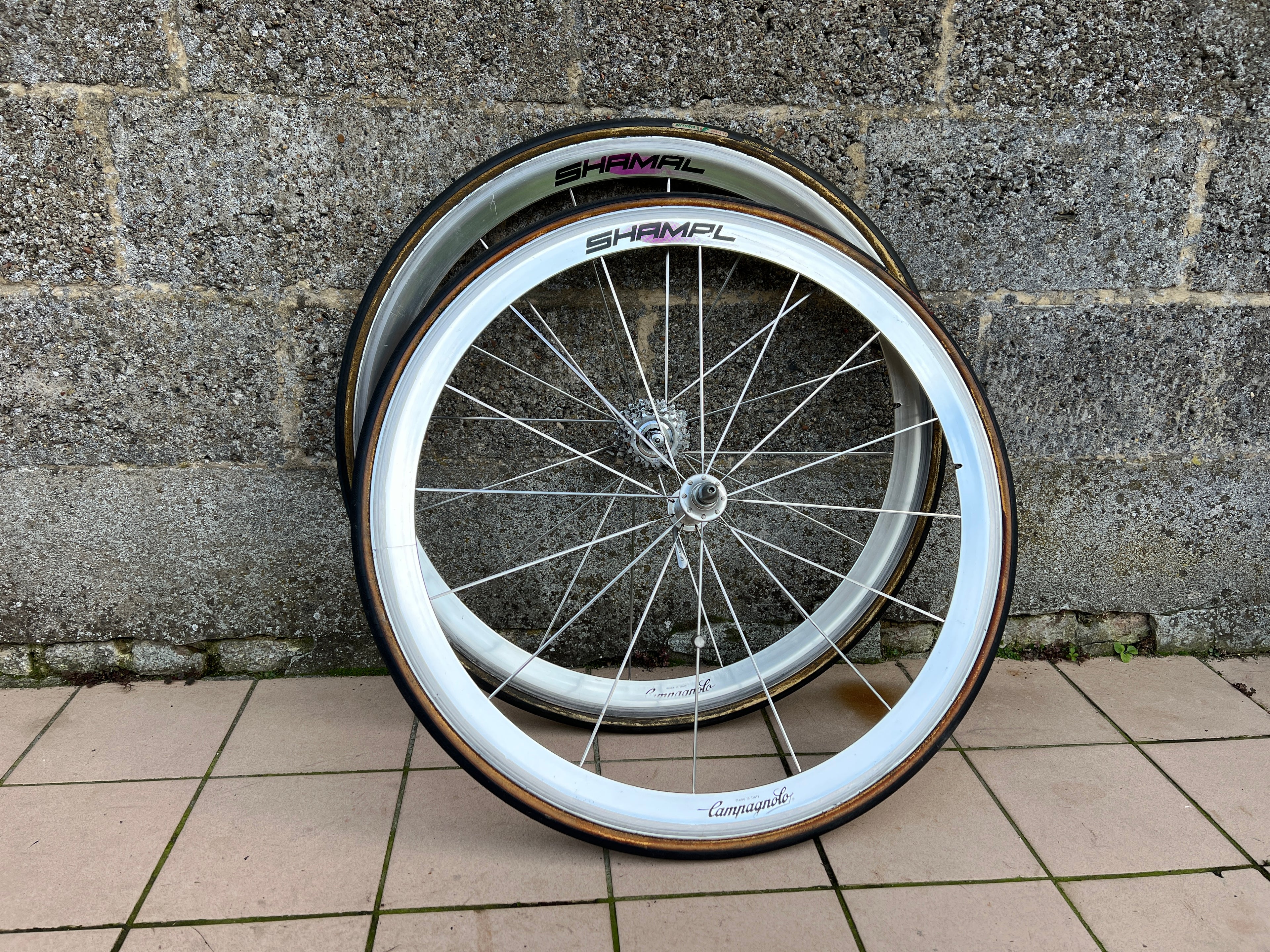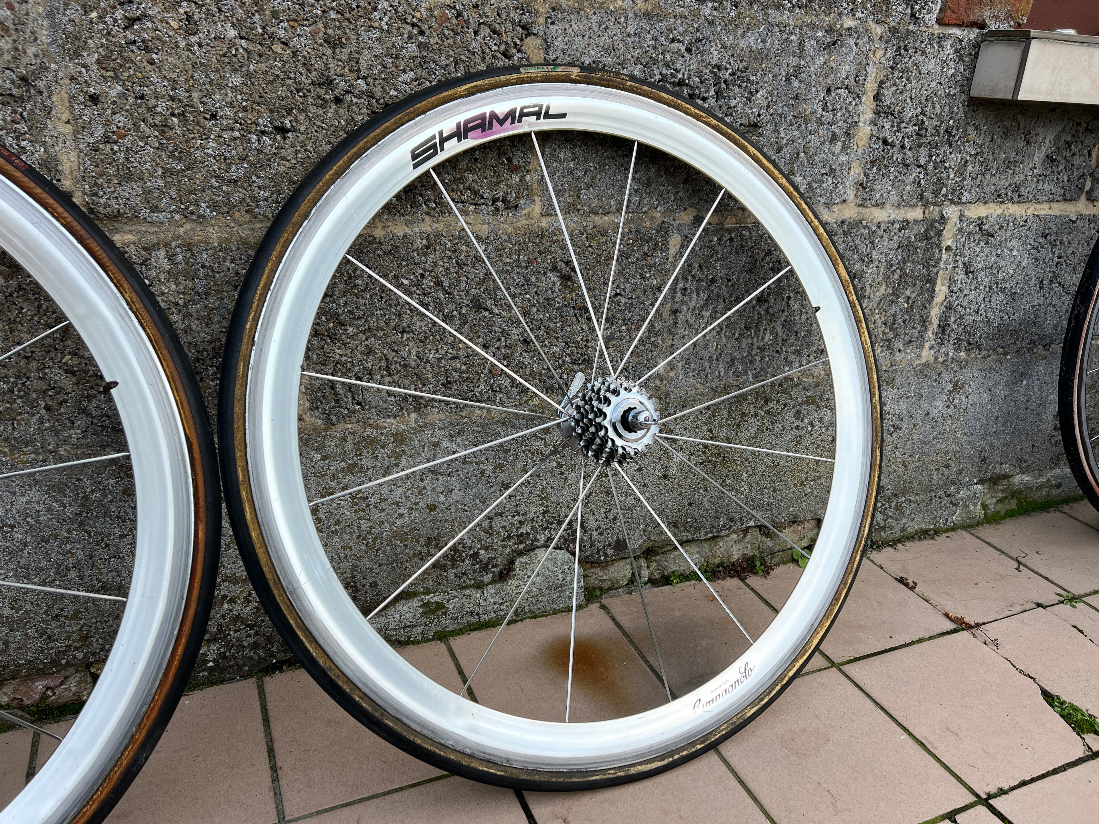 The ultimate vintage high-profile wheelset is a pair of Campagnolo Shamal wheels. This 700C pair is a tubular wheelset and comes complete with the body, Campagnolo casette and skewers. One of those is a non original C-Record skewer. A fantastic wheelset. Perfect for completing your high-end road bike.