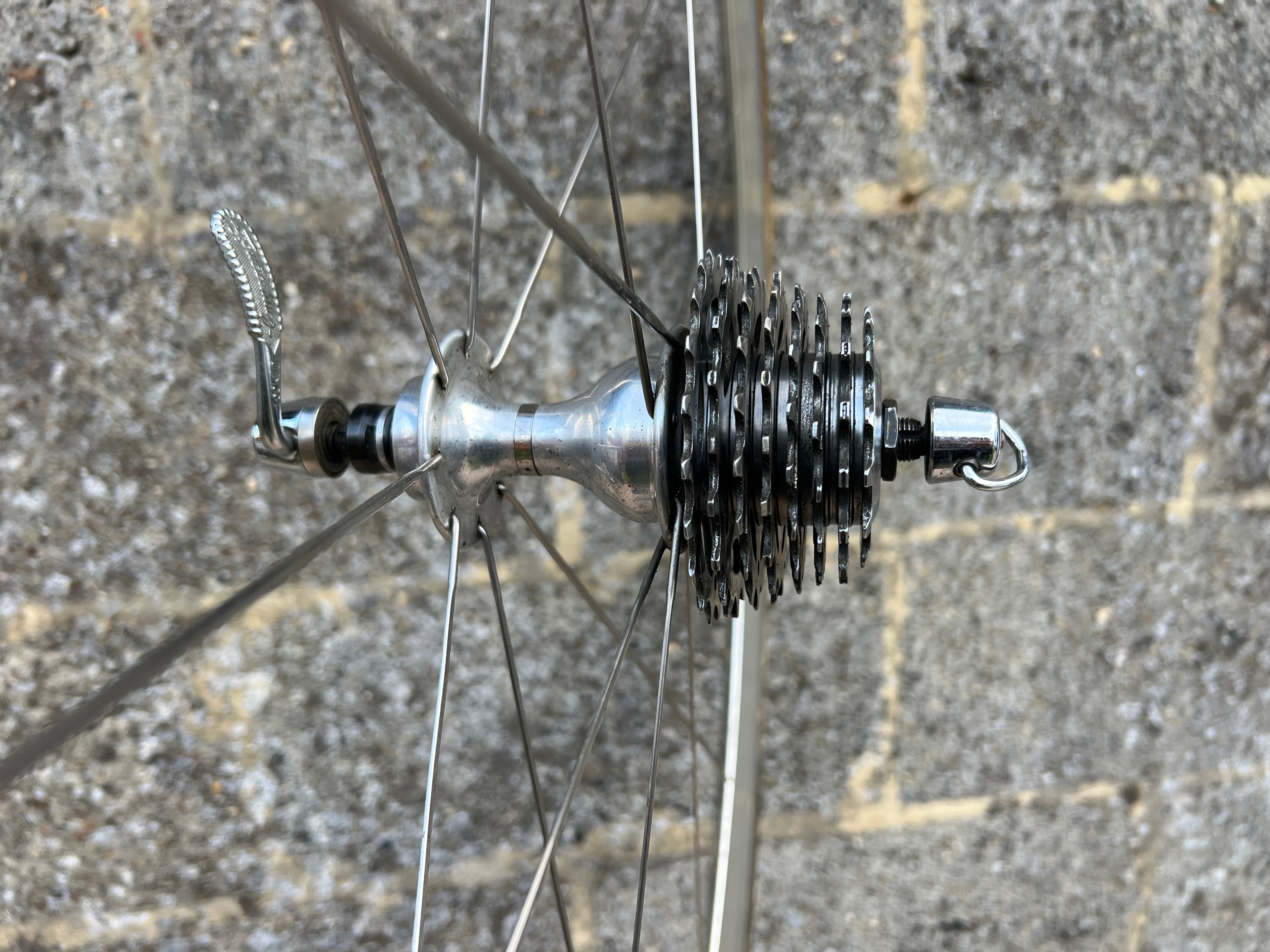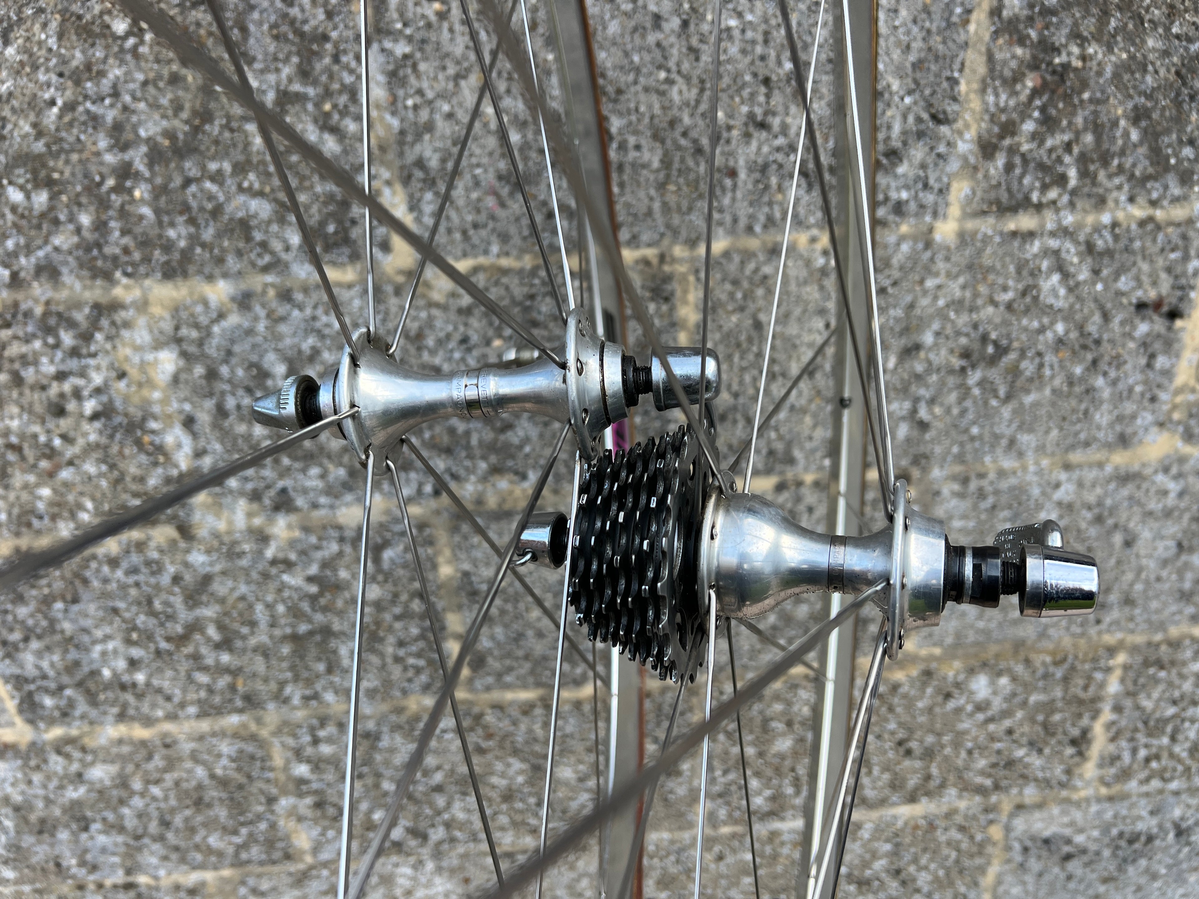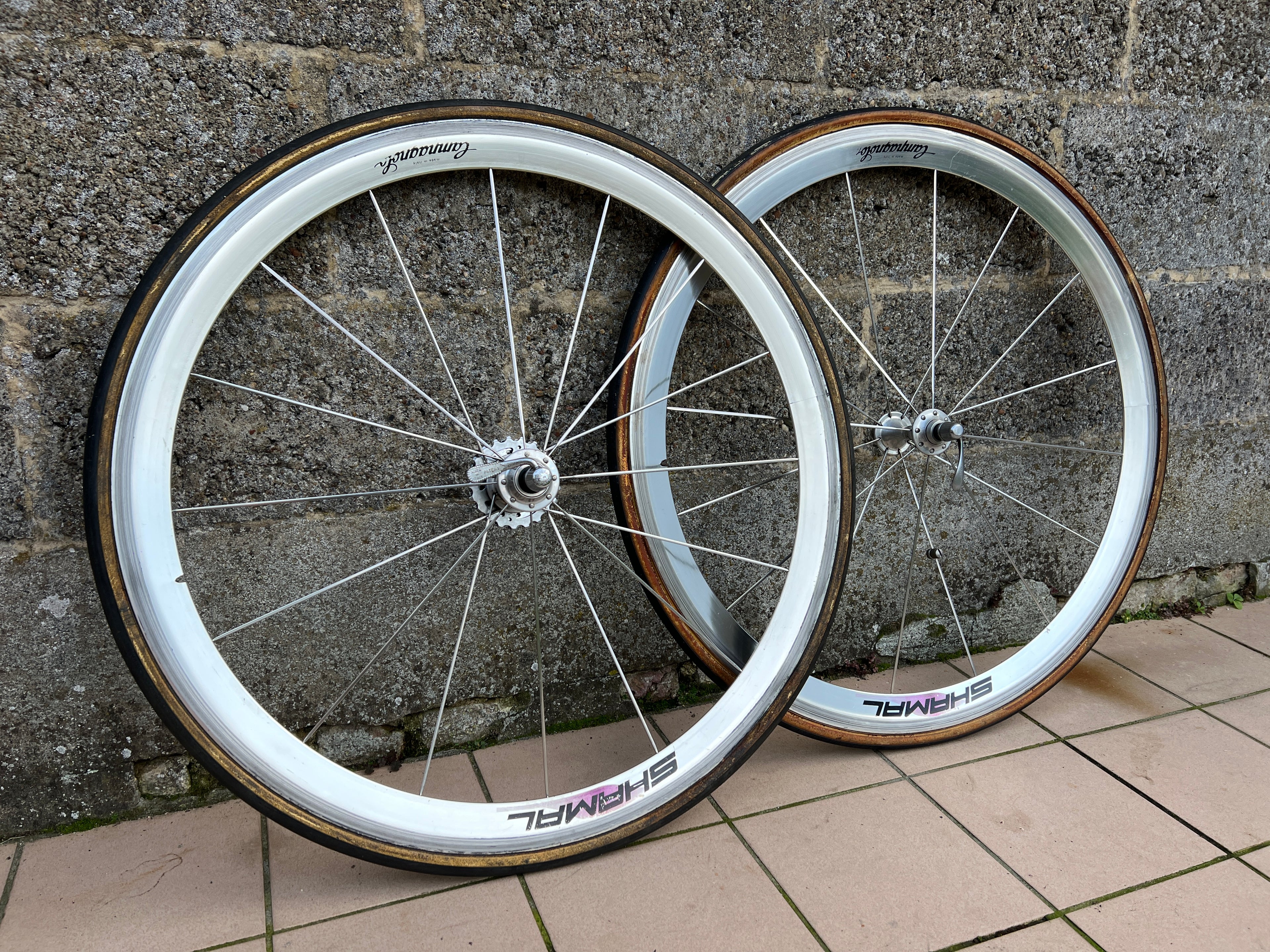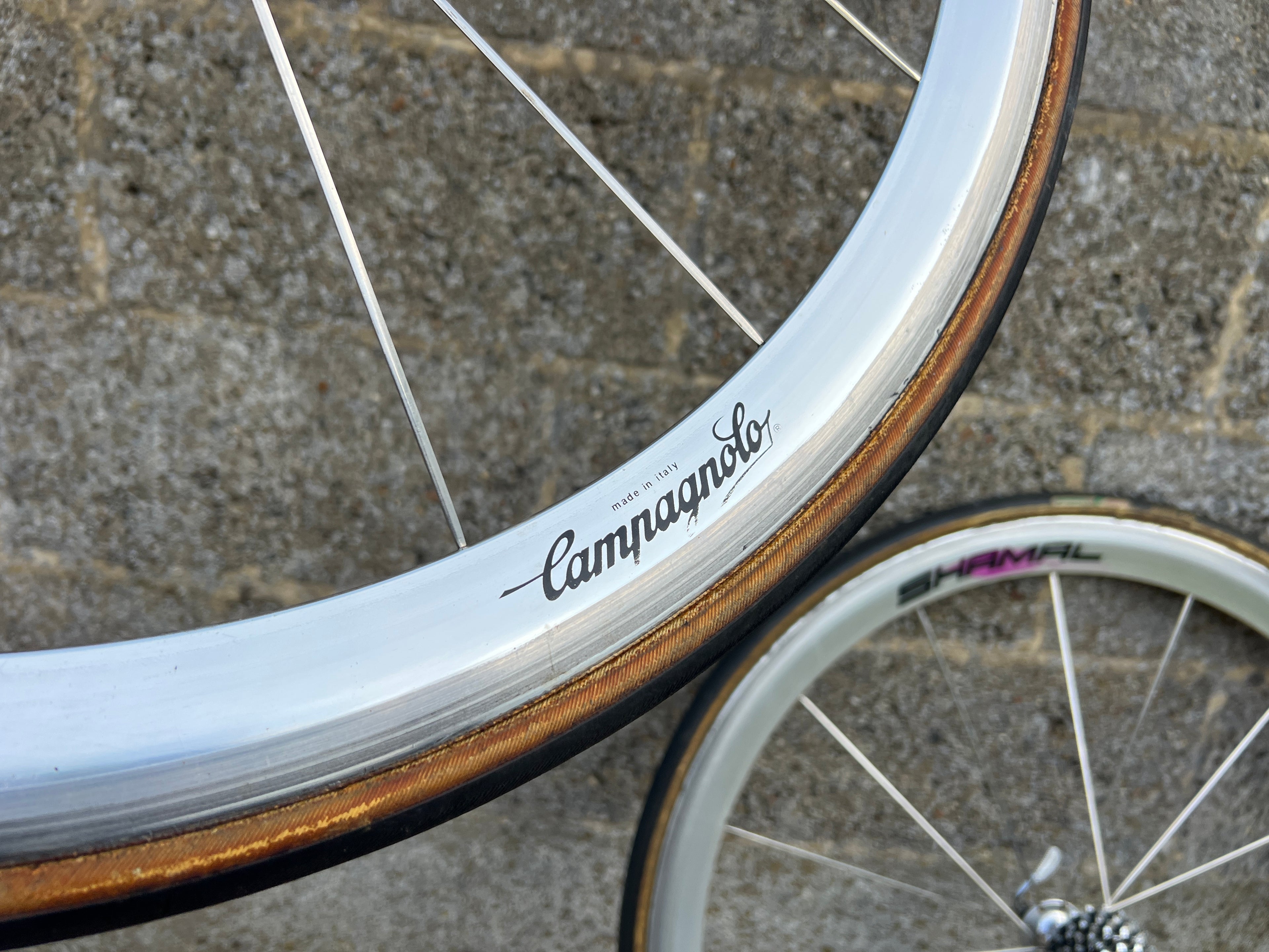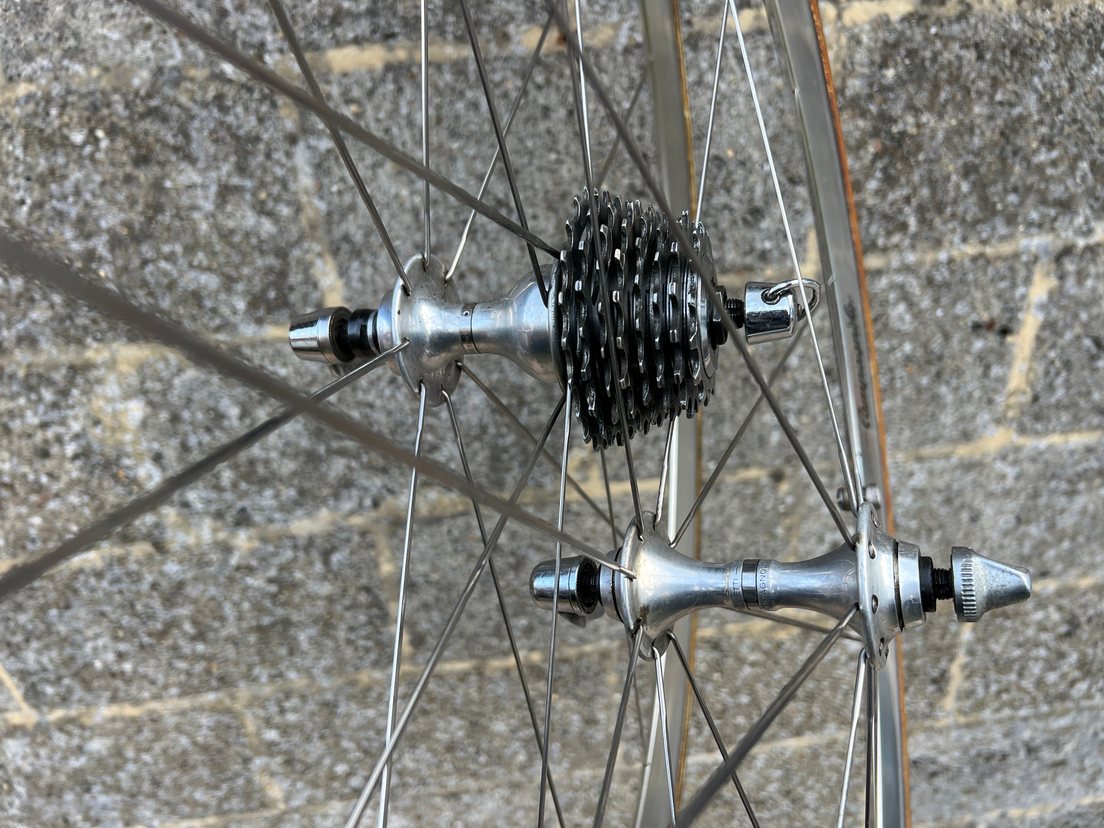 The ultimate vintage high-profile wheelset is a pair of Campagnolo Shamal wheels. This 700C pair is a tubular wheelset and comes complete with the body, Campagnolo casette and skewers. One of those is a non original C-Record skewer. A fantastic wheelset. Perfect for completing your high-end road bike.