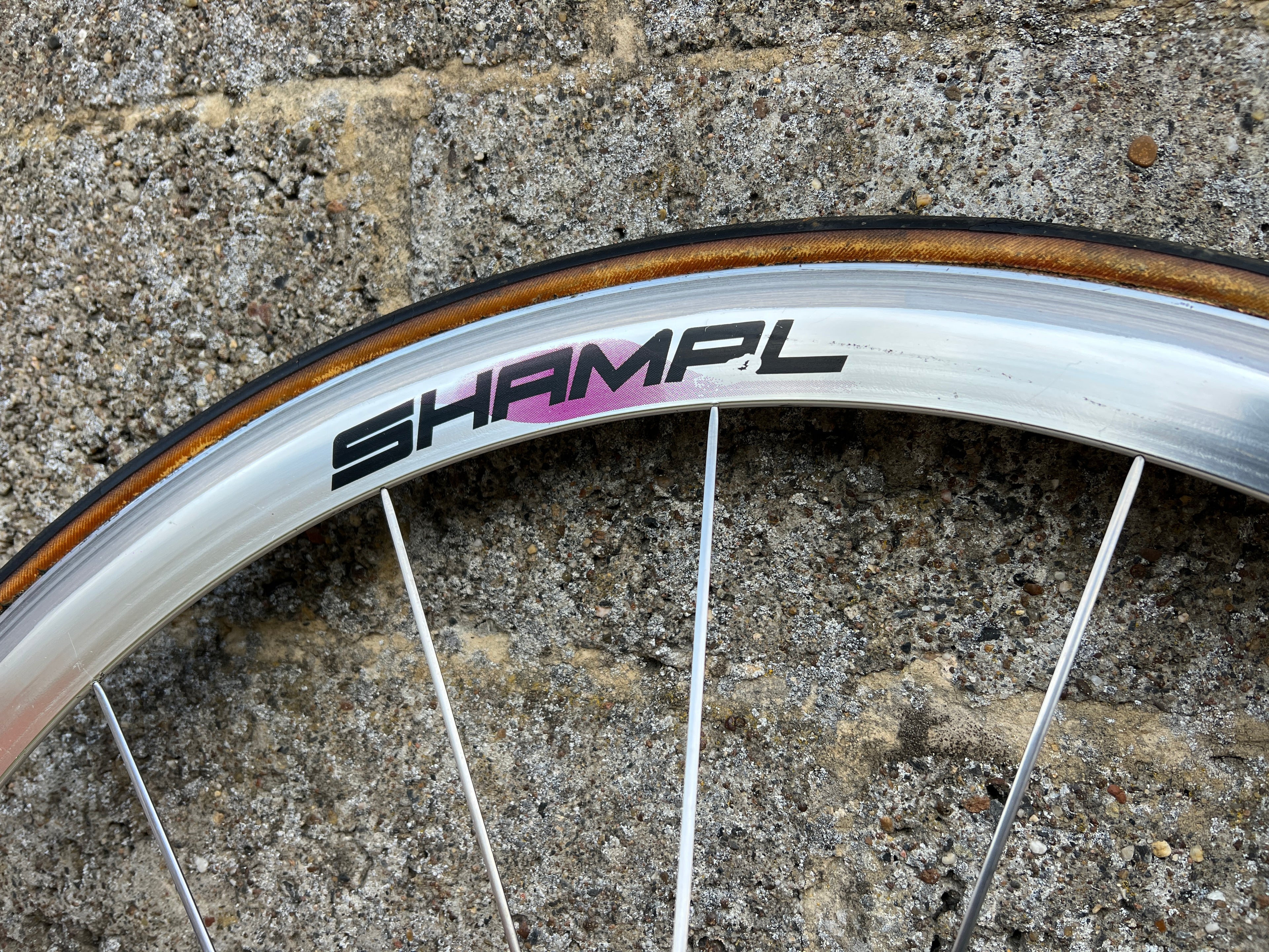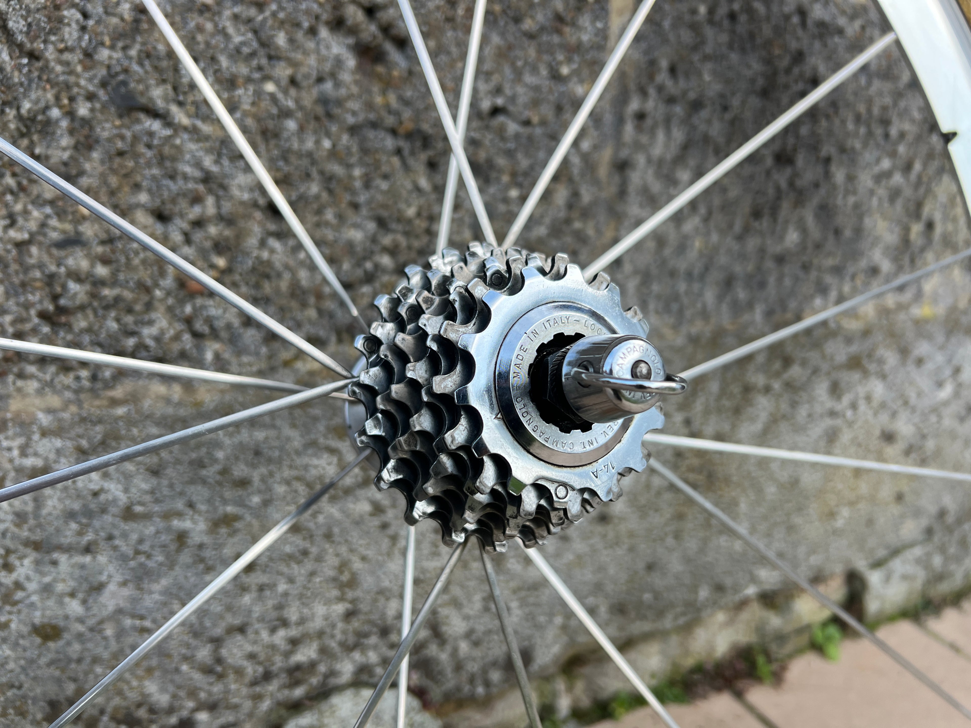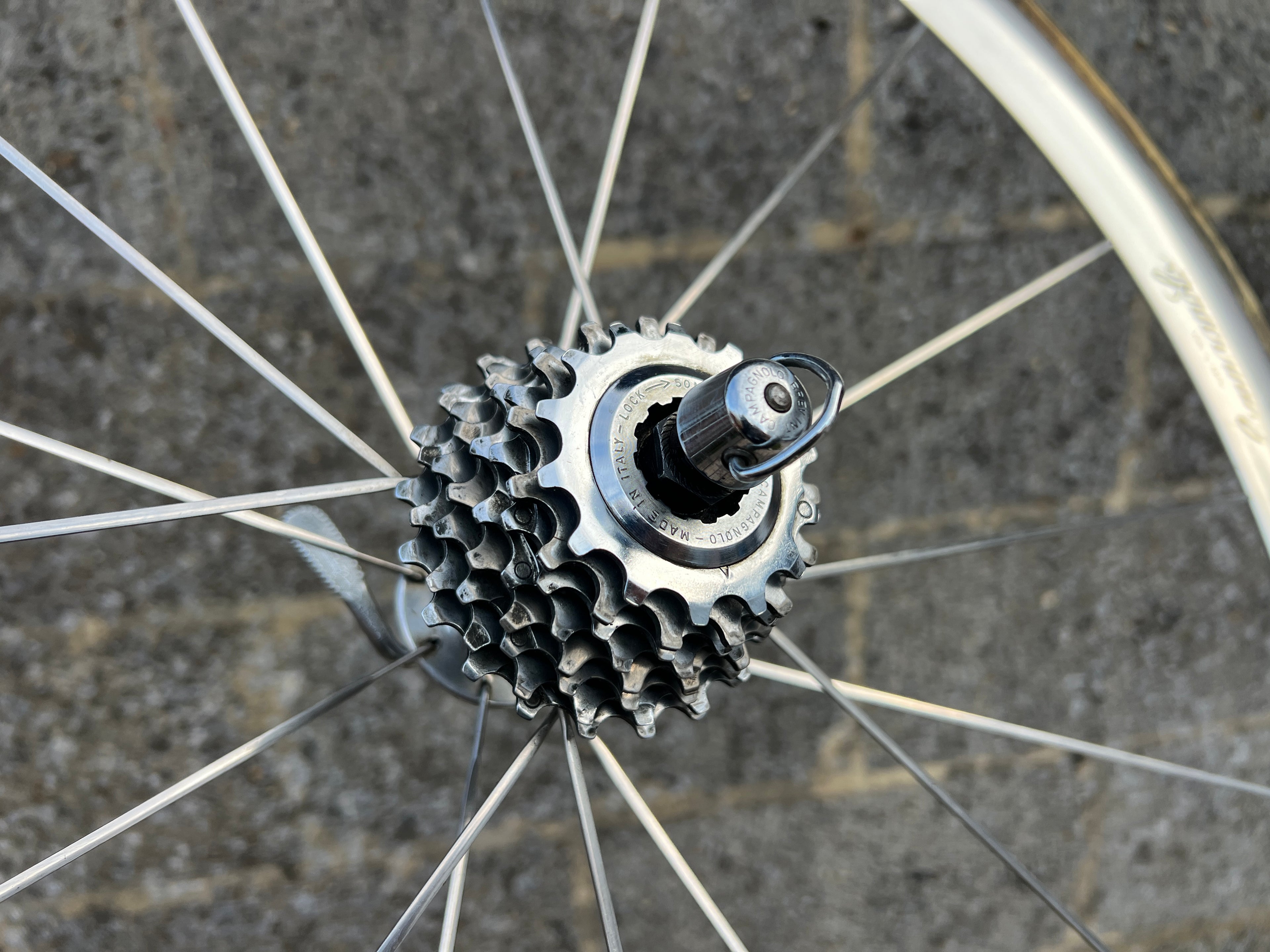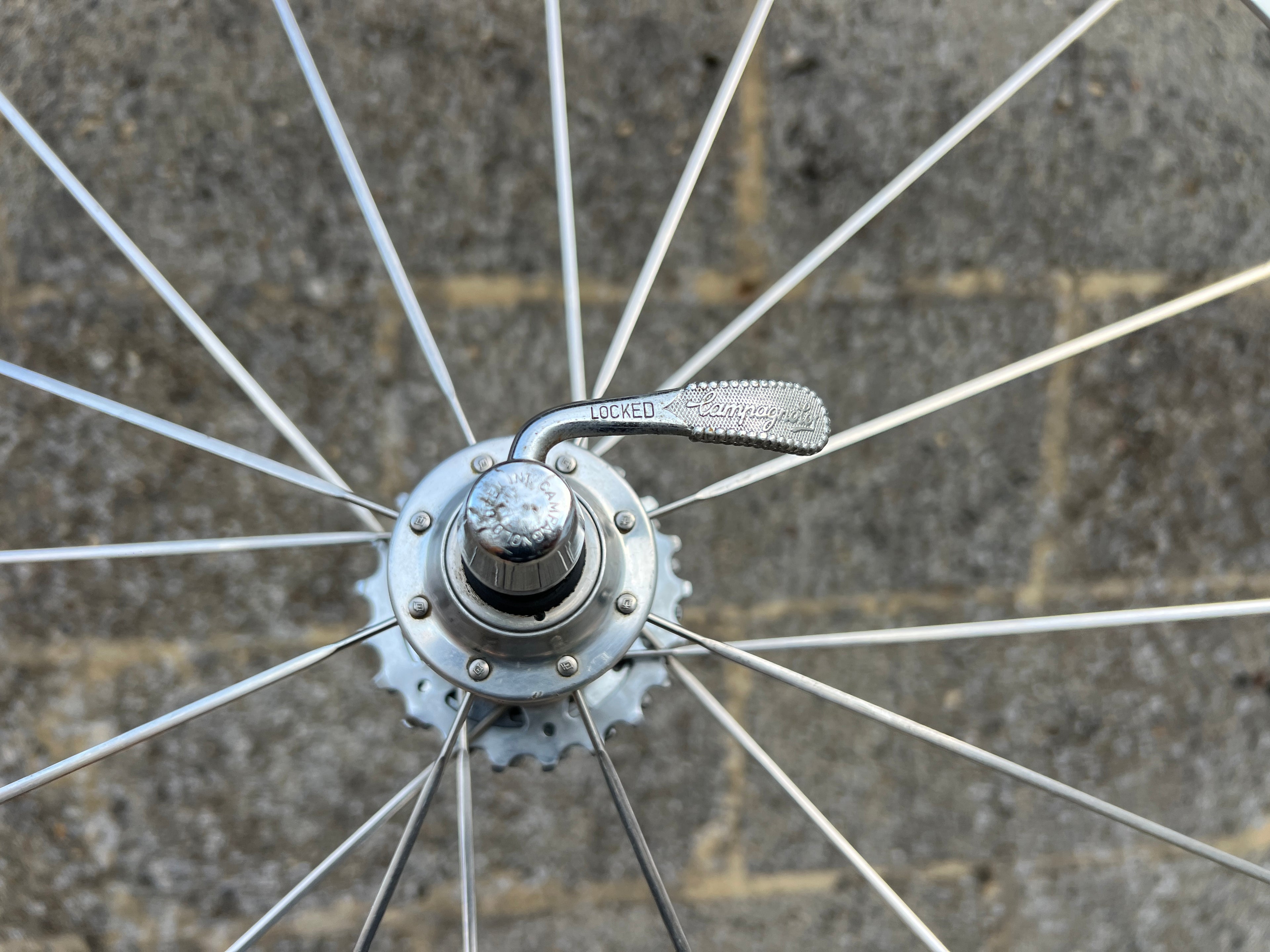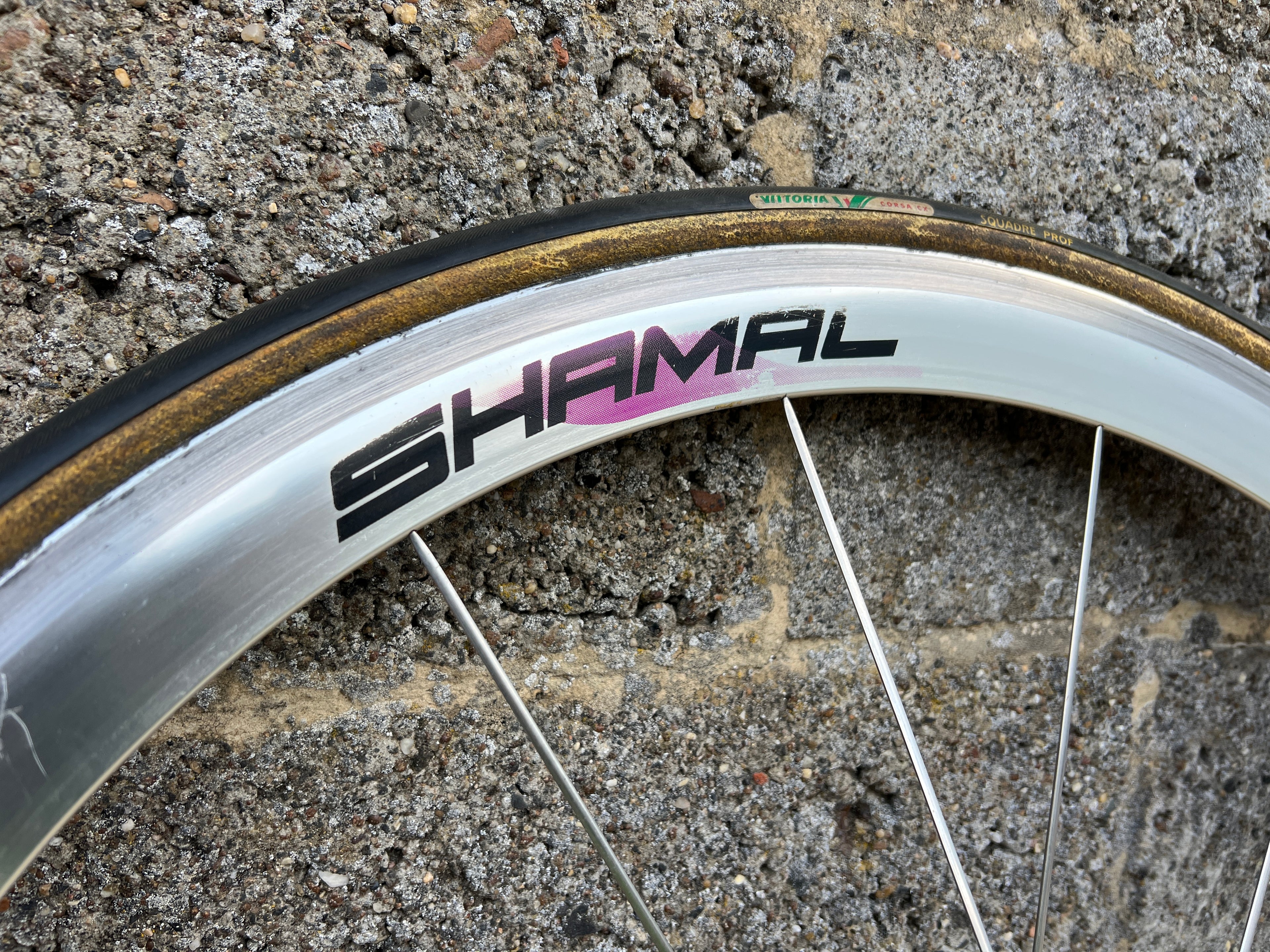 The ultimate vintage high-profile wheelset is a pair of Campagnolo Shamal wheels. This 700C pair is a tubular wheelset and comes complete with the body, Campagnolo casette and skewers. One of those is a non original C-Record skewer. A fantastic wheelset. Perfect for completing your high-end road bike.