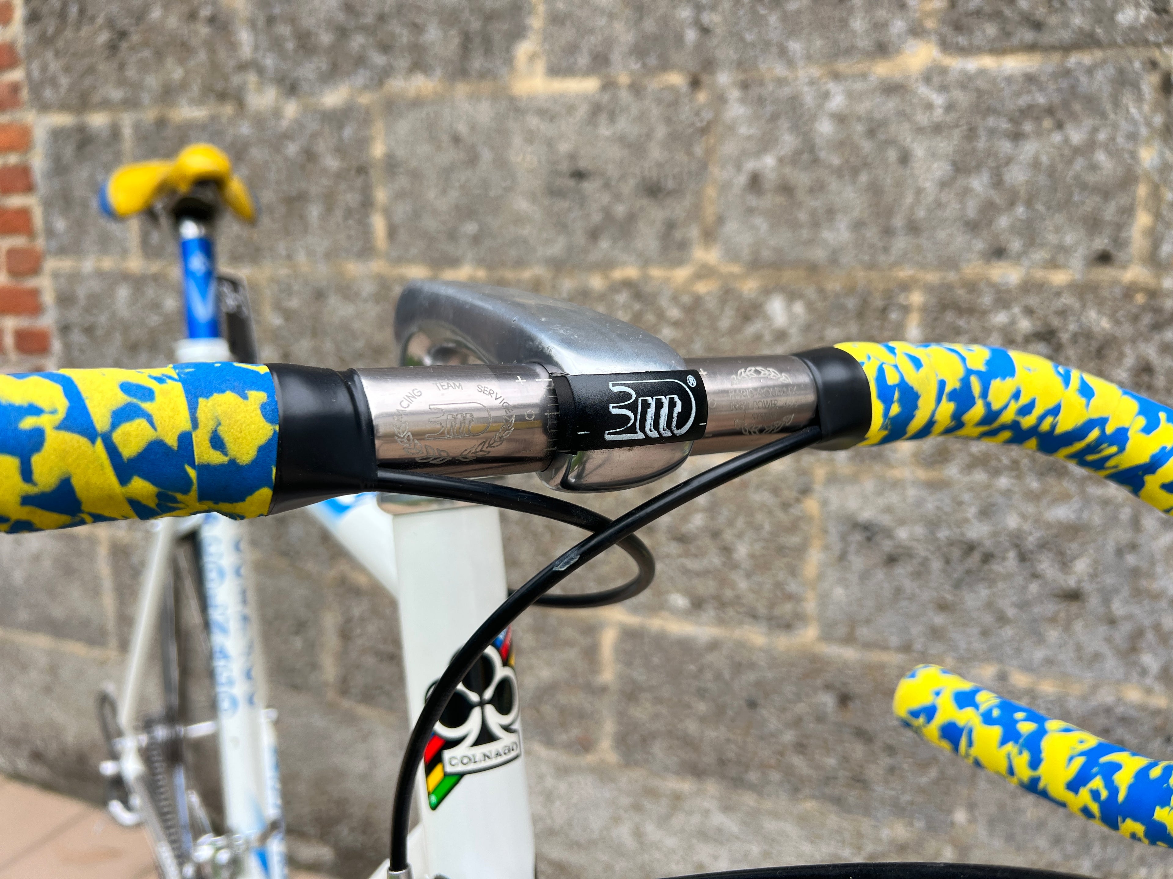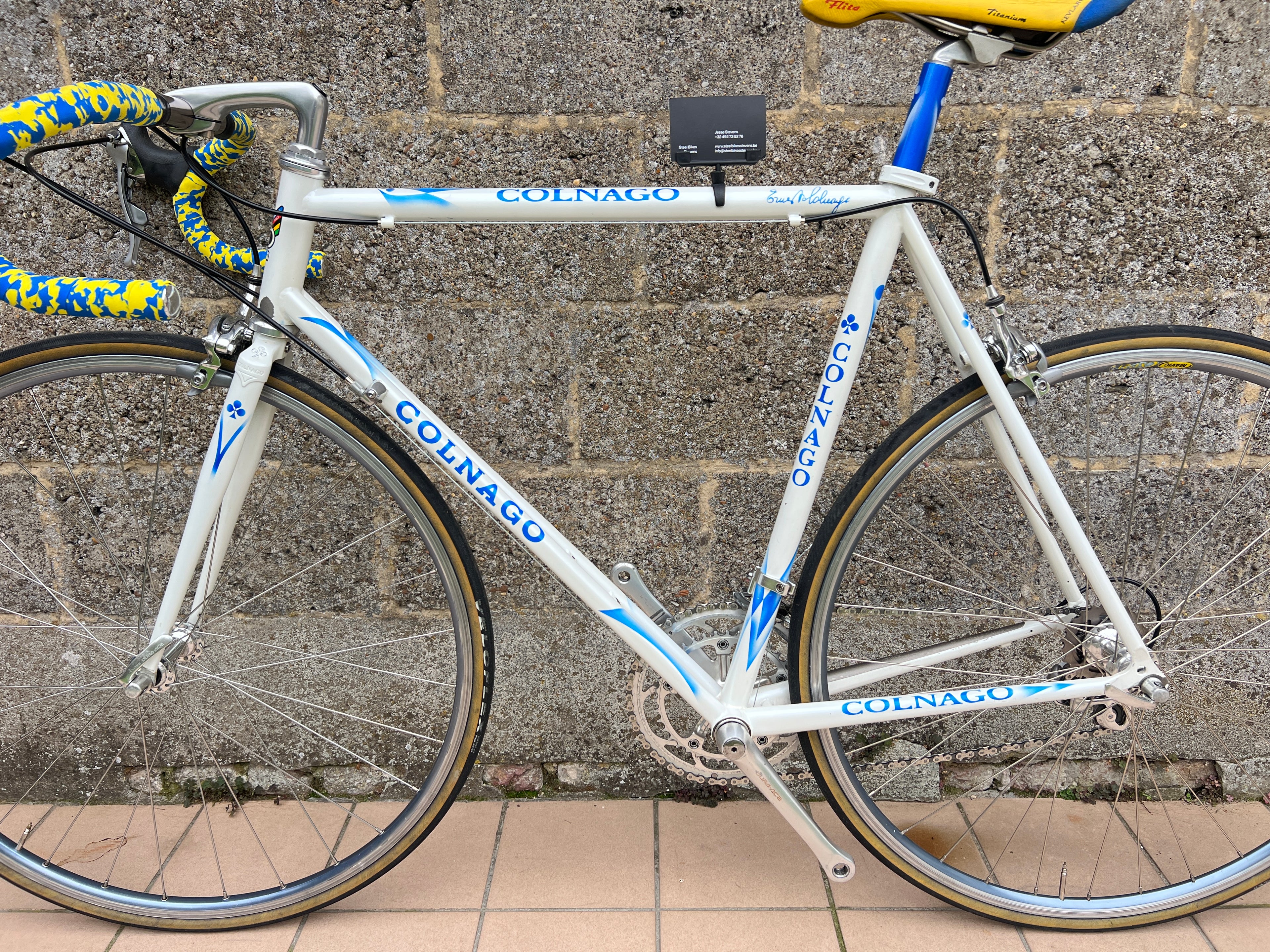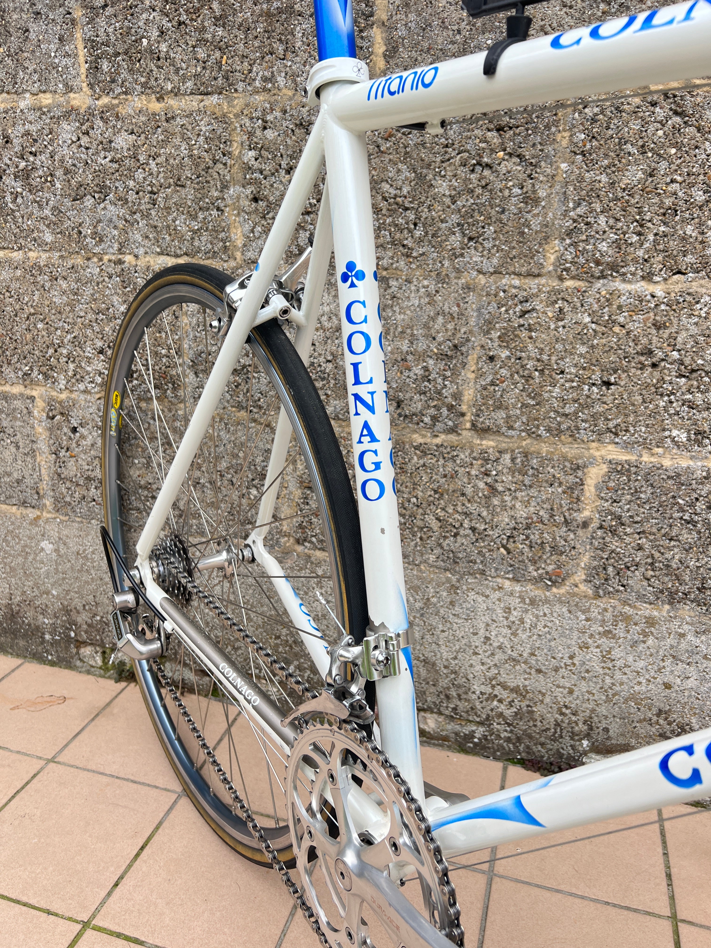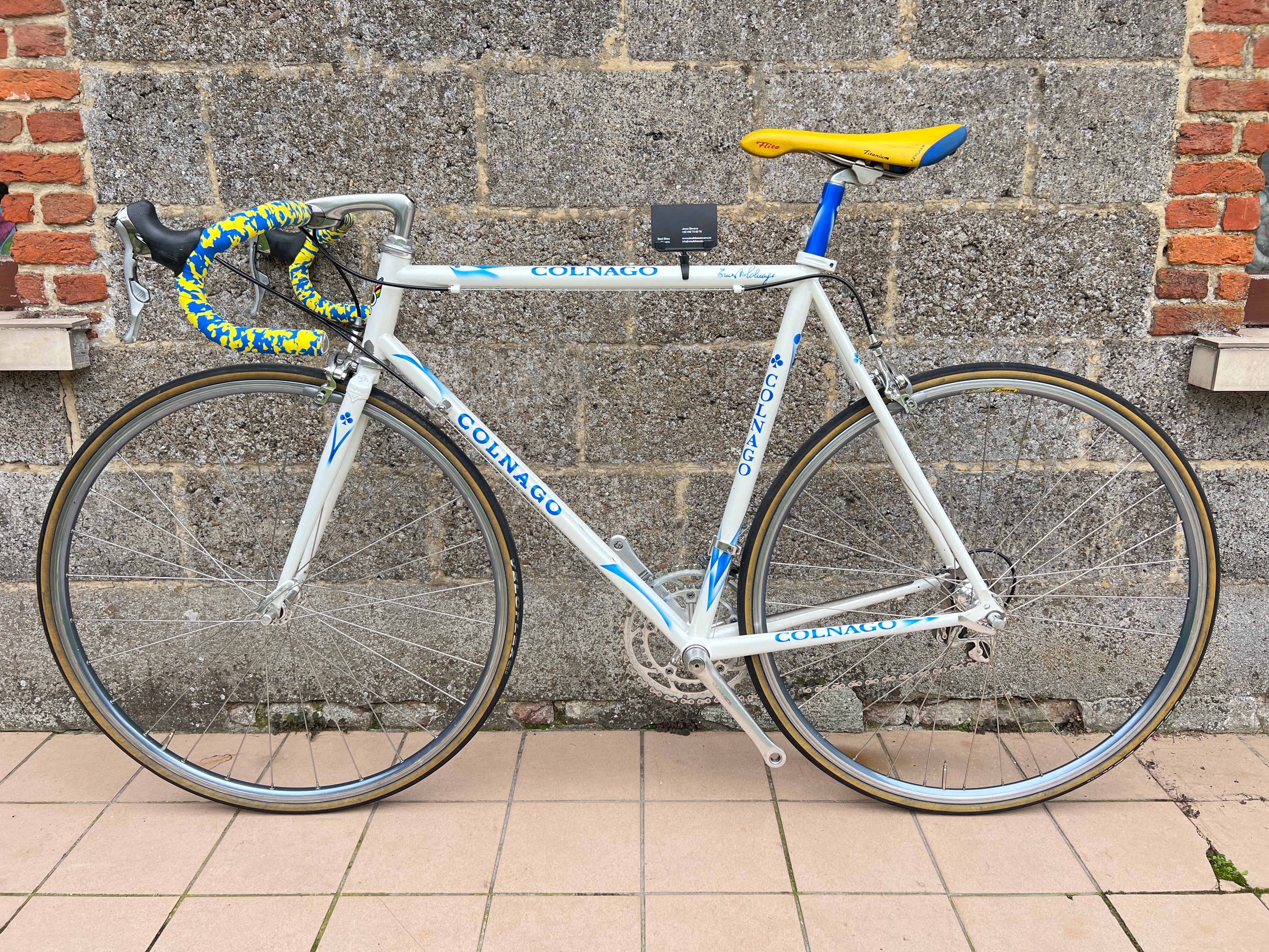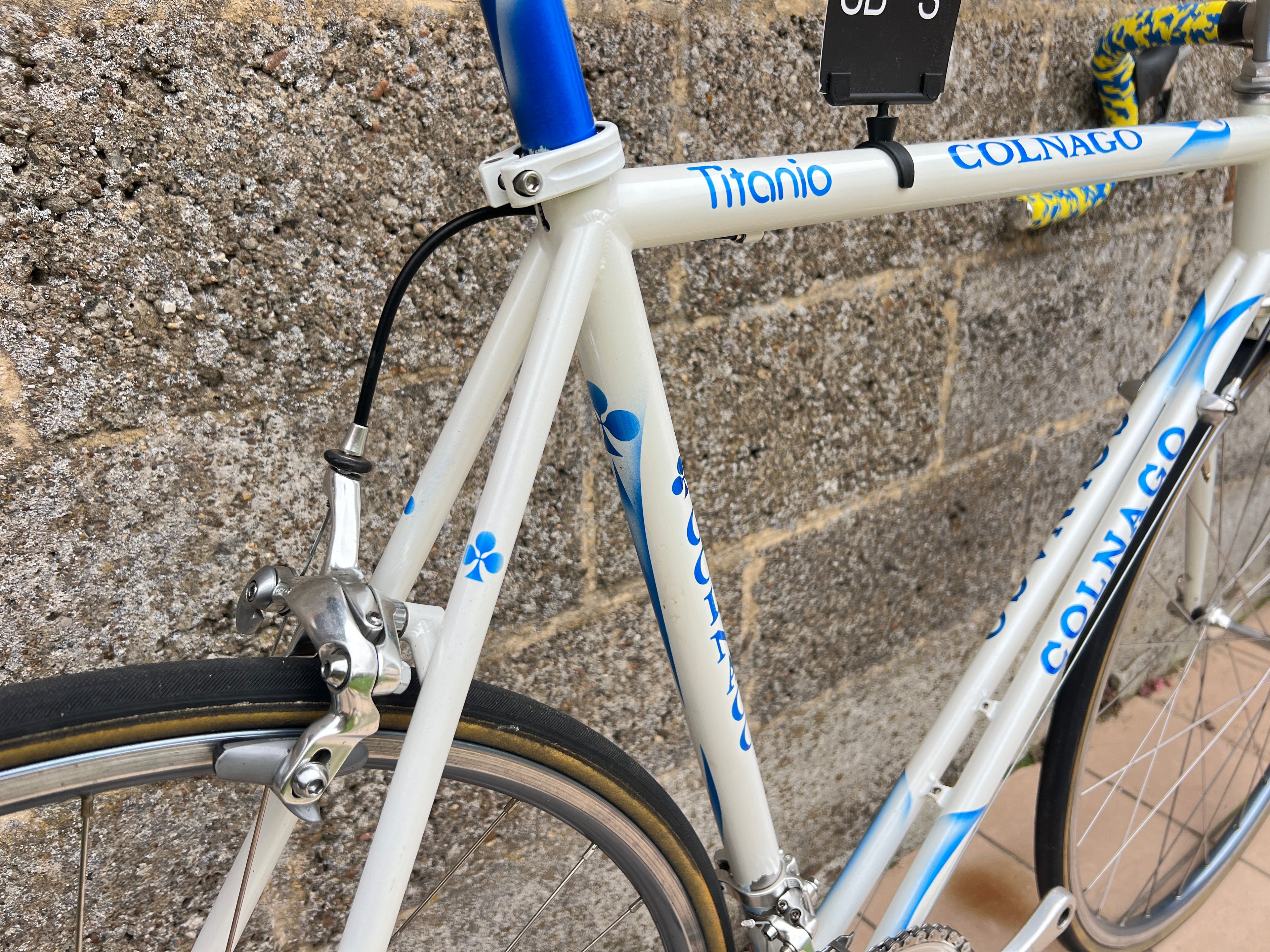 An exceptional opportunity to acquire a true icon of 1990s Italian craftsmanship. The Colnago Bititan Titanio. Presented here in the ultra-rare Tony Rominger colorway. This masterpiece combines Colnago’s legendary titanium frame design with the unmistakable double downtube construction. A hallmark of innovation and aesthetics from Ernesto Colnago’s golden era. Every detail reflects precision and artistry. From the signature Colnago pantograph engravings on the fork to the custom-painted seatpost, finished to order. The bike is equipped with a complete Shimano Dura-Ace groupset. It features clincher wheels. Please note that one rim shows a minor hairline crack around a spoke nipple. Having spent years as part of a private collection, this Bititan has been beautifully preserved and is now available for the discerning collector or passionate Colnago enthusiast.