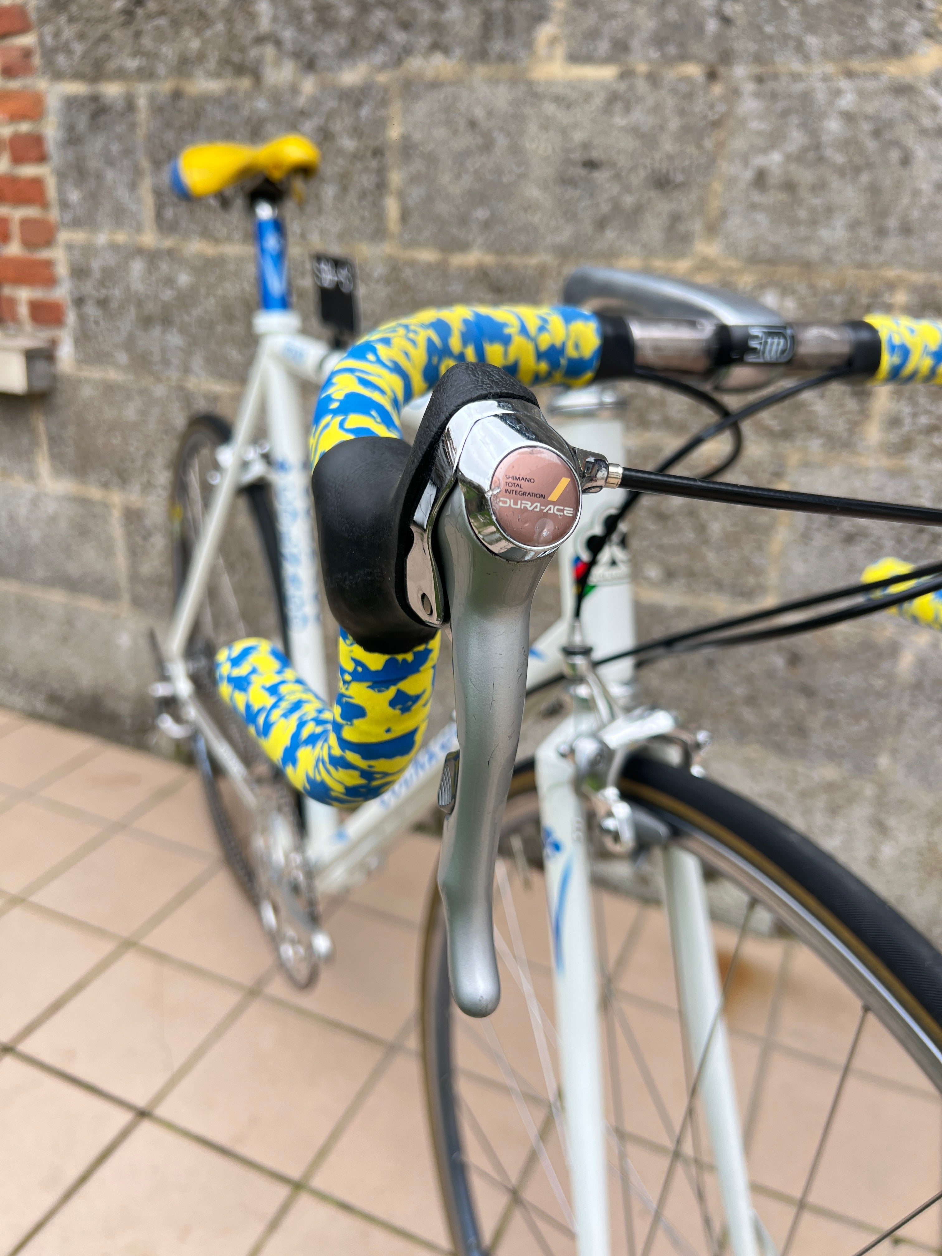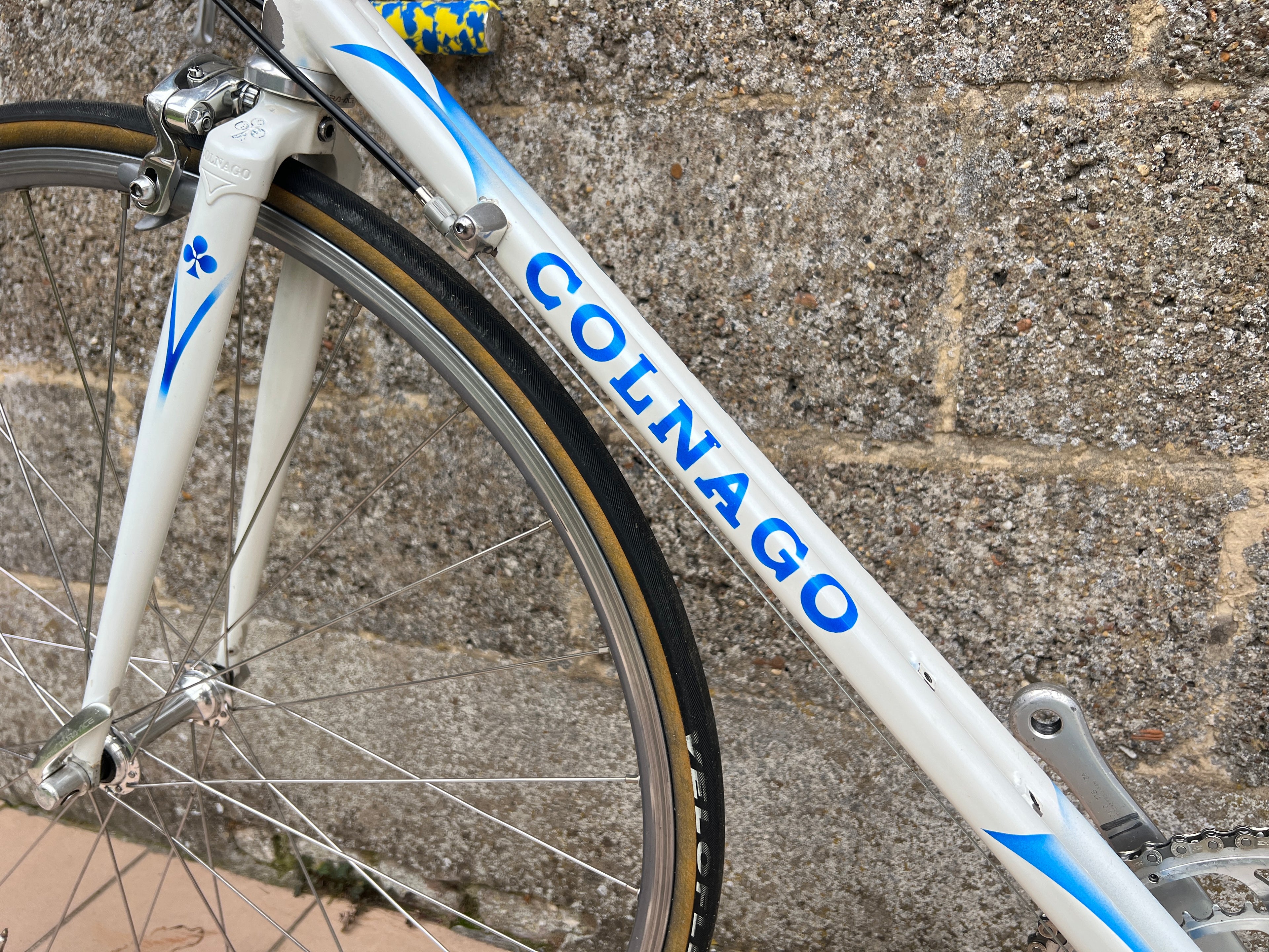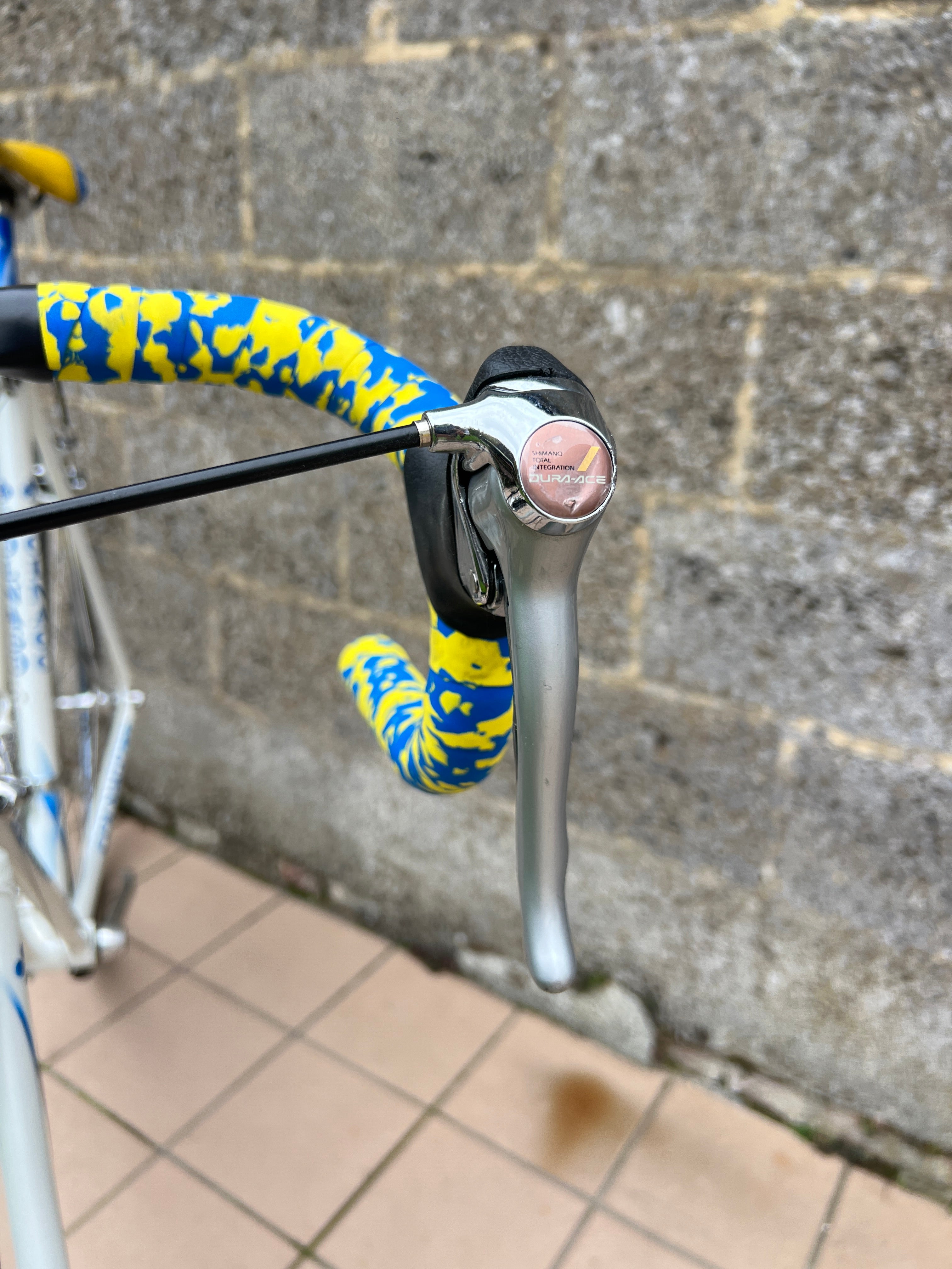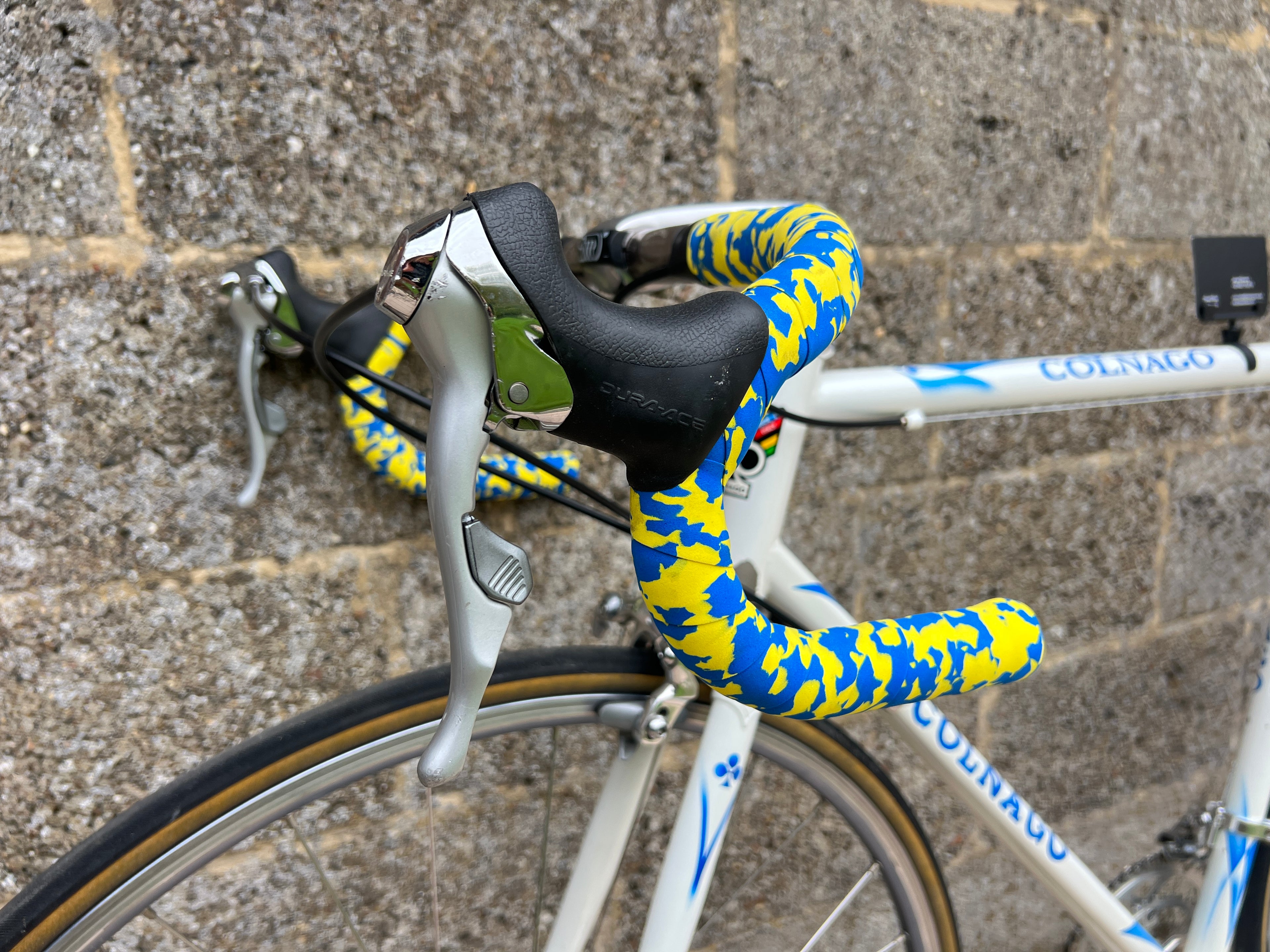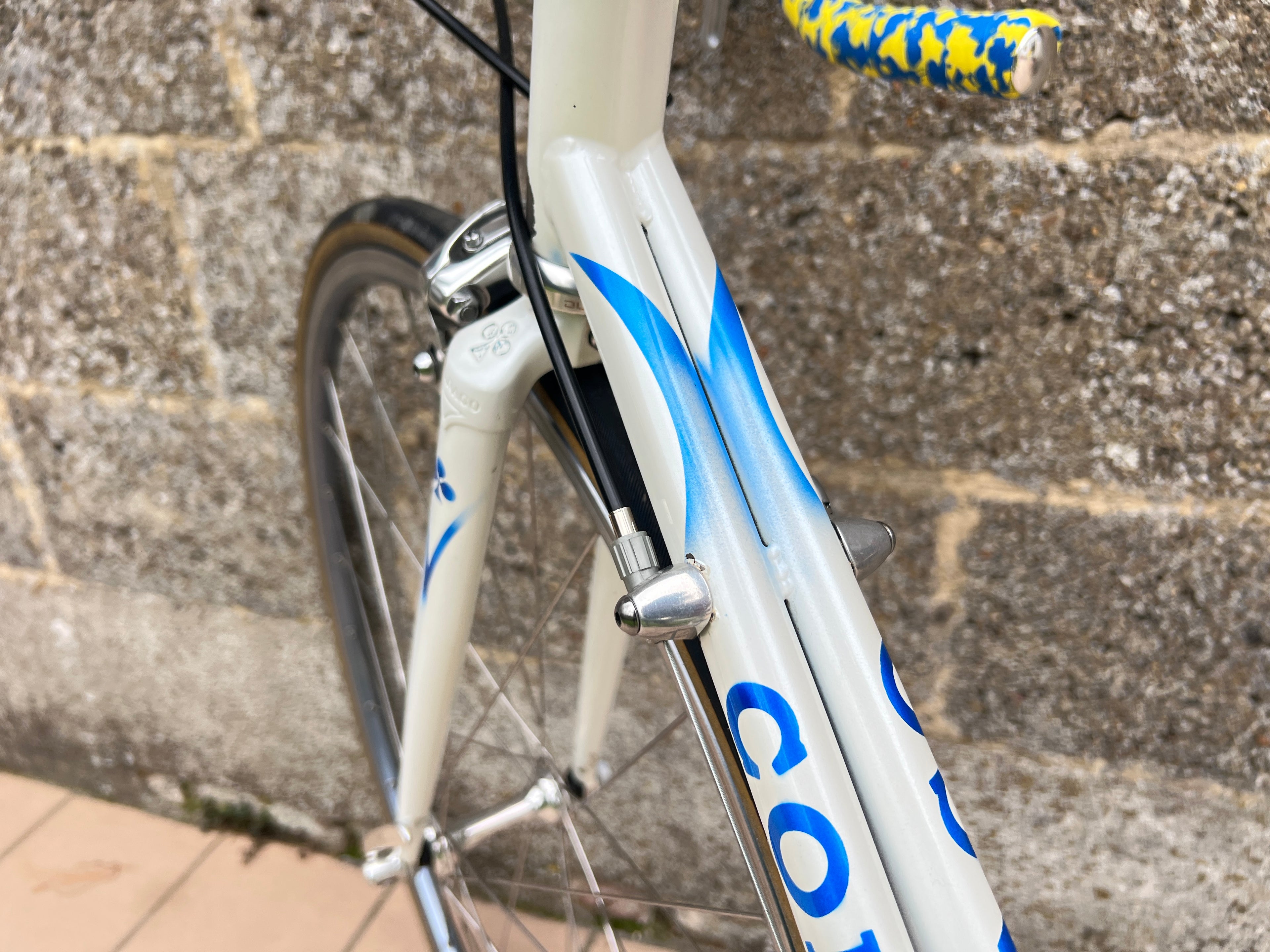 An exceptional opportunity to acquire a true icon of 1990s Italian craftsmanship. The Colnago Bititan Titanio. Presented here in the ultra-rare Tony Rominger colorway. This masterpiece combines Colnago’s legendary titanium frame design with the unmistakable double downtube construction. A hallmark of innovation and aesthetics from Ernesto Colnago’s golden era. Every detail reflects precision and artistry. From the signature Colnago pantograph engravings on the fork to the custom-painted seatpost, finished to order. The bike is equipped with a complete Shimano Dura-Ace groupset. It features clincher wheels. Please note that one rim shows a minor hairline crack around a spoke nipple. Having spent years as part of a private collection, this Bititan has been beautifully preserved and is now available for the discerning collector or passionate Colnago enthusiast.