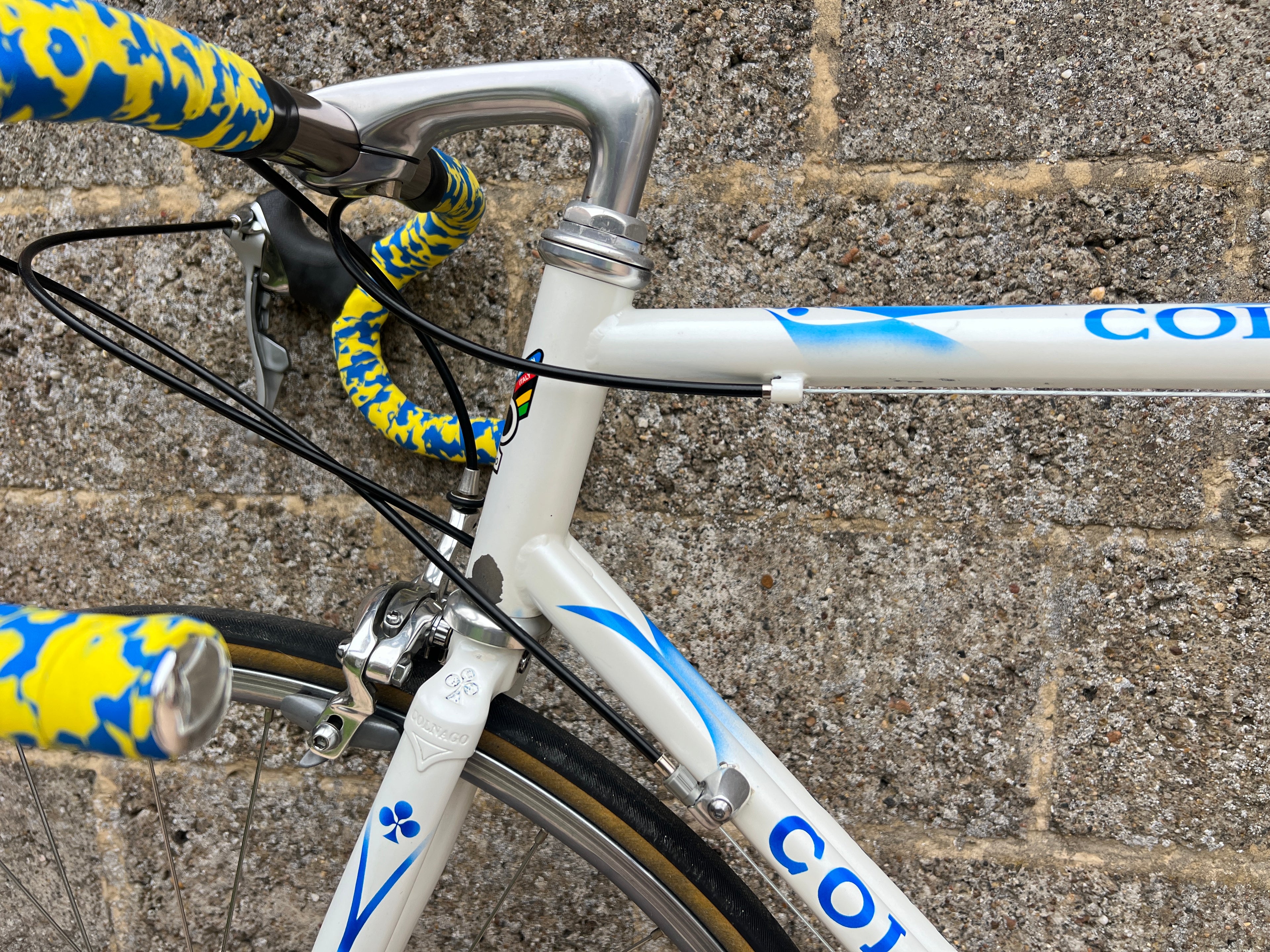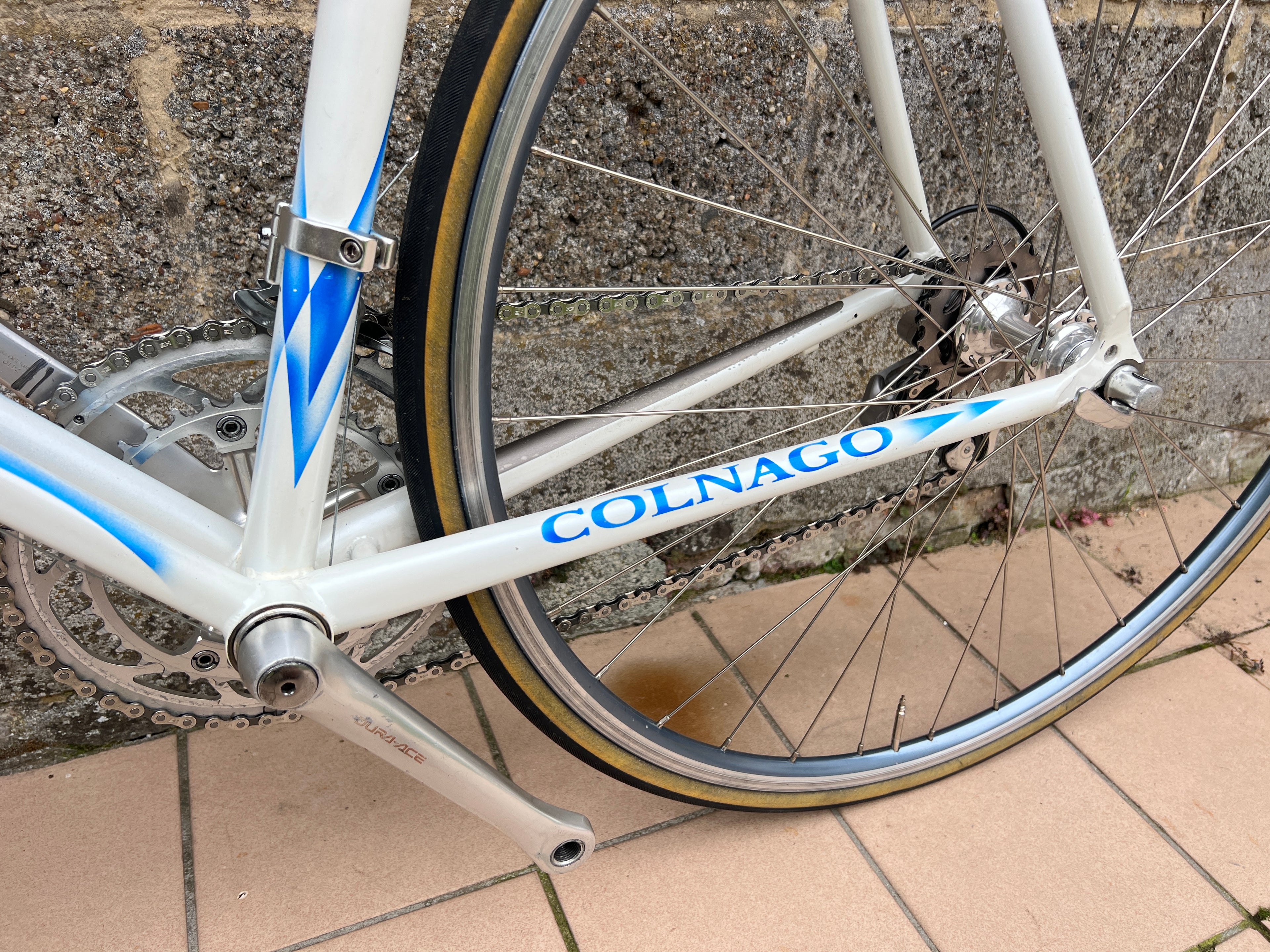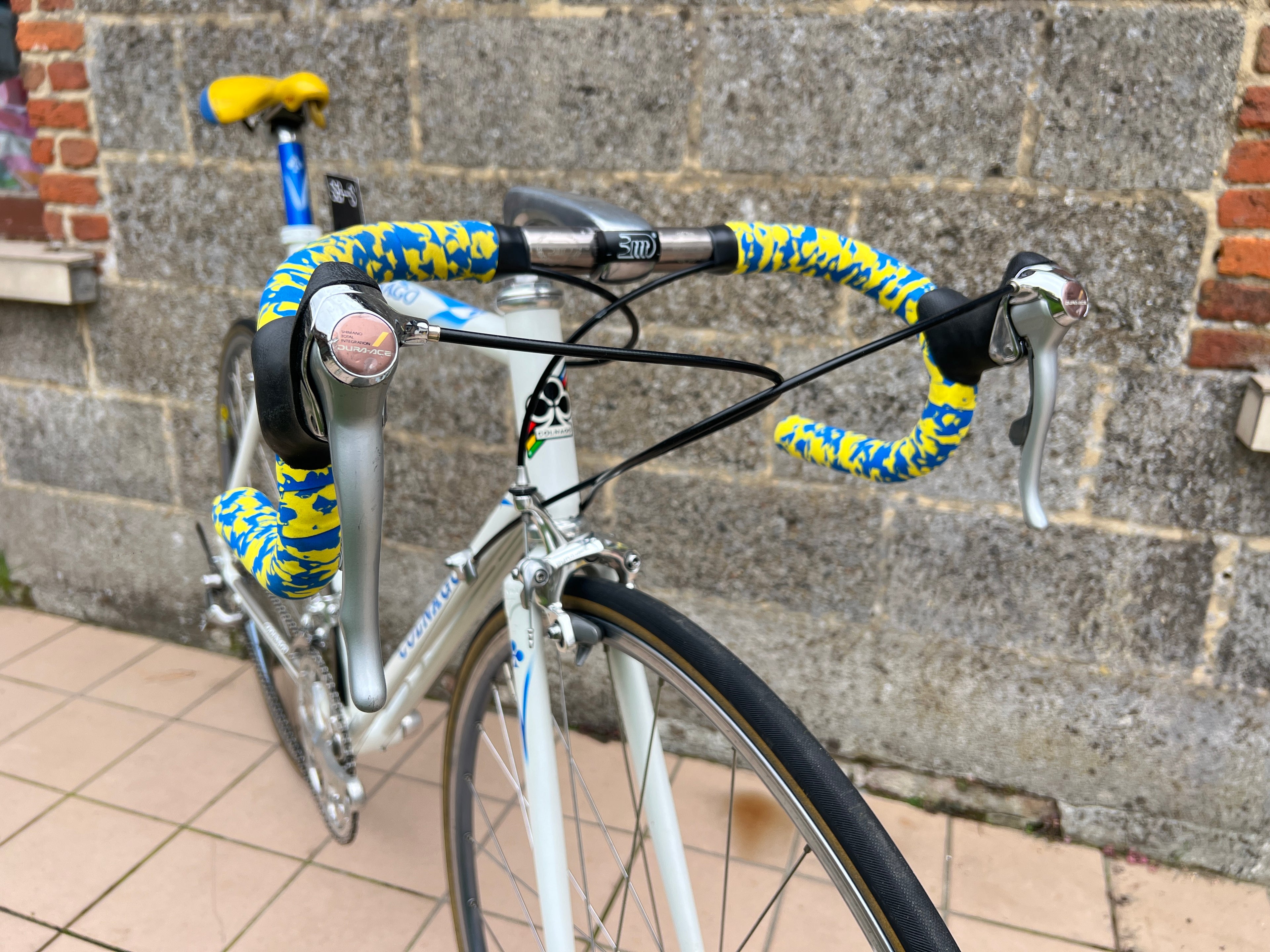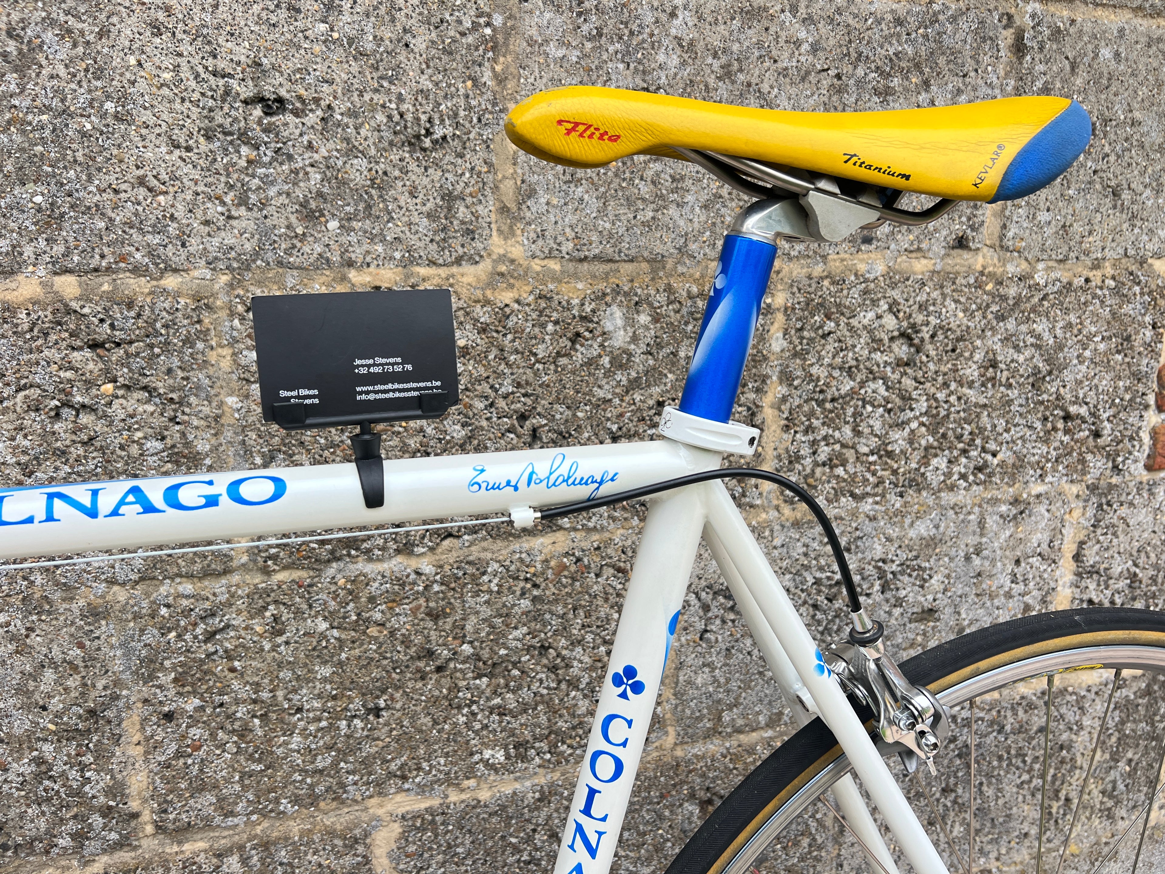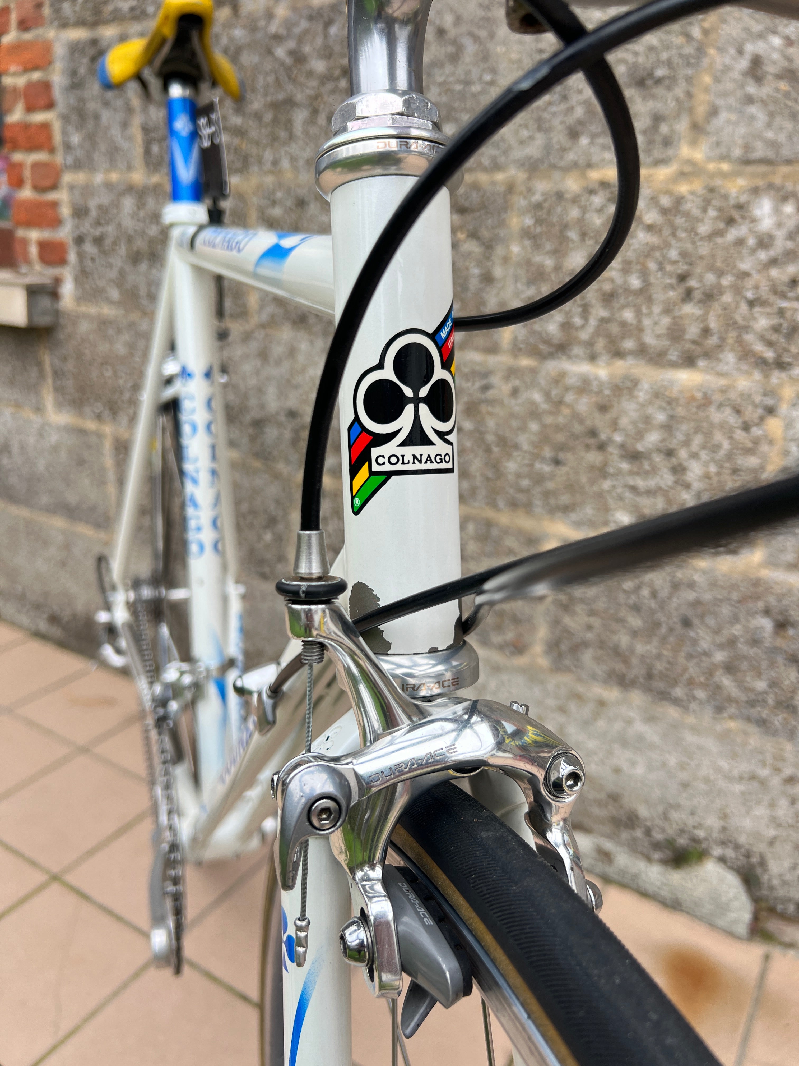 An exceptional opportunity to acquire a true icon of 1990s Italian craftsmanship. The Colnago Bititan Titanio. Presented here in the ultra-rare Tony Rominger colorway. This masterpiece combines Colnago’s legendary titanium frame design with the unmistakable double downtube construction. A hallmark of innovation and aesthetics from Ernesto Colnago’s golden era. Every detail reflects precision and artistry. From the signature Colnago pantograph engravings on the fork to the custom-painted seatpost, finished to order. The bike is equipped with a complete Shimano Dura-Ace groupset. It features clincher wheels. Please note that one rim shows a minor hairline crack around a spoke nipple. Having spent years as part of a private collection, this Bititan has been beautifully preserved and is now available for the discerning collector or passionate Colnago enthusiast.