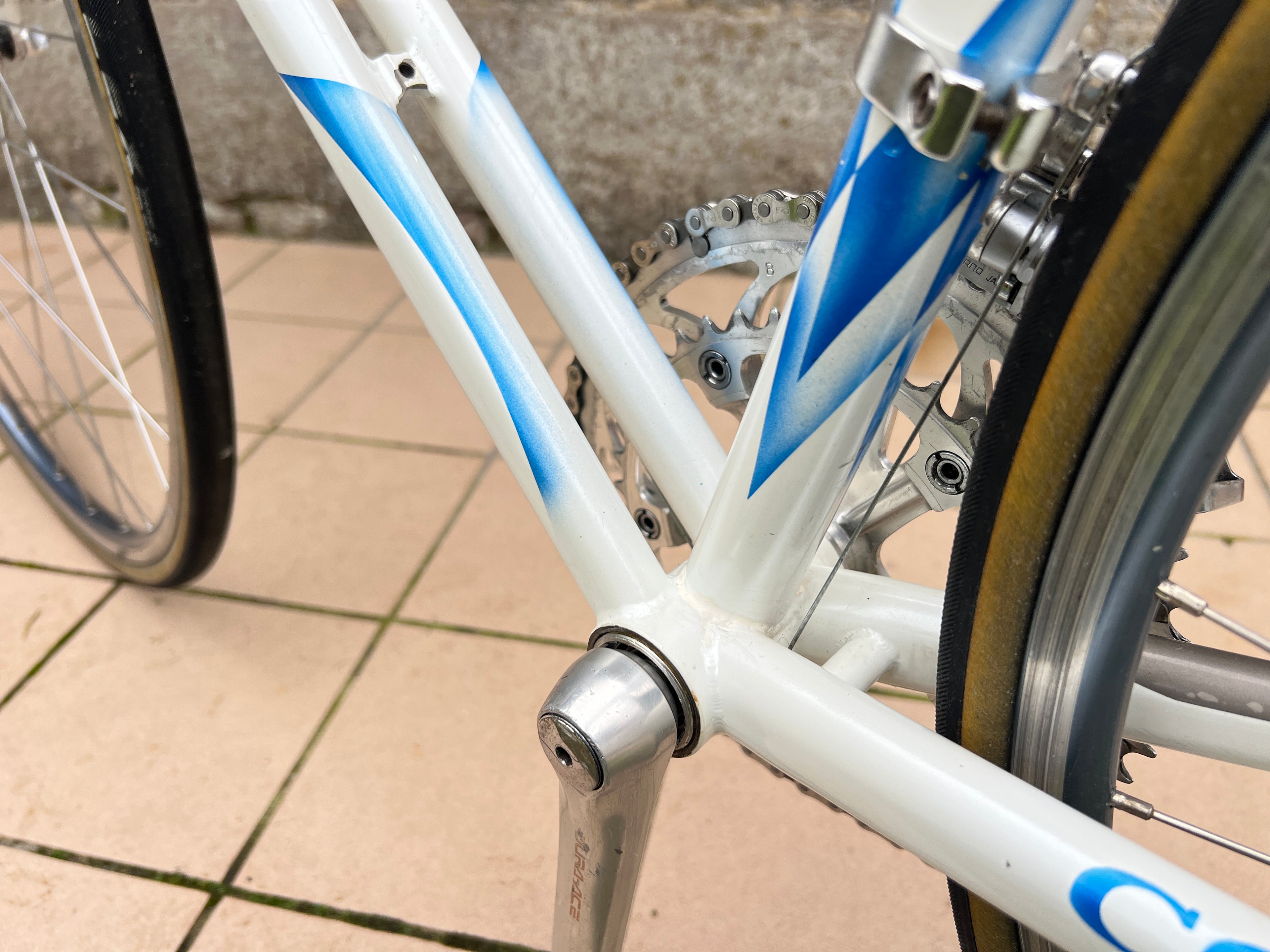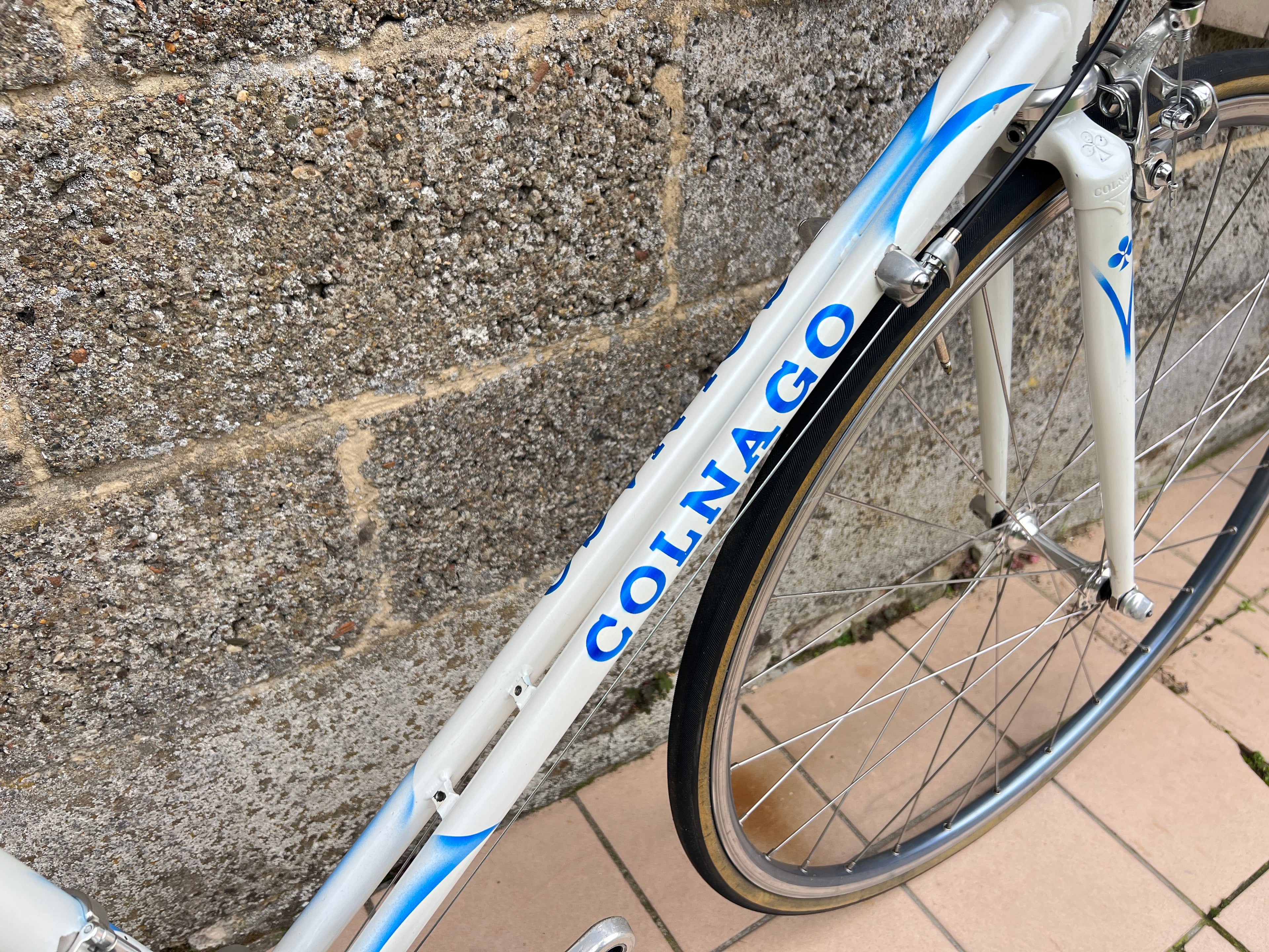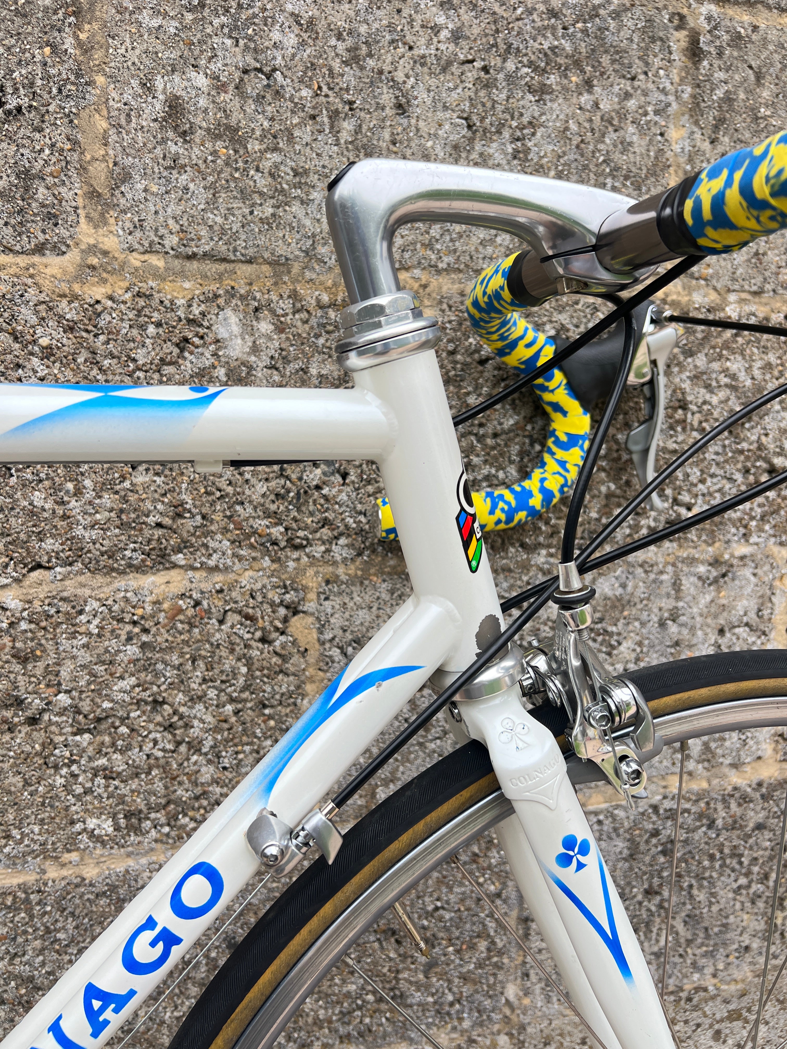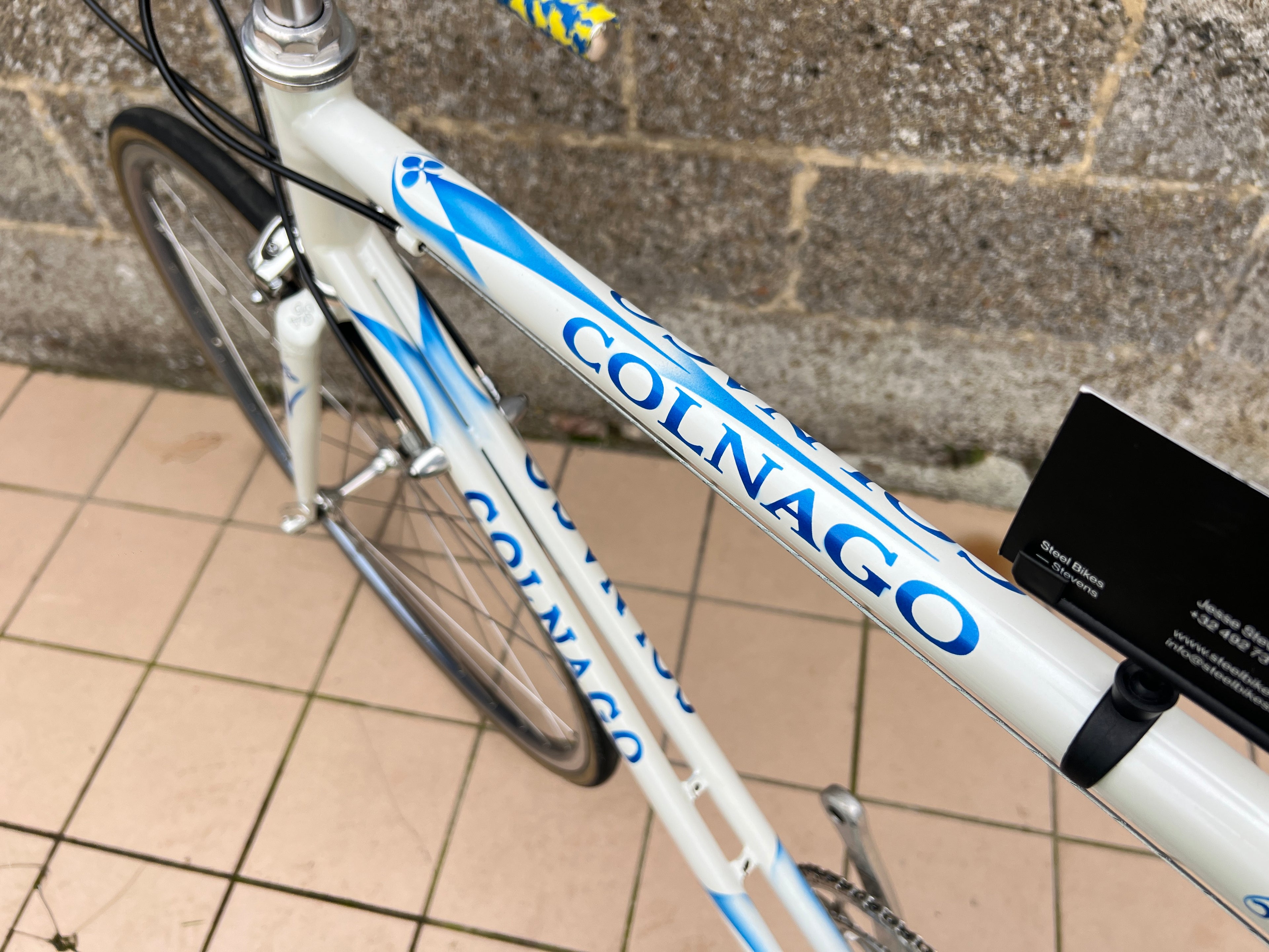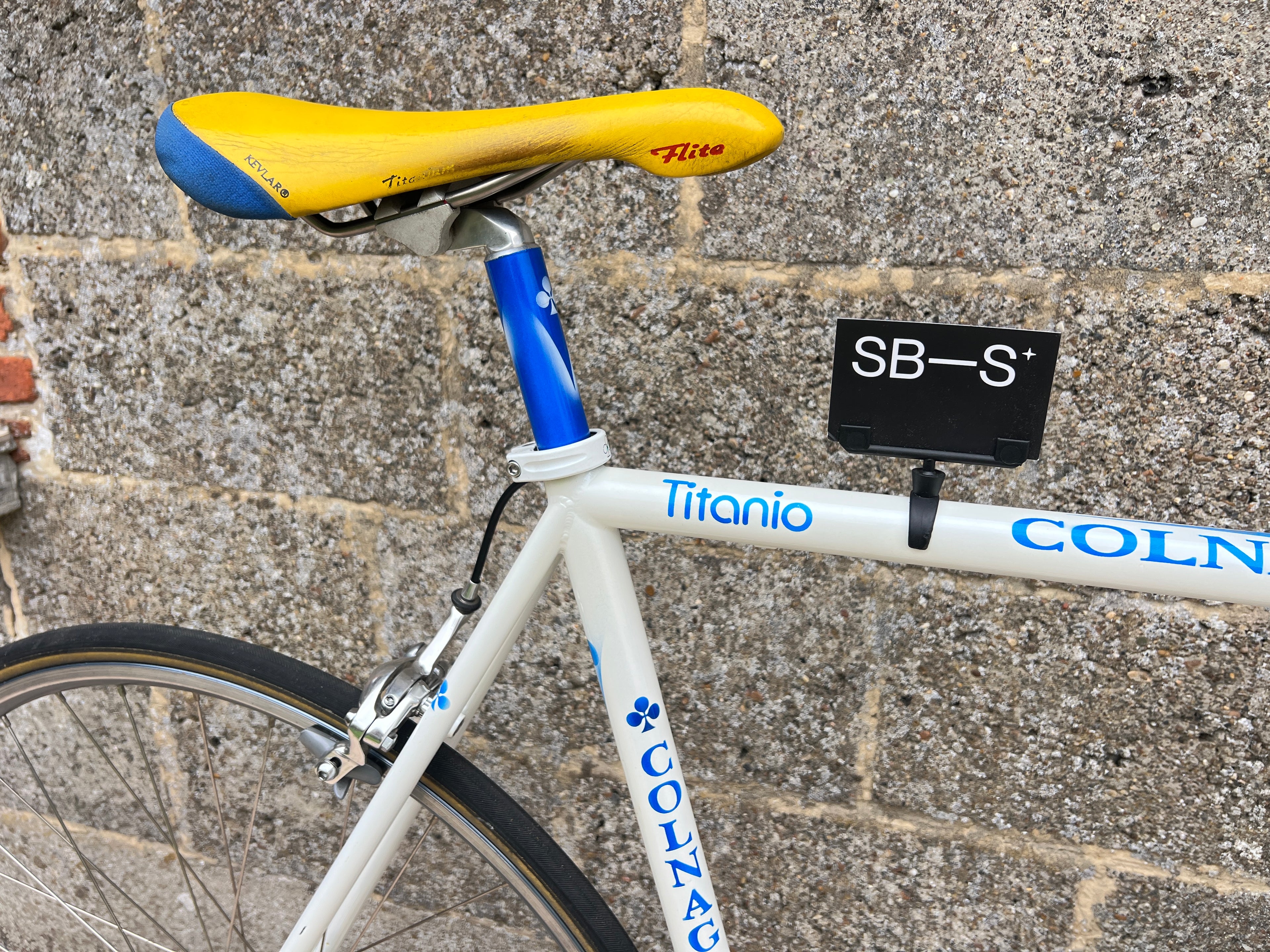 An exceptional opportunity to acquire a true icon of 1990s Italian craftsmanship. The Colnago Bititan Titanio. Presented here in the ultra-rare Tony Rominger colorway. This masterpiece combines Colnago’s legendary titanium frame design with the unmistakable double downtube construction. A hallmark of innovation and aesthetics from Ernesto Colnago’s golden era. Every detail reflects precision and artistry. From the signature Colnago pantograph engravings on the fork to the custom-painted seatpost, finished to order. The bike is equipped with a complete Shimano Dura-Ace groupset. It features clincher wheels. Please note that one rim shows a minor hairline crack around a spoke nipple. Having spent years as part of a private collection, this Bititan has been beautifully preserved and is now available for the discerning collector or passionate Colnago enthusiast.