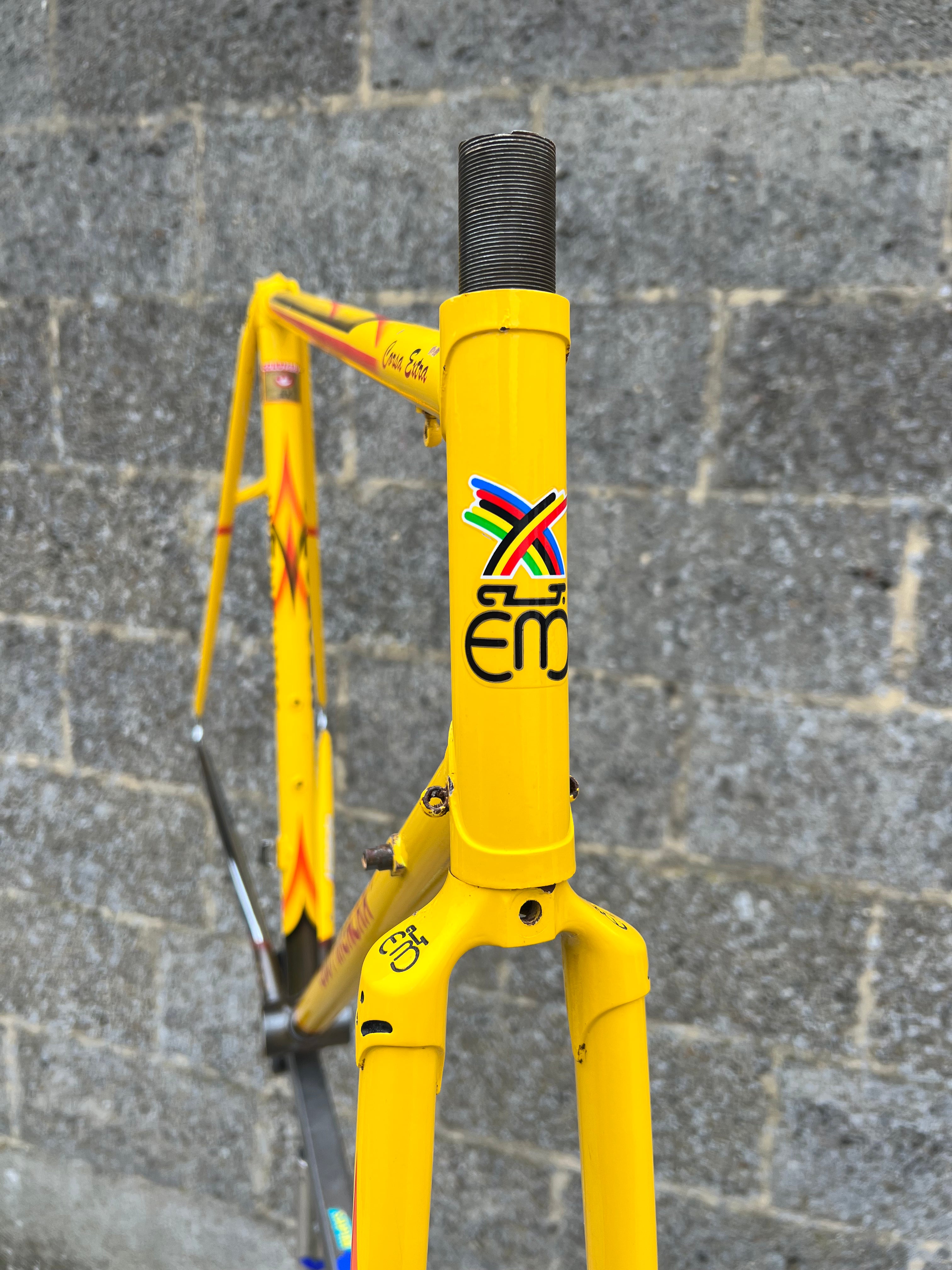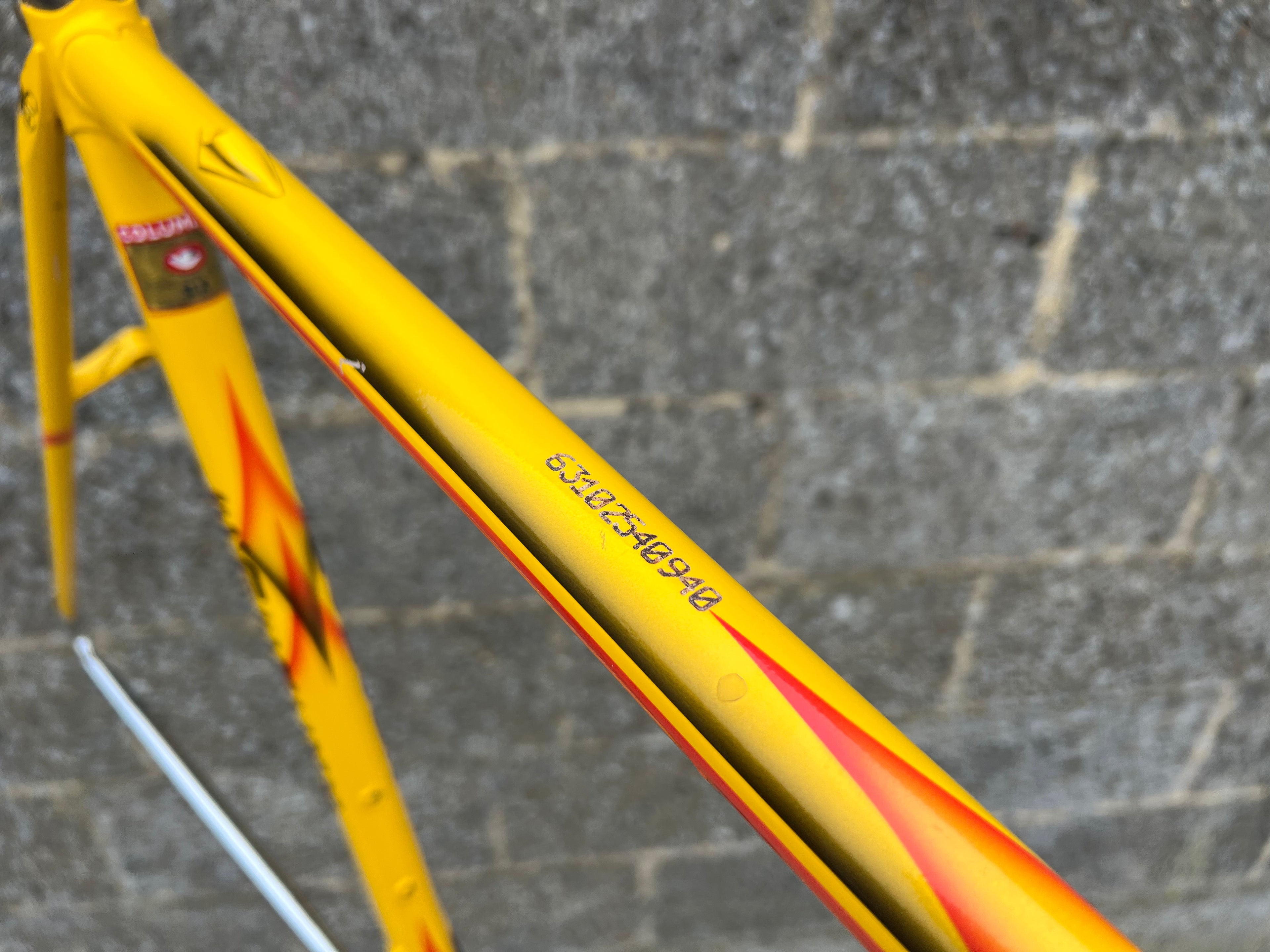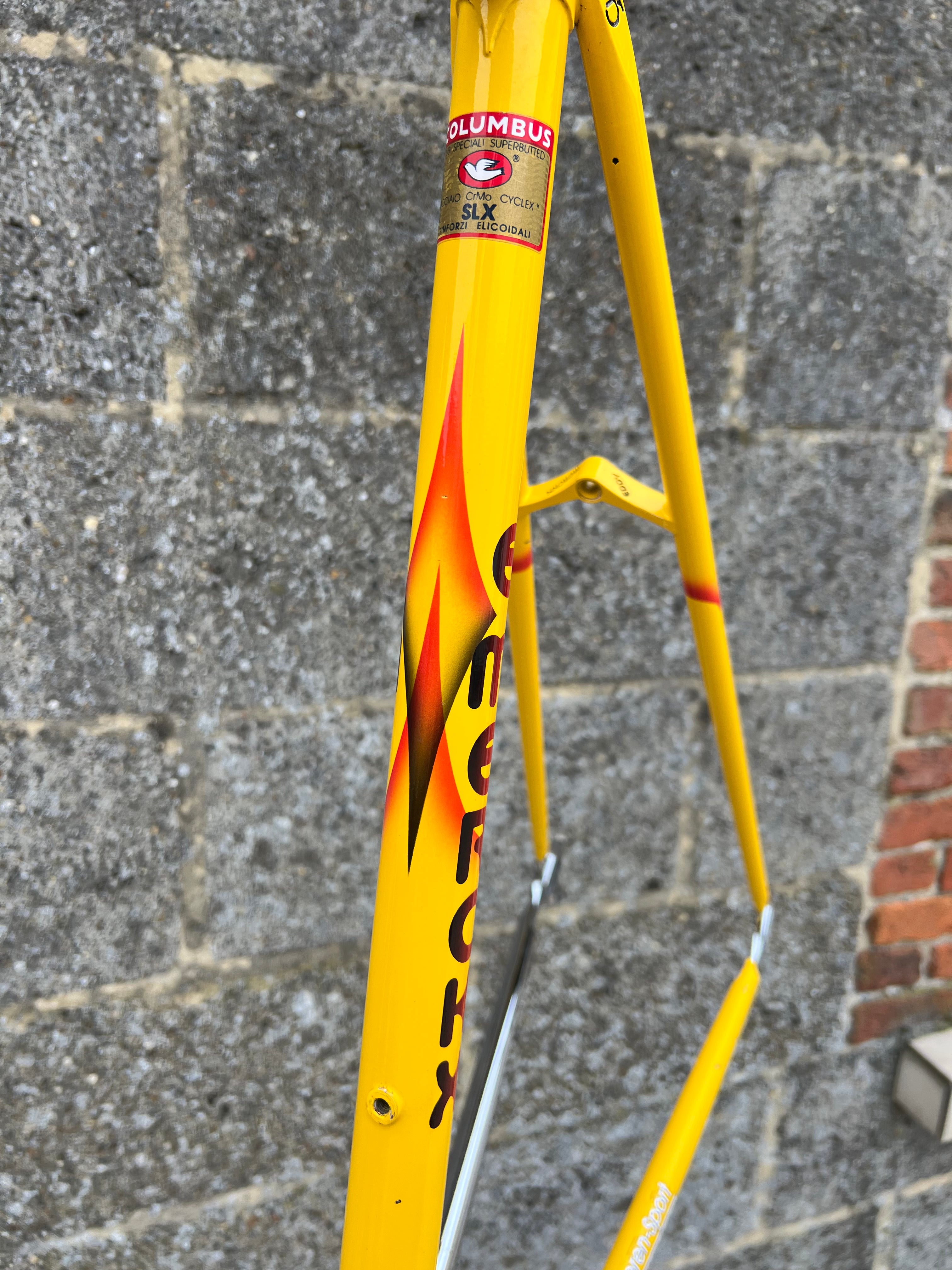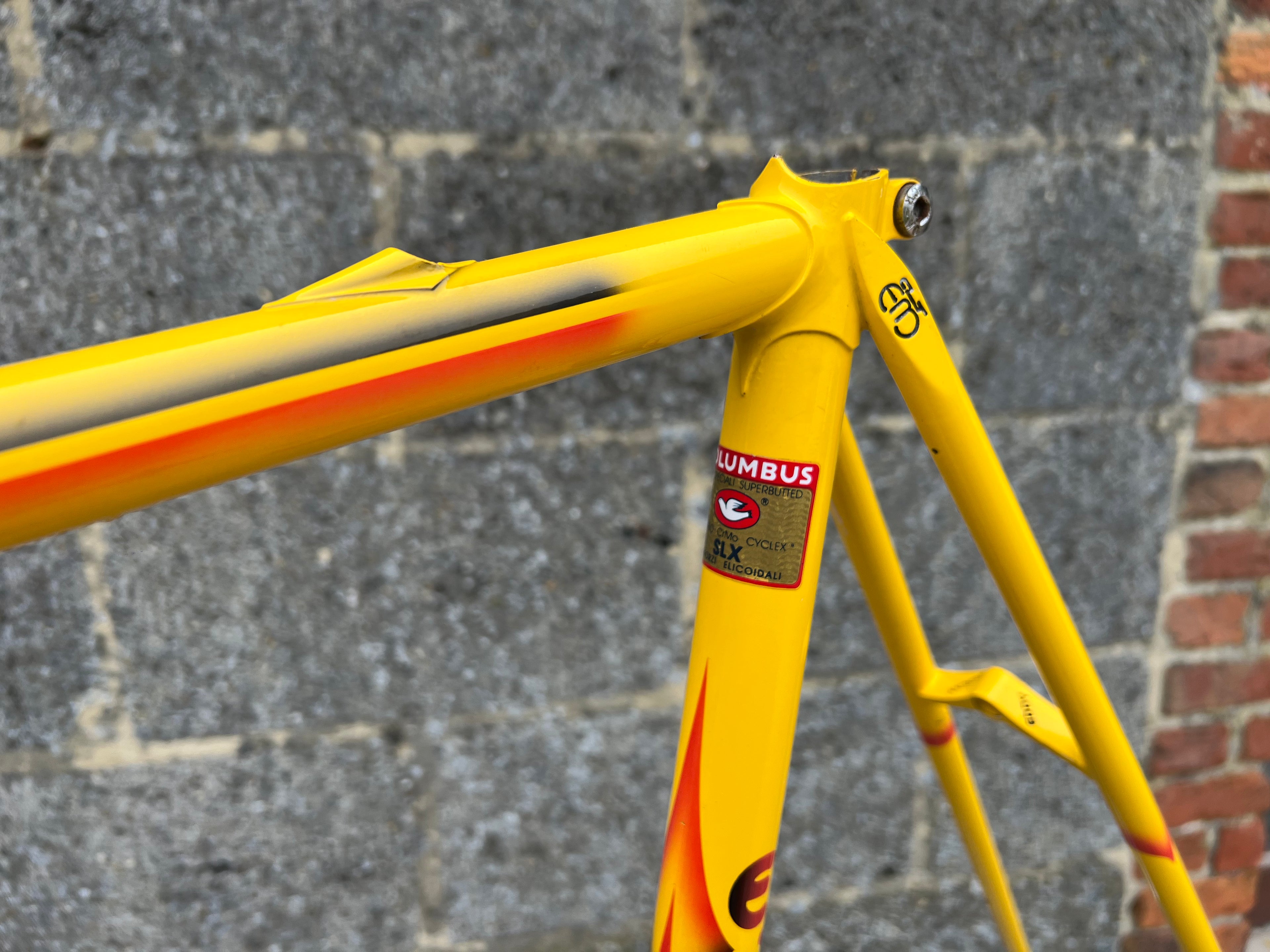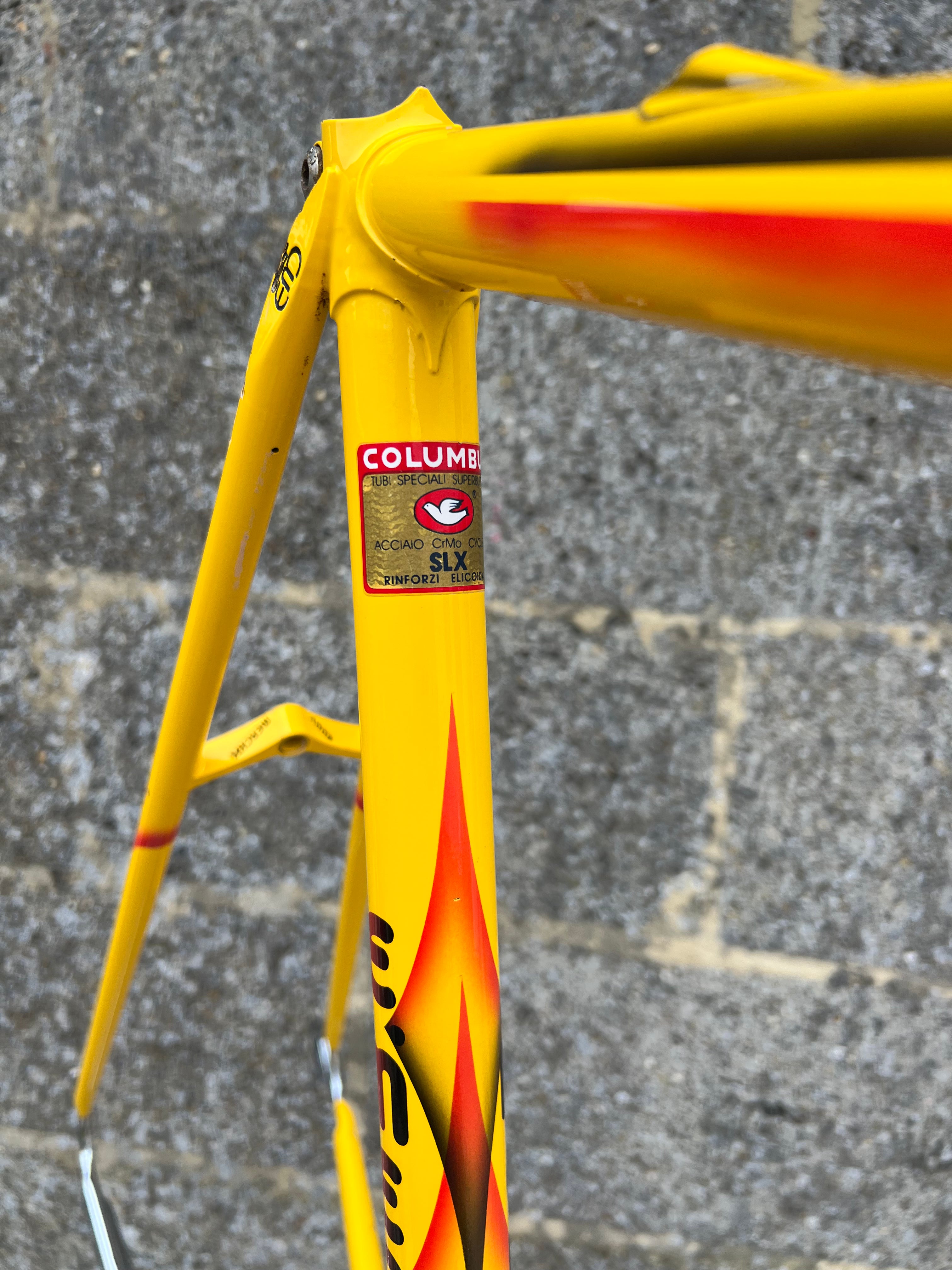 Colombus SLX tubing. Original paint and chrome. No cracks or dents. This frameset is equiped with a racing tag holder for competition. Some very small paintchips and some signs of age on the chrome. Frameset has an anti theft number on the top tube. A real classic. Perfect frameset to build a team replica bike.
