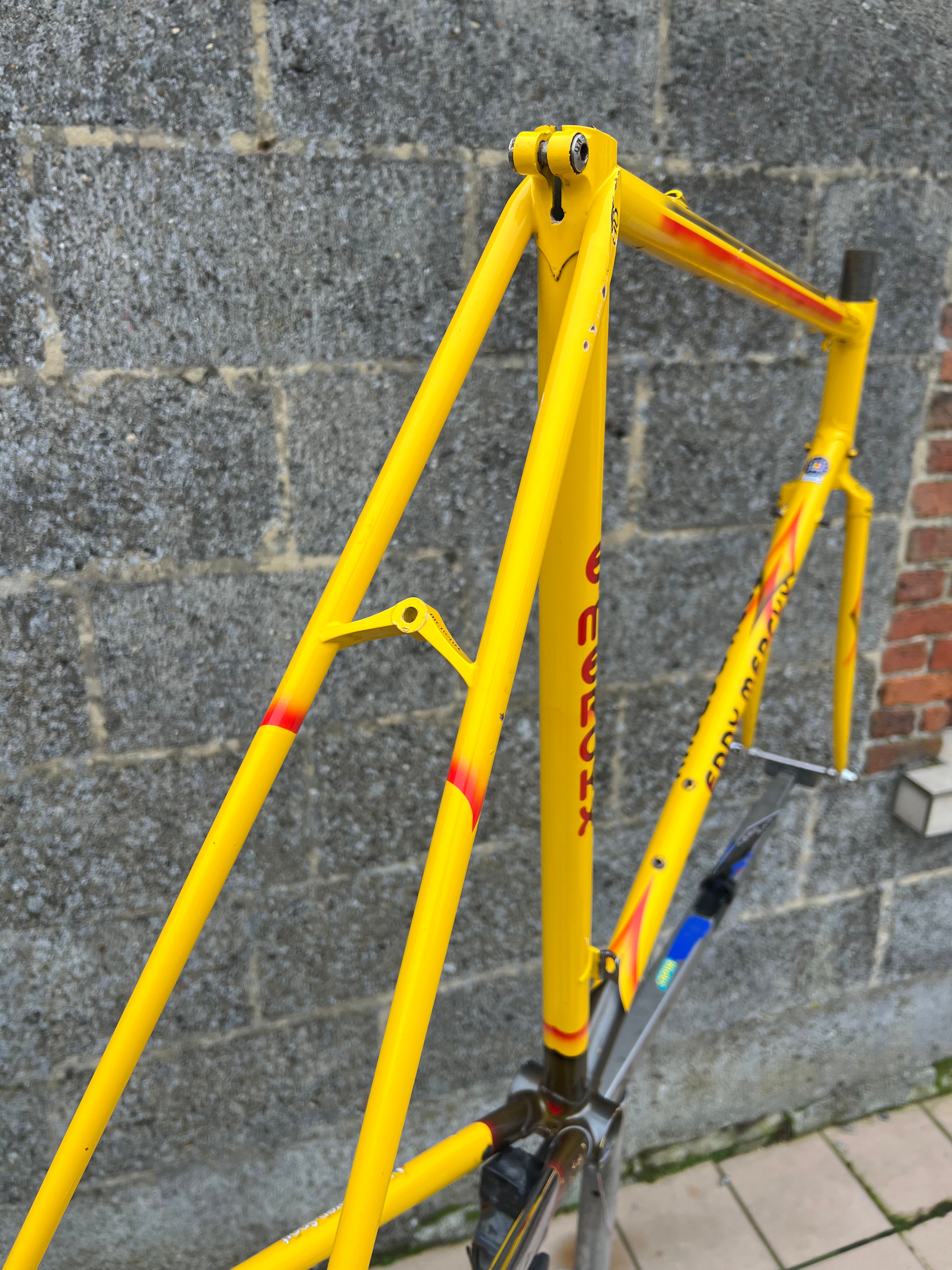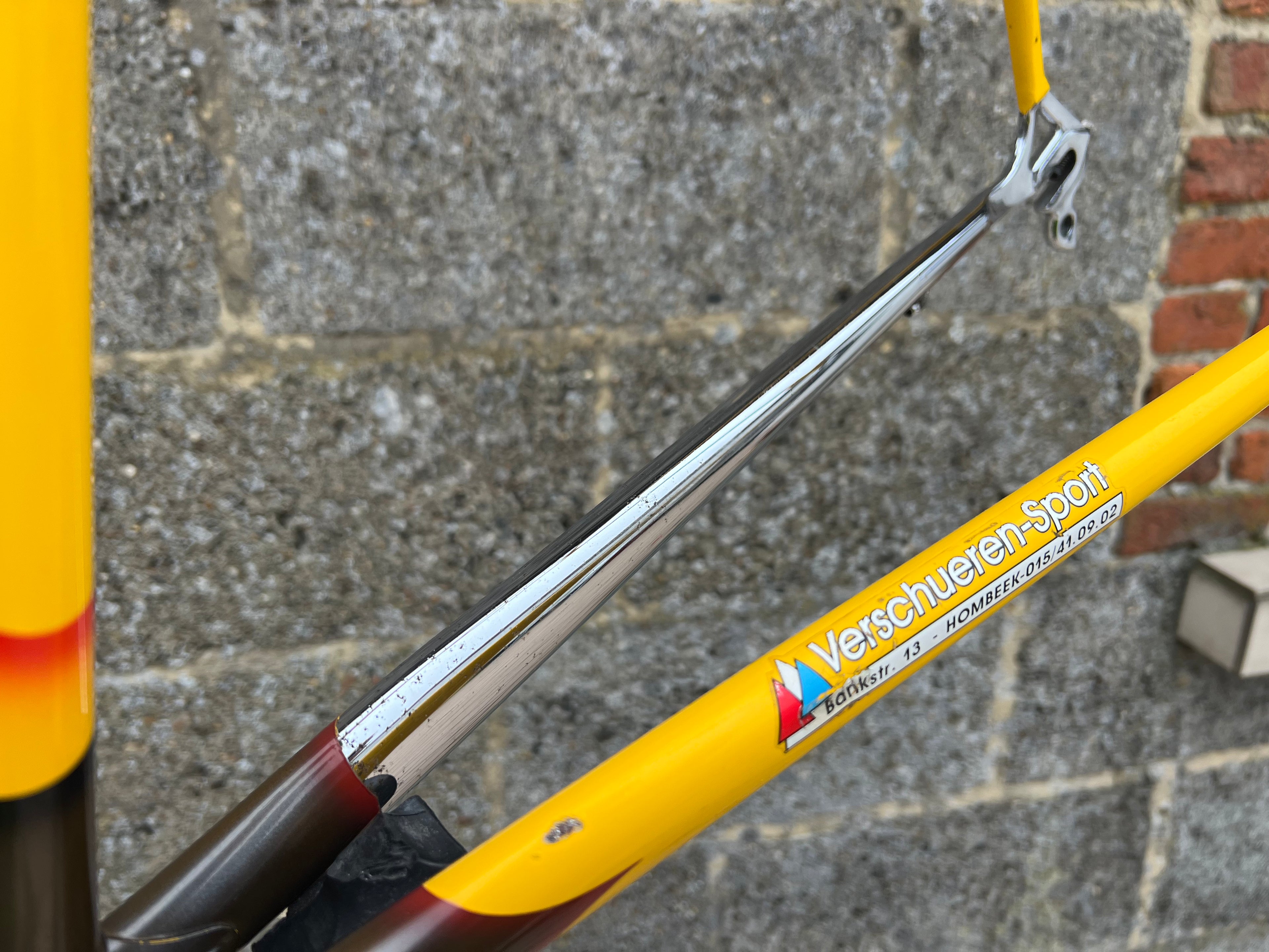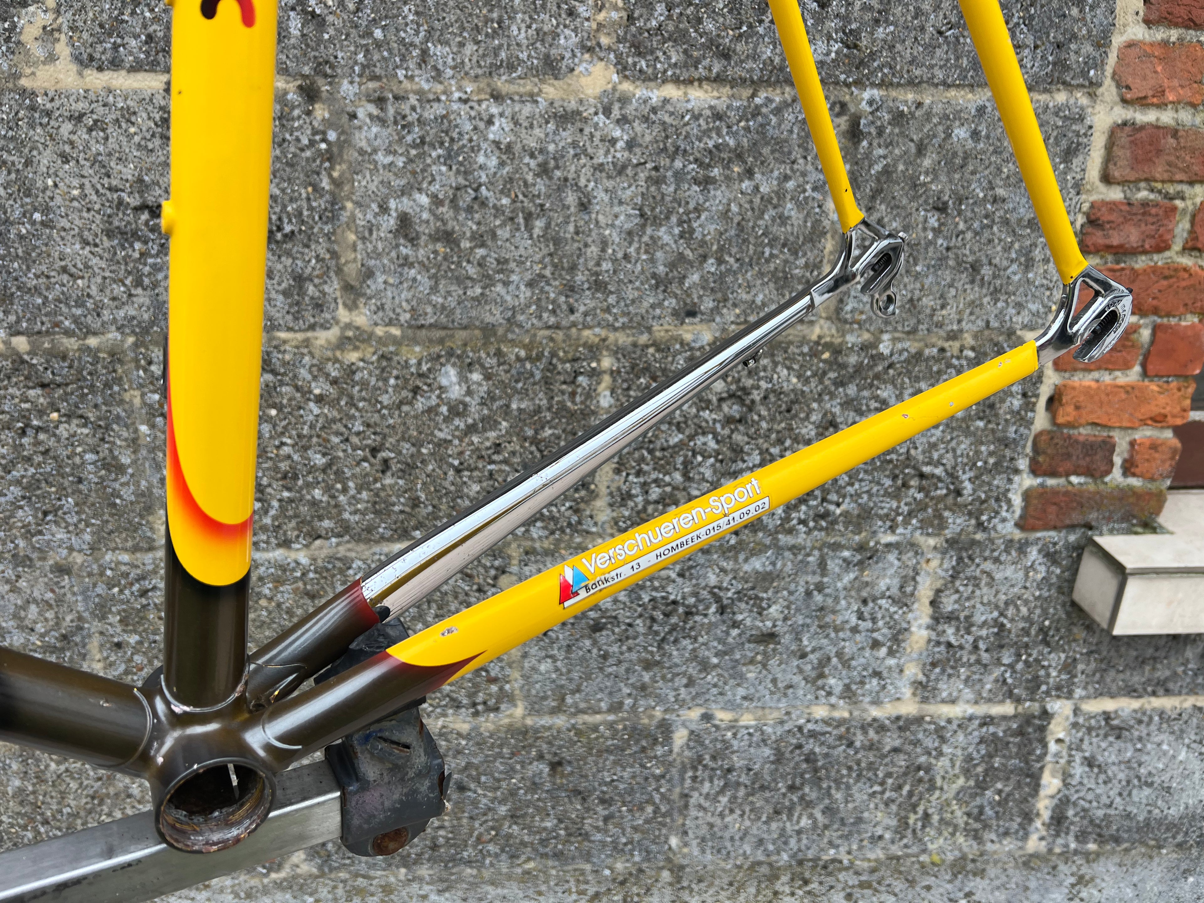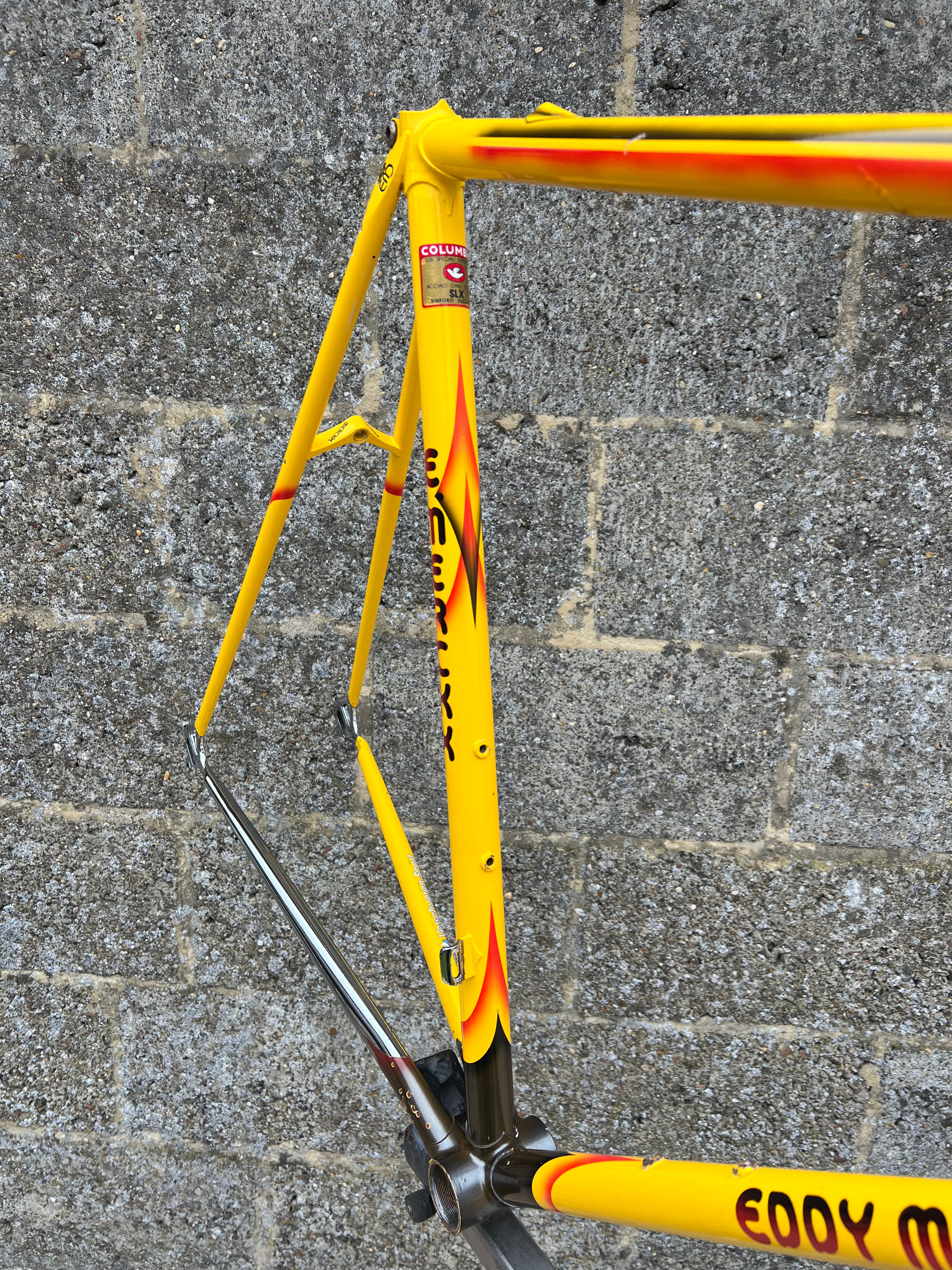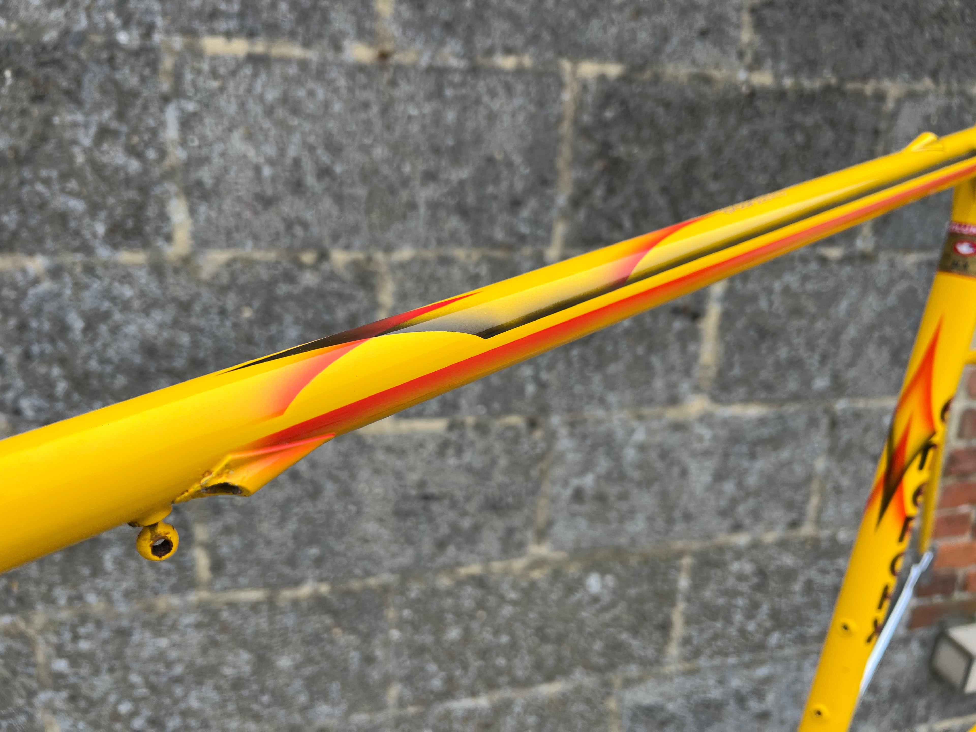 Colombus SLX tubing. Original paint and chrome. No cracks or dents. This frameset is equiped with a racing tag holder for competition. Some very small paintchips and some signs of age on the chrome. Frameset has an anti theft number on the top tube. A real classic. Perfect frameset to build a team replica bike.