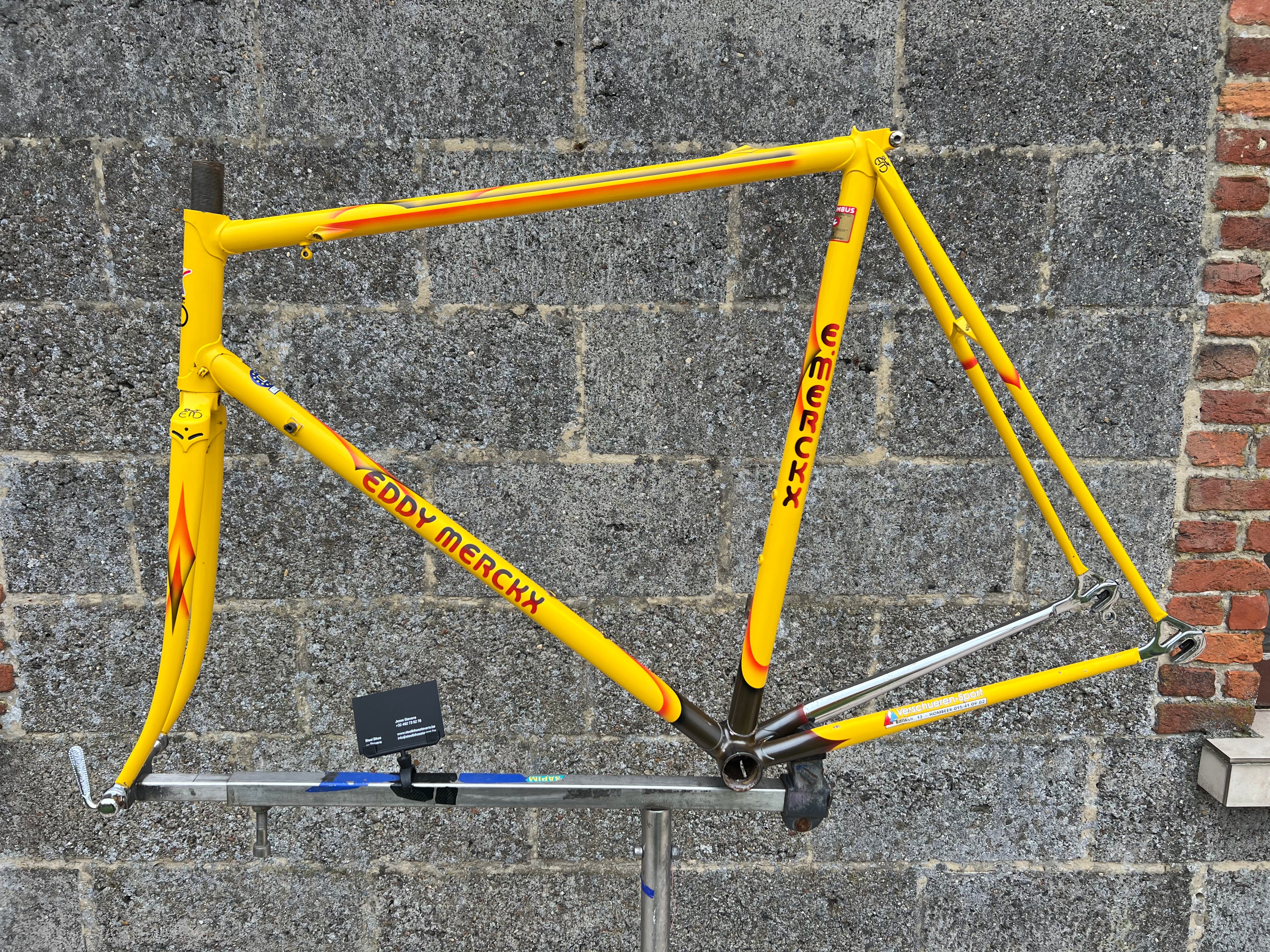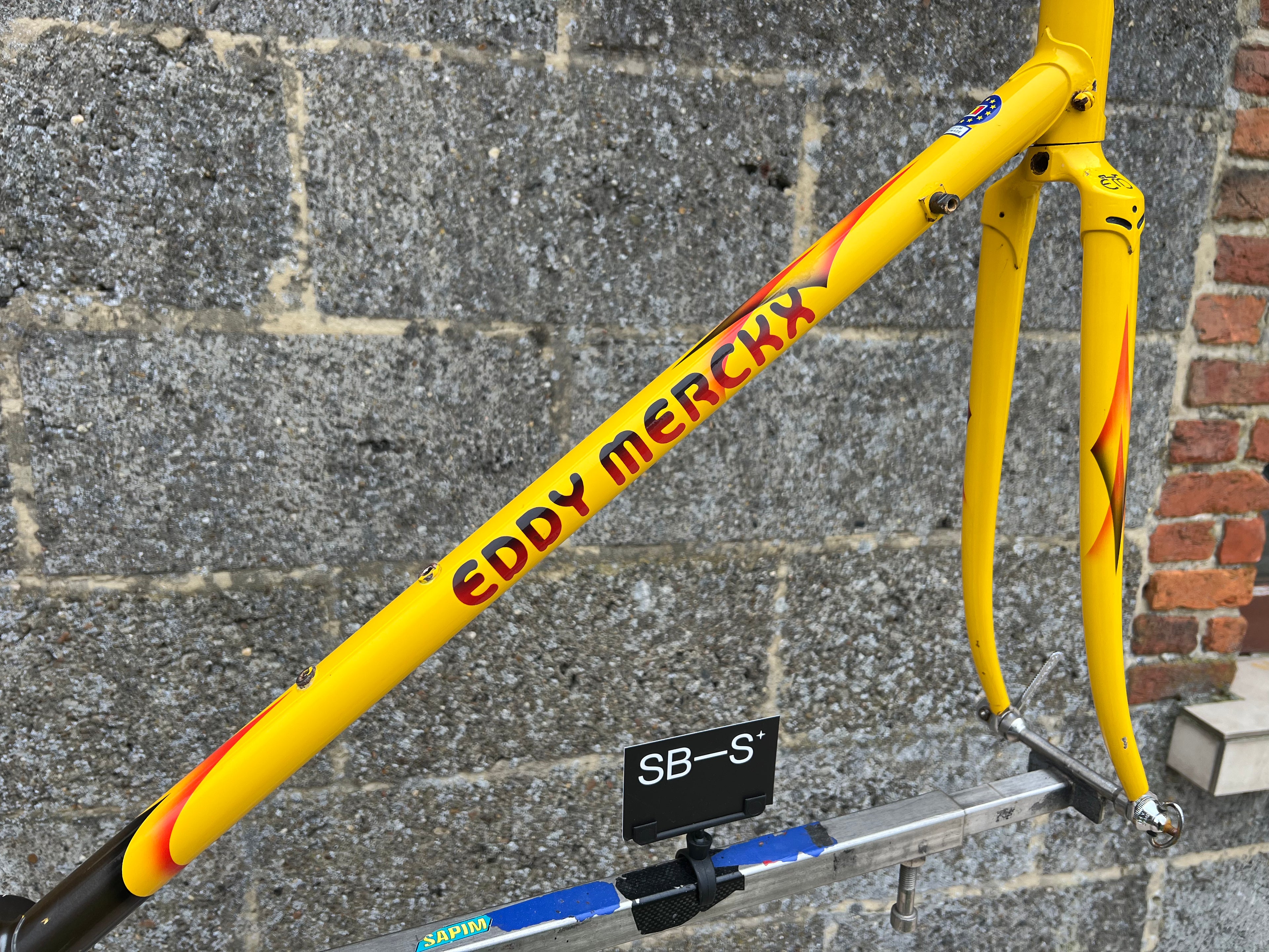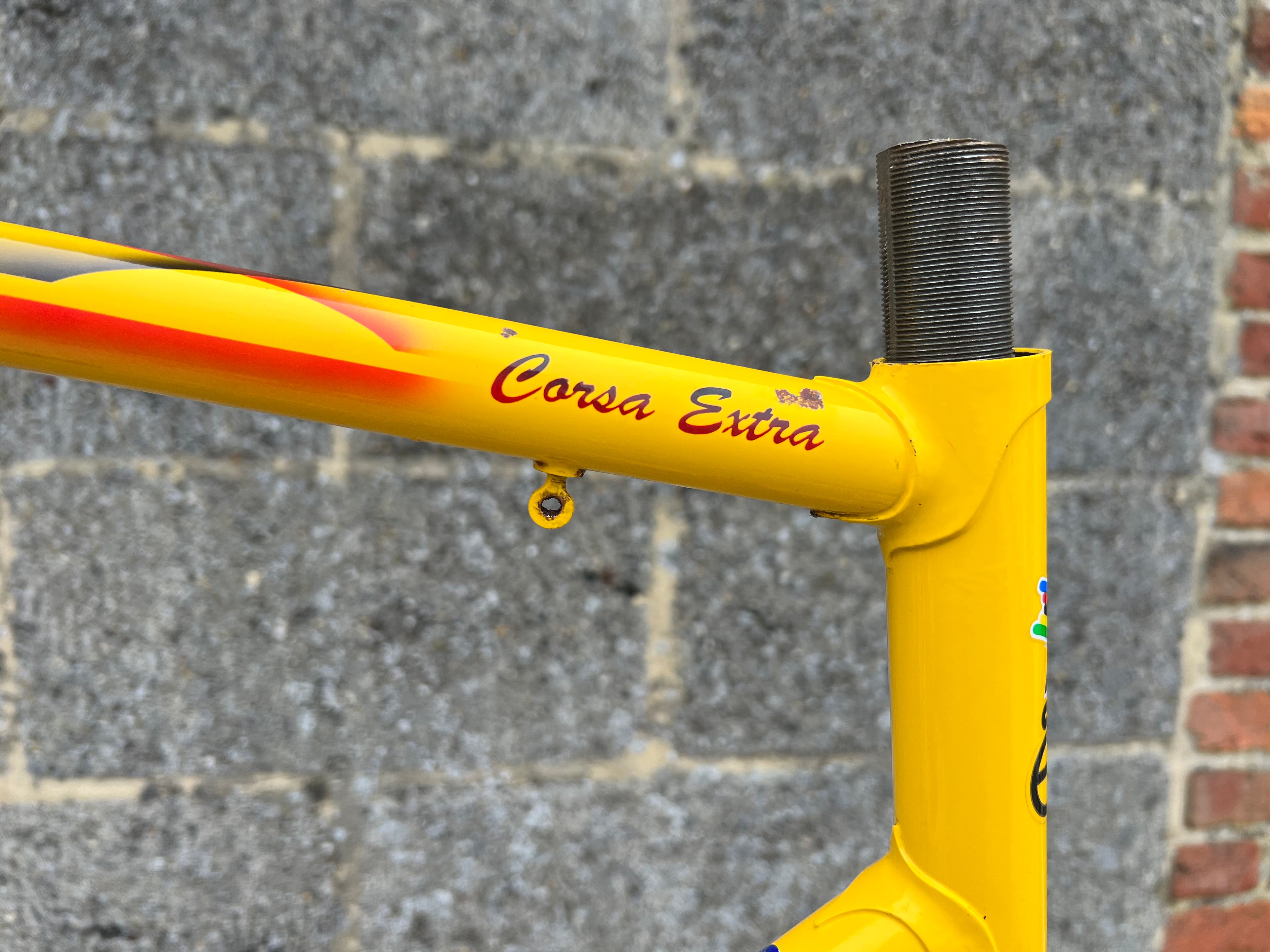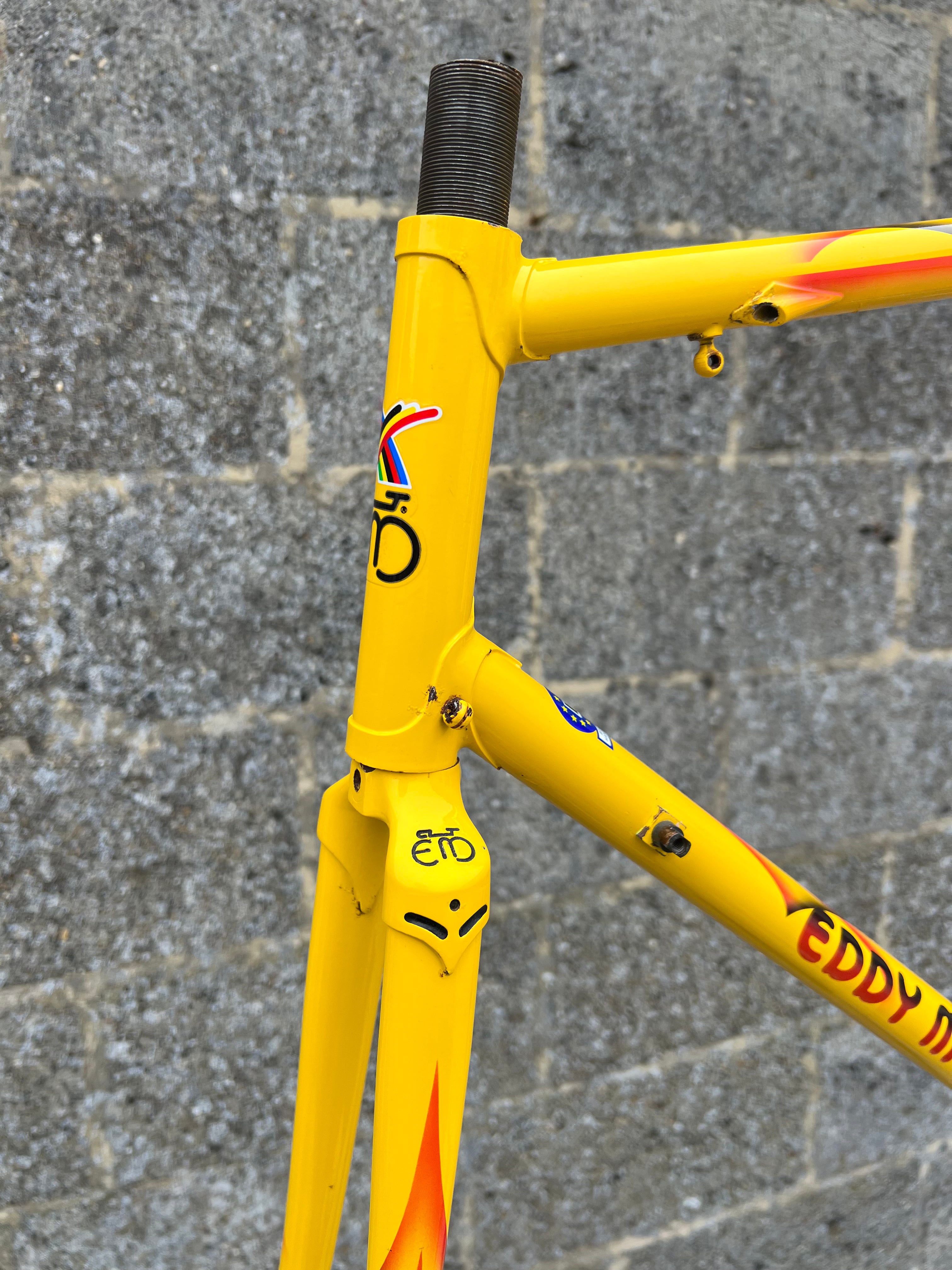Colombus SLX tubing. Original paint and chrome. No cracks or dents. This frameset is equiped with a racing tag holder for competition. Some very small paintchips and some signs of age on the chrome. Frameset has an anti theft number on the top tube. A real classic. Perfect frameset to build a team replica bike.