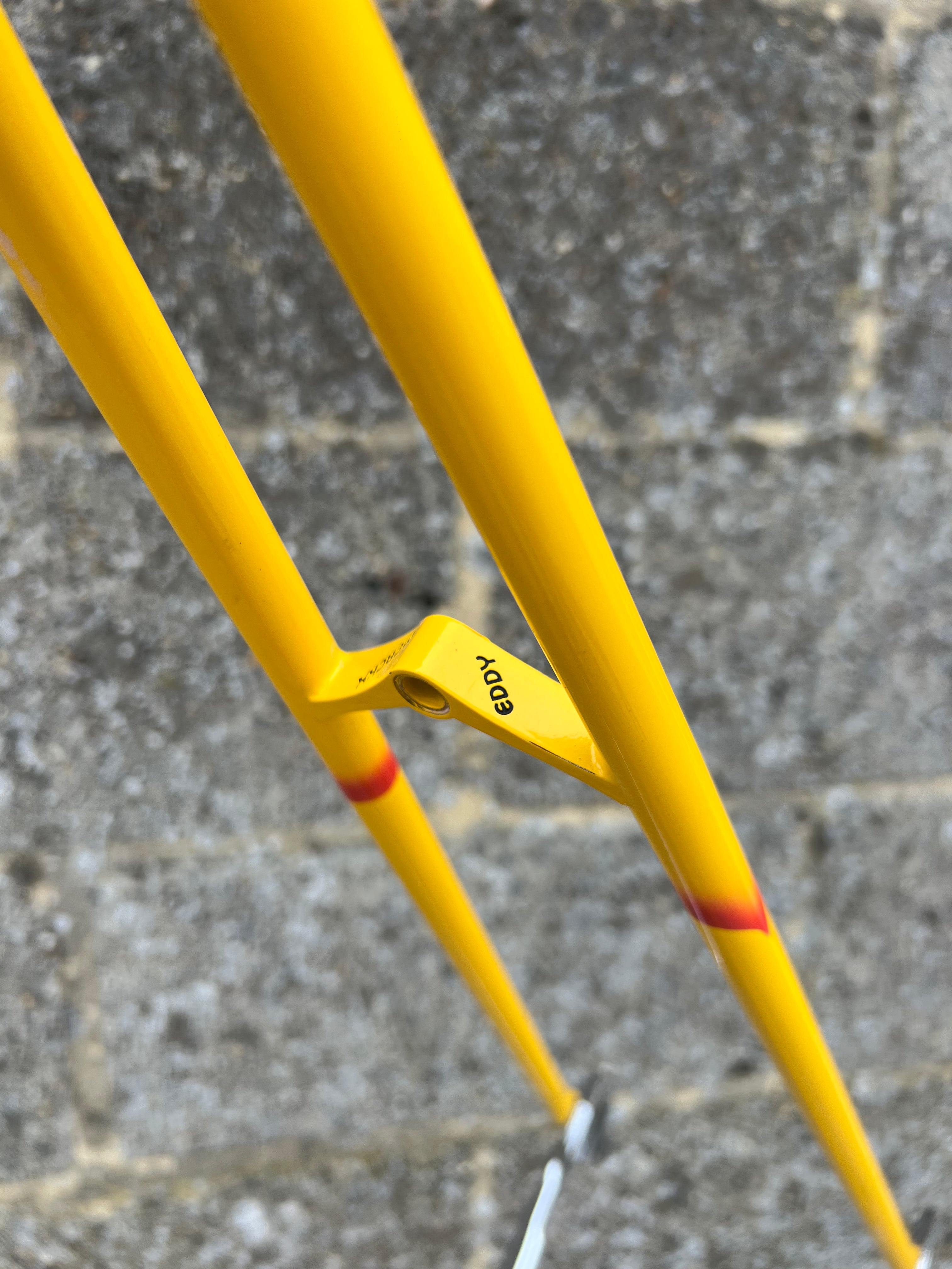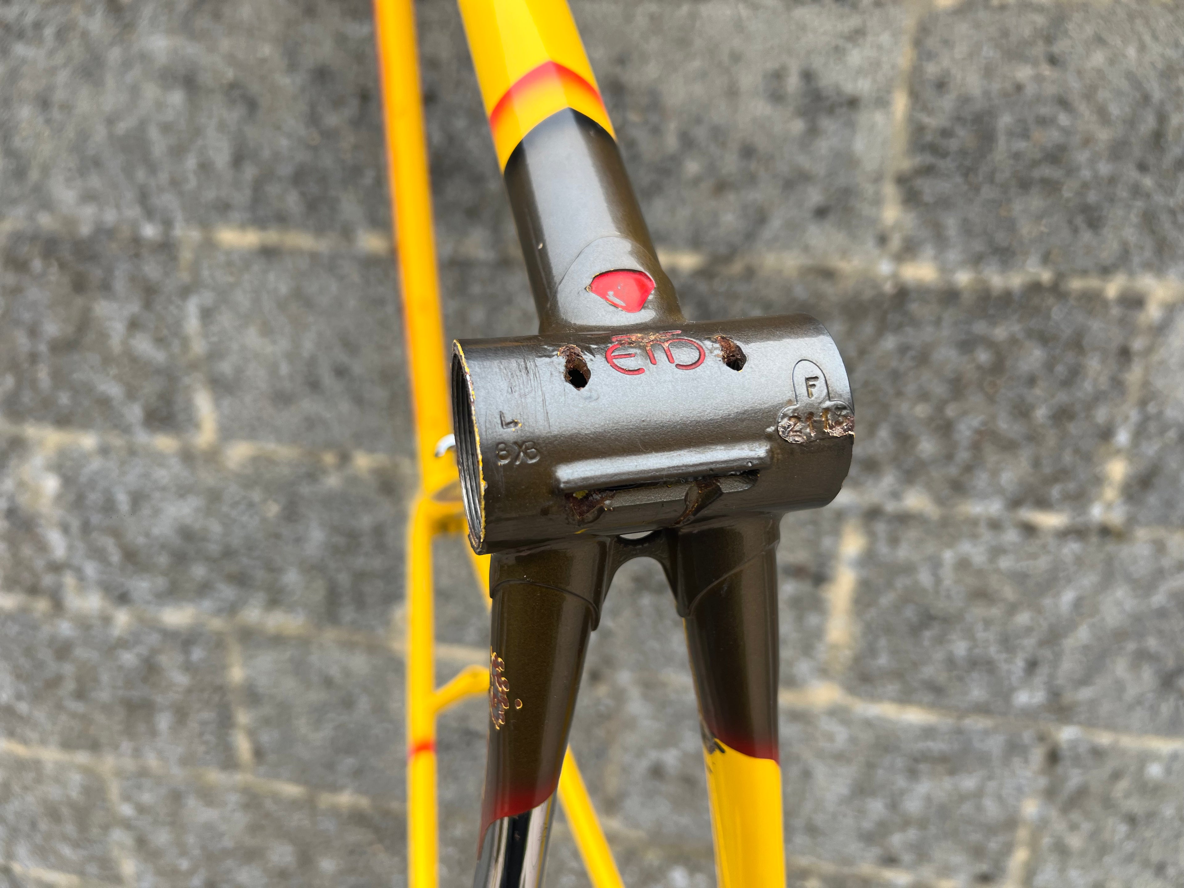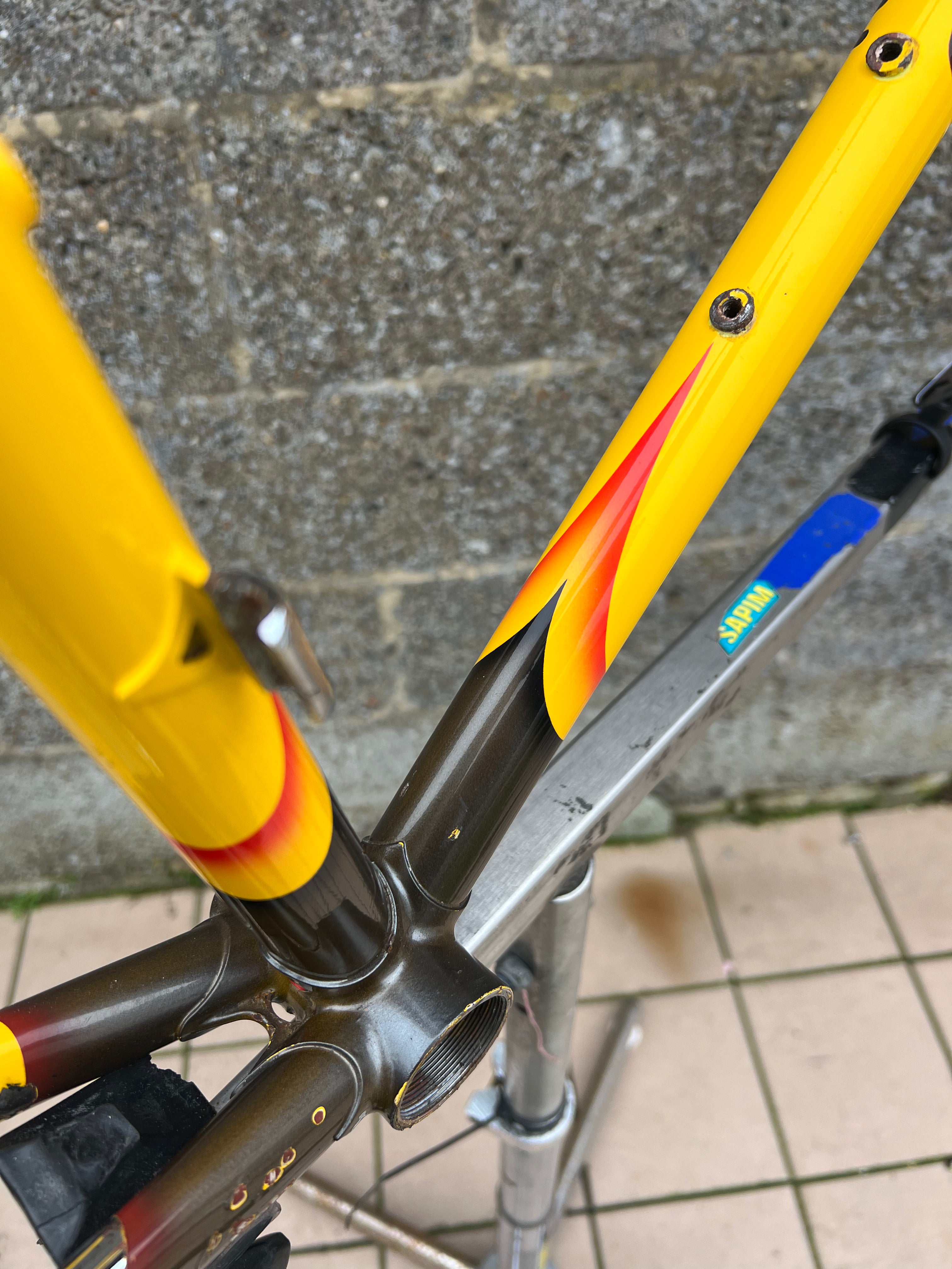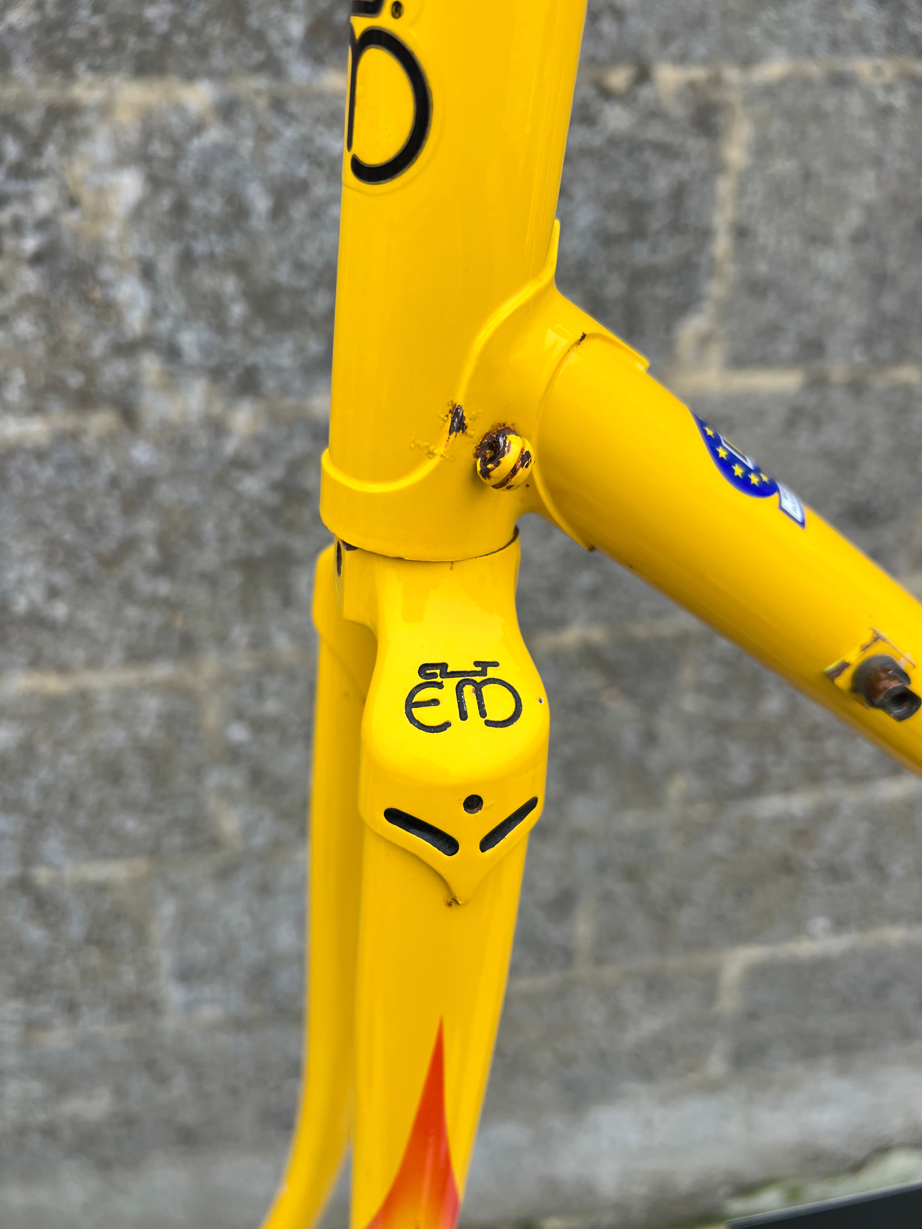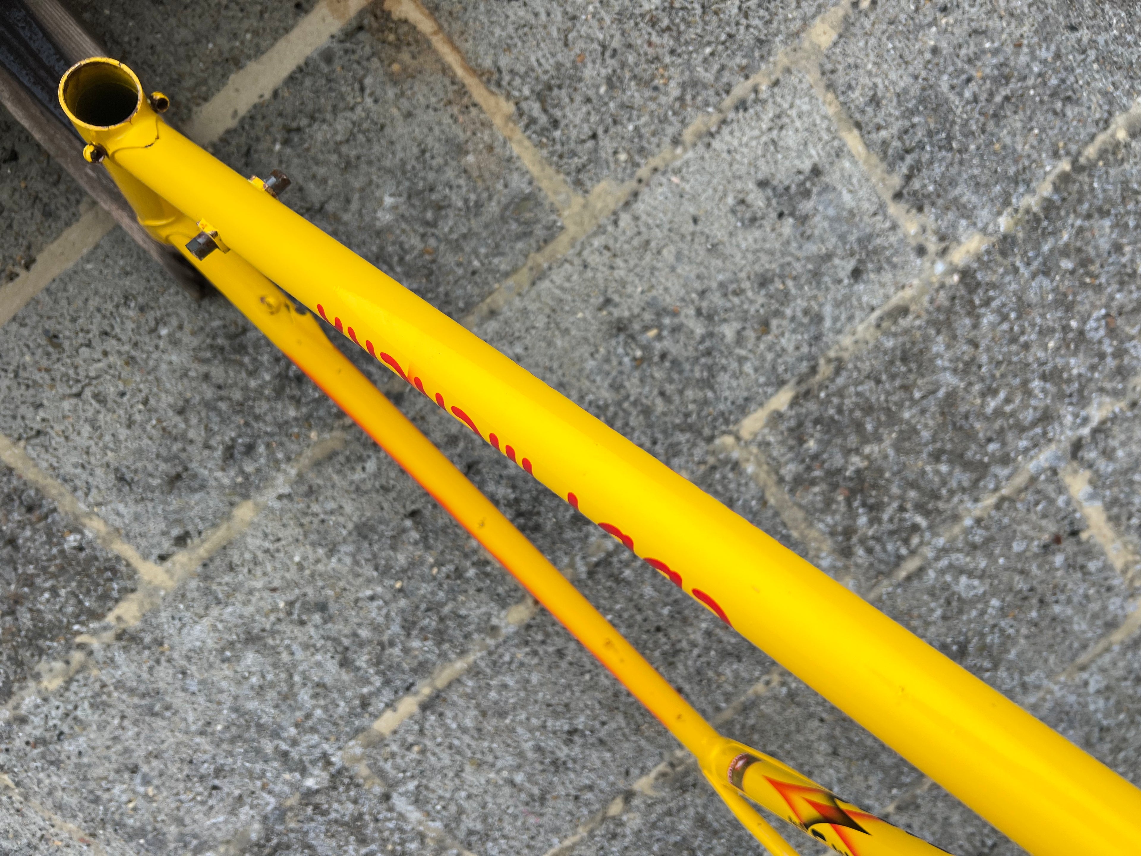 Colombus SLX tubing. Original paint and chrome. No cracks or dents. This frameset is equiped with a racing tag holder for competition. Some very small paintchips and some signs of age on the chrome. Frameset has an anti theft number on the top tube. A real classic. Perfect frameset to build a team replica bike.