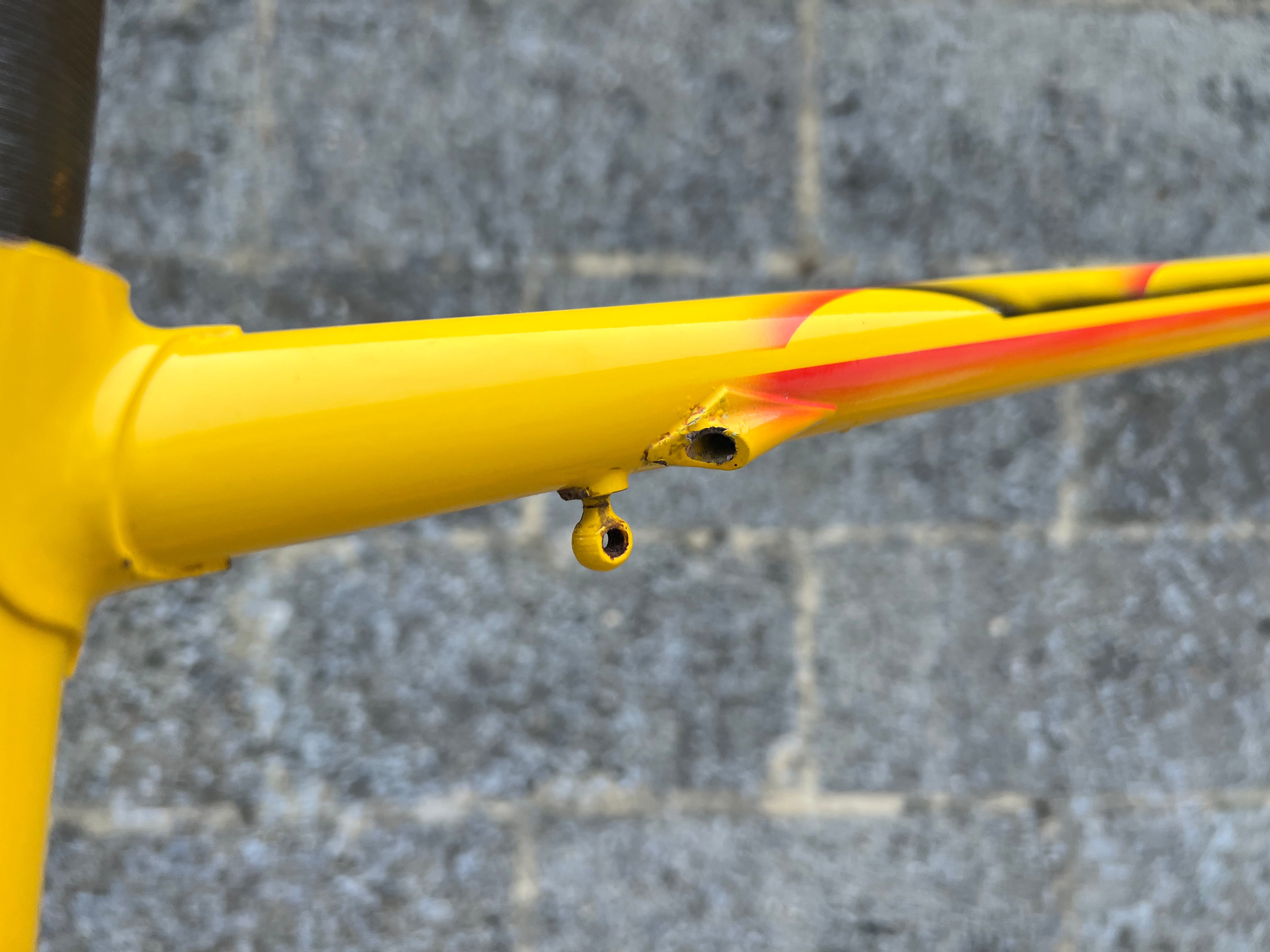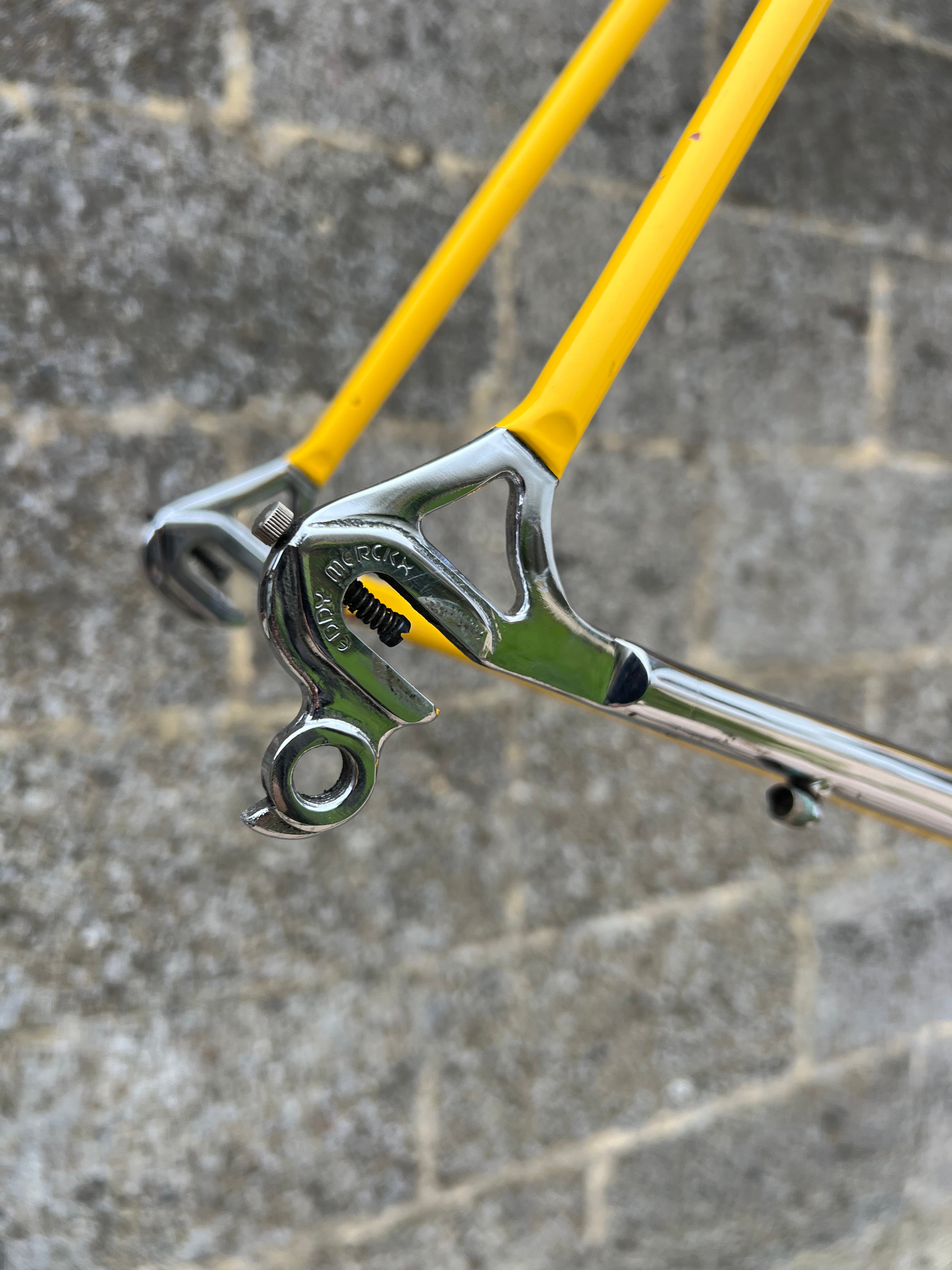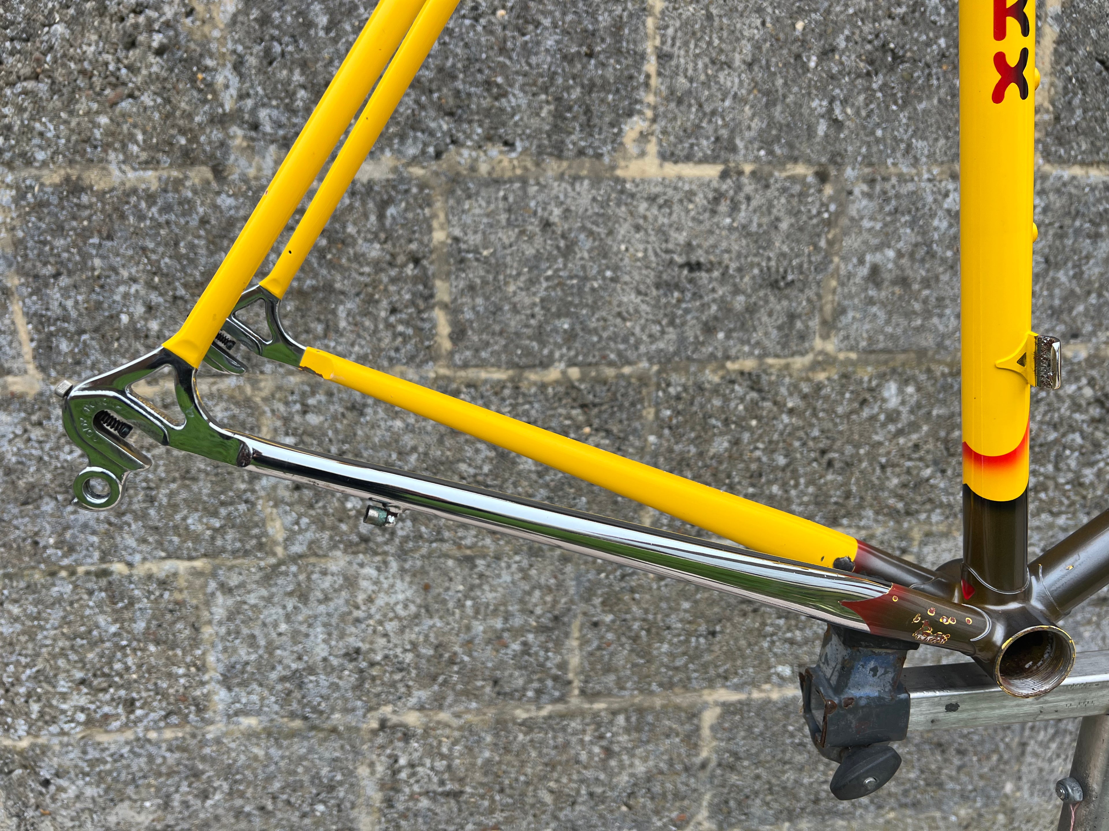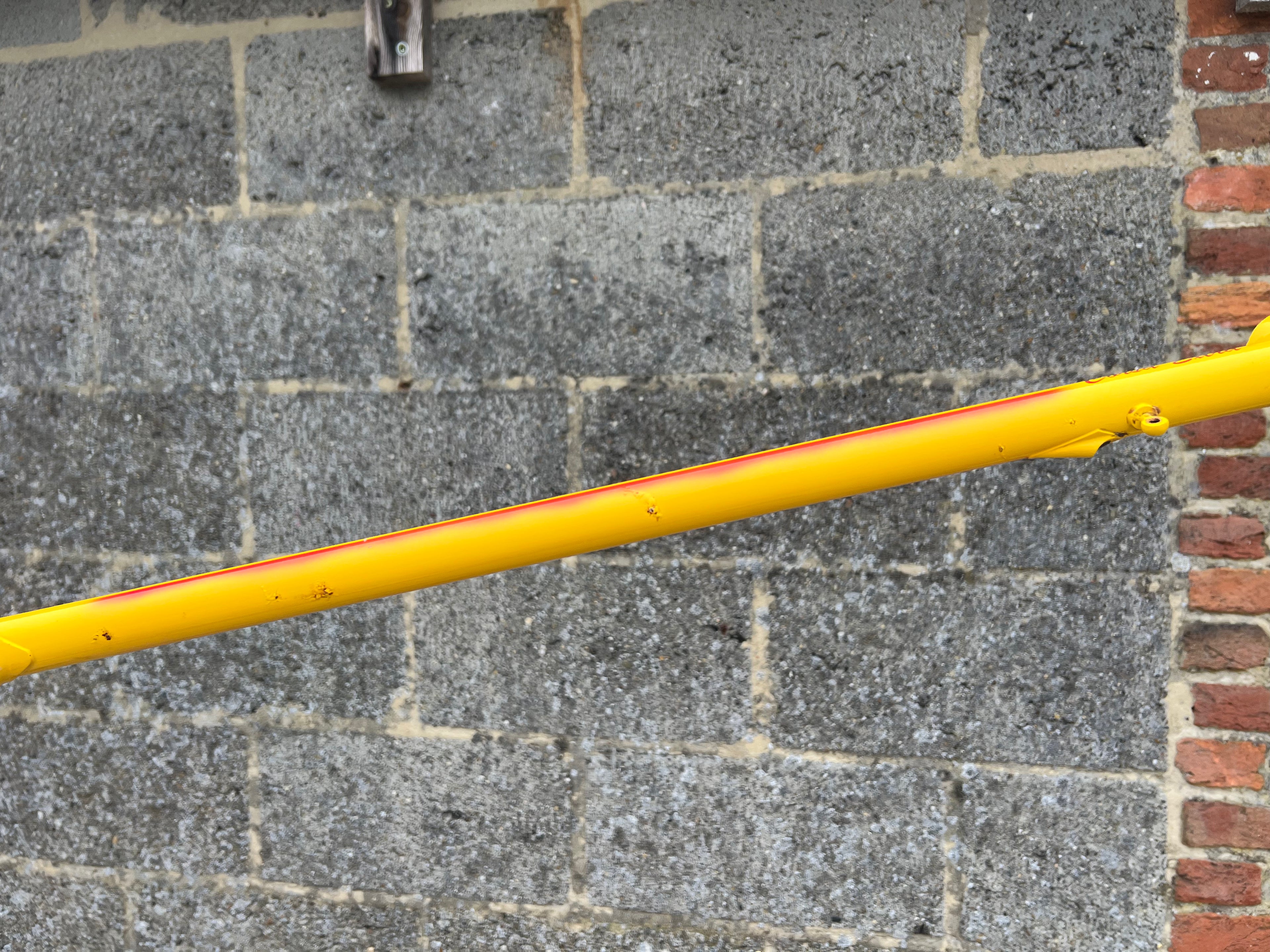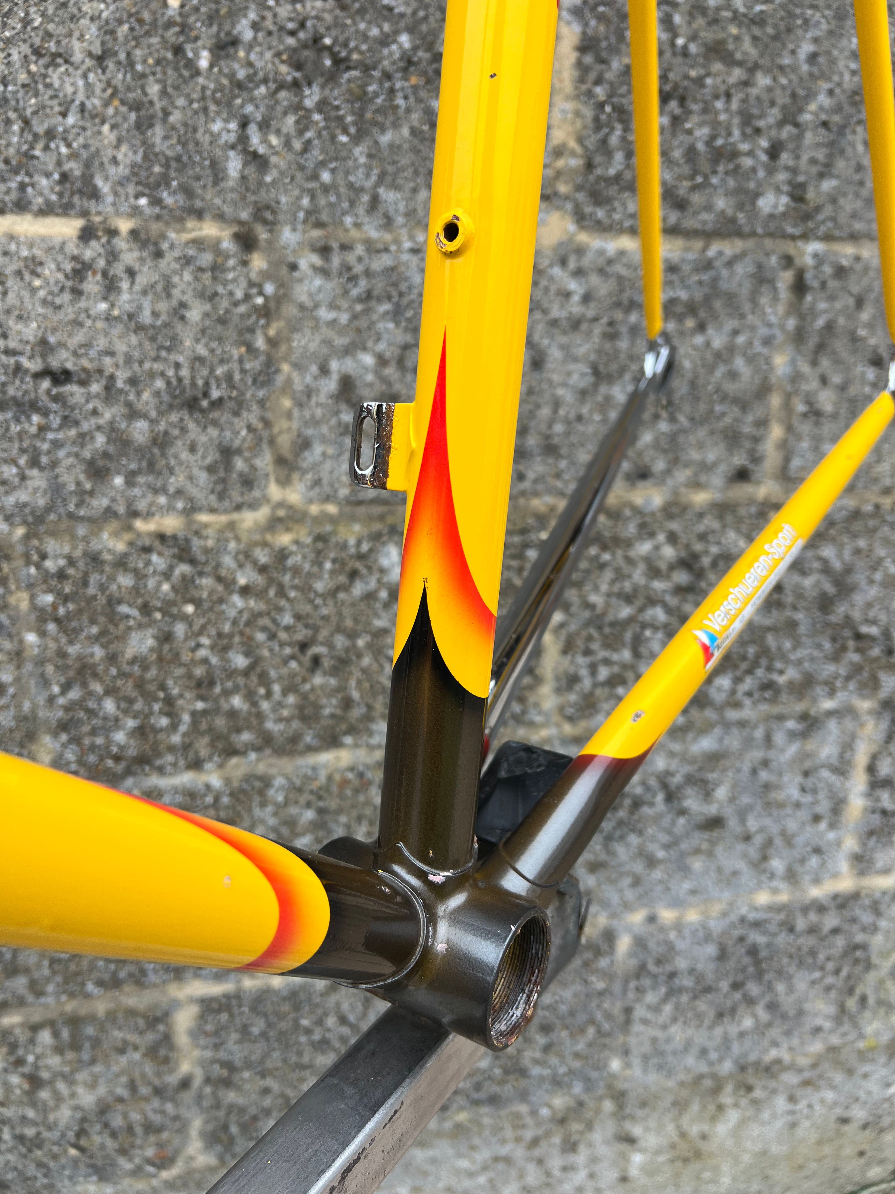 Colombus SLX tubing. Original paint and chrome. No cracks or dents. This frameset is equiped with a racing tag holder for competition. Some very small paintchips and some signs of age on the chrome. Frameset has an anti theft number on the top tube. A real classic. Perfect frameset to build a team replica bike.