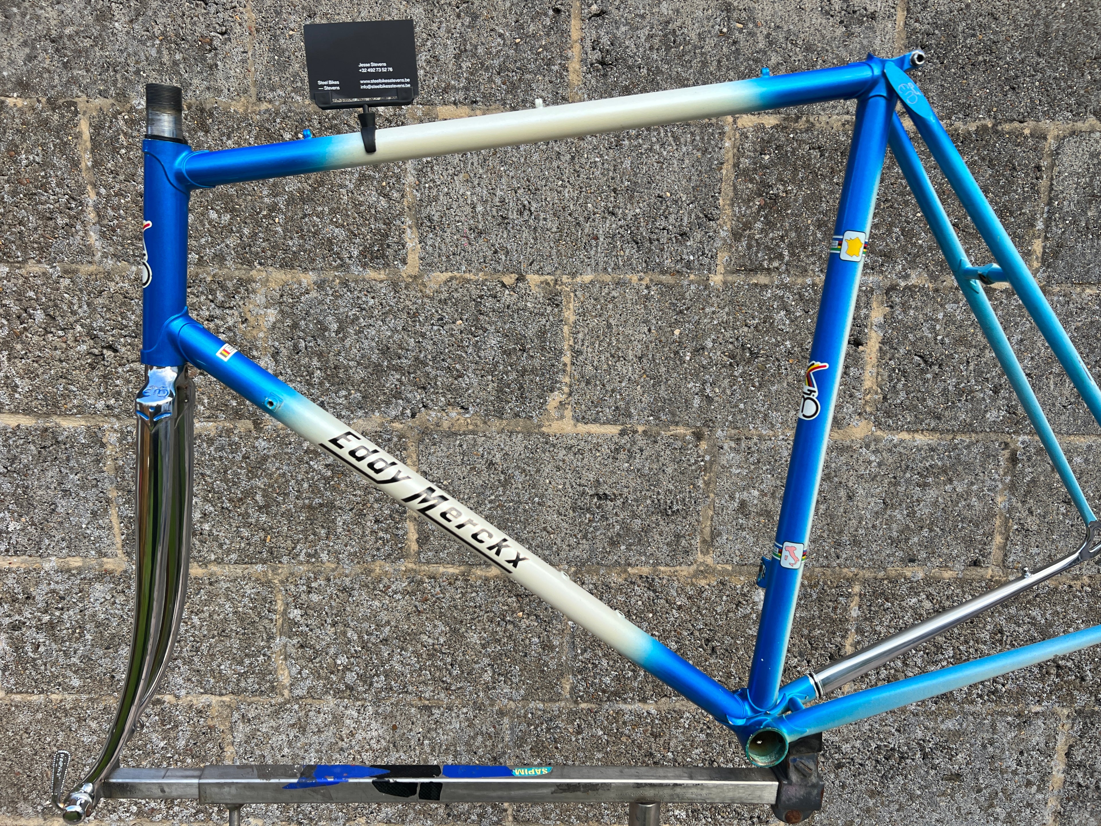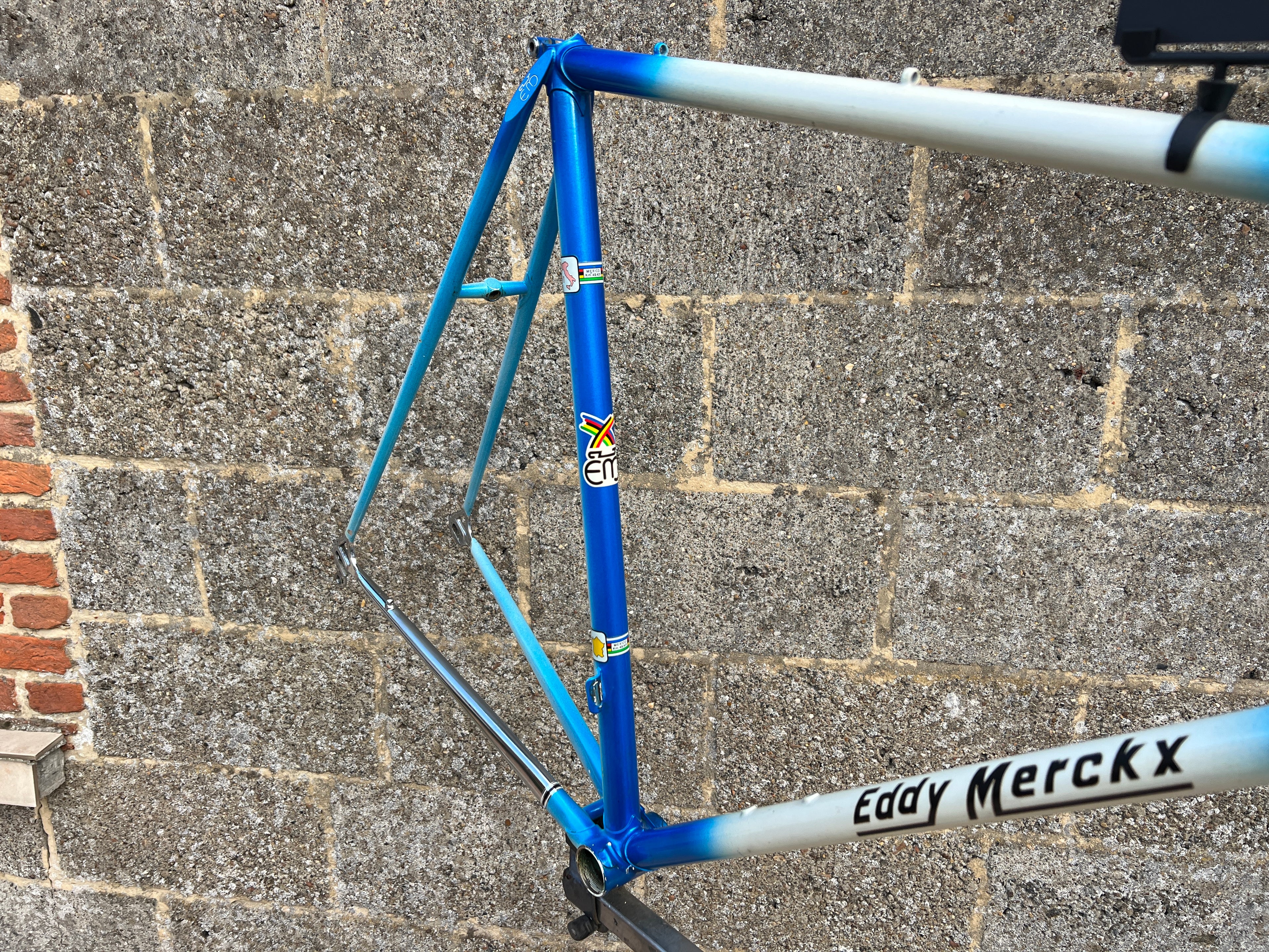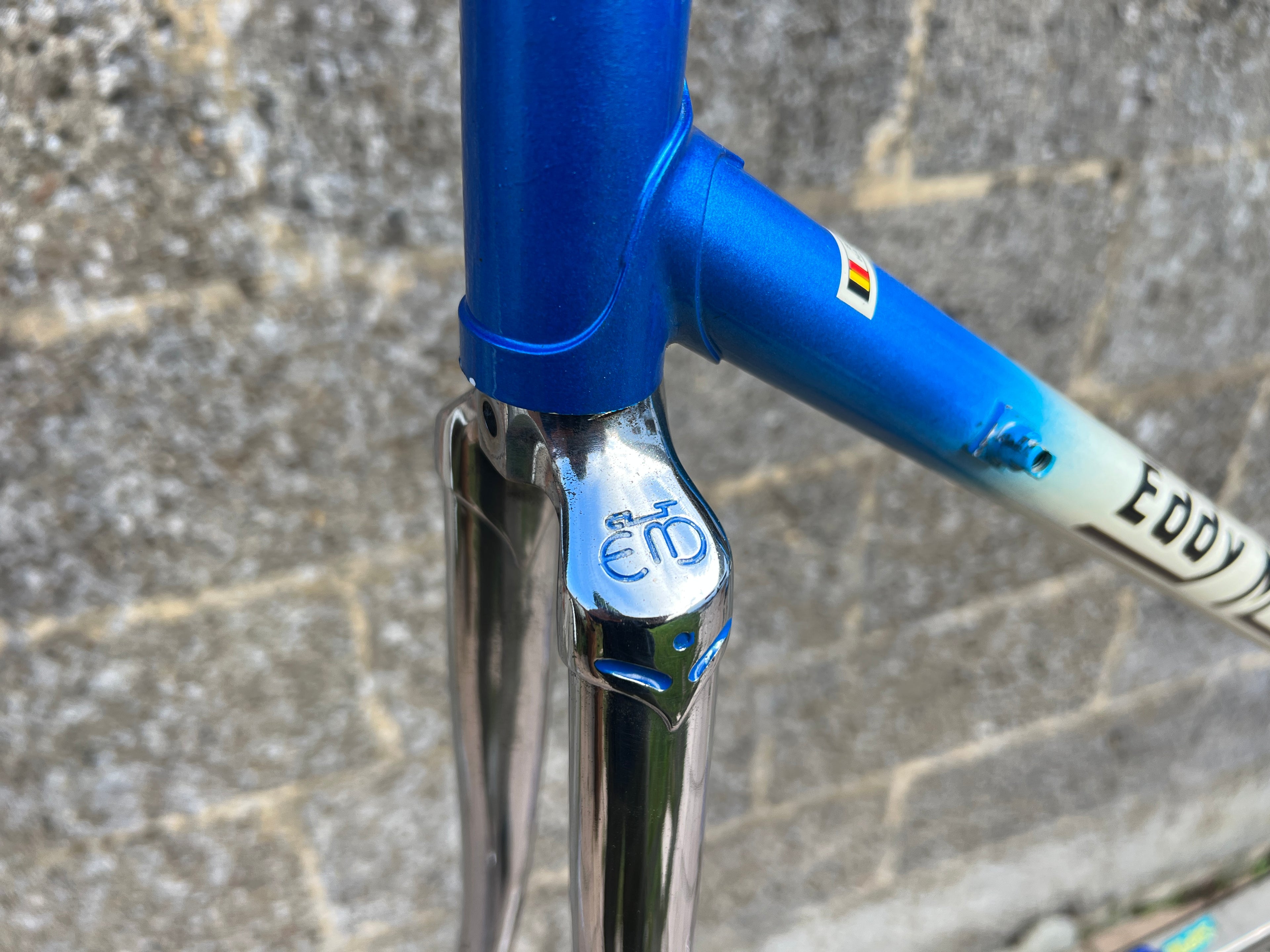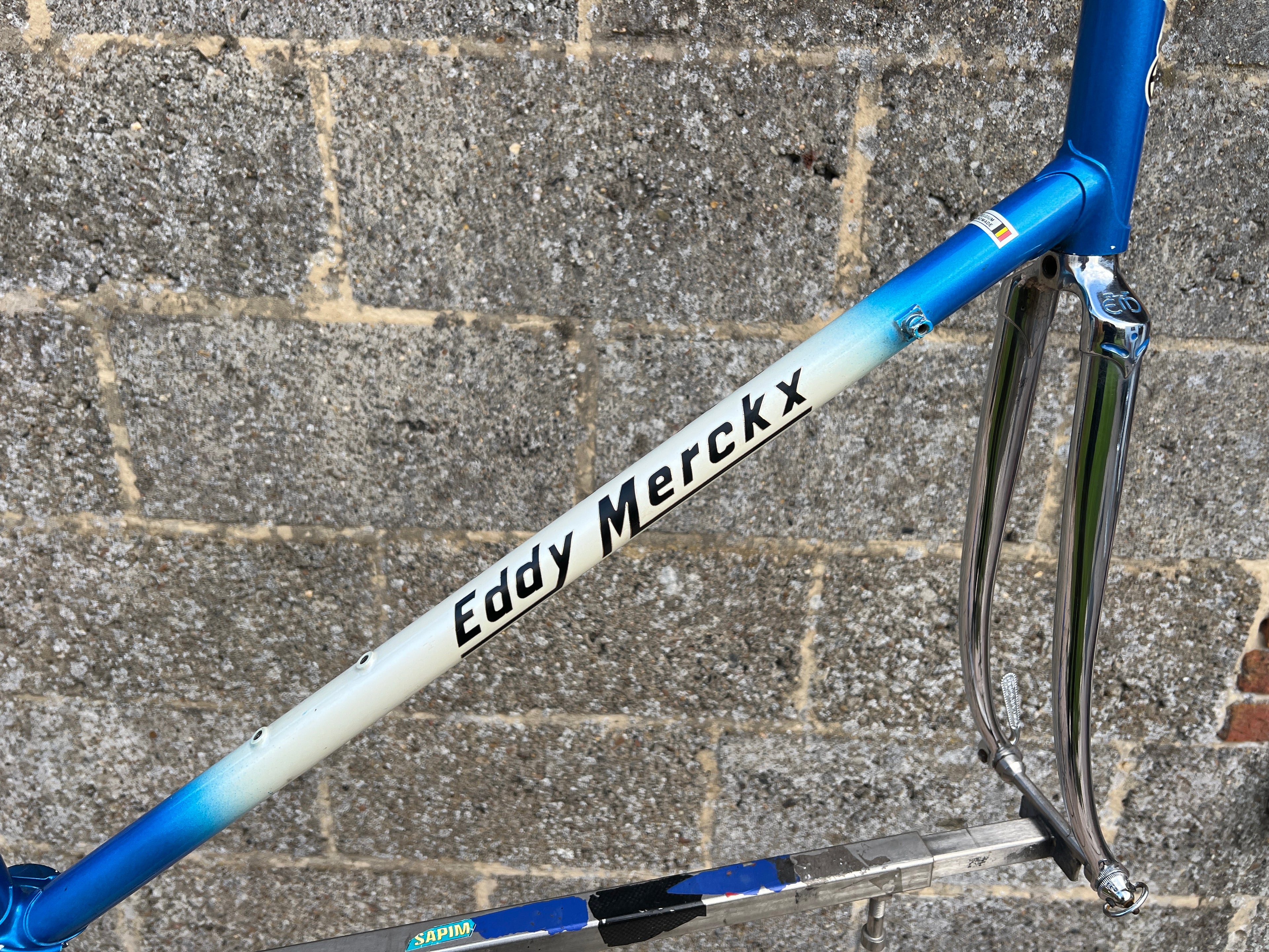 Fantastic Eddy Merckx Professional. Handmade in Belgium with Columbus SL tubing. No cracks, and only a very small dent/paint issue under the down tube. No structural damage at all. Some small paint chips and minor signs of age on the chrome, but nothing serious. A true Belgian classic.
