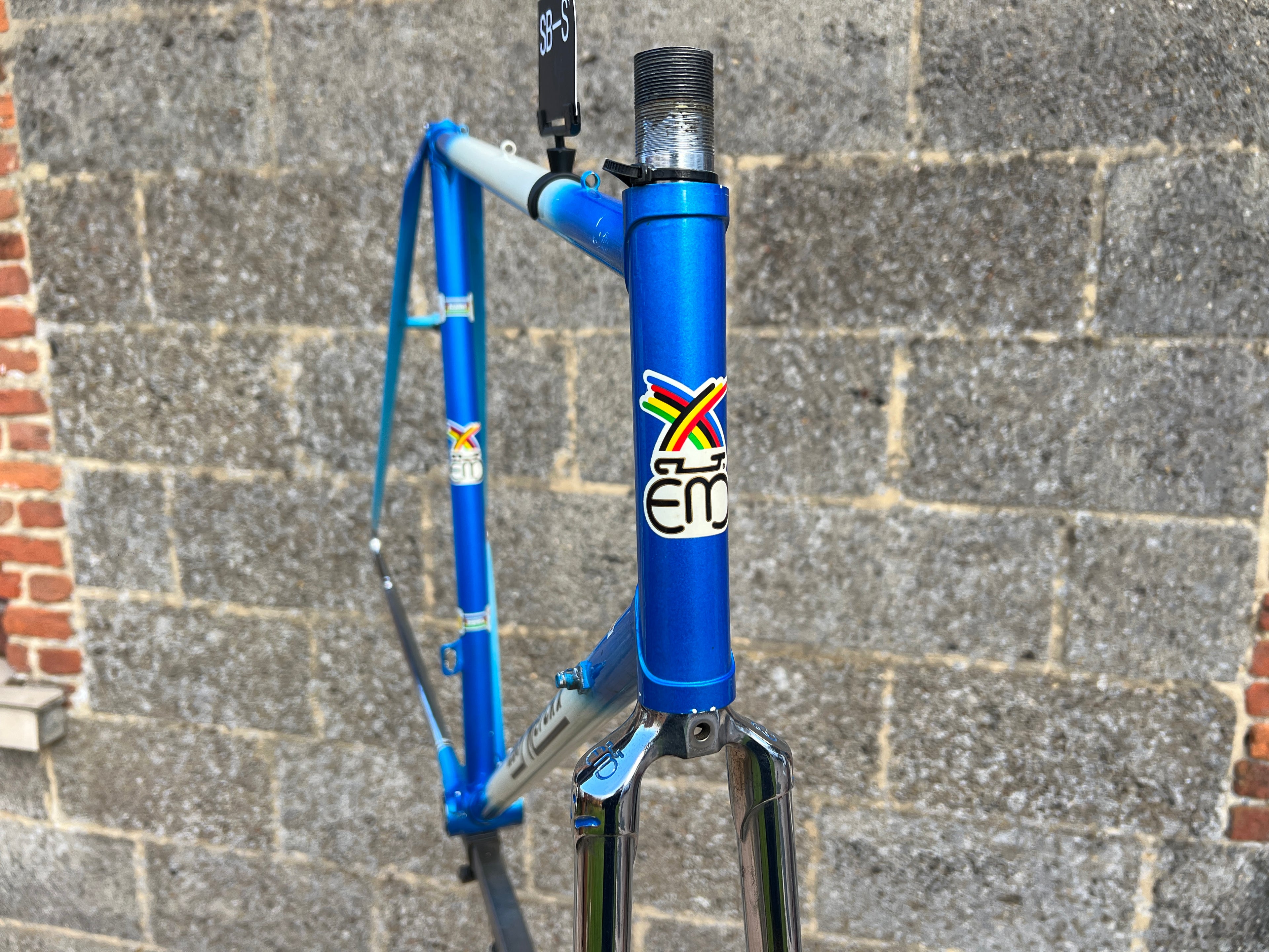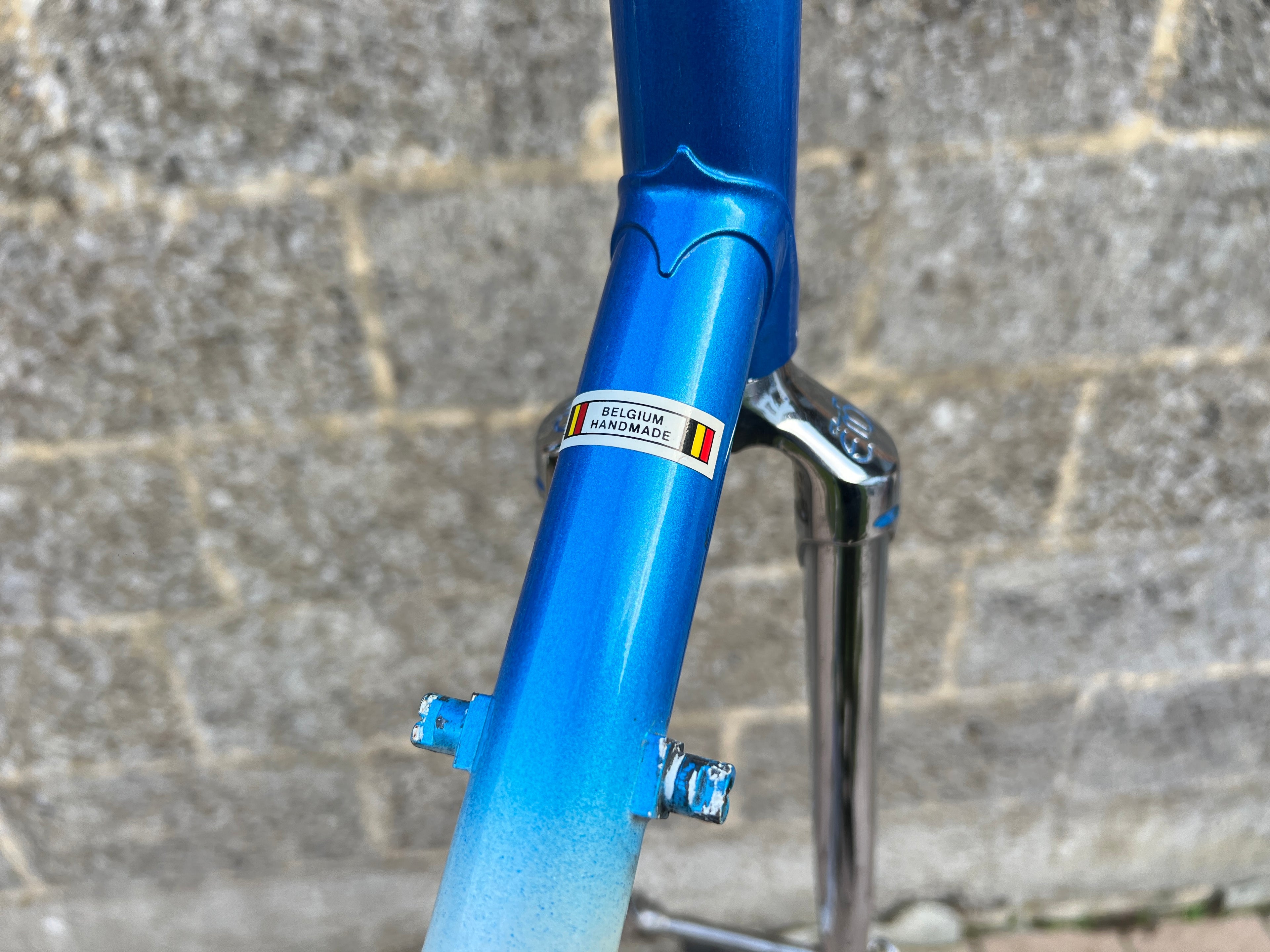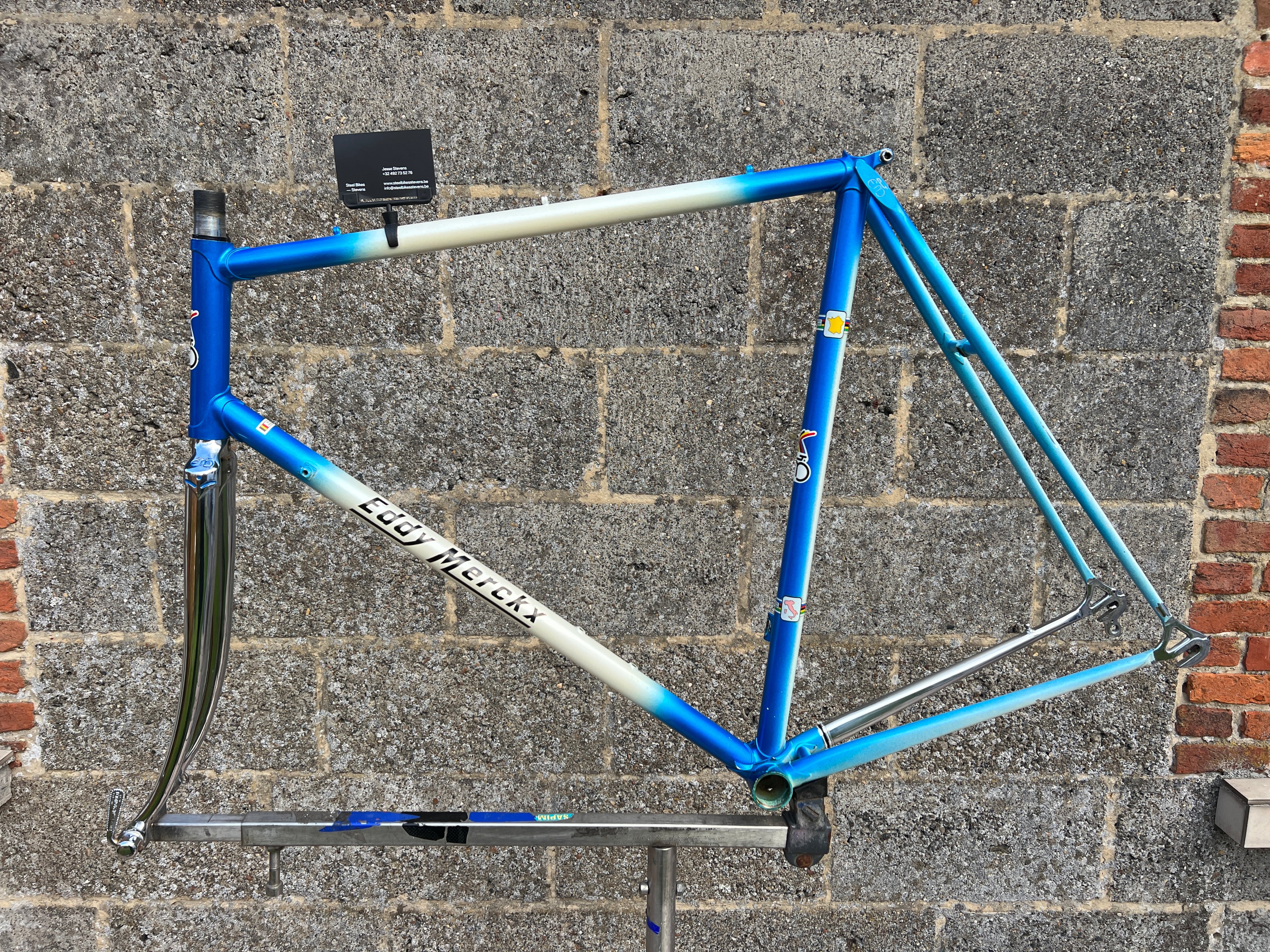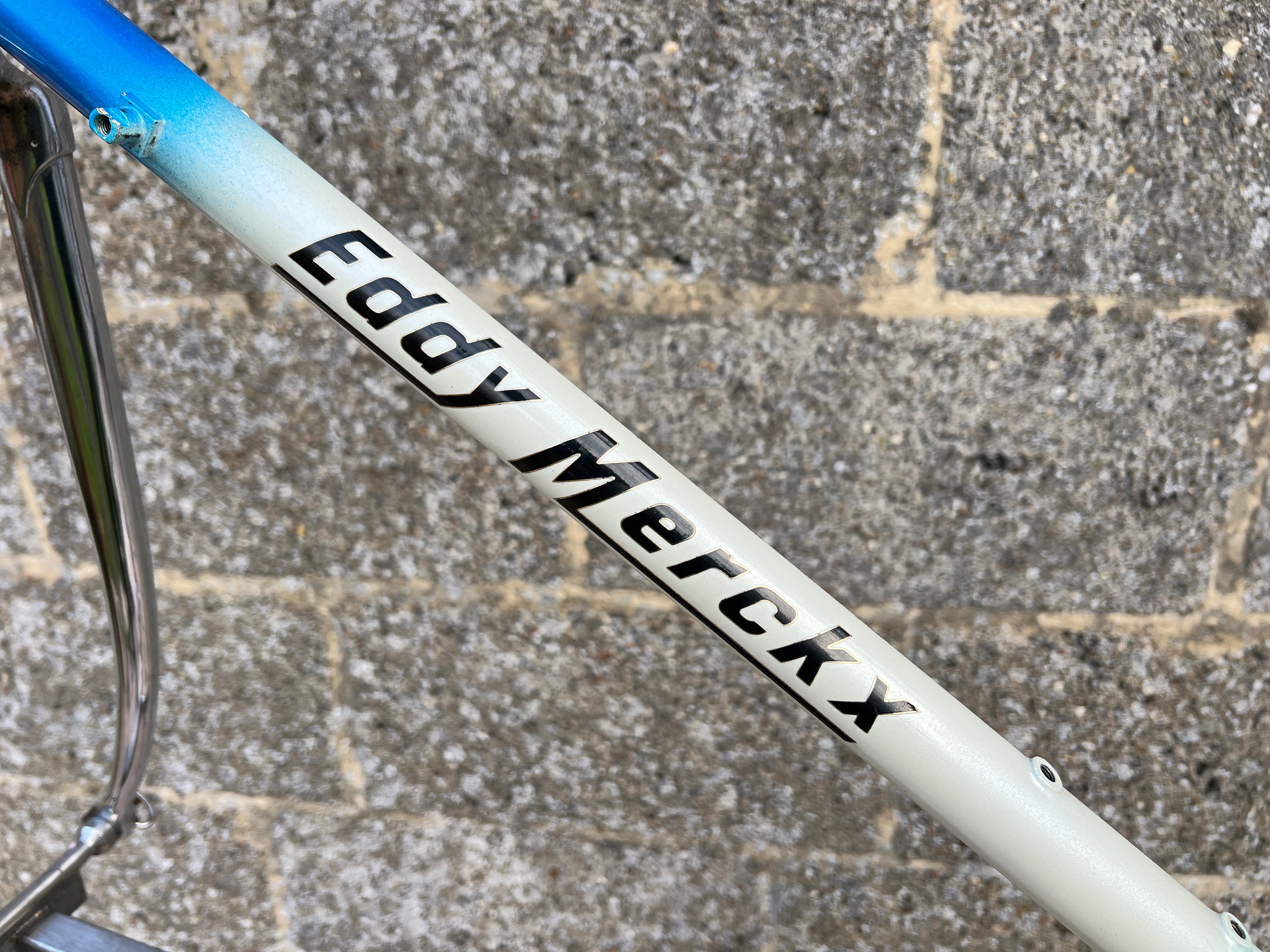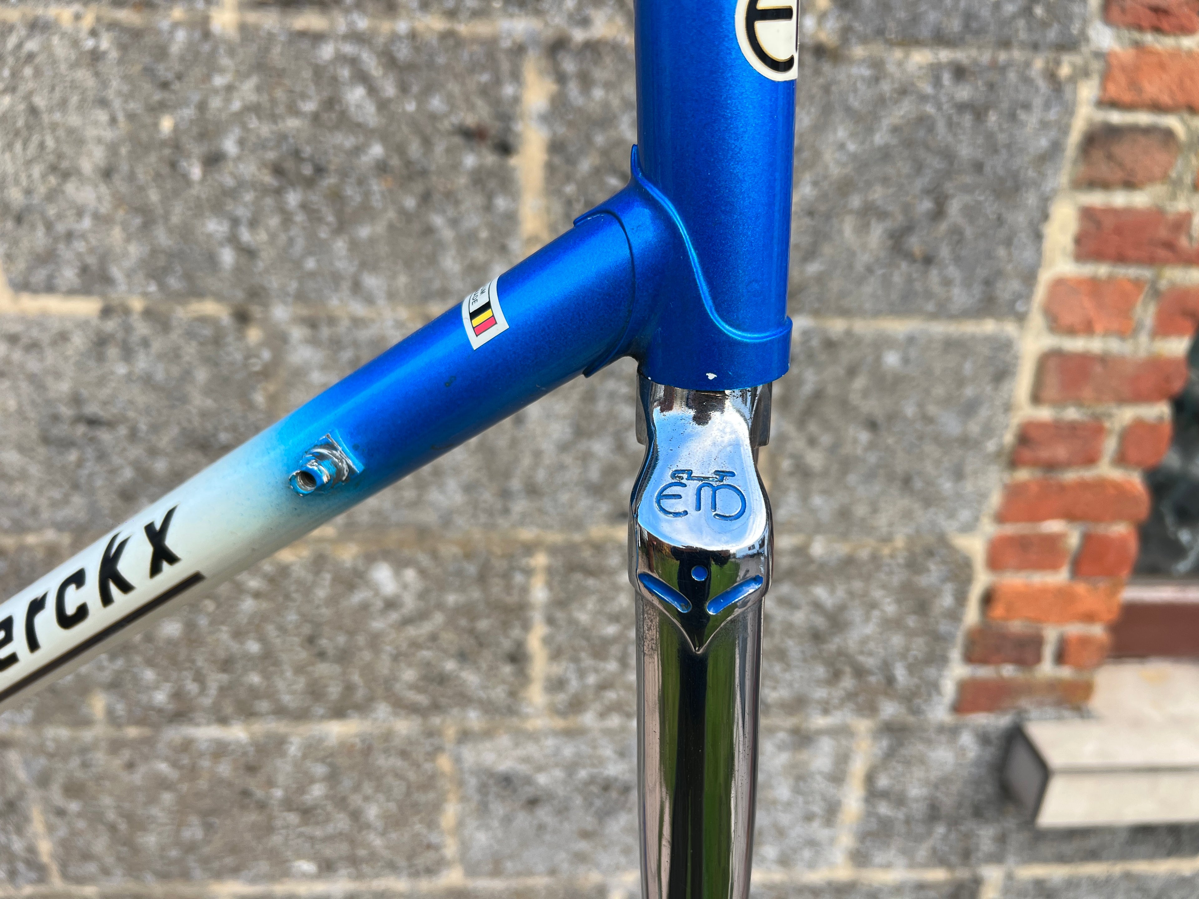 Fantastic Eddy Merckx Professional. Handmade in Belgium with Columbus SL tubing. No cracks, and only a very small dent/paint issue under the down tube. No structural damage at all. Some small paint chips and minor signs of age on the chrome, but nothing serious. A true Belgian classic.