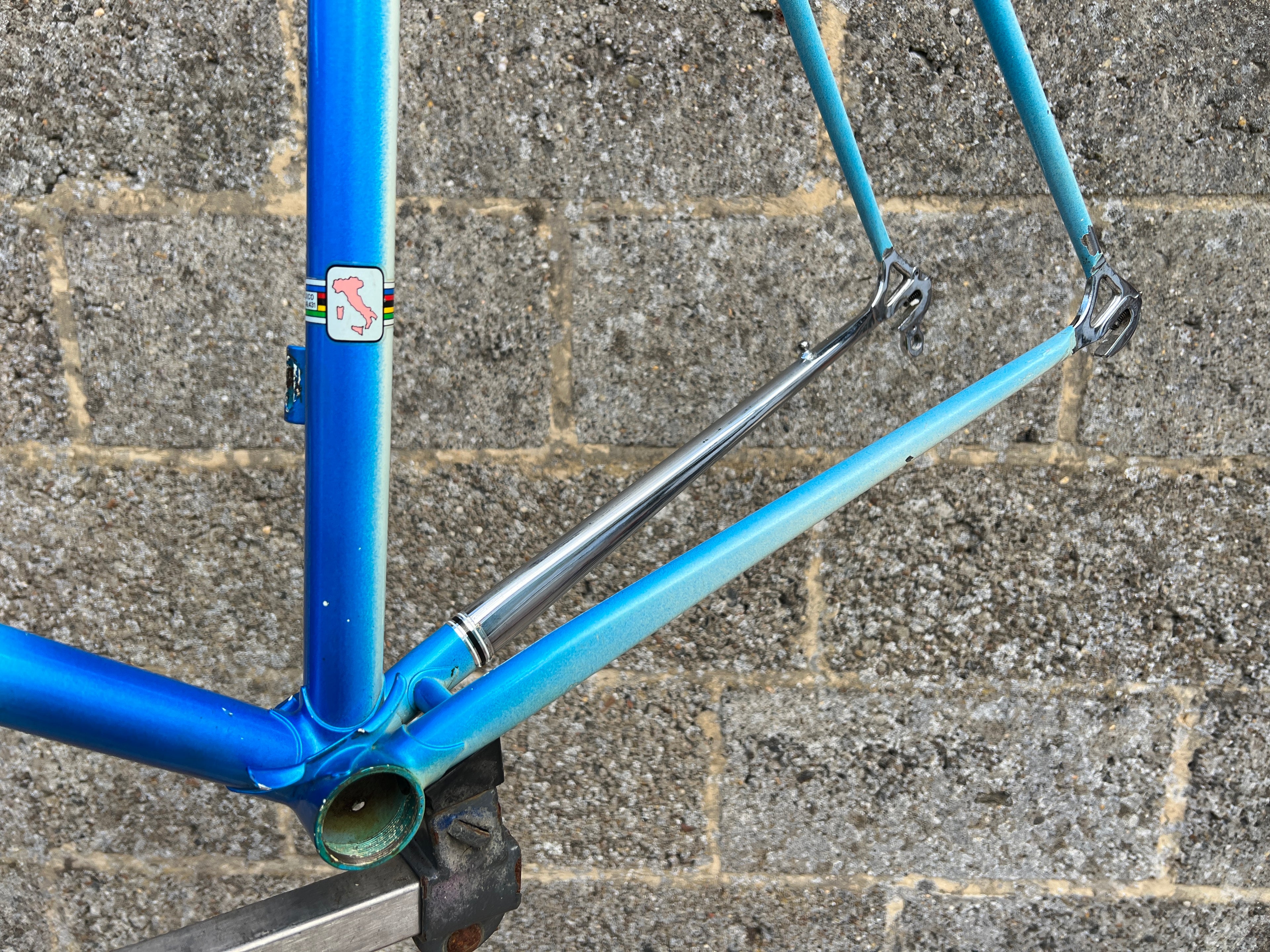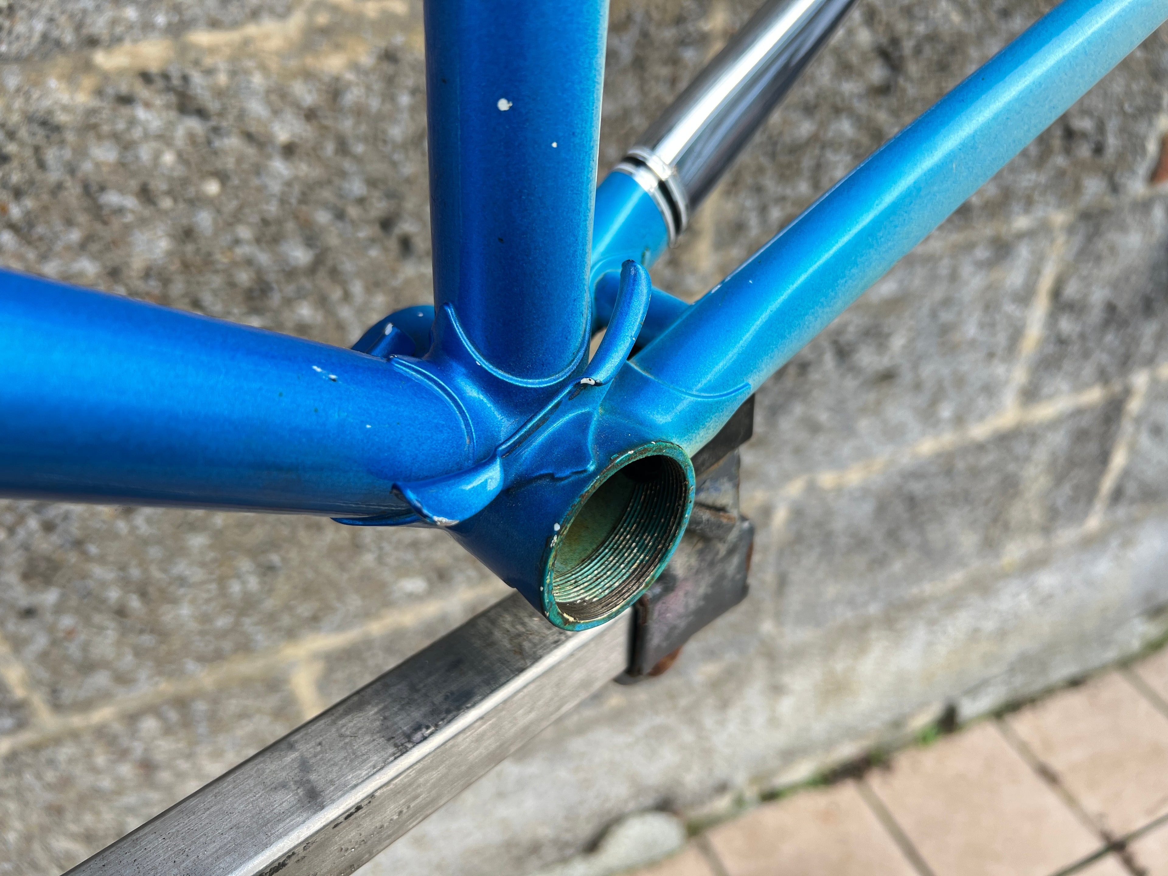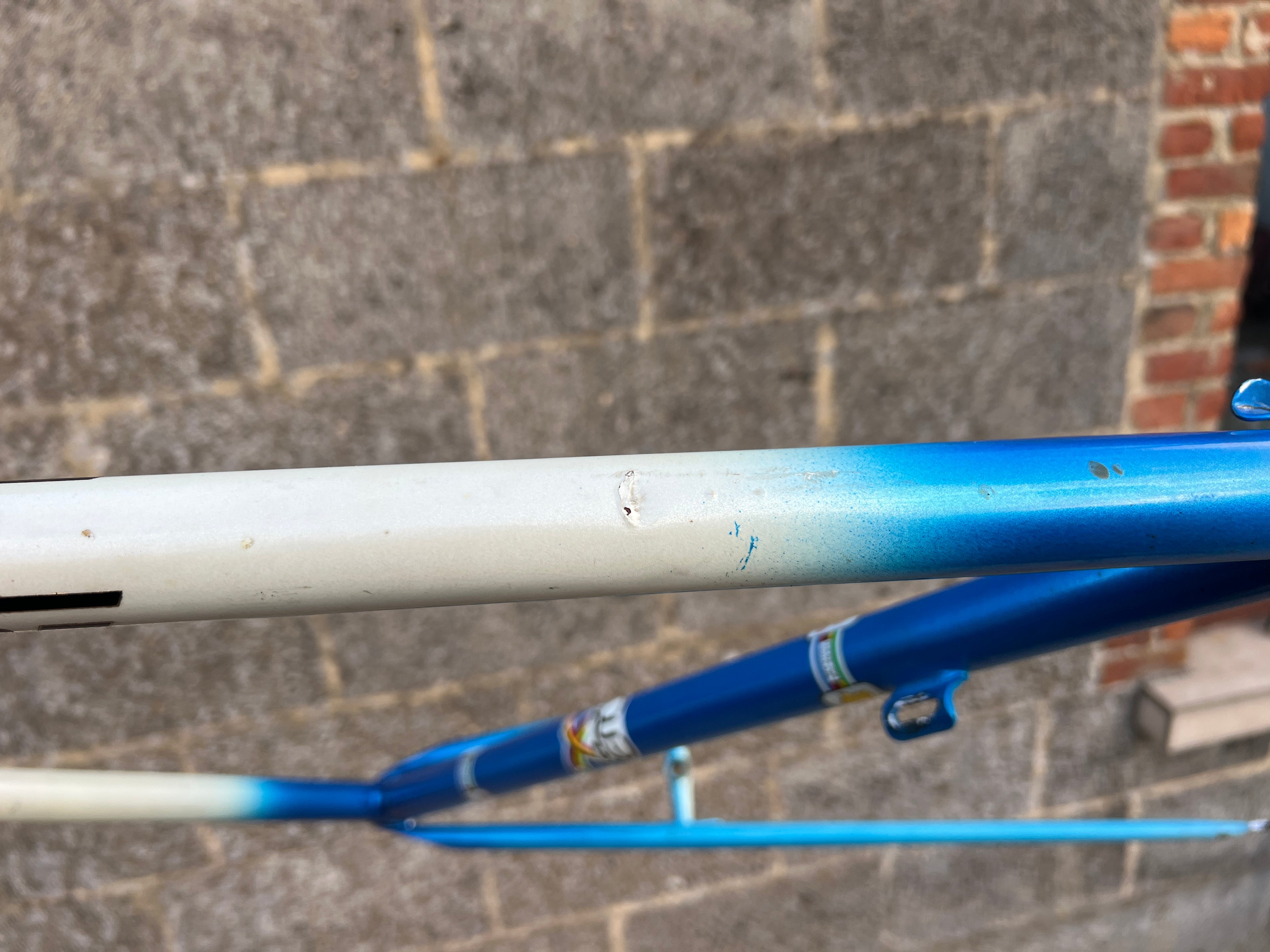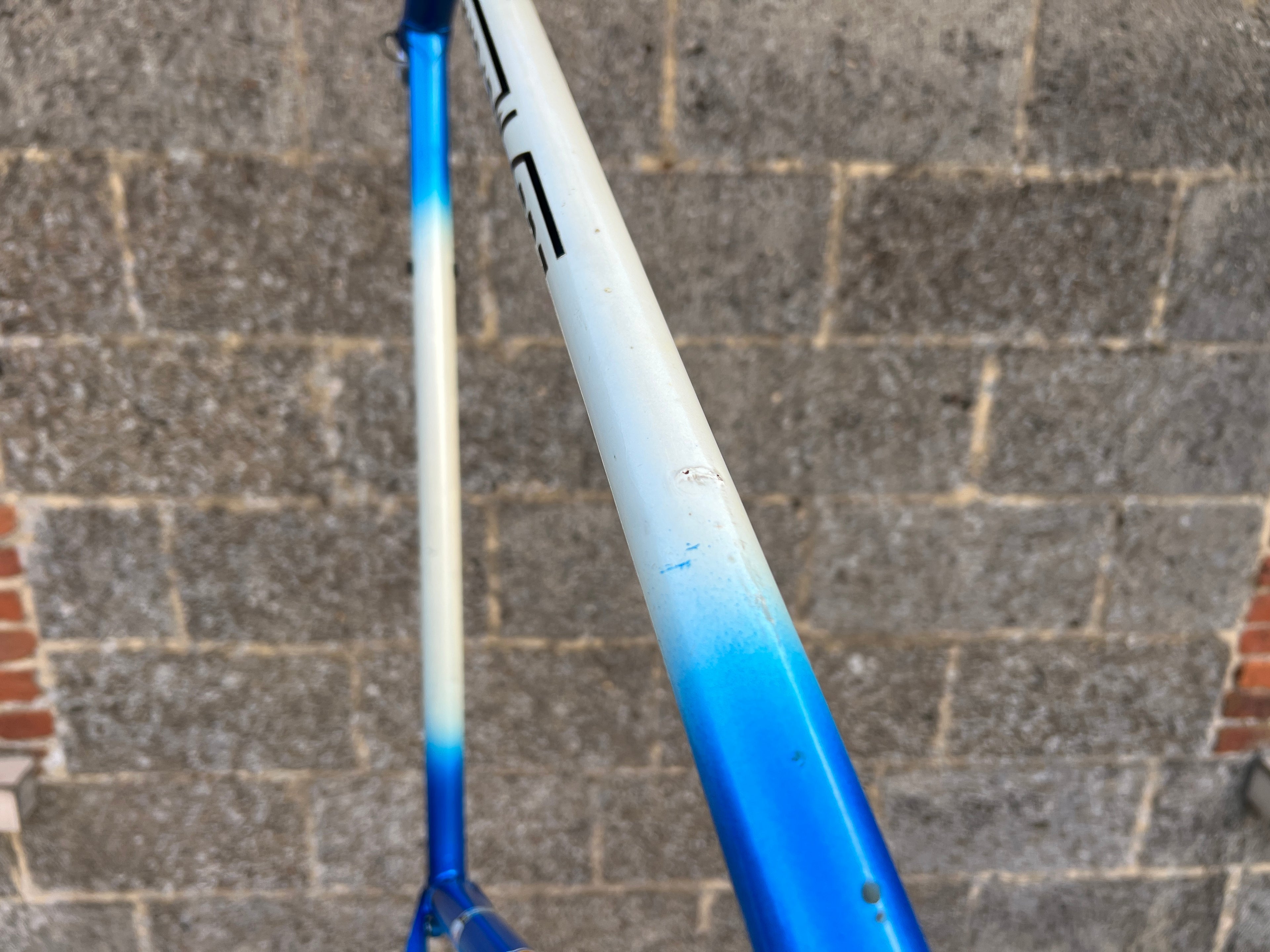 Fantastic Eddy Merckx Professional. Handmade in Belgium with Columbus SL tubing. No cracks, and only a very small dent/paint issue under the down tube. No structural damage at all. Some small paint chips and minor signs of age on the chrome, but nothing serious. A true Belgian classic.