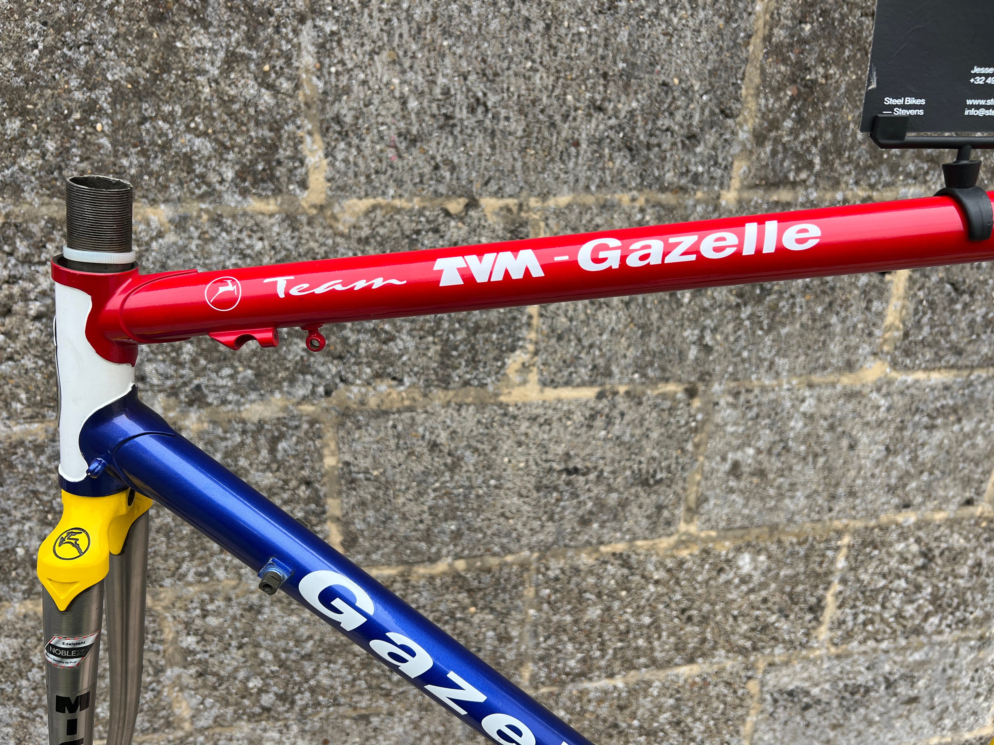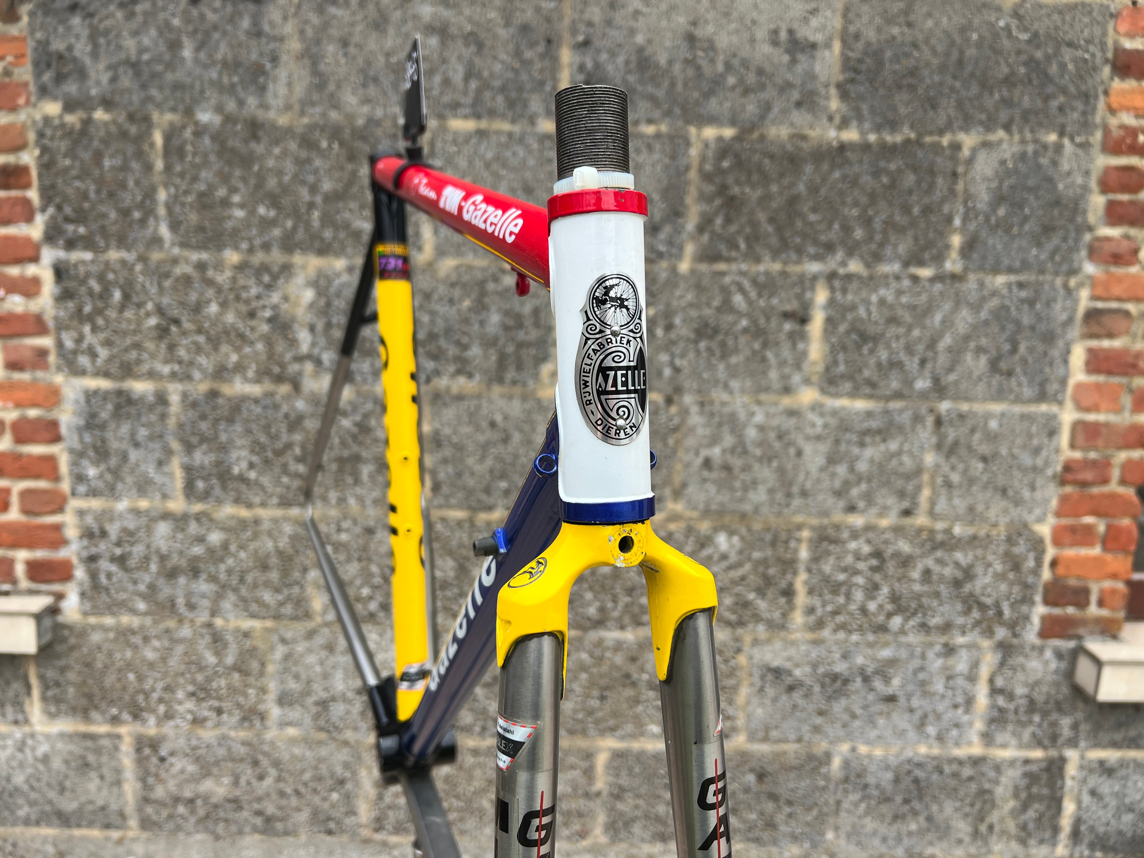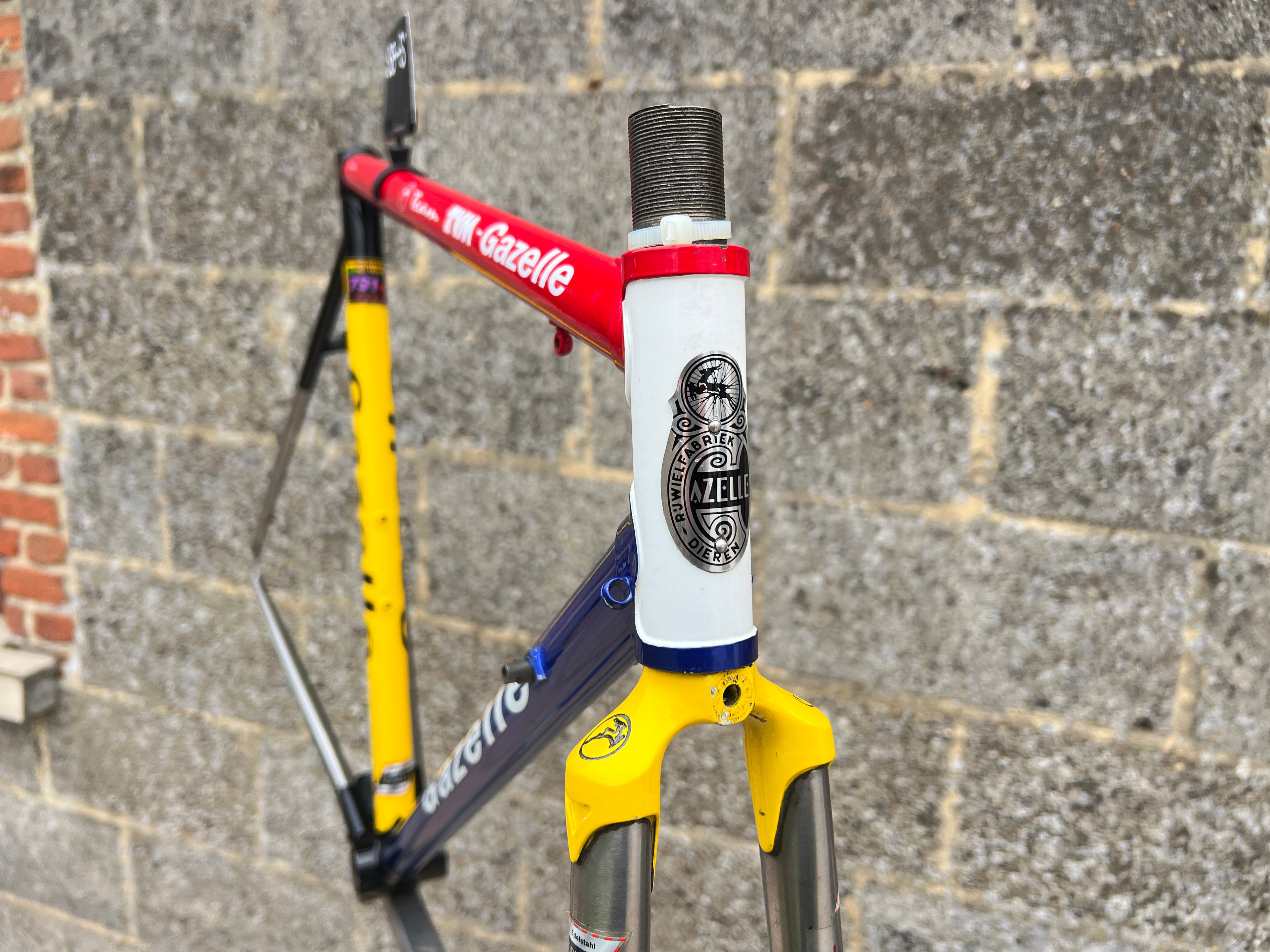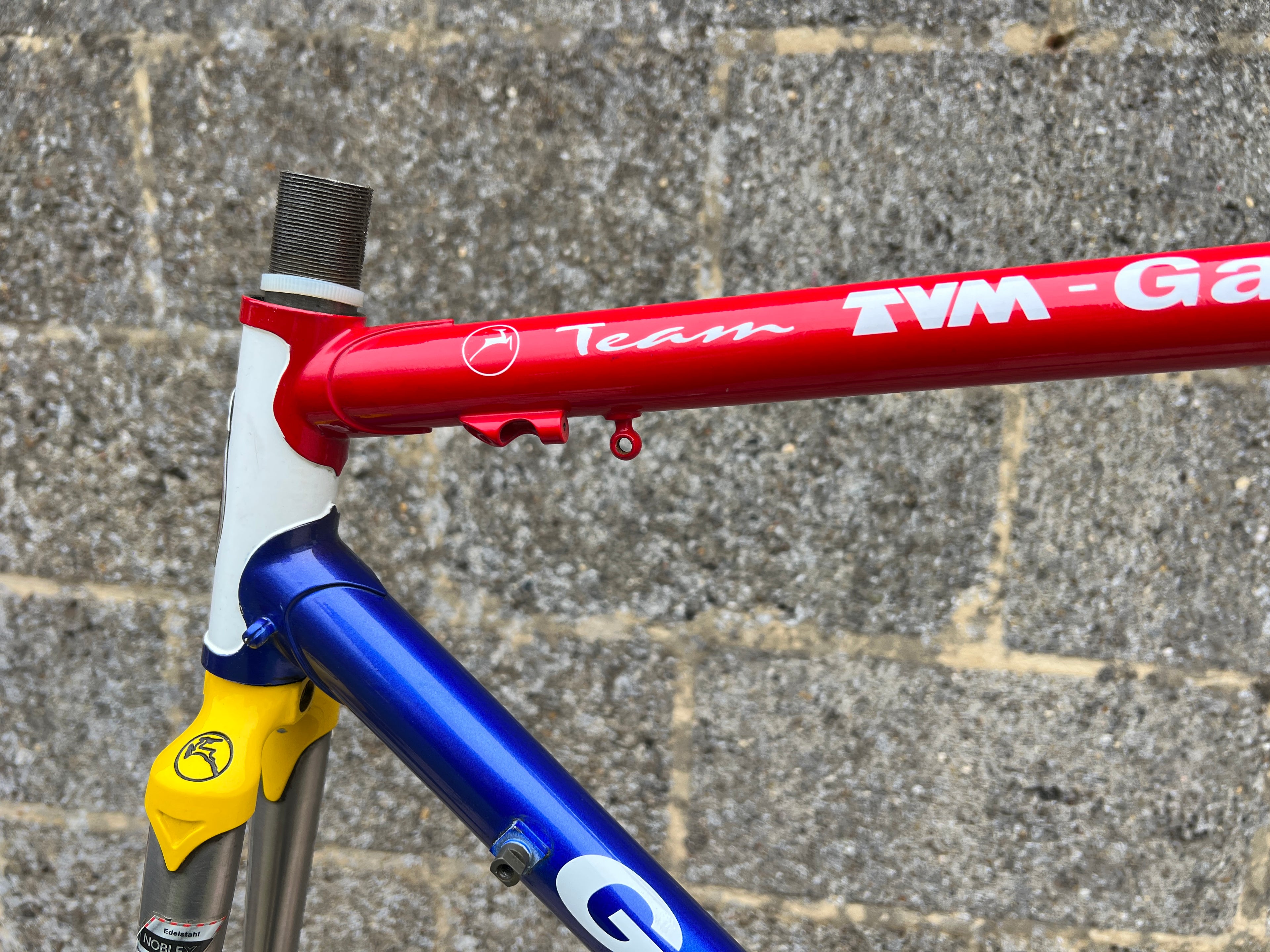 For sale is an exceptionally rare 1995 Gazelle Ex Team TVM frameset. An authentic pro-level frame ridden by Bo Hamburger during the iconic 1995 season. This is not a reproduction or shop version but a genuine team frameset. The main triangle is constructed from Reynolds 731 OS Race tubing. One of the most advanced and highly regarded steel racing tubesets of its era. Complementing it is a Noblex Edelstahl stainless steel fork and rear triangle, crafted in Germany. This combination delivers precise handling, durability and a striking aesthetic that sets it apart from typical steel frames. The frameset still carries the unmistakable 1995 Team TVM livery. Its condition is excellent for its age. No cracks. Ideal for anyone looking to build a premium period correct race bike or to add a true collector’s item to a vintage cycling collection.