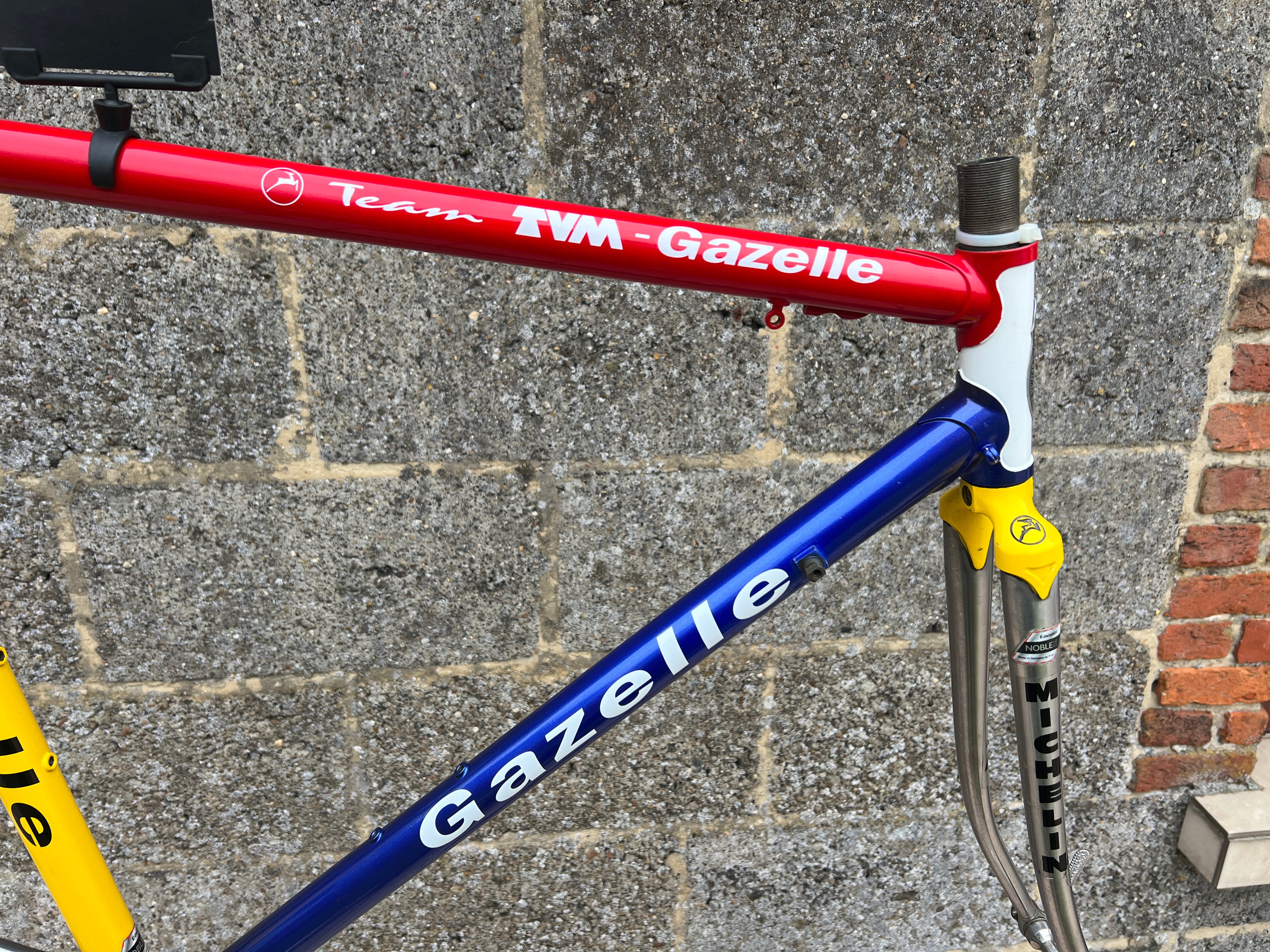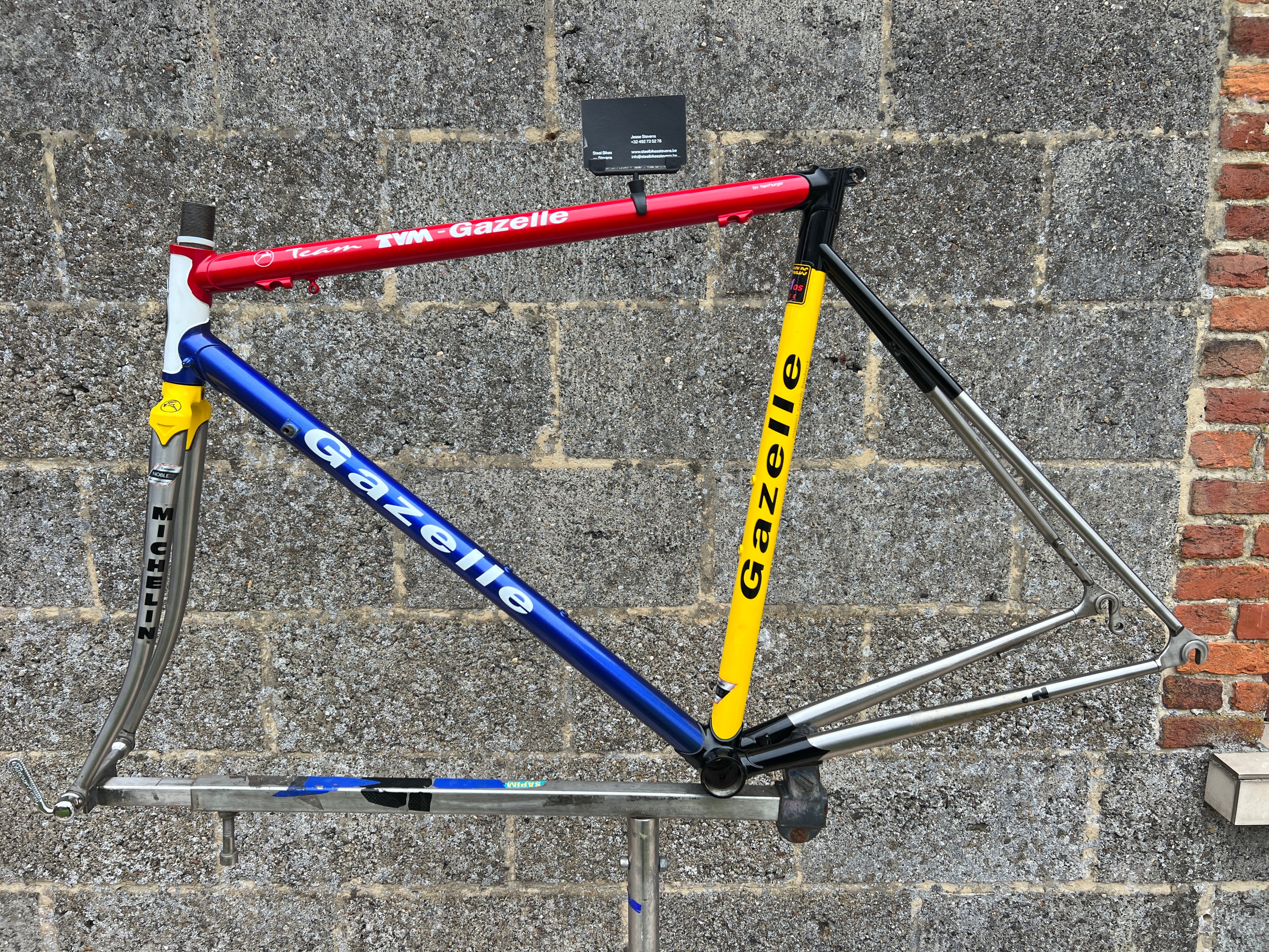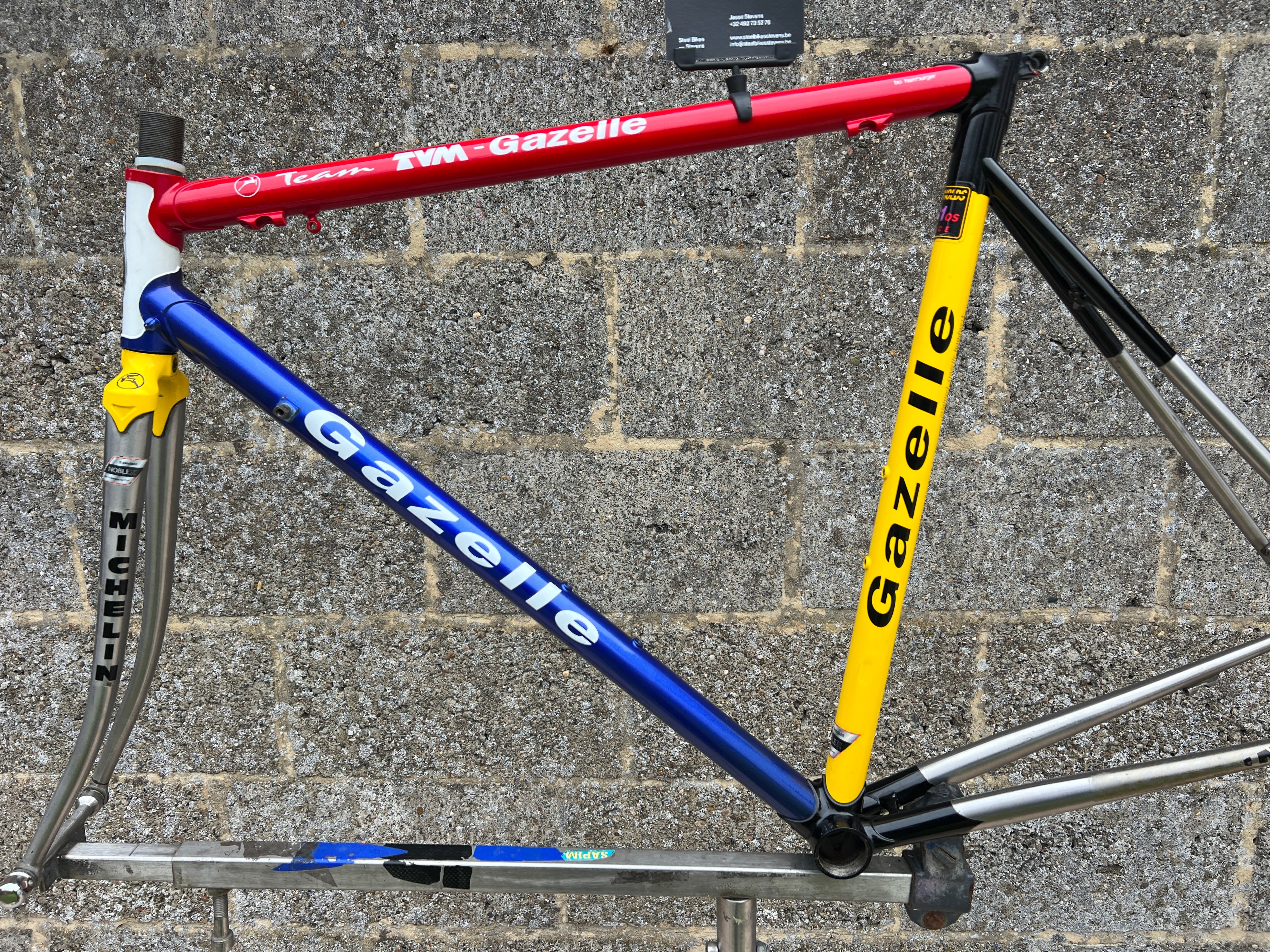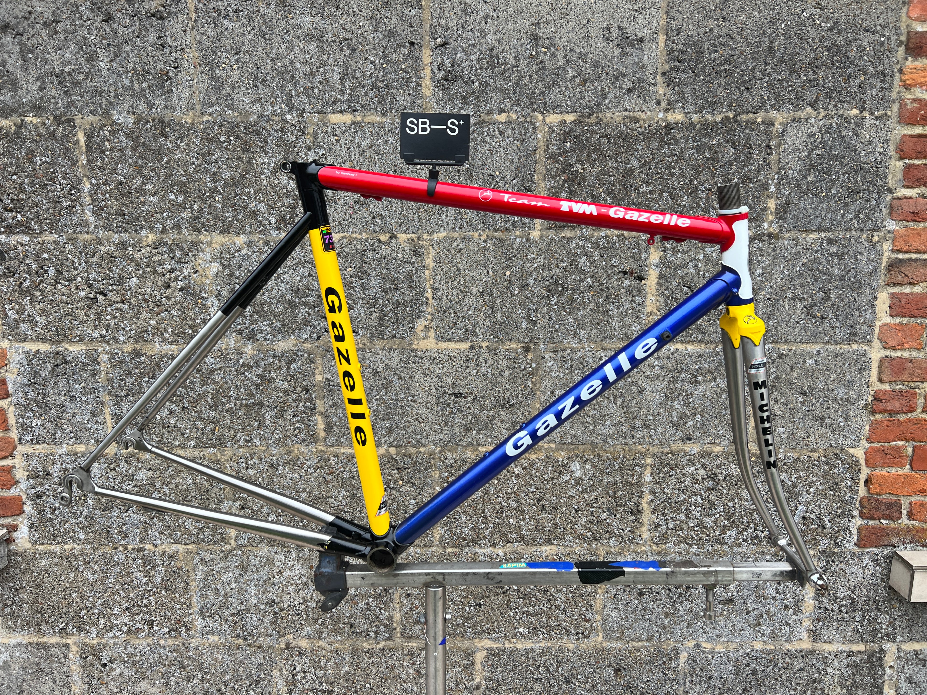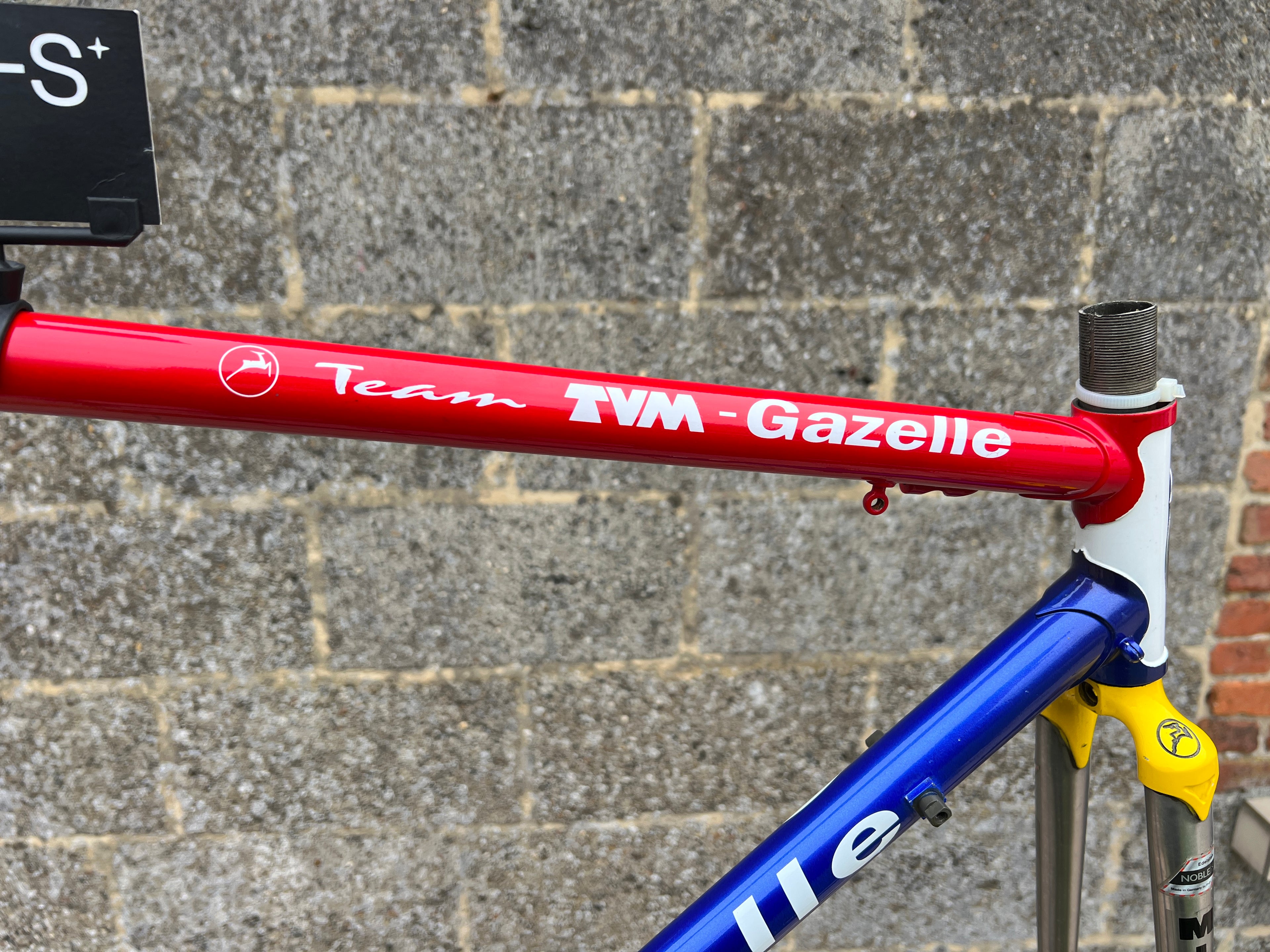 For sale is an exceptionally rare 1995 Gazelle Ex Team TVM frameset. An authentic pro-level frame ridden by Bo Hamburger during the iconic 1995 season. This is not a reproduction or shop version but a genuine team frameset. The main triangle is constructed from Reynolds 731 OS Race tubing. One of the most advanced and highly regarded steel racing tubesets of its era. Complementing it is a Noblex Edelstahl stainless steel fork and rear triangle, crafted in Germany. This combination delivers precise handling, durability and a striking aesthetic that sets it apart from typical steel frames. The frameset still carries the unmistakable 1995 Team TVM livery. Its condition is excellent for its age. No cracks. Ideal for anyone looking to build a premium period correct race bike or to add a true collector’s item to a vintage cycling collection.