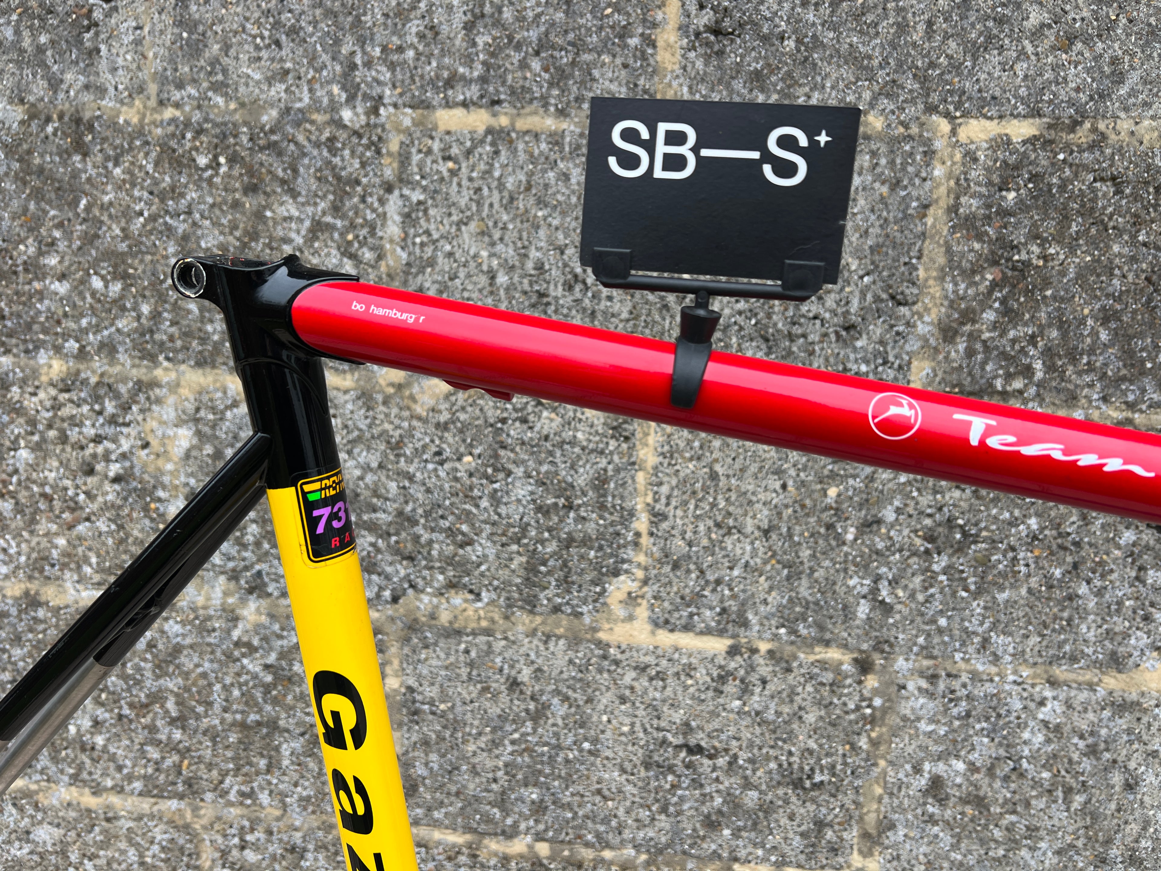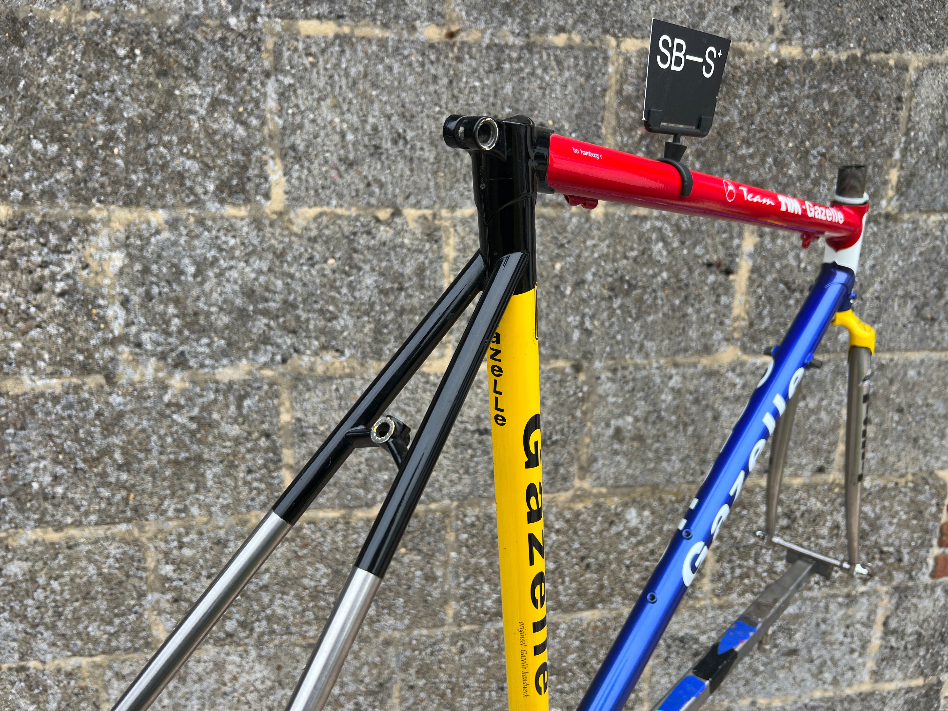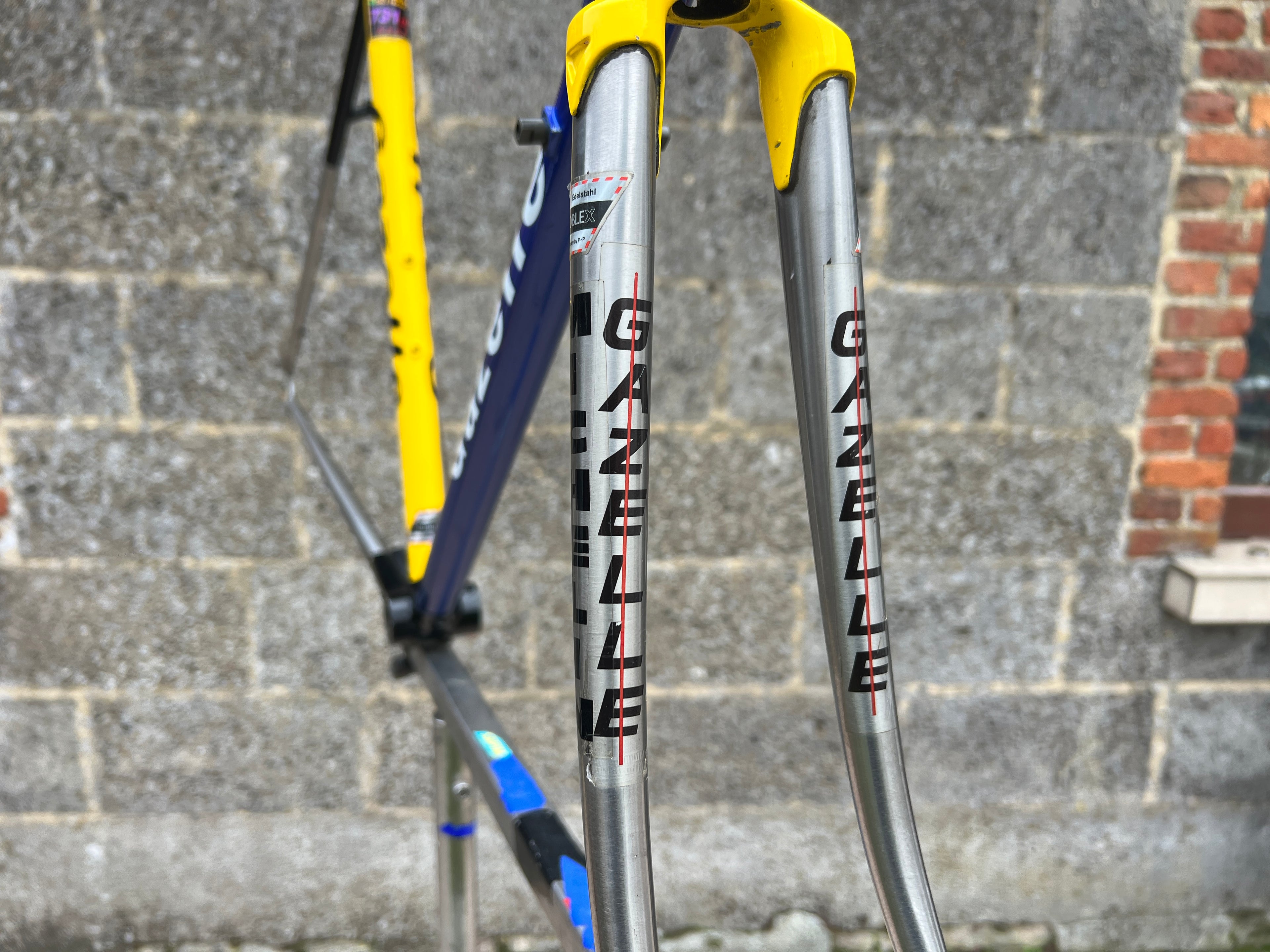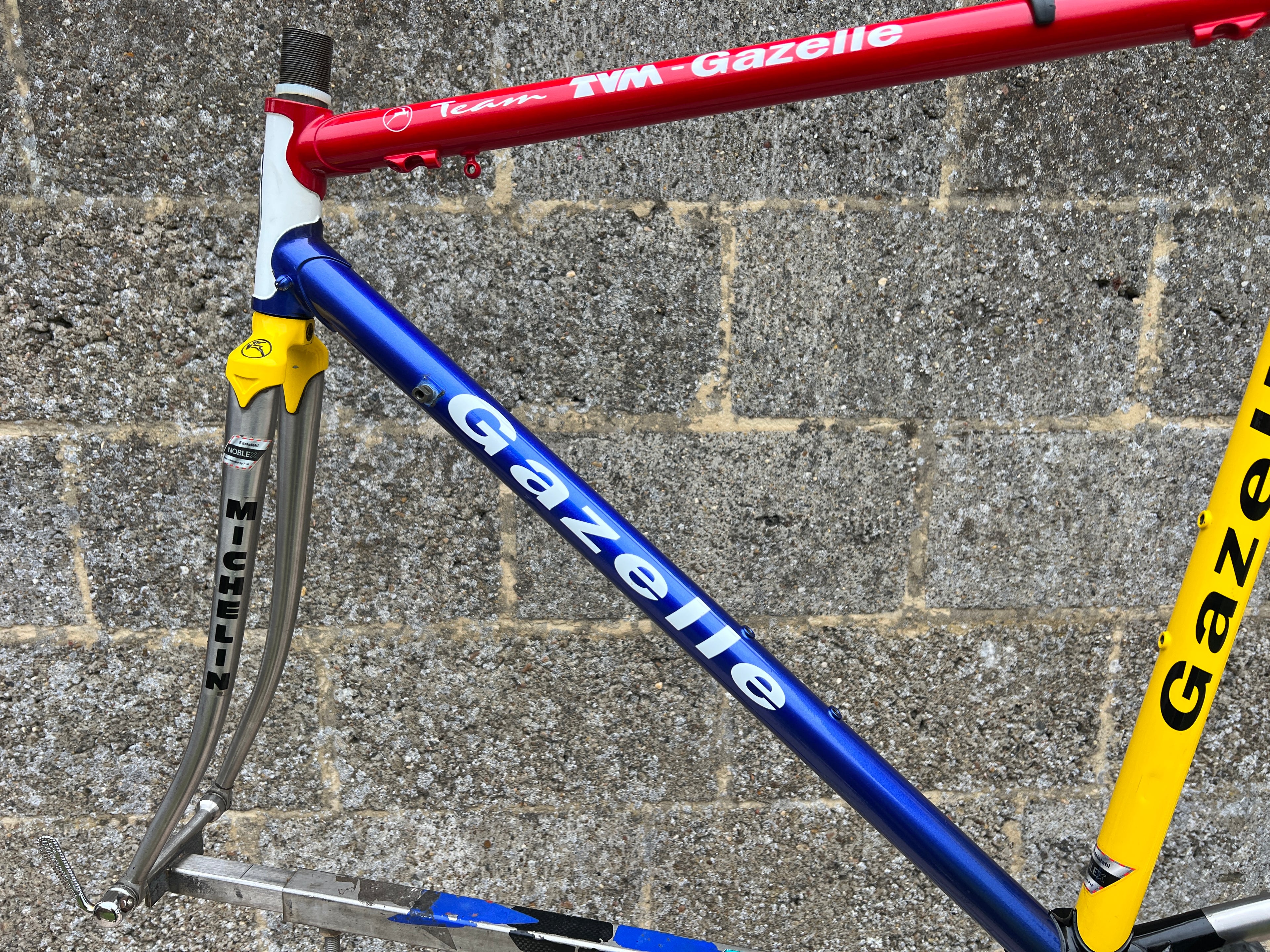 For sale is an exceptionally rare 1995 Gazelle Ex Team TVM frameset. An authentic pro-level frame ridden by Bo Hamburger during the iconic 1995 season. This is not a reproduction or shop version but a genuine team frameset. The main triangle is constructed from Reynolds 731 OS Race tubing. One of the most advanced and highly regarded steel racing tubesets of its era. Complementing it is a Noblex Edelstahl stainless steel fork and rear triangle, crafted in Germany. This combination delivers precise handling, durability and a striking aesthetic that sets it apart from typical steel frames. The frameset still carries the unmistakable 1995 Team TVM livery. Its condition is excellent for its age. No cracks. Ideal for anyone looking to build a premium period correct race bike or to add a true collector’s item to a vintage cycling collection.