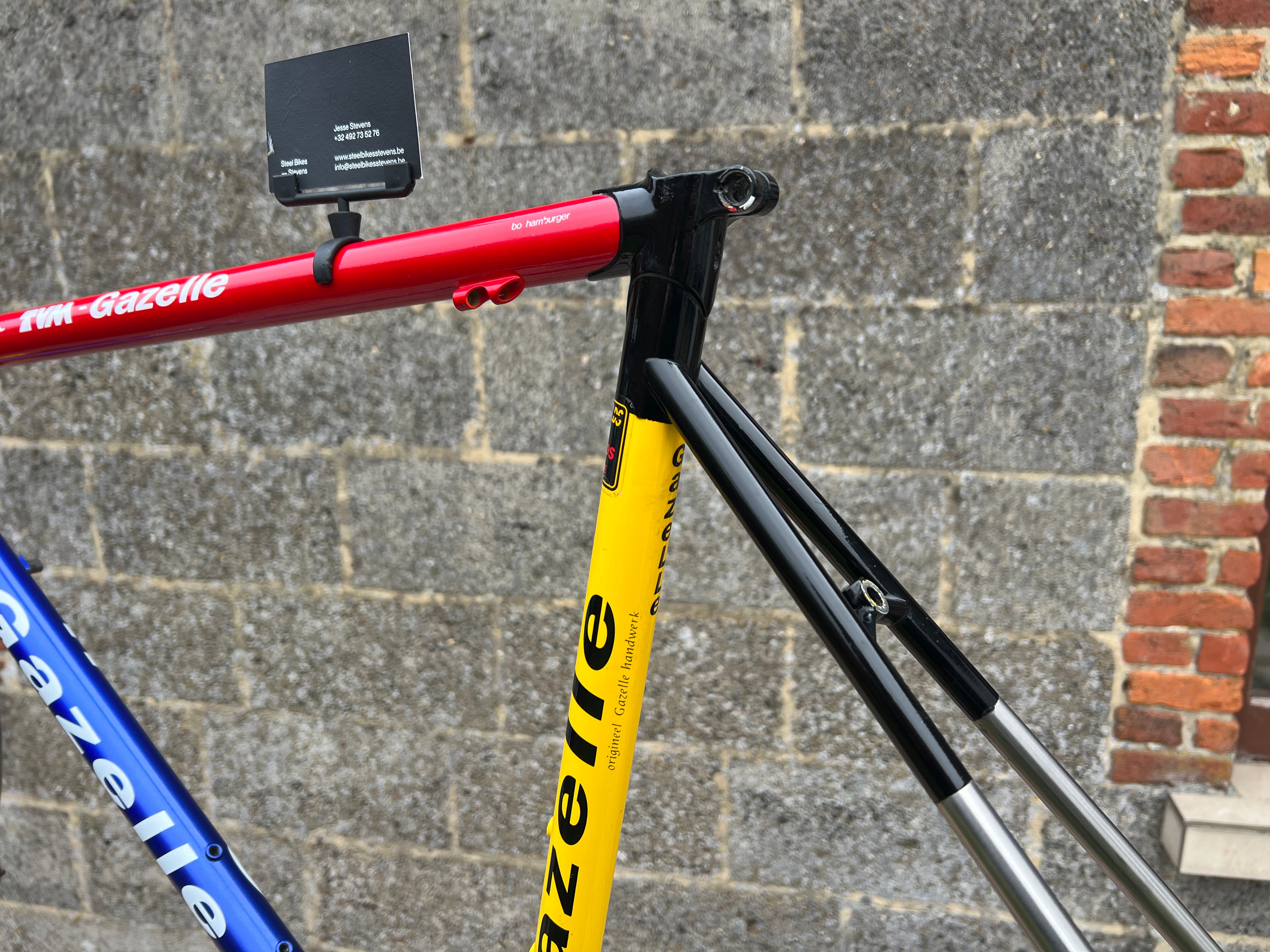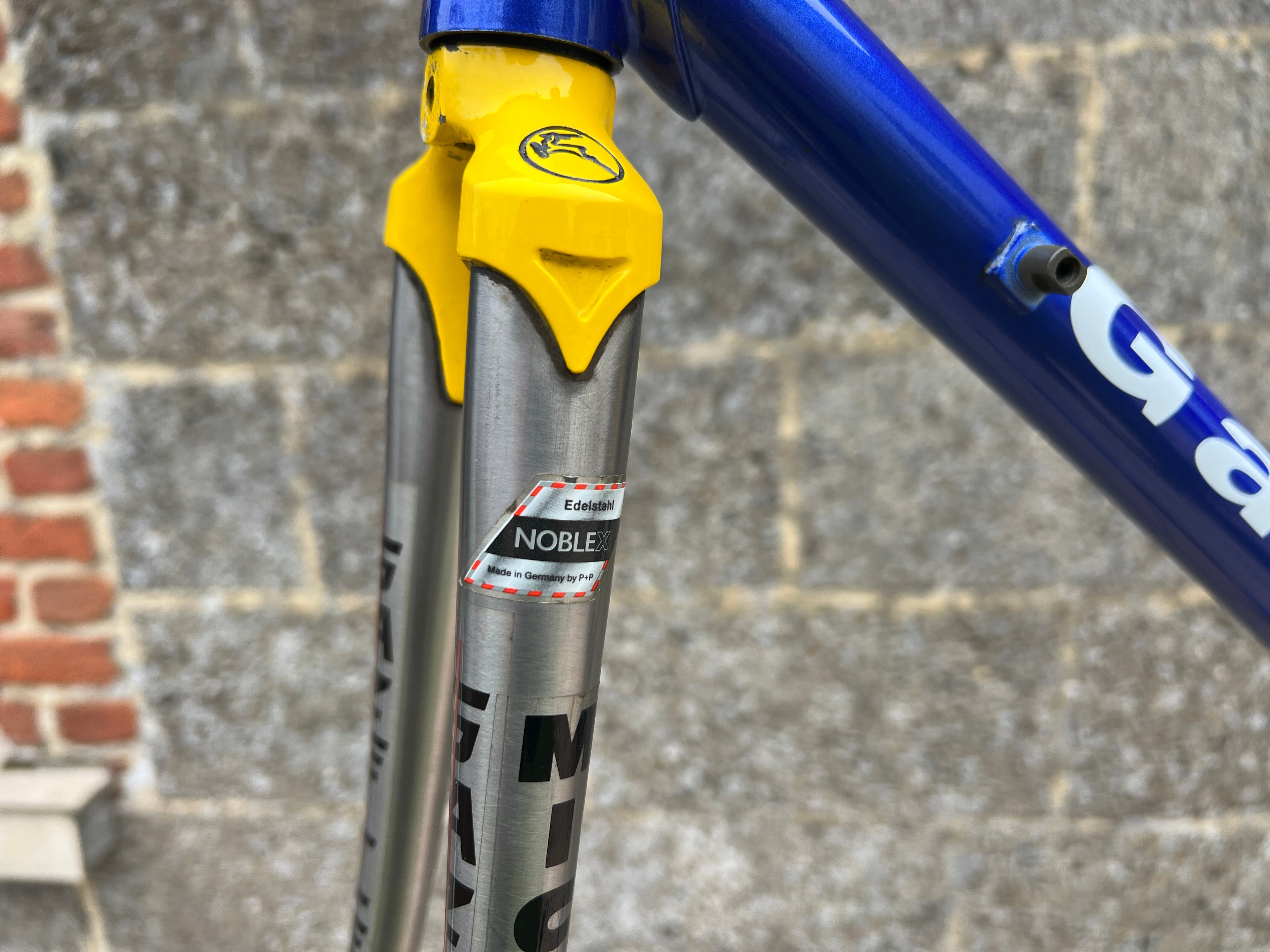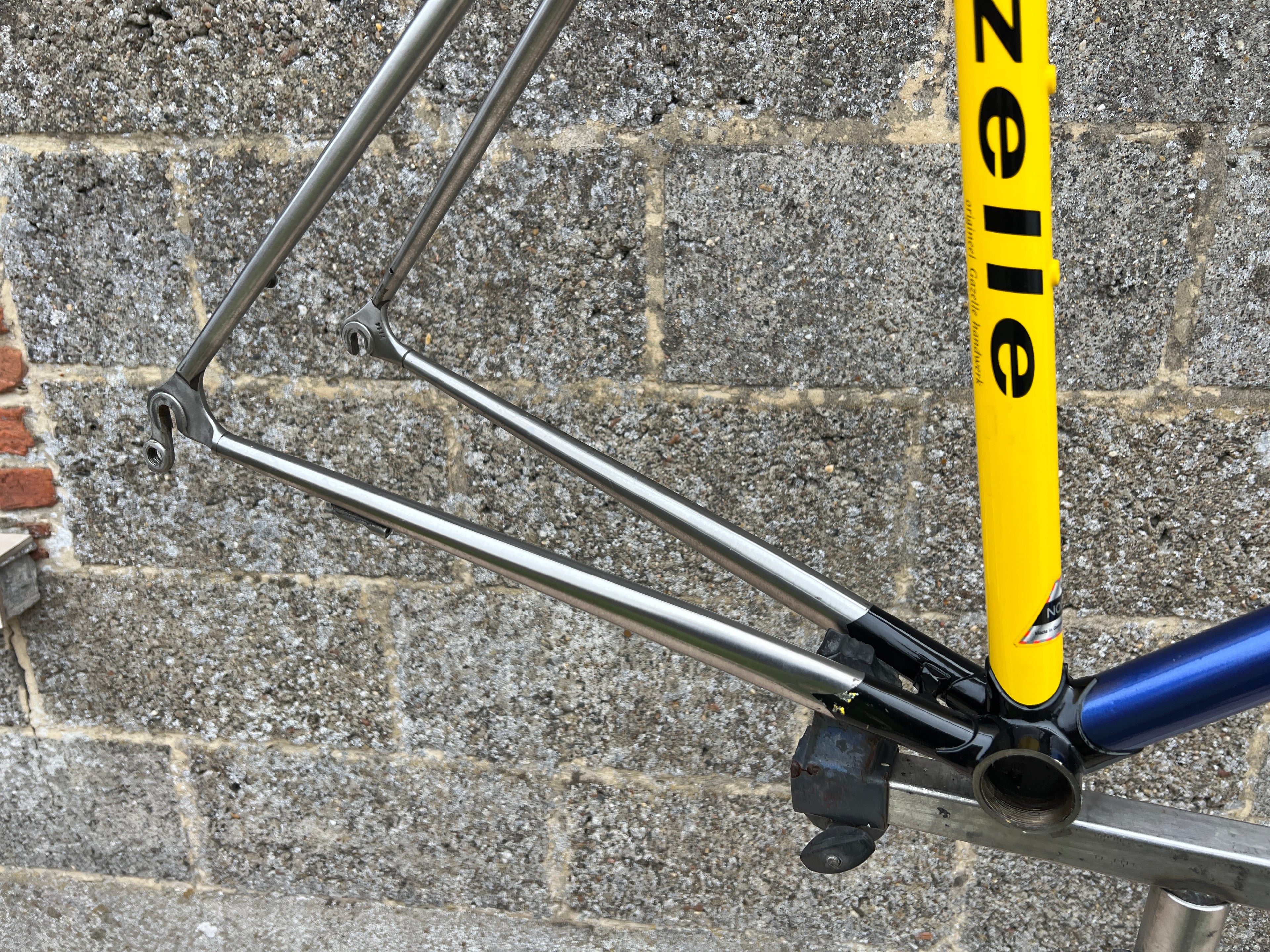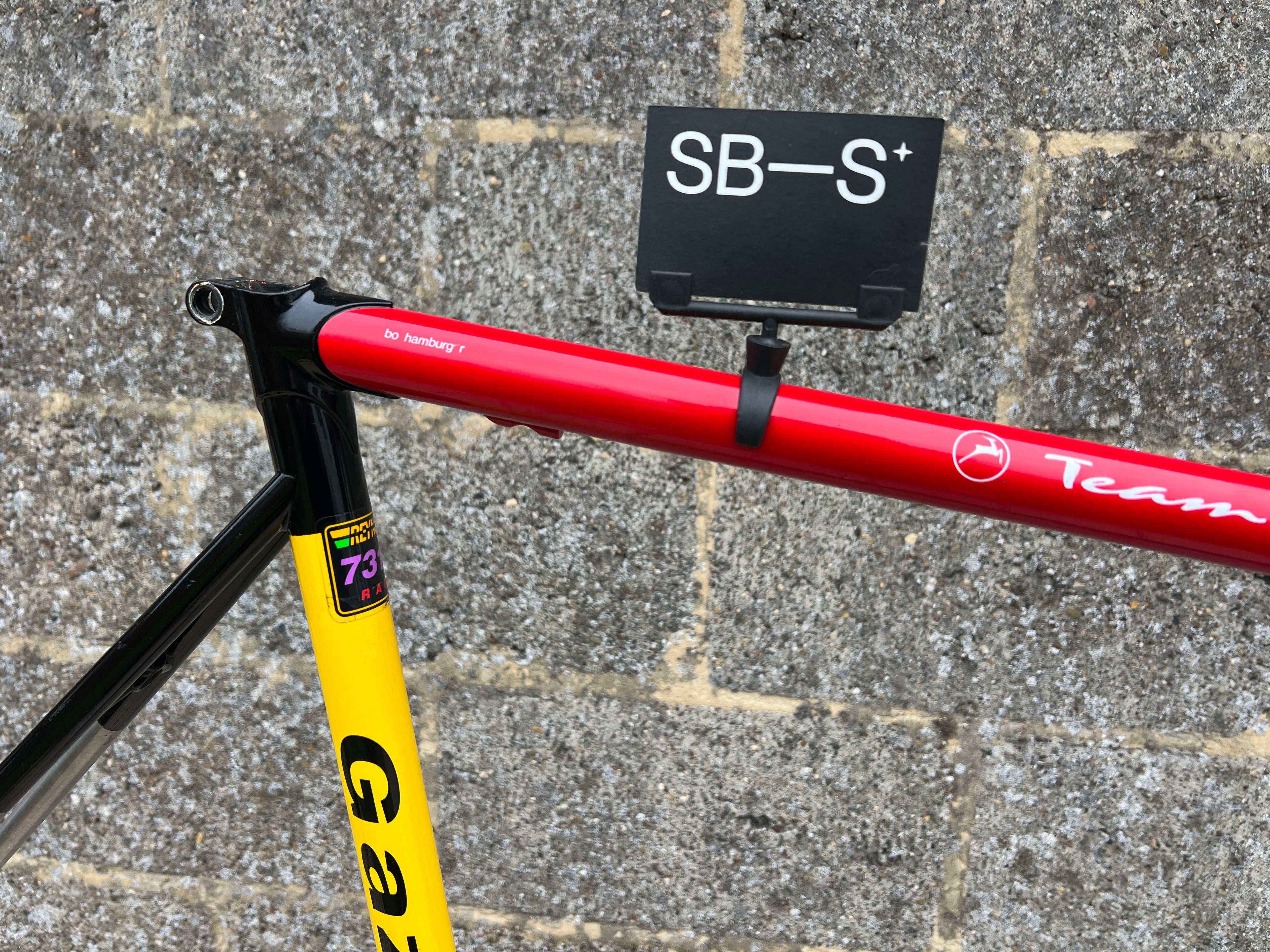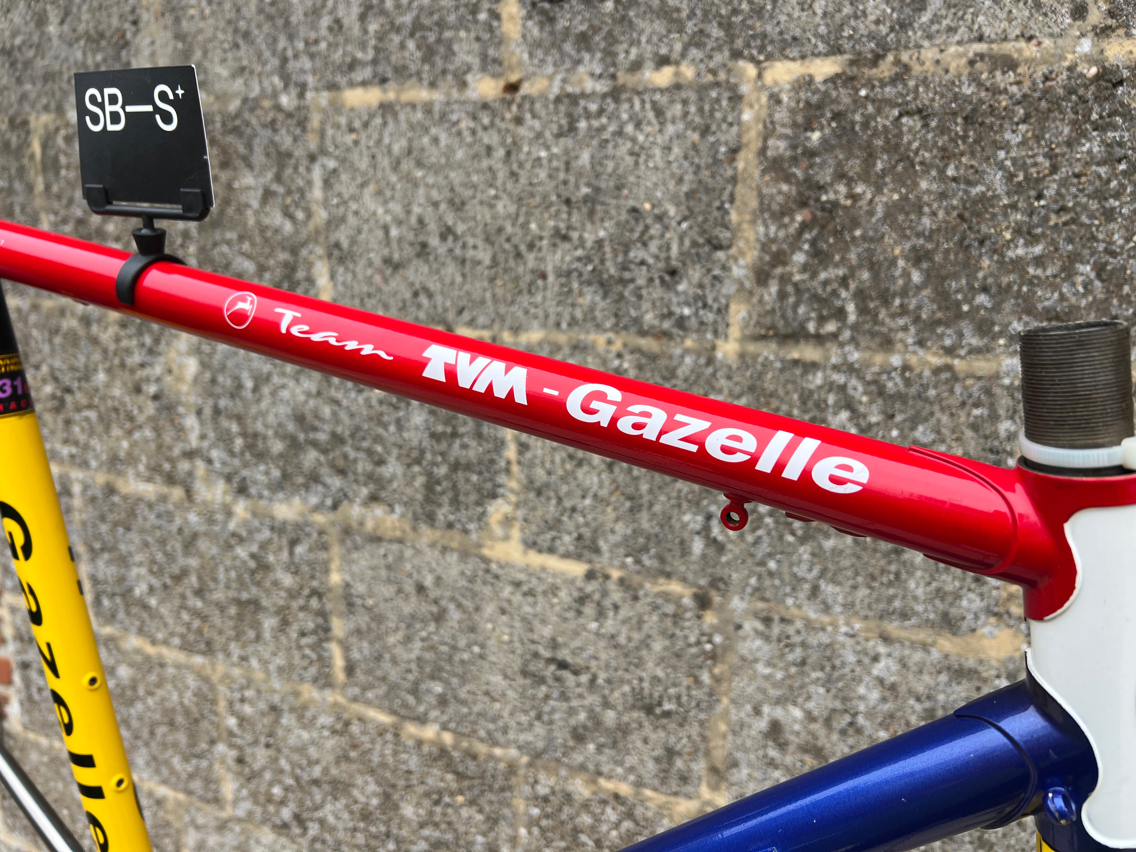 For sale is an exceptionally rare 1995 Gazelle Ex Team TVM frameset. An authentic pro-level frame ridden by Bo Hamburger during the iconic 1995 season. This is not a reproduction or shop version but a genuine team frameset. The main triangle is constructed from Reynolds 731 OS Race tubing. One of the most advanced and highly regarded steel racing tubesets of its era. Complementing it is a Noblex Edelstahl stainless steel fork and rear triangle, crafted in Germany. This combination delivers precise handling, durability and a striking aesthetic that sets it apart from typical steel frames. The frameset still carries the unmistakable 1995 Team TVM livery. Its condition is excellent for its age. No cracks. Ideal for anyone looking to build a premium period correct race bike or to add a true collector’s item to a vintage cycling collection.