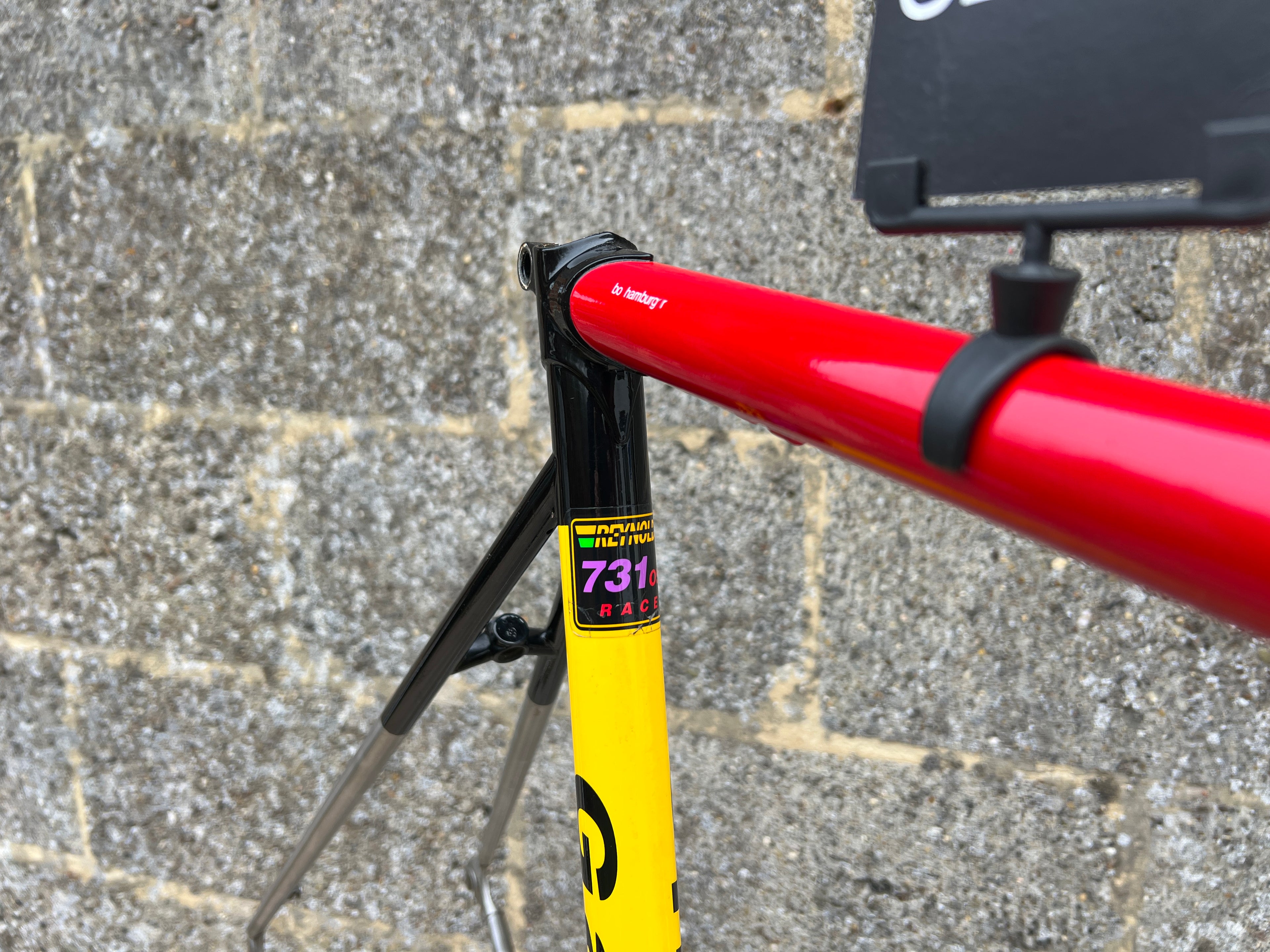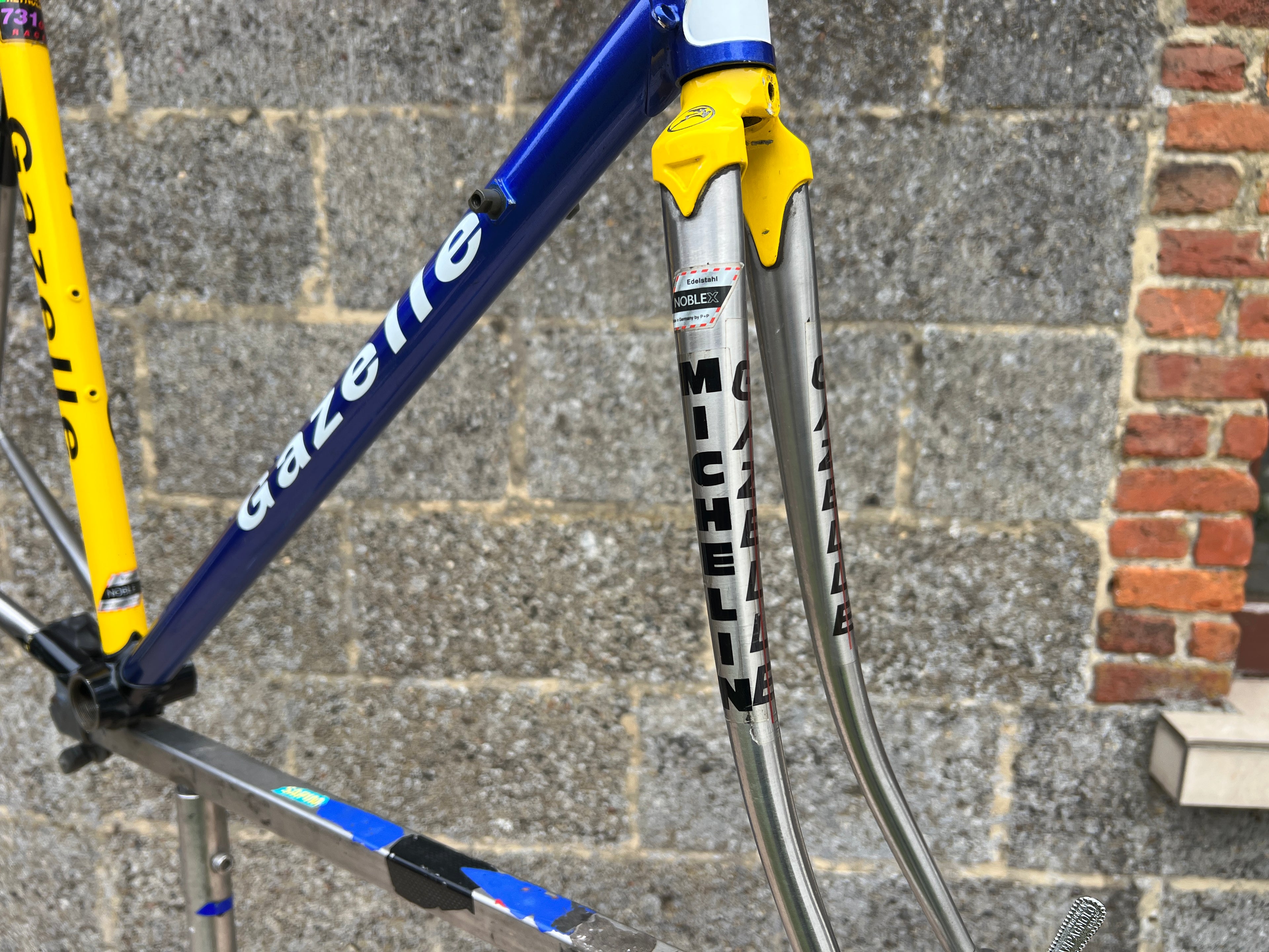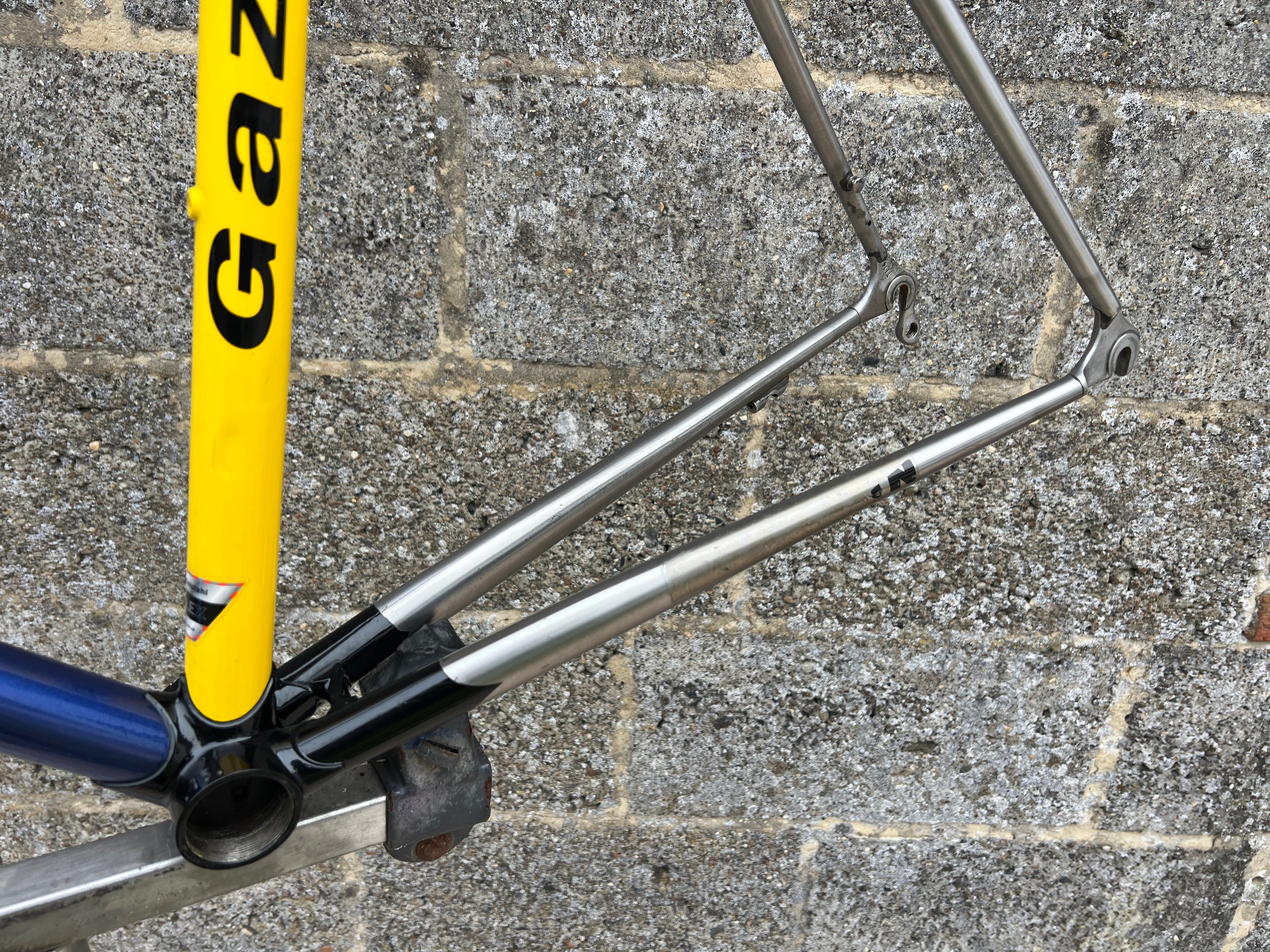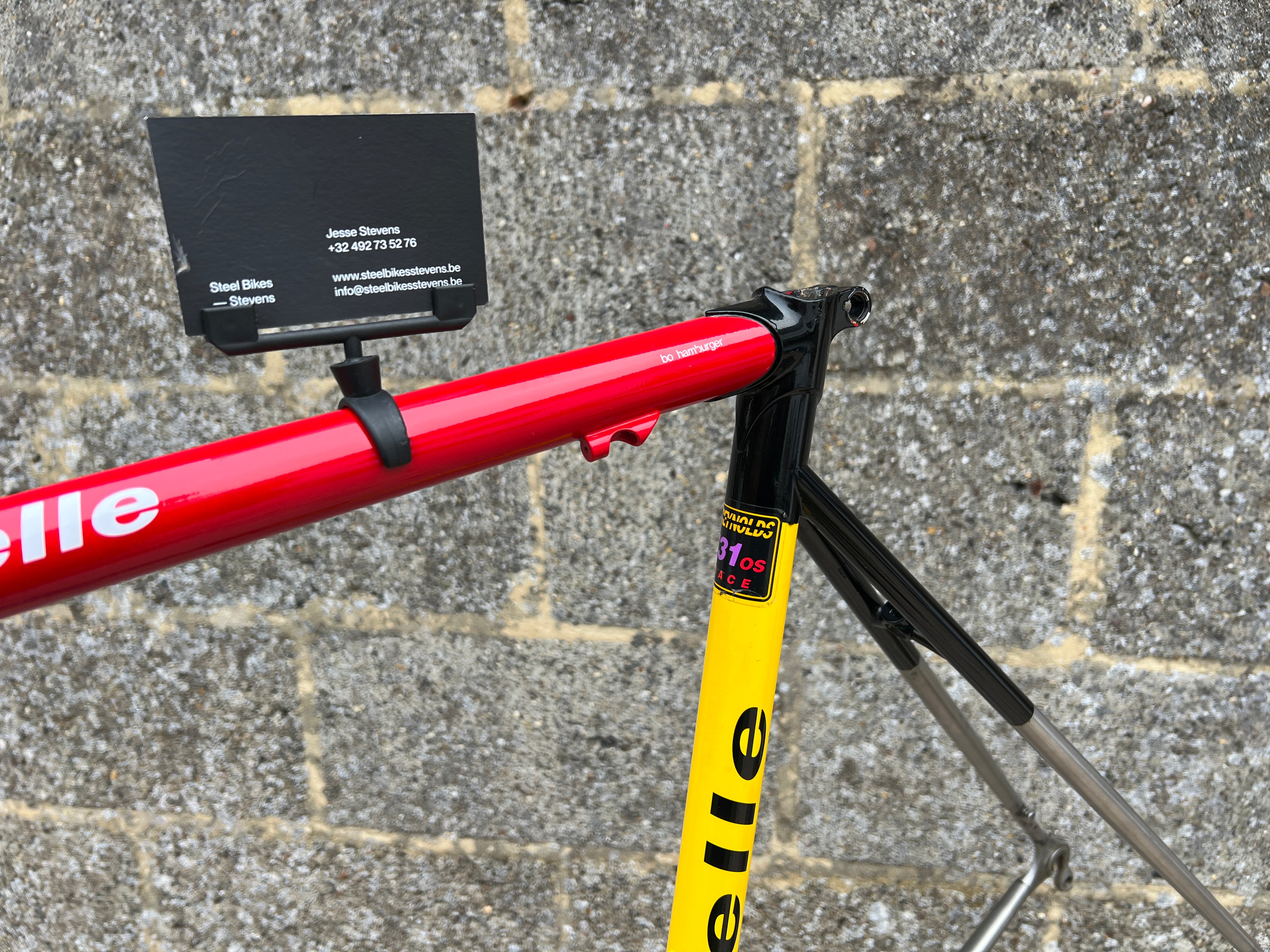 For sale is an exceptionally rare 1995 Gazelle Ex Team TVM frameset. An authentic pro-level frame ridden by Bo Hamburger during the iconic 1995 season. This is not a reproduction or shop version but a genuine team frameset. The main triangle is constructed from Reynolds 731 OS Race tubing. One of the most advanced and highly regarded steel racing tubesets of its era. Complementing it is a Noblex Edelstahl stainless steel fork and rear triangle, crafted in Germany. This combination delivers precise handling, durability and a striking aesthetic that sets it apart from typical steel frames. The frameset still carries the unmistakable 1995 Team TVM livery. Its condition is excellent for its age. No cracks. Ideal for anyone looking to build a premium period correct race bike or to add a true collector’s item to a vintage cycling collection.