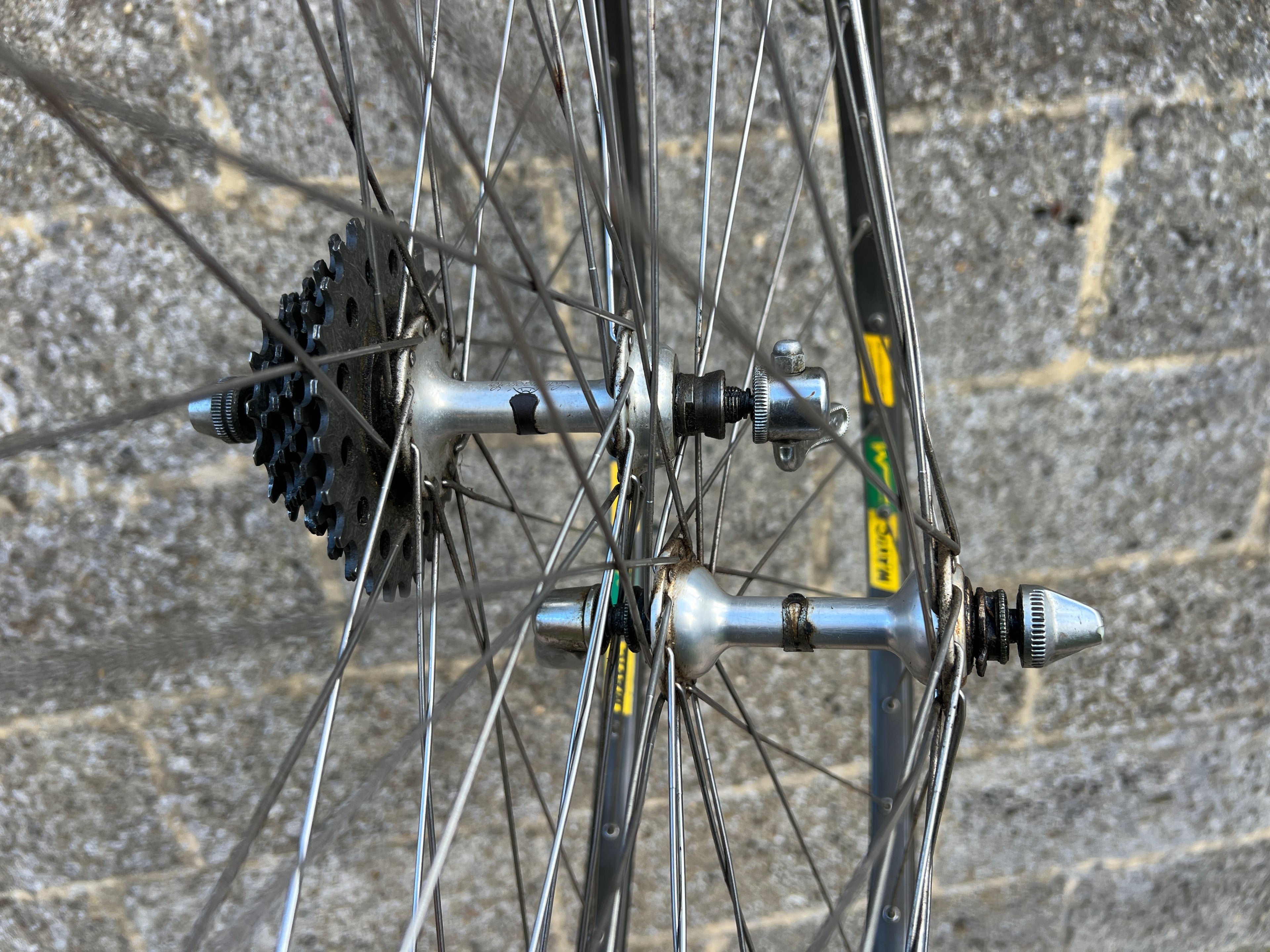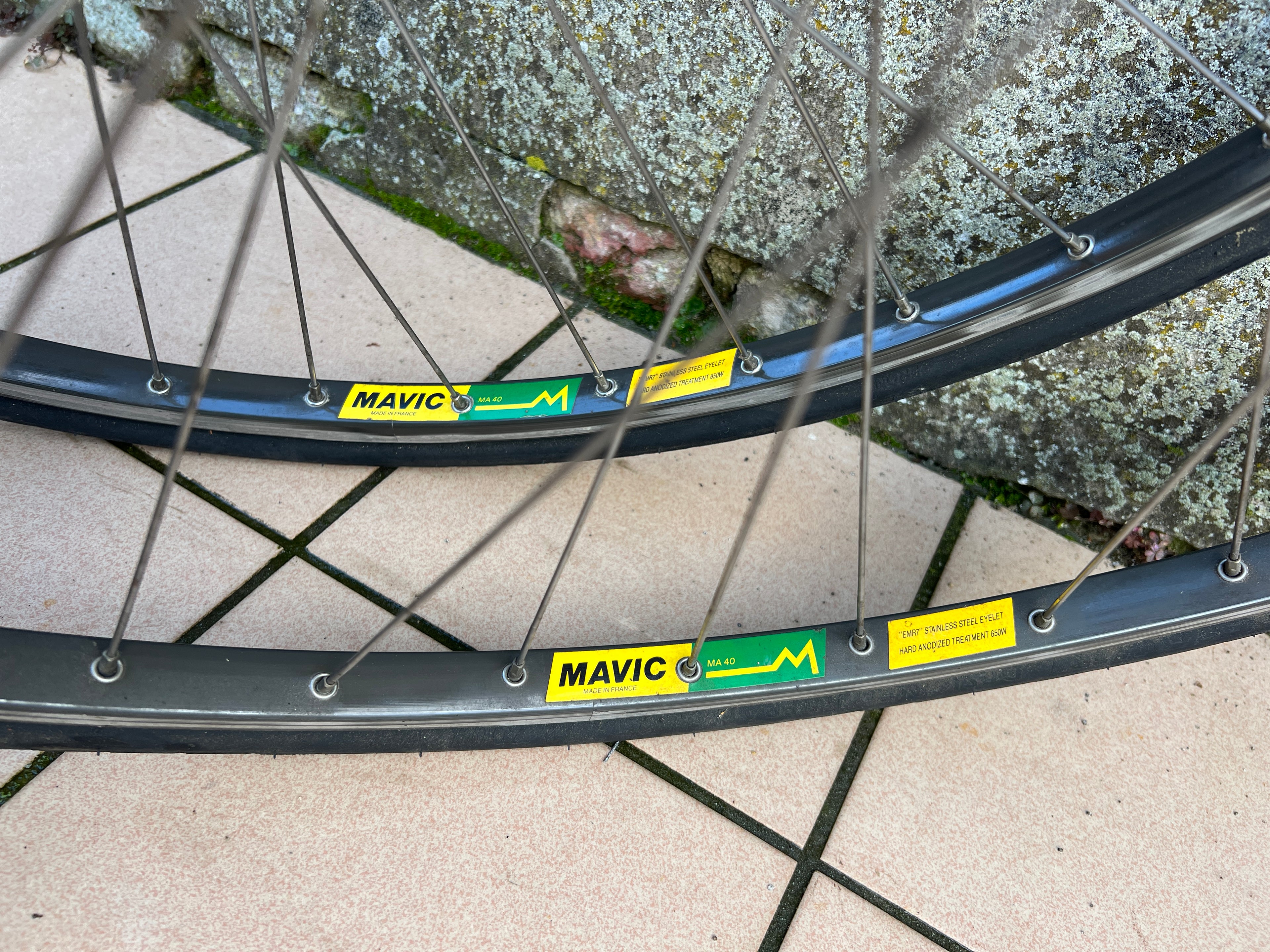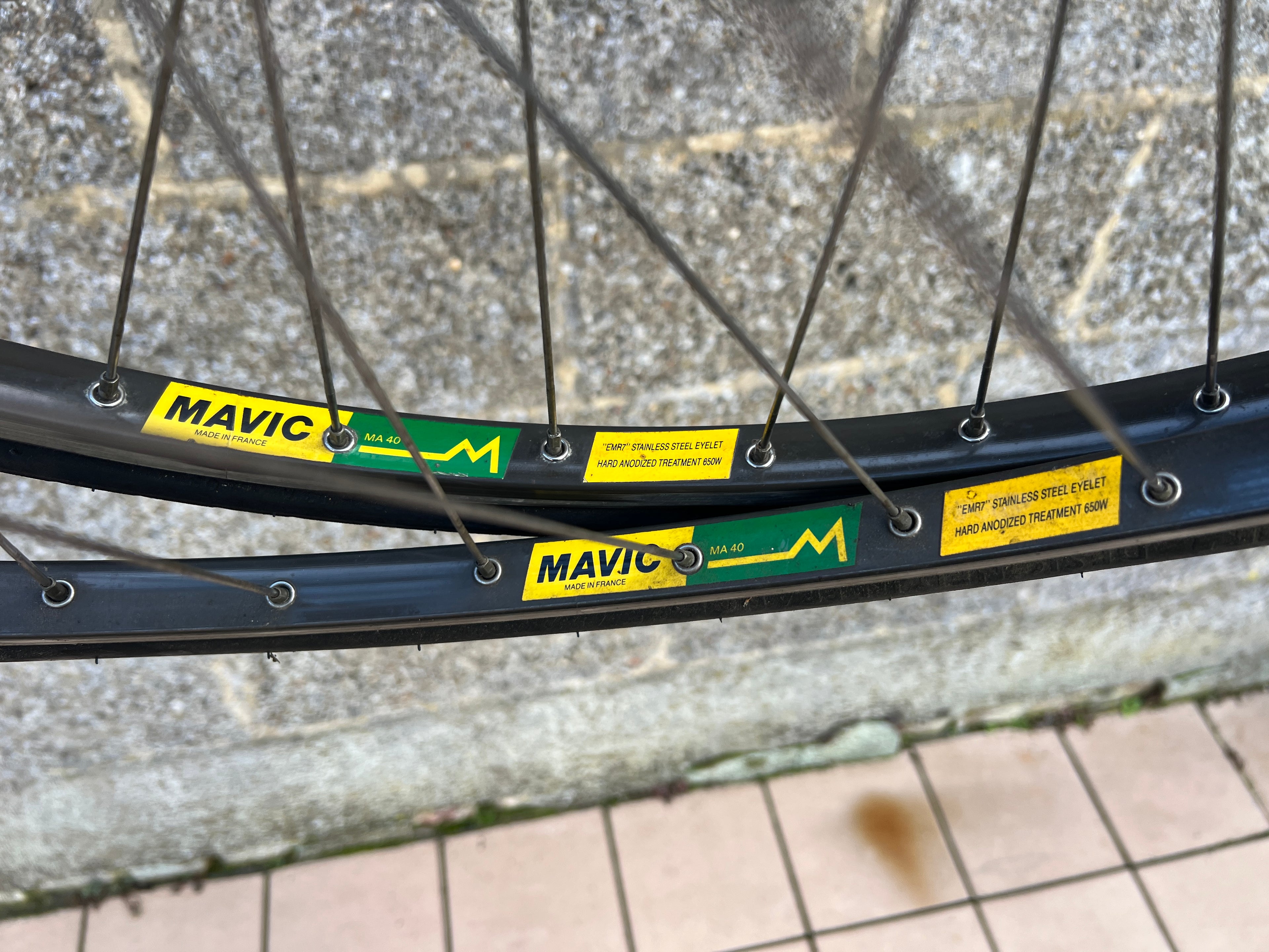 Mavic MA40 Clincher Wheelset. One hub is Dura Ace, the other one is Campagnolo Record. They need a bit of cleaning, but they can be turned into a beautiful wheelset.