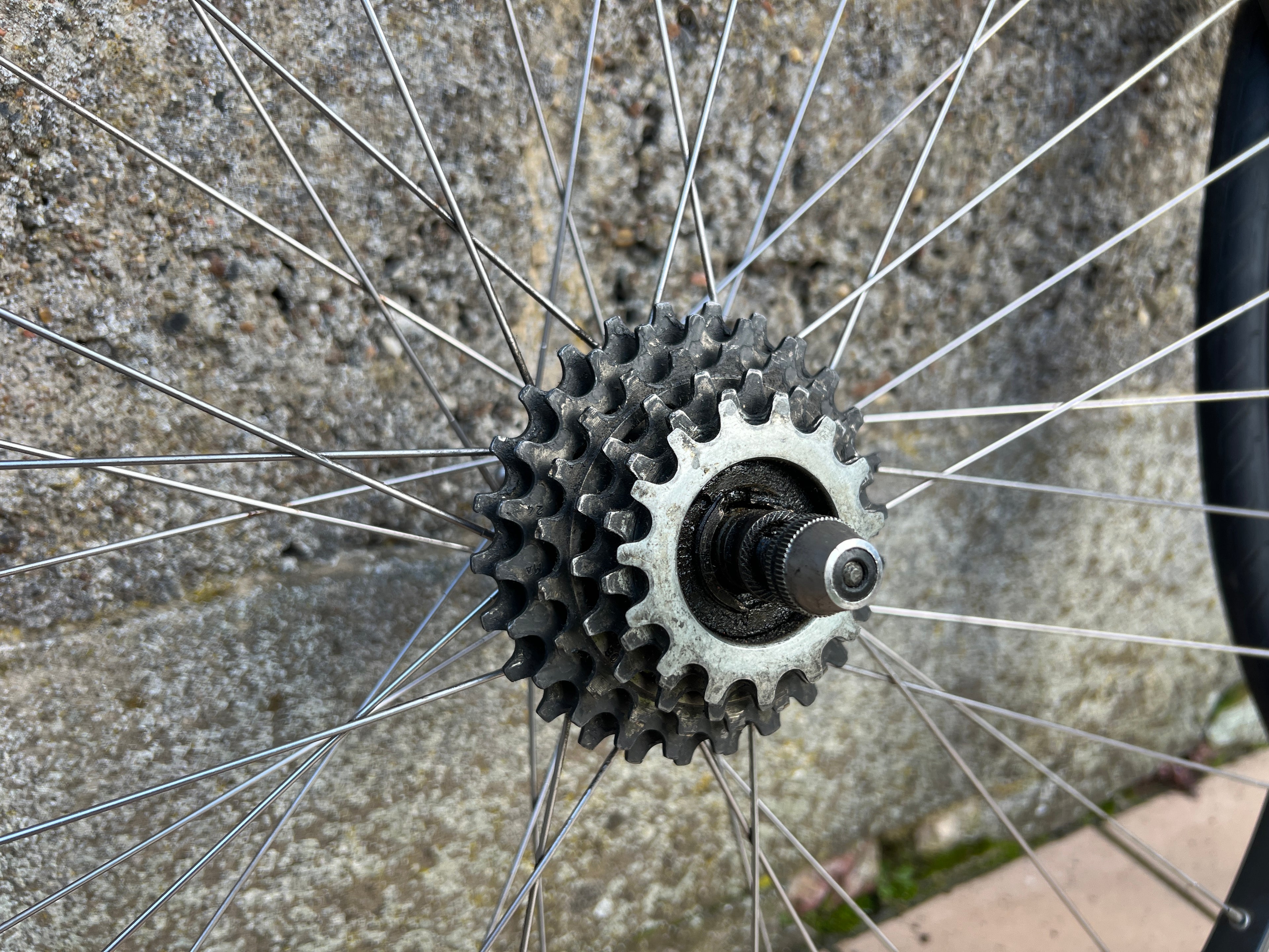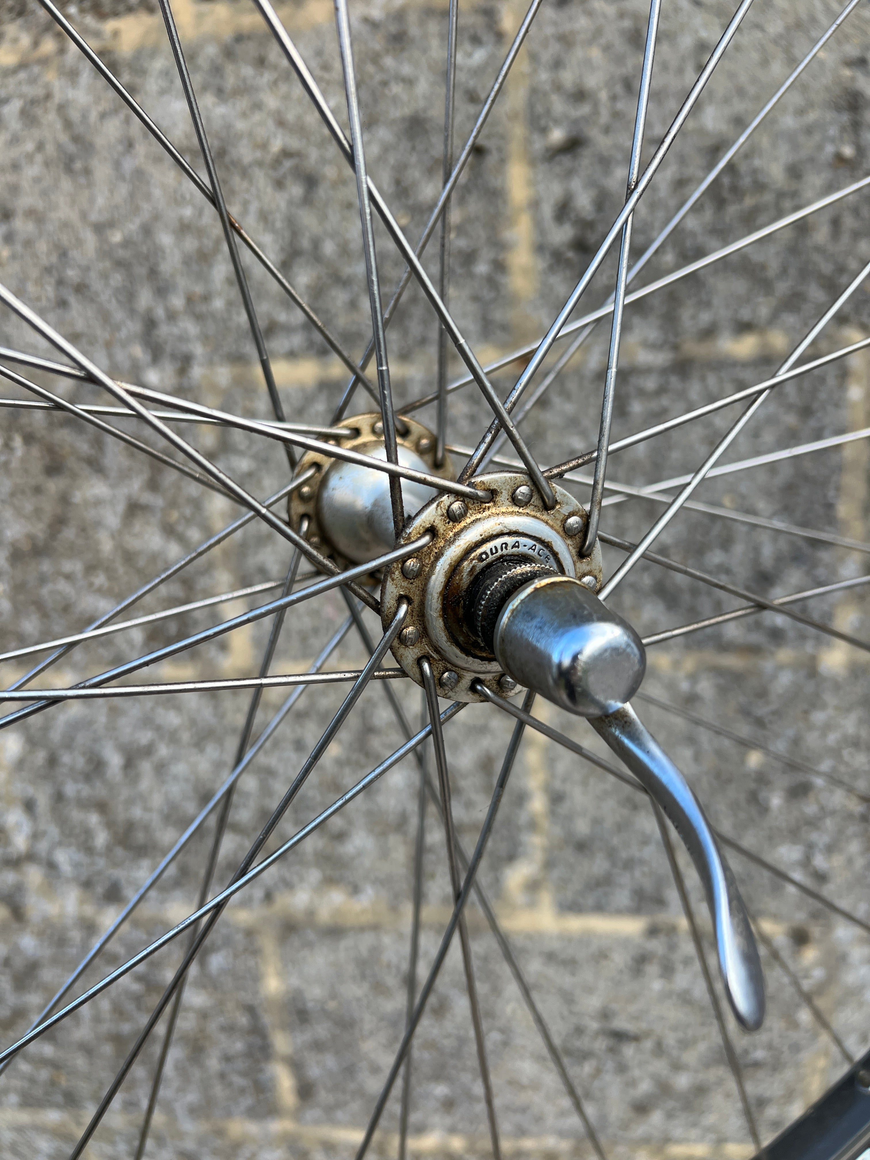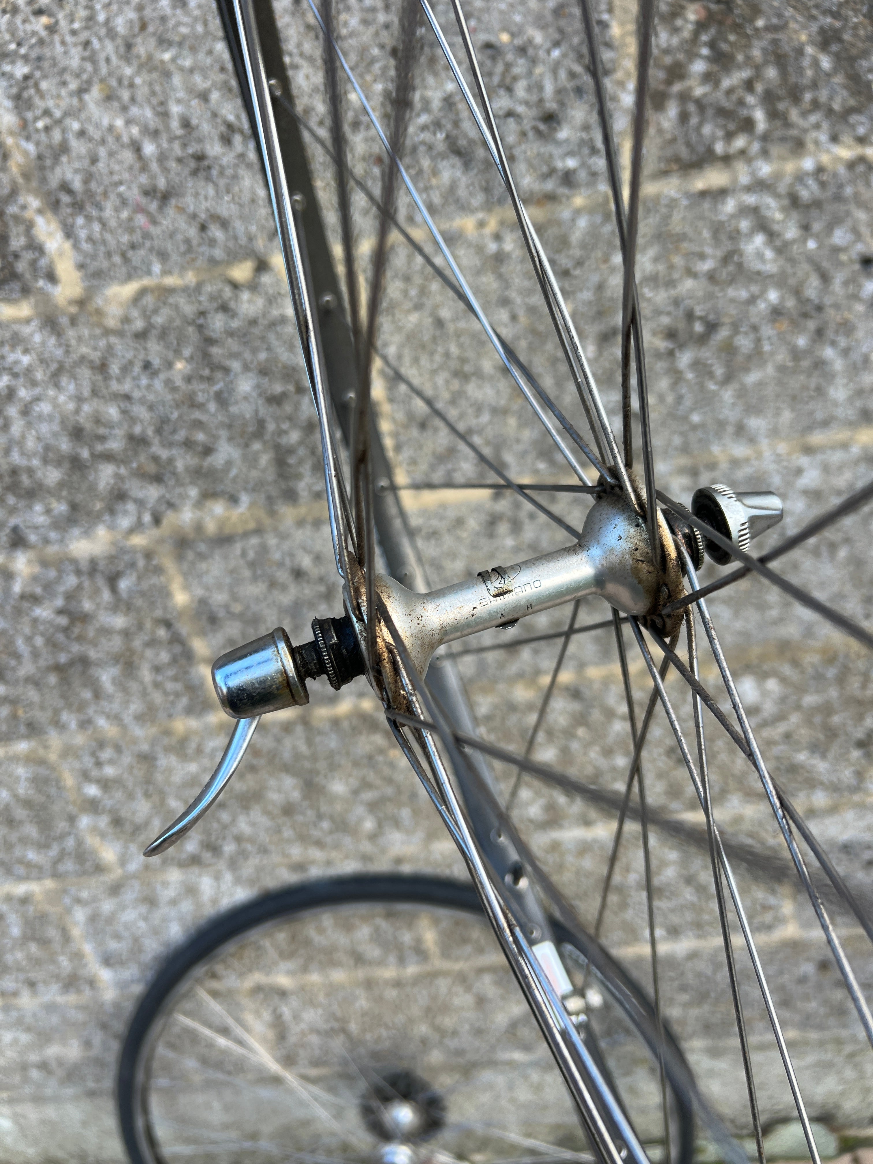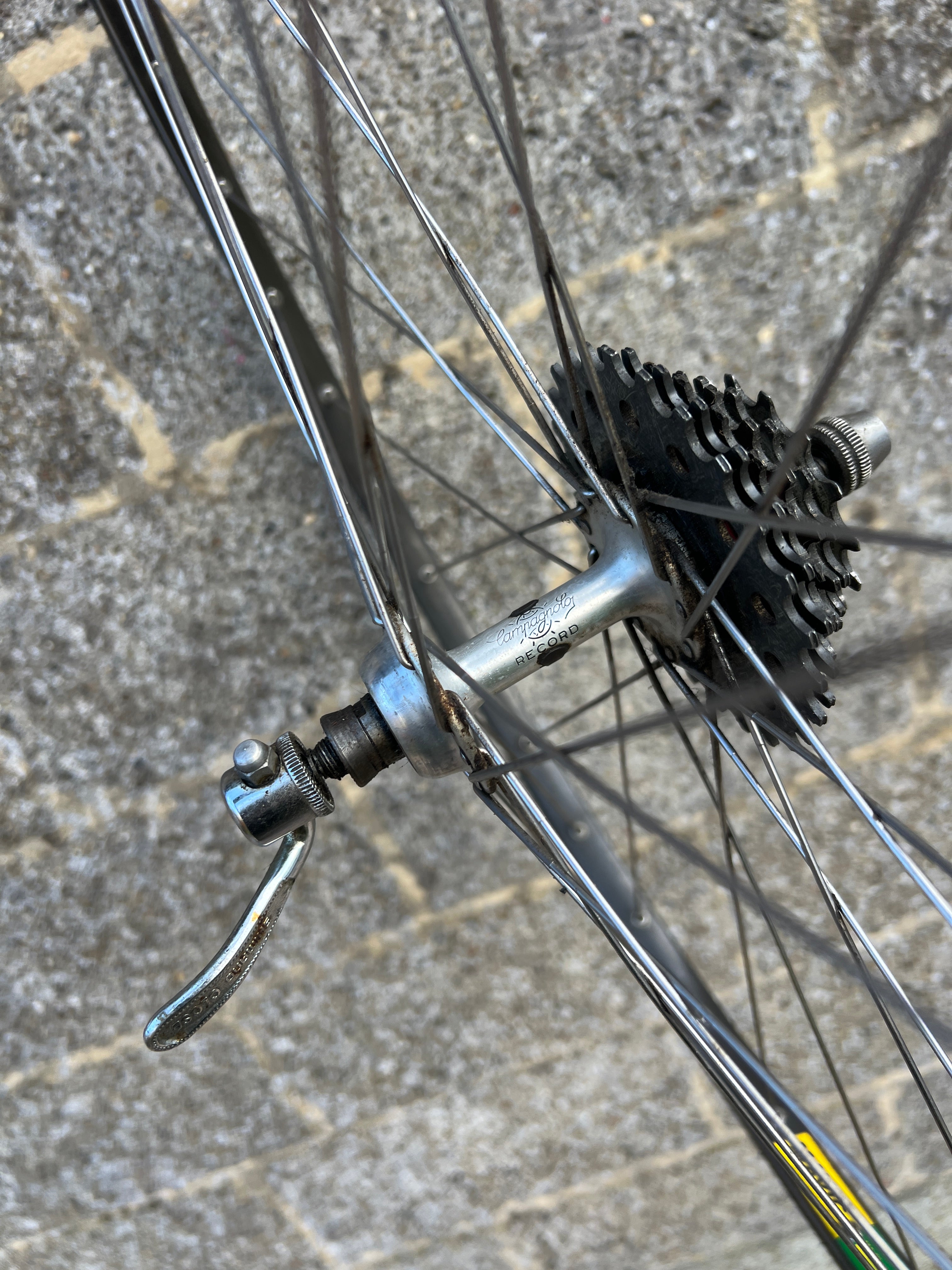 Mavic MA40 Clincher Wheelset. One hub is Dura Ace, the other one is Campagnolo Record. They need a bit of cleaning, but they can be turned into a beautiful wheelset.