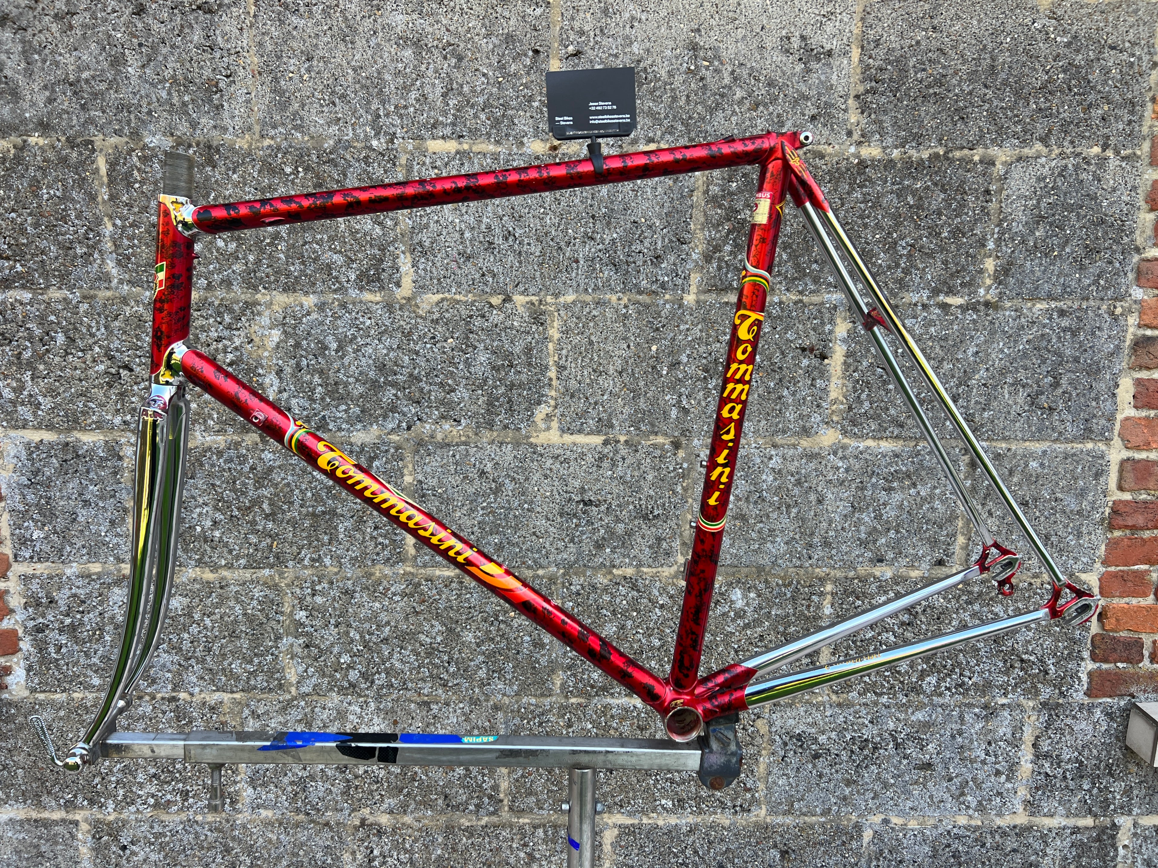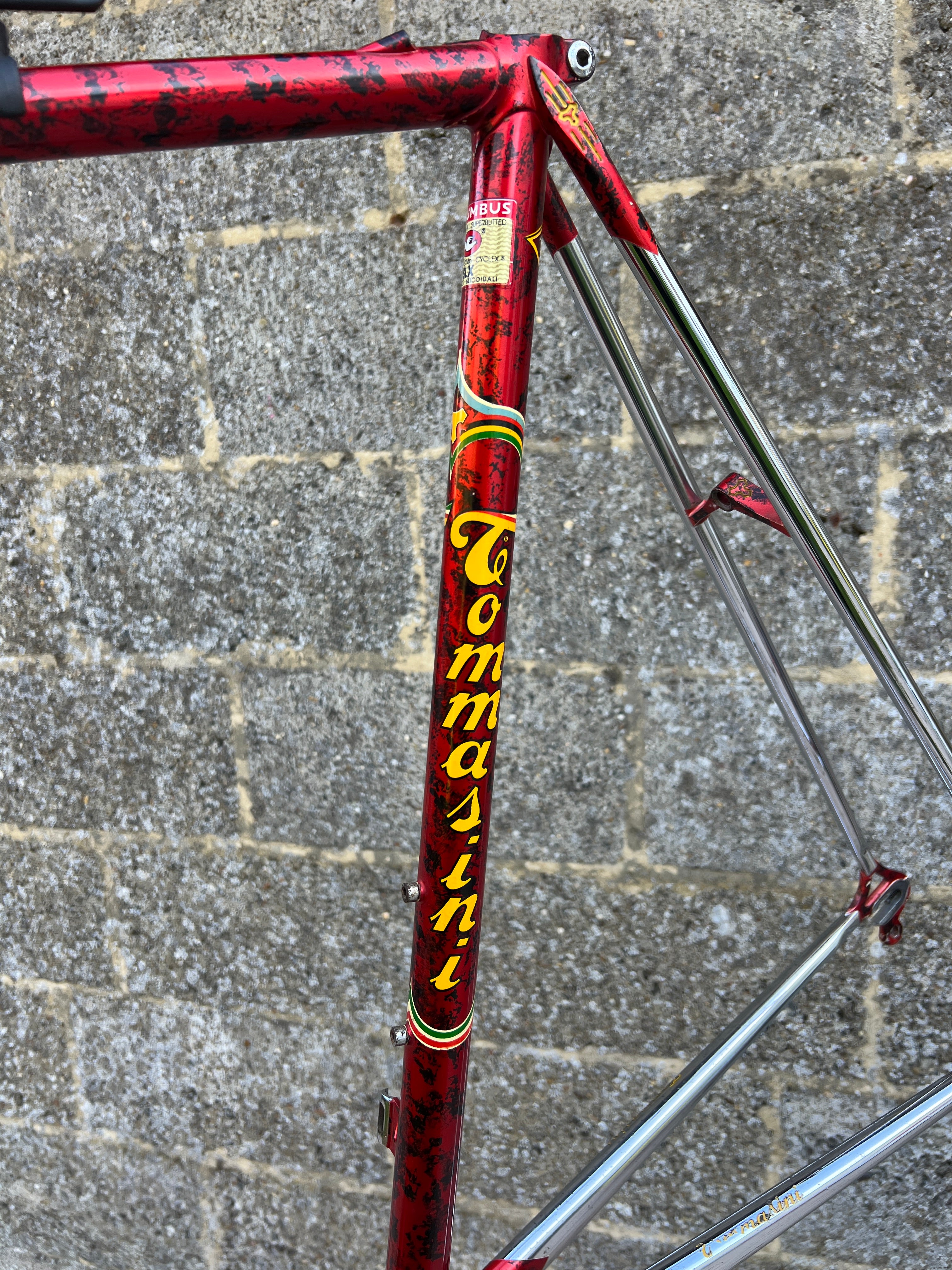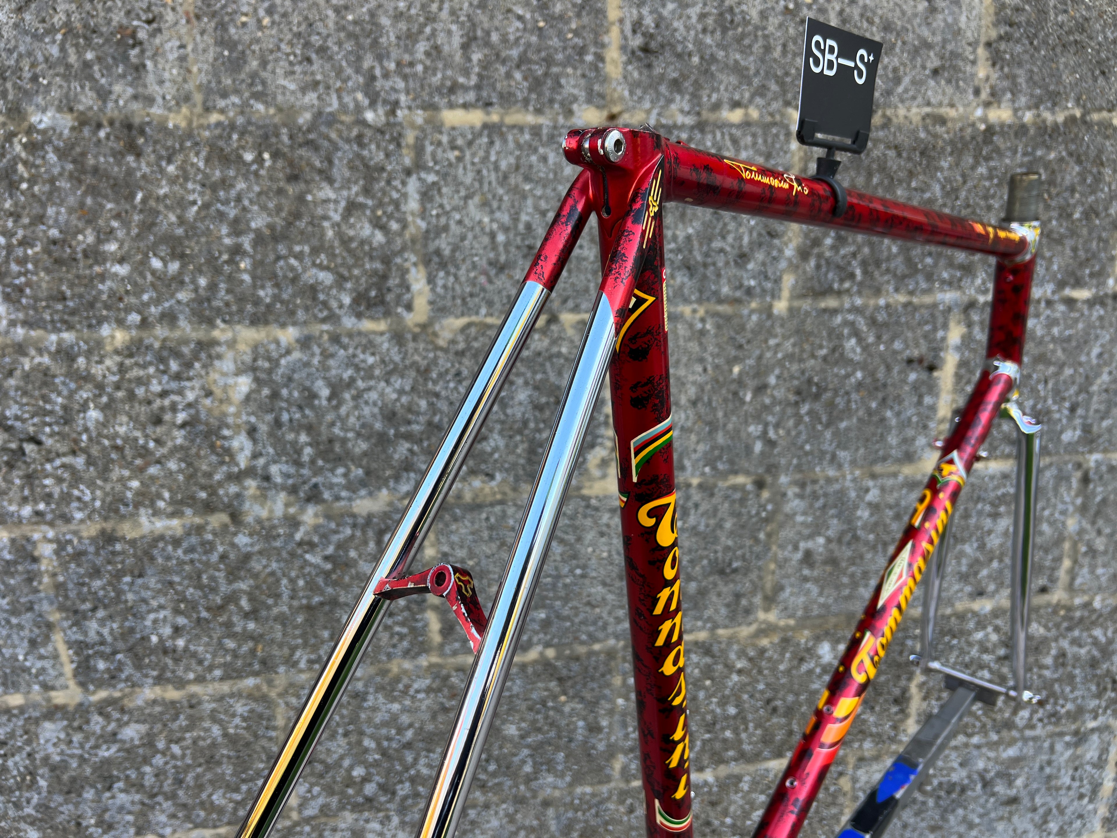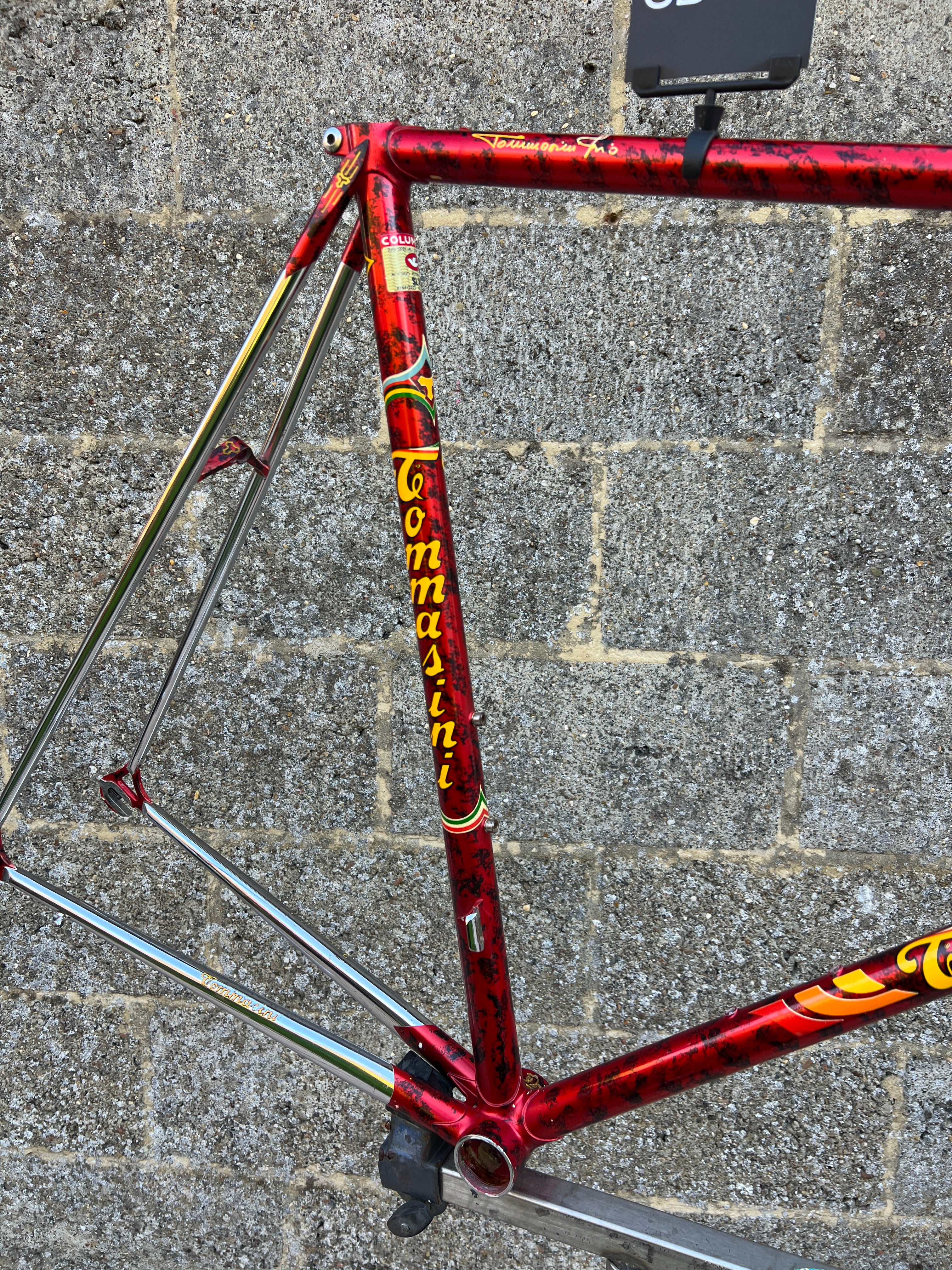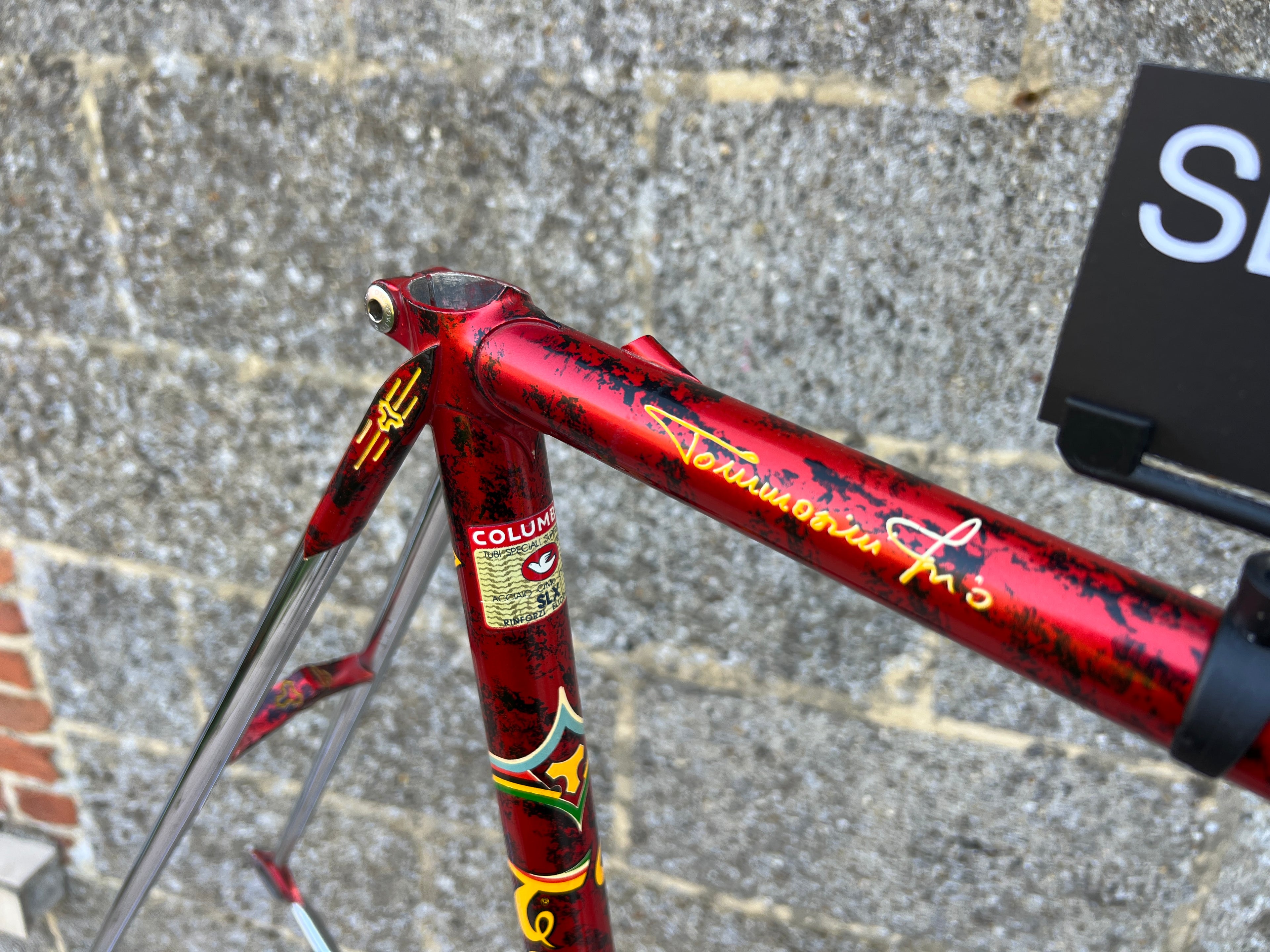 Introduced in the mid 1980s, the Tommasini Super Prestige quickly became the brand’s flagship model and an icon among Italian steel racing frames. Like every Tommasini, it showcases exceptional attention to detail. Beautifully cut and hand-finished lugs, elegant engravings, and precise craftsmanship throughout. This Tommasini Super Prestige SLX is constructed from the legendary Columbus SLX tubing. Renowned for its performance, stiffness, and refined ride quality. The original paint is beautifully preserved, showing only a few small marks acquired over the years. The original chrome also remains in fine condition with minor imperfections that add to its authenticity and timeless charm. Every detail reflects Tommasini’s unwavering dedication to perfection. A true work of Italian art. A timeless piece of cycling history for the discerning collector or rider who appreciates the very finest in Italian framebuilding tradition. The perfect frameset to complete with Record, Super Record, C-Record, Chorus, or Athena groupsets.
