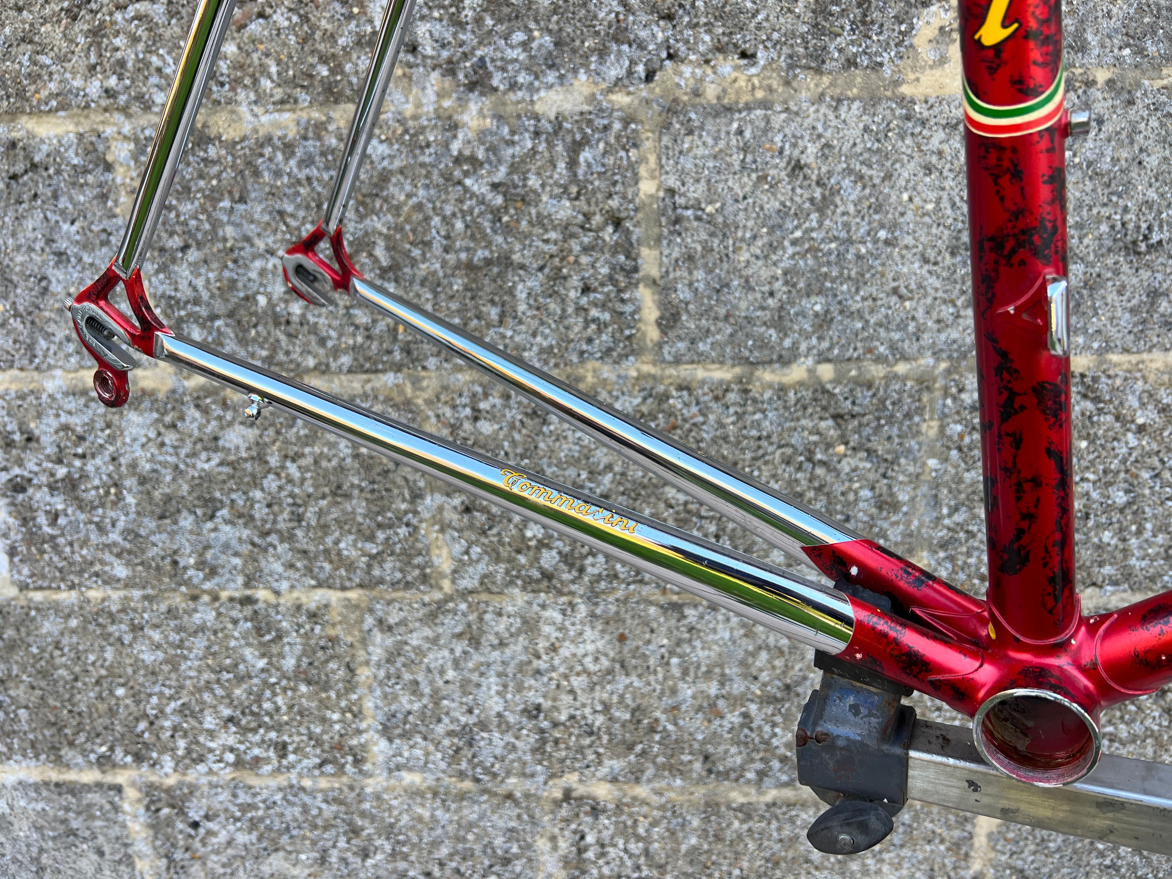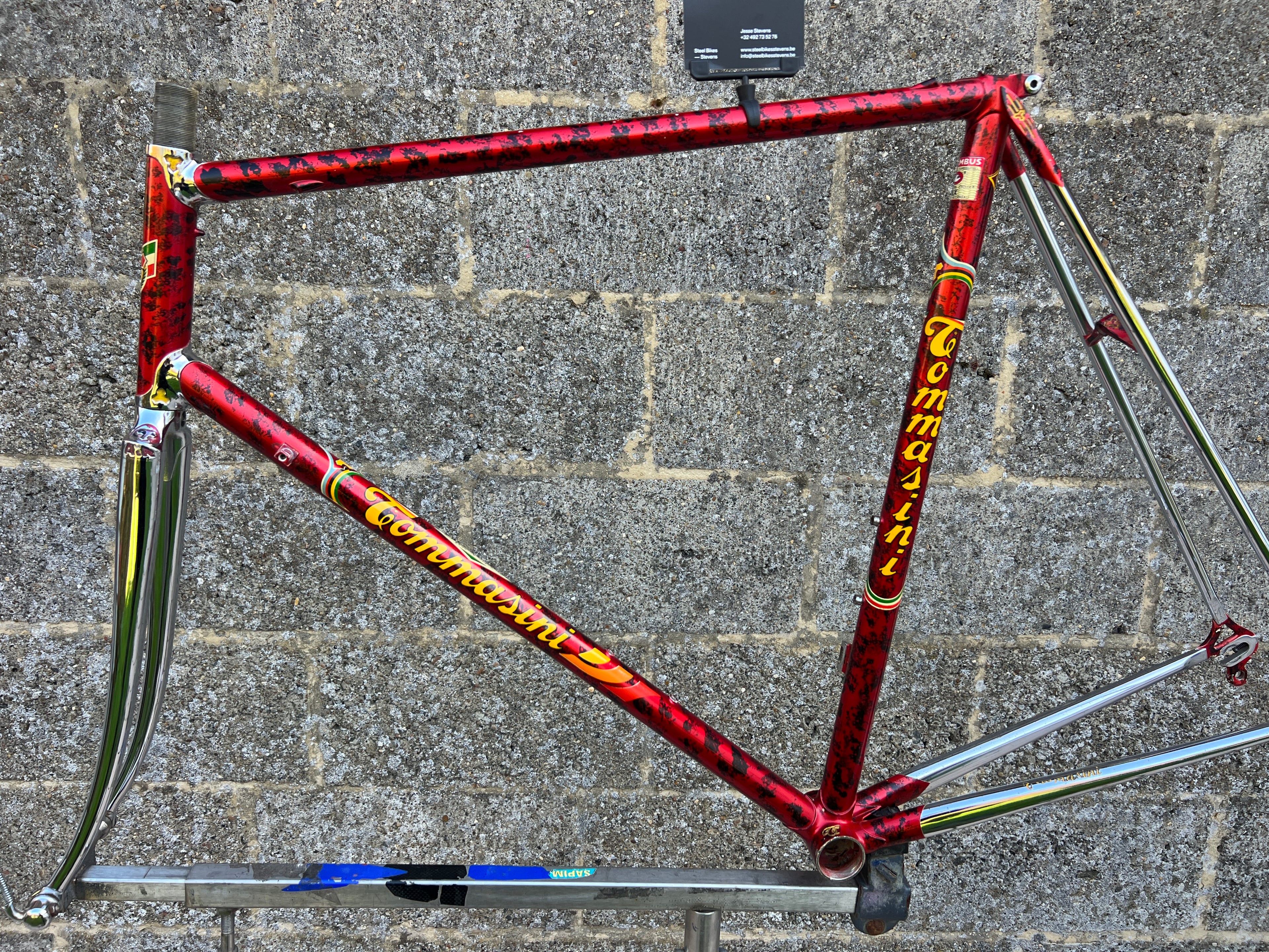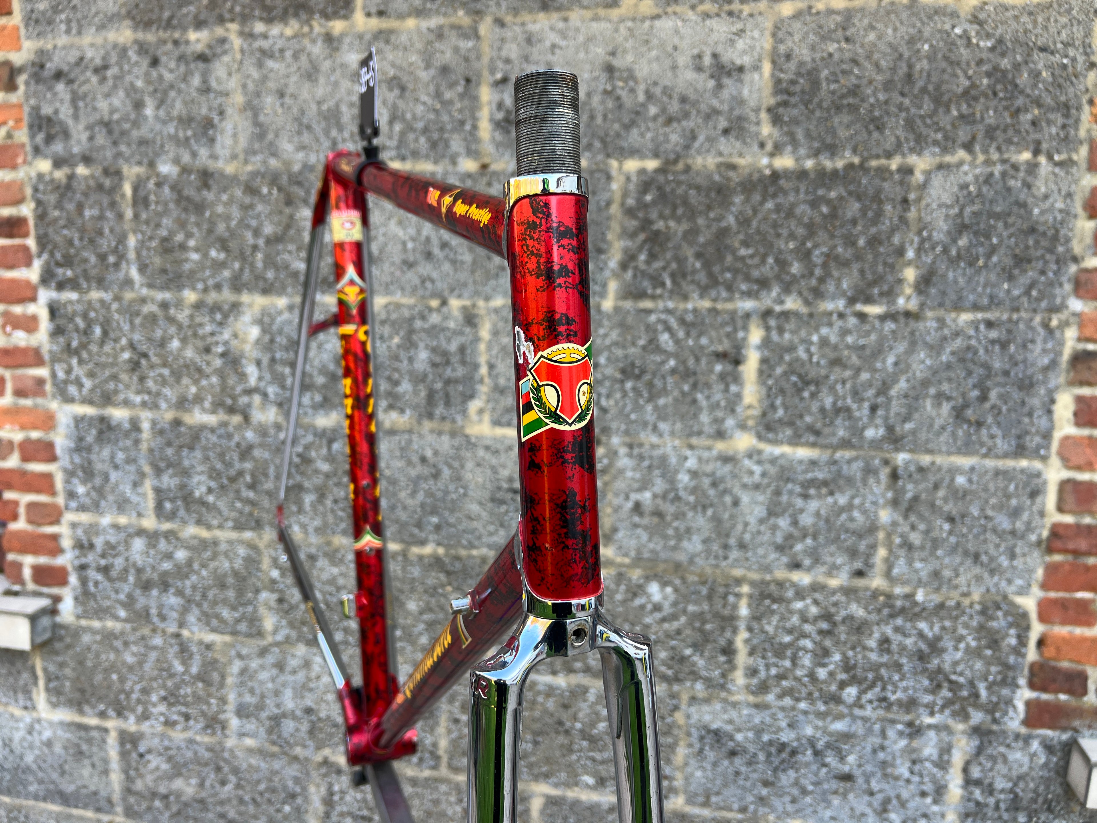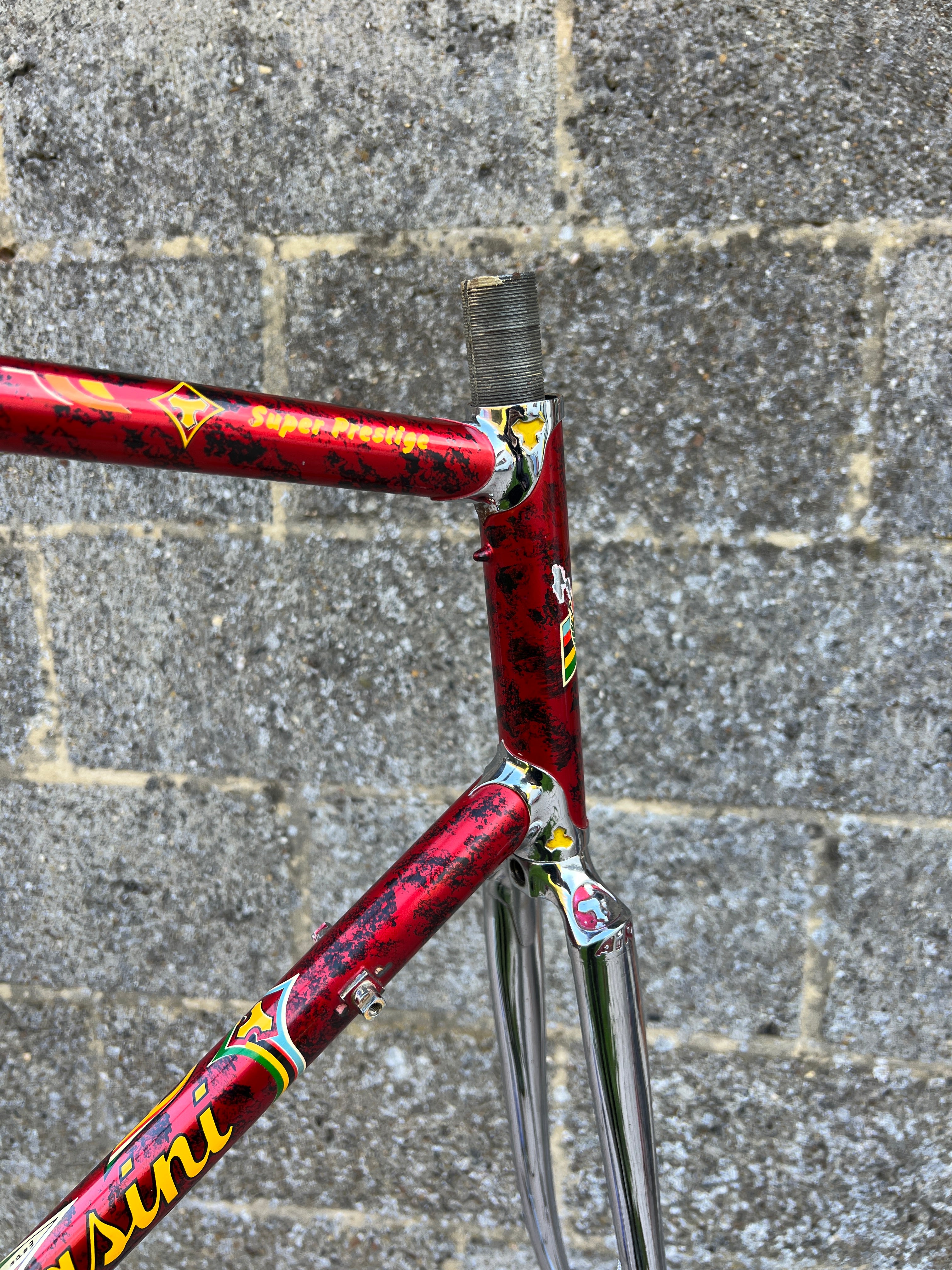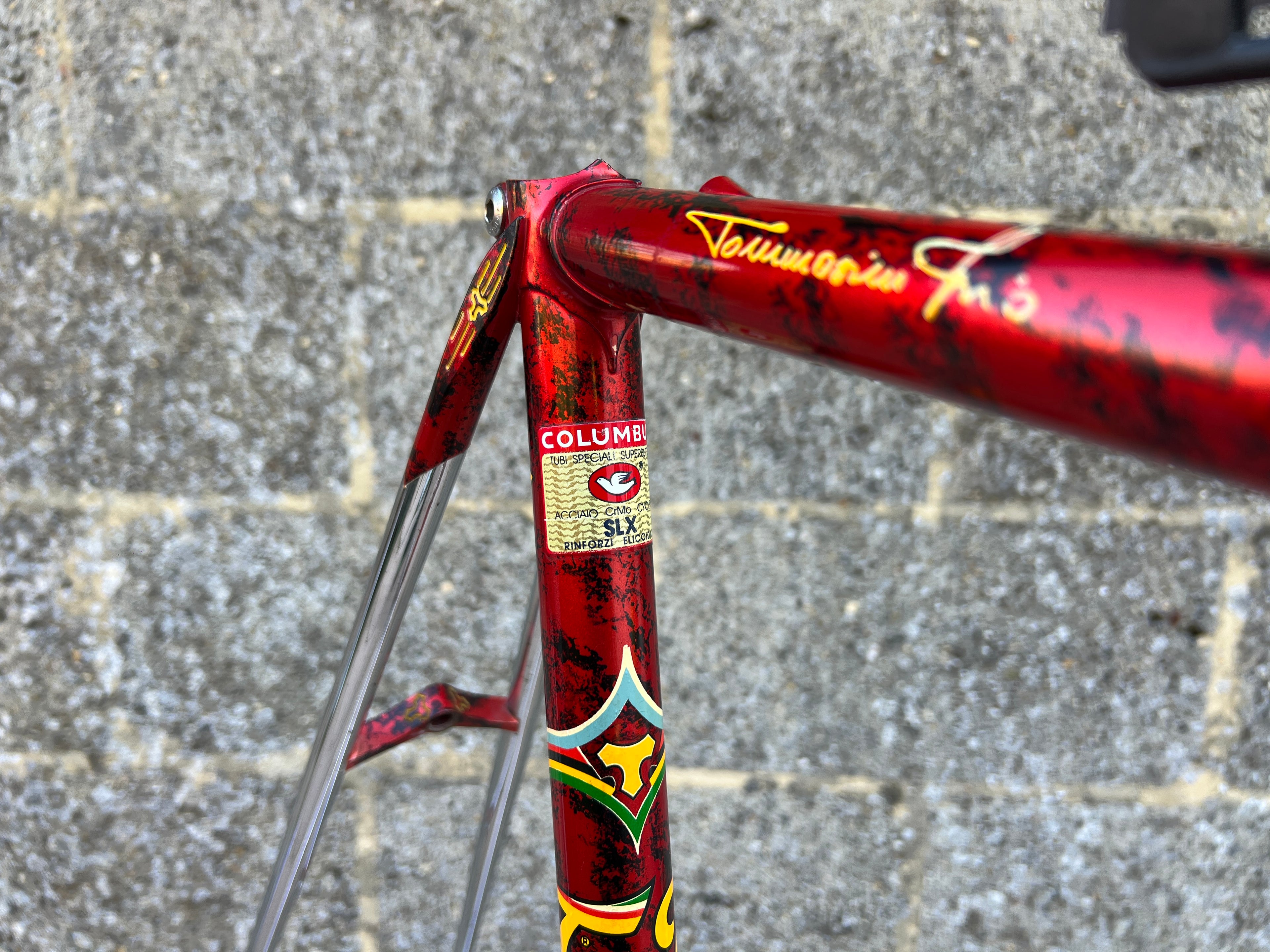 Introduced in the mid 1980s, the Tommasini Super Prestige quickly became the brand’s flagship model and an icon among Italian steel racing frames. Like every Tommasini, it showcases exceptional attention to detail. Beautifully cut and hand-finished lugs, elegant engravings, and precise craftsmanship throughout. This Tommasini Super Prestige SLX is constructed from the legendary Columbus SLX tubing. Renowned for its performance, stiffness, and refined ride quality. The original paint is beautifully preserved, showing only a few small marks acquired over the years. The original chrome also remains in fine condition with minor imperfections that add to its authenticity and timeless charm. Every detail reflects Tommasini’s unwavering dedication to perfection. A true work of Italian art. A timeless piece of cycling history for the discerning collector or rider who appreciates the very finest in Italian framebuilding tradition. The perfect frameset to complete with Record, Super Record, C-Record, Chorus, or Athena groupsets.