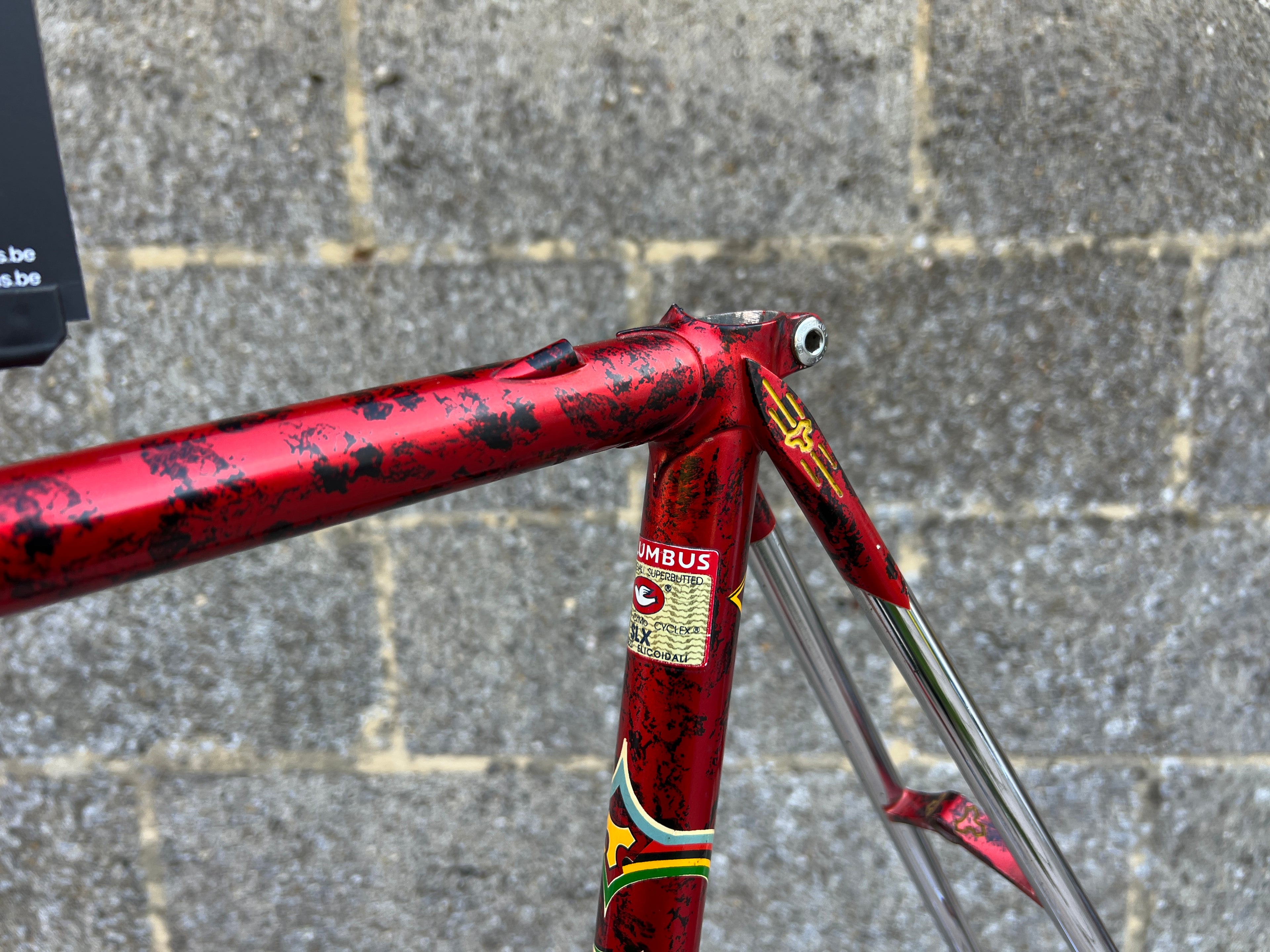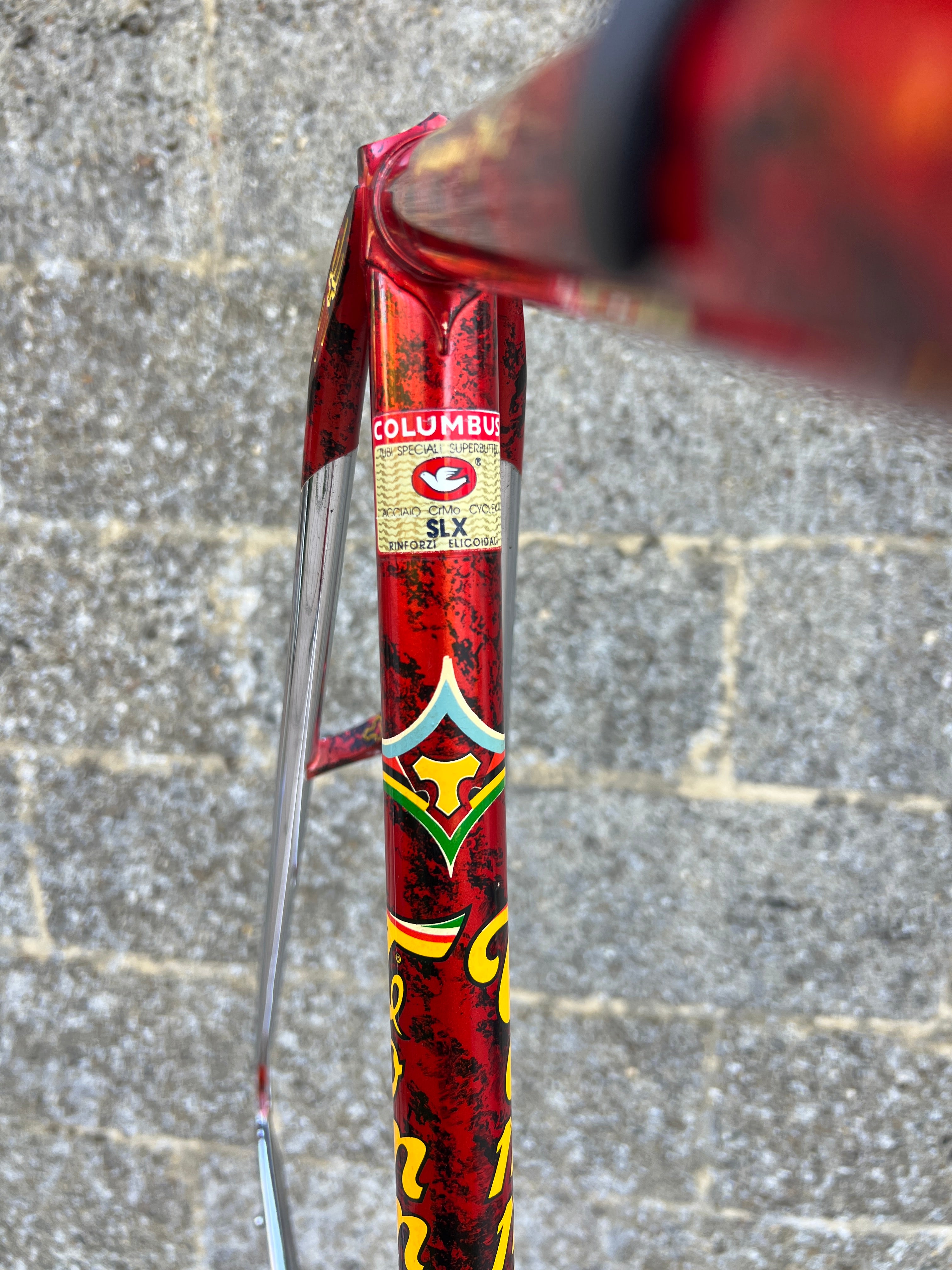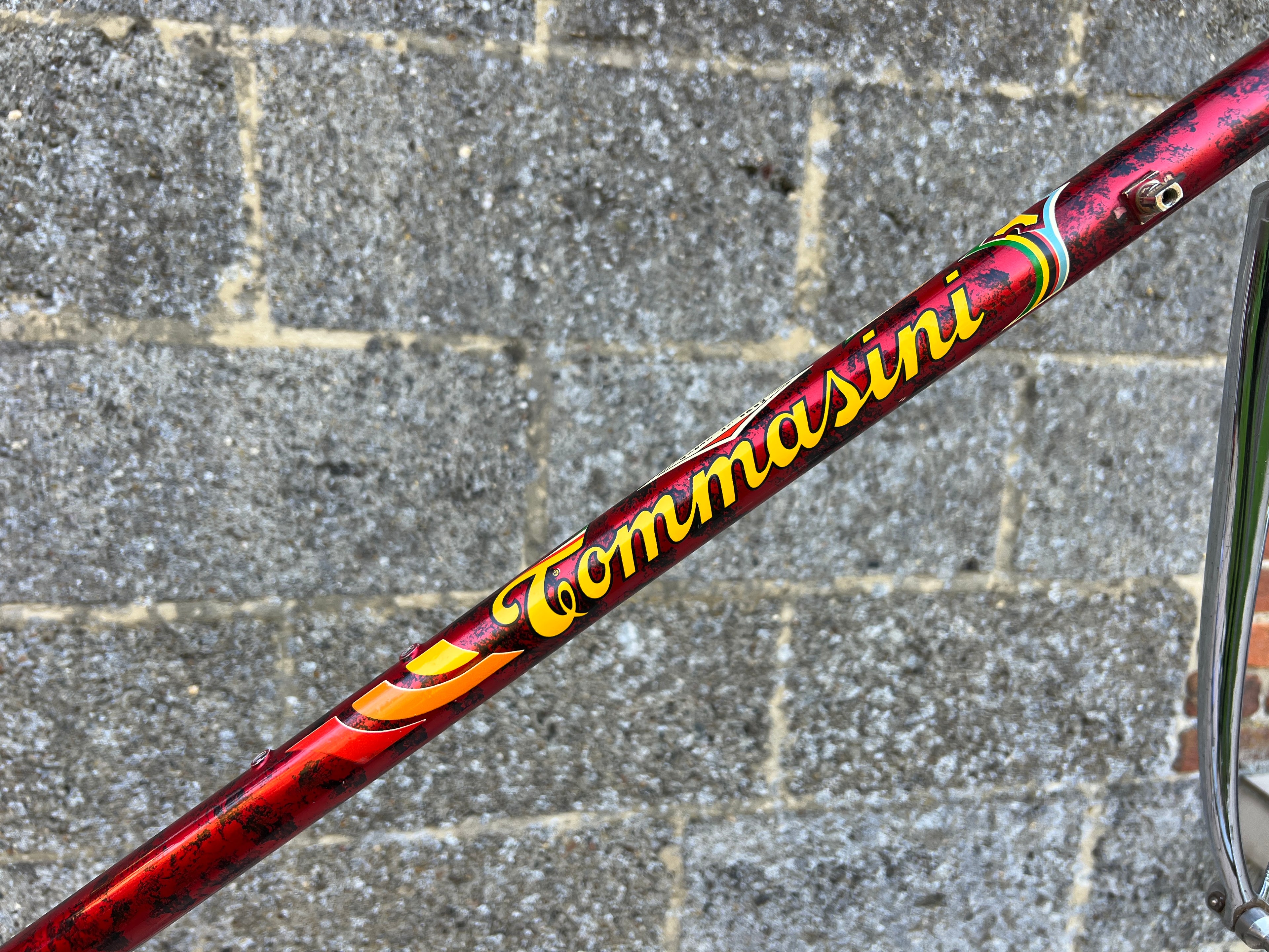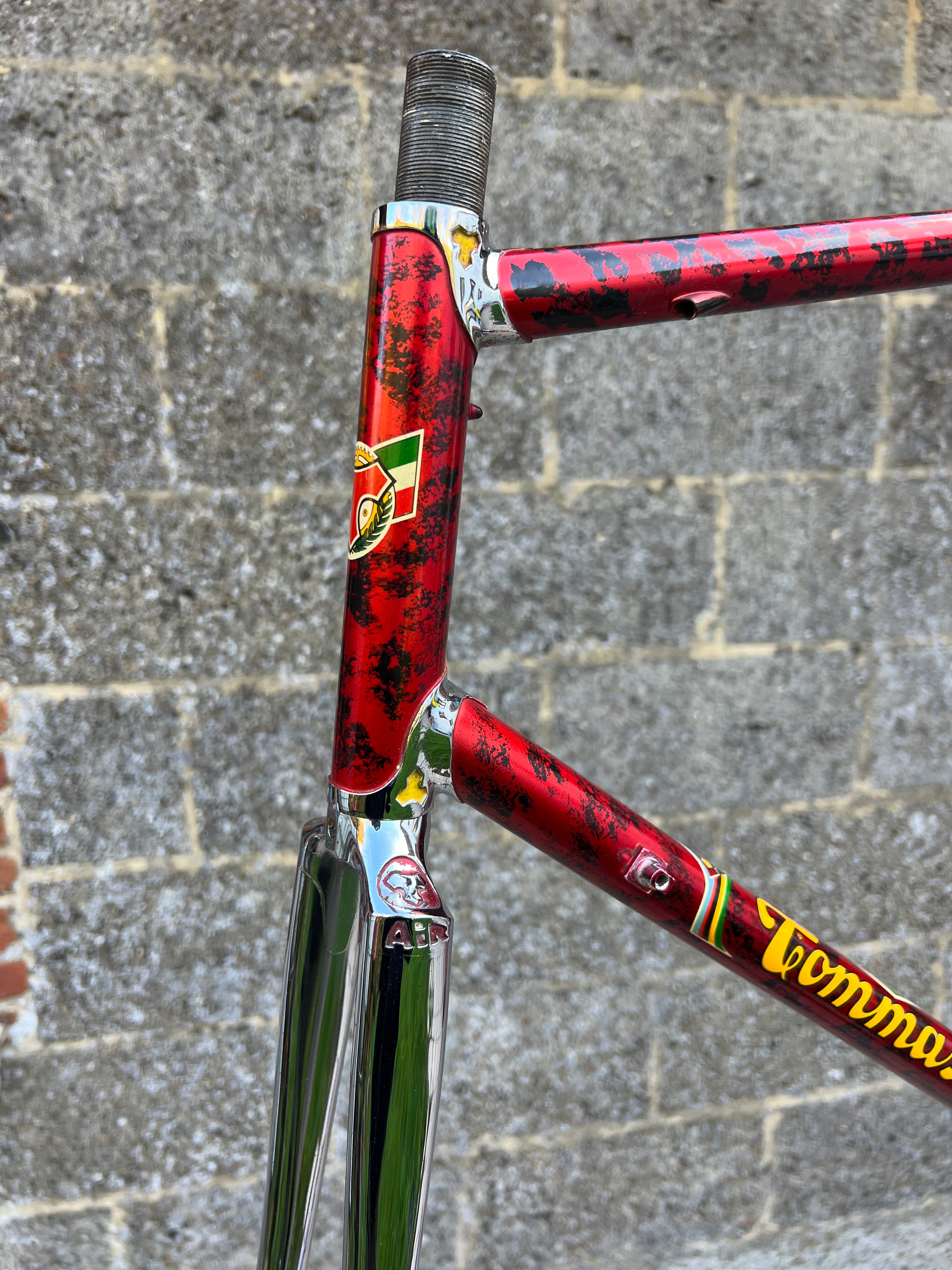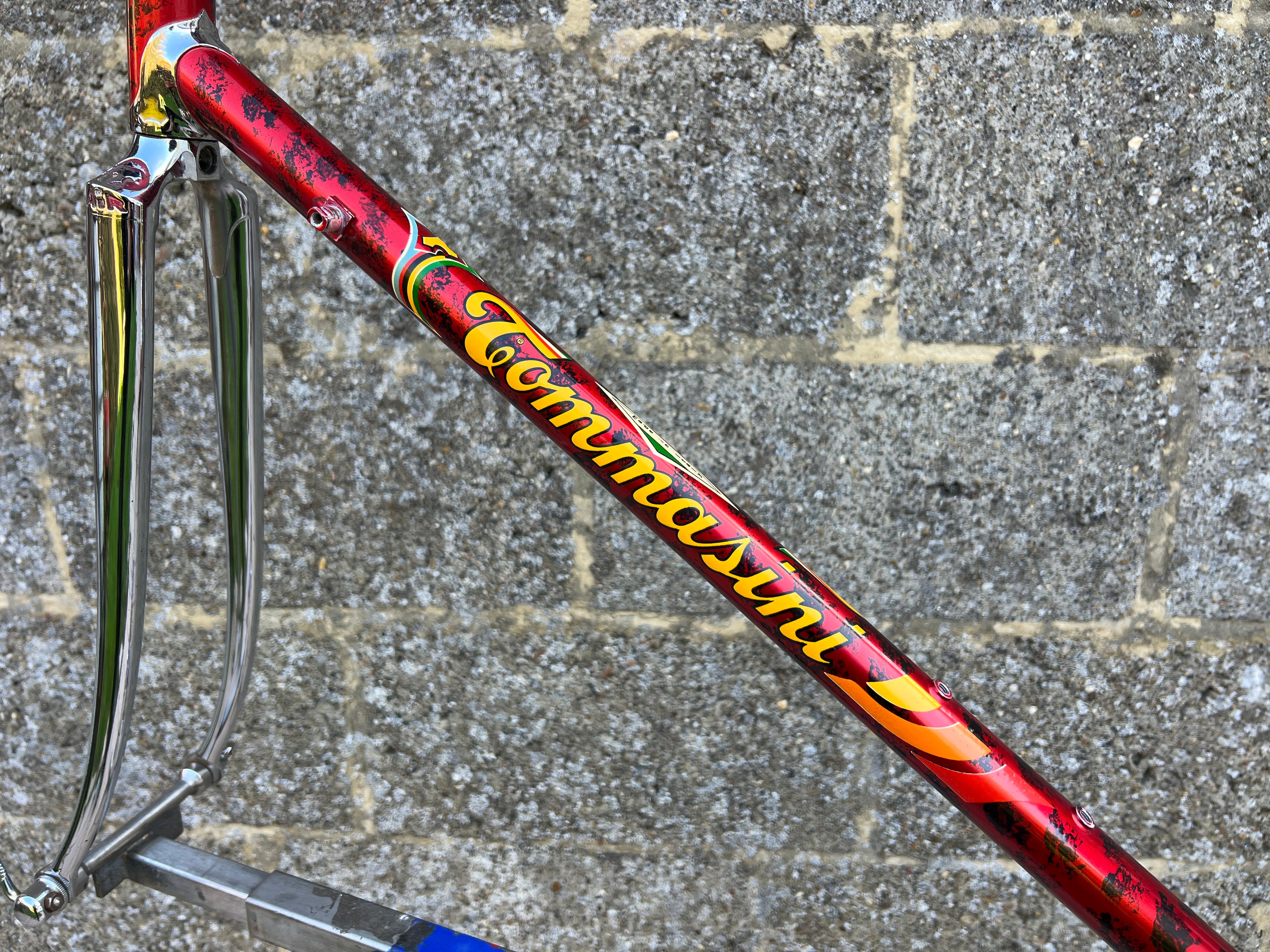 Introduced in the mid 1980s, the Tommasini Super Prestige quickly became the brand’s flagship model and an icon among Italian steel racing frames. Like every Tommasini, it showcases exceptional attention to detail. Beautifully cut and hand-finished lugs, elegant engravings, and precise craftsmanship throughout. This Tommasini Super Prestige SLX is constructed from the legendary Columbus SLX tubing. Renowned for its performance, stiffness, and refined ride quality. The original paint is beautifully preserved, showing only a few small marks acquired over the years. The original chrome also remains in fine condition with minor imperfections that add to its authenticity and timeless charm. Every detail reflects Tommasini’s unwavering dedication to perfection. A true work of Italian art. A timeless piece of cycling history for the discerning collector or rider who appreciates the very finest in Italian framebuilding tradition. The perfect frameset to complete with Record, Super Record, C-Record, Chorus, or Athena groupsets.