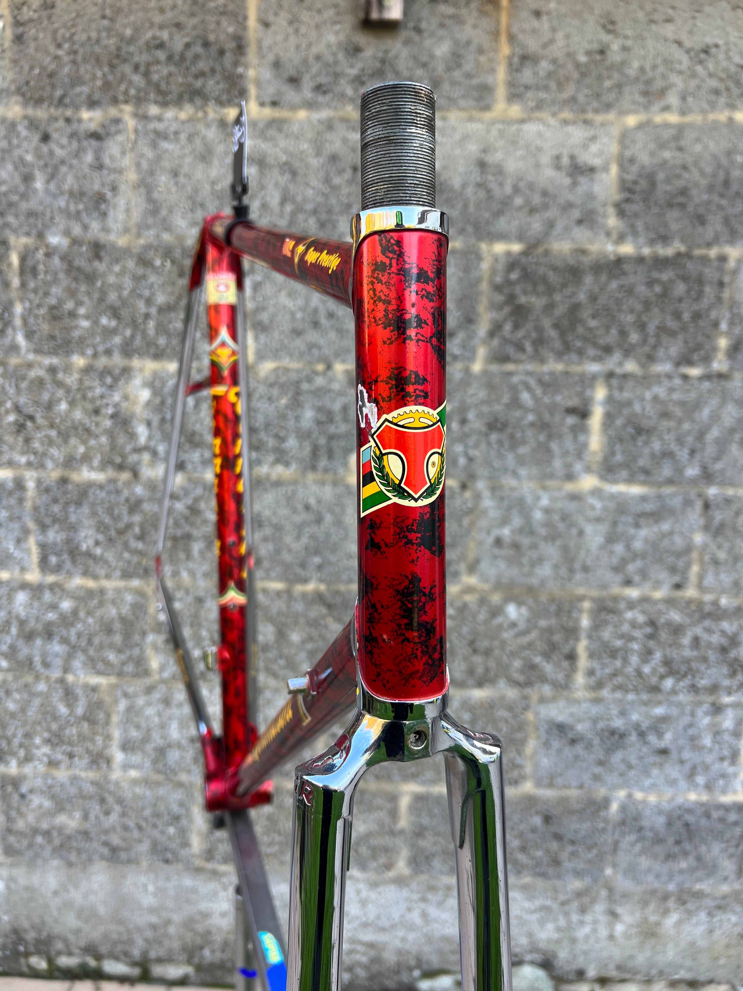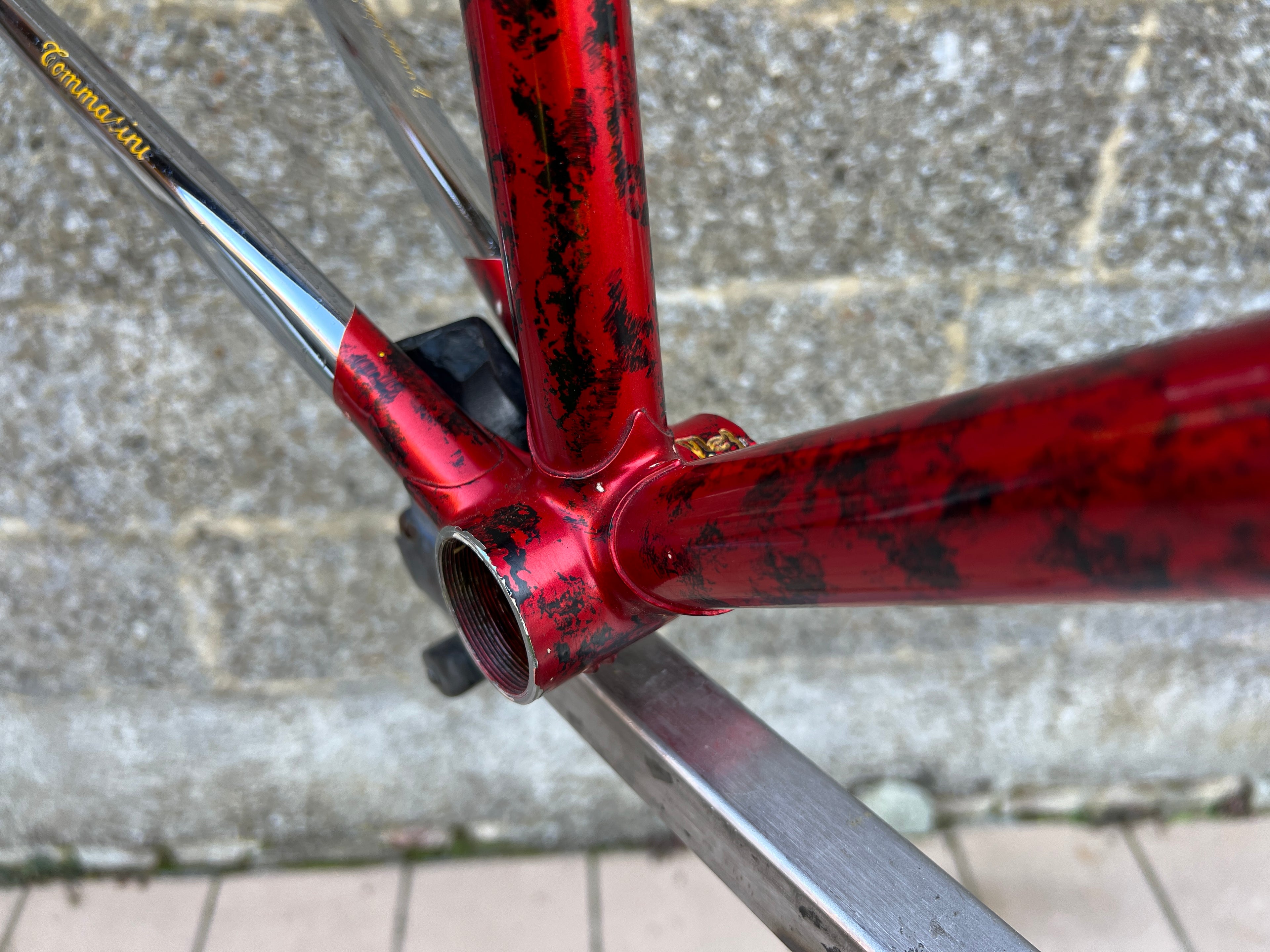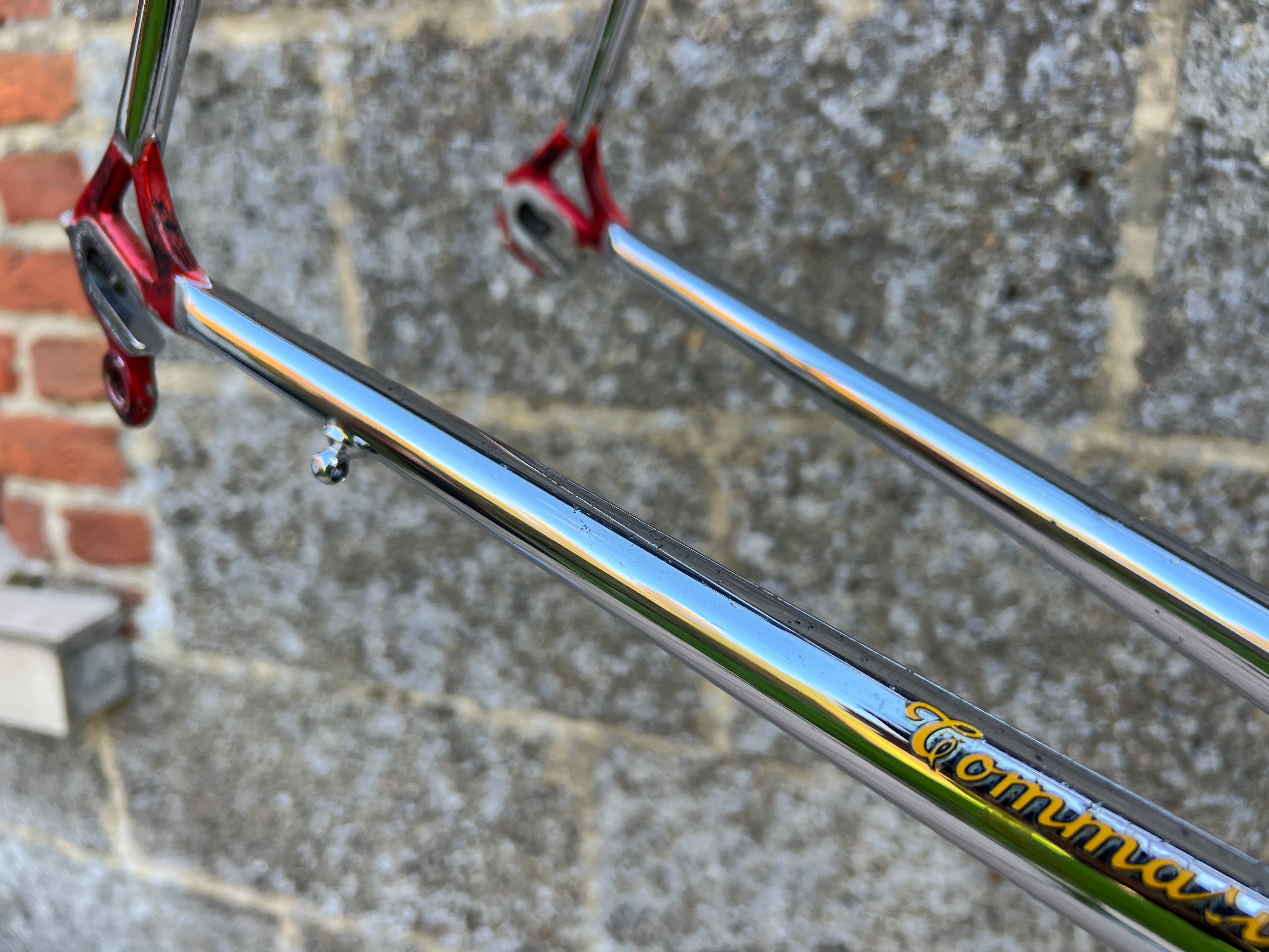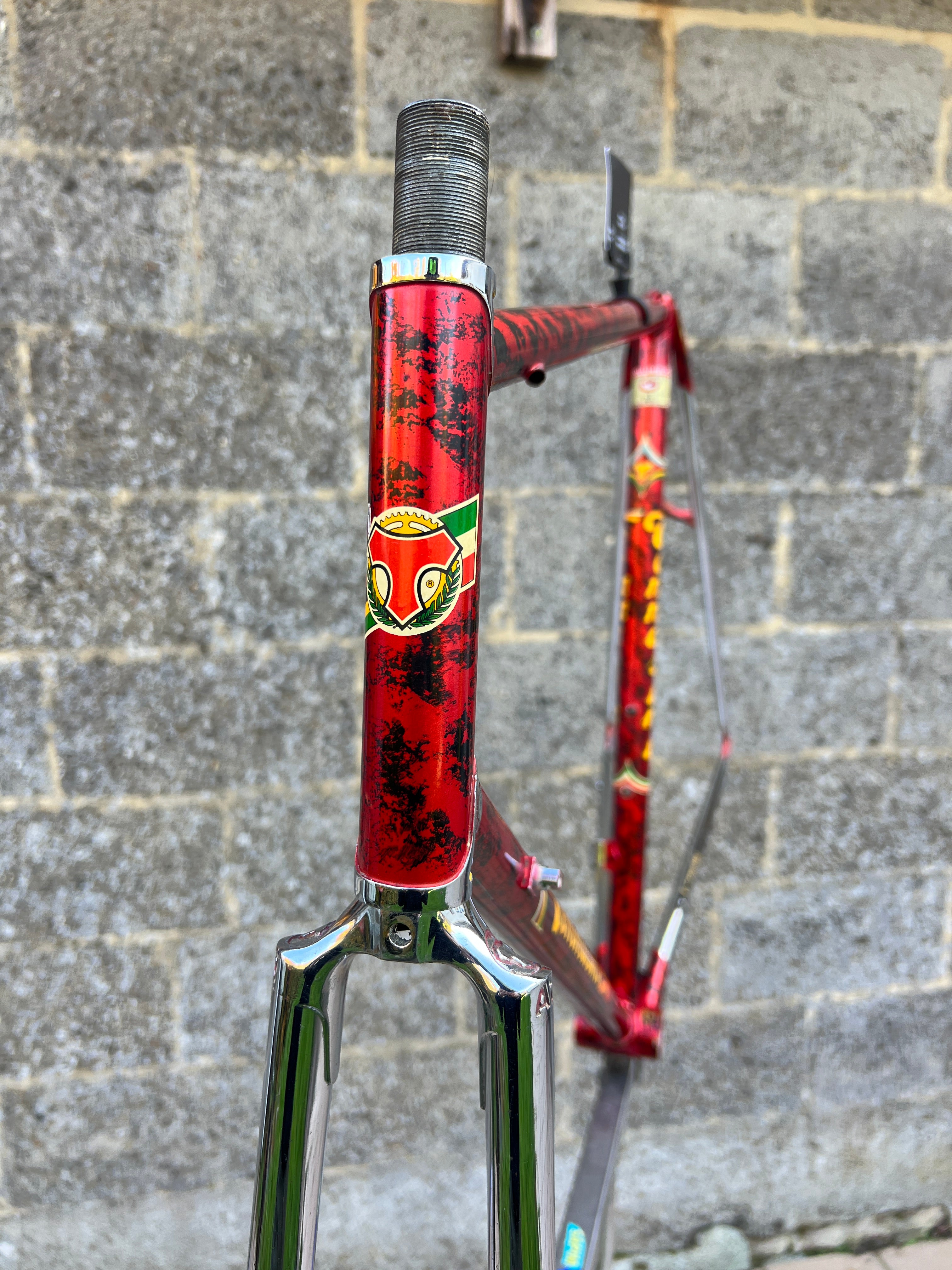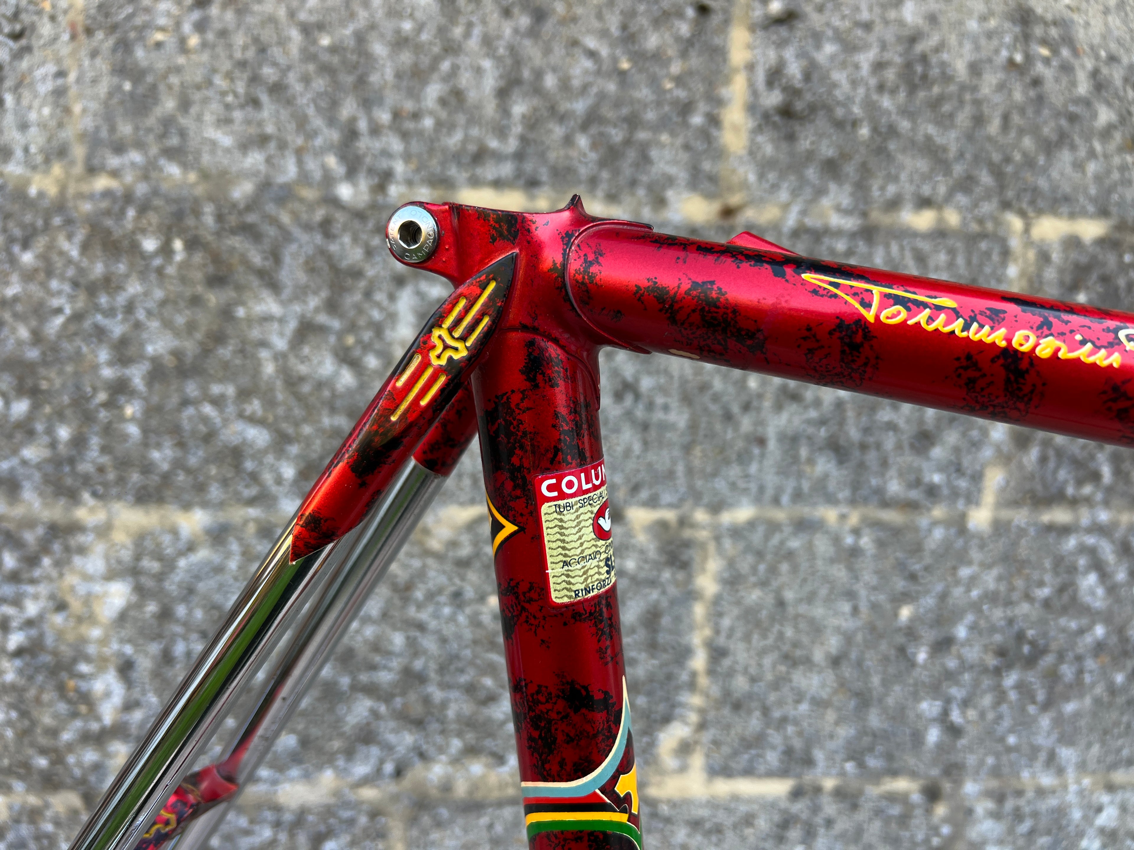Introduced in the mid 1980s, the Tommasini Super Prestige quickly became the brand’s flagship model and an icon among Italian steel racing frames. Like every Tommasini, it showcases exceptional attention to detail. Beautifully cut and hand-finished lugs, elegant engravings, and precise craftsmanship throughout. This Tommasini Super Prestige SLX is constructed from the legendary Columbus SLX tubing. Renowned for its performance, stiffness, and refined ride quality. The original paint is beautifully preserved, showing only a few small marks acquired over the years. The original chrome also remains in fine condition with minor imperfections that add to its authenticity and timeless charm. Every detail reflects Tommasini’s unwavering dedication to perfection. A true work of Italian art. A timeless piece of cycling history for the discerning collector or rider who appreciates the very finest in Italian framebuilding tradition. The perfect frameset to complete with Record, Super Record, C-Record, Chorus, or Athena groupsets.