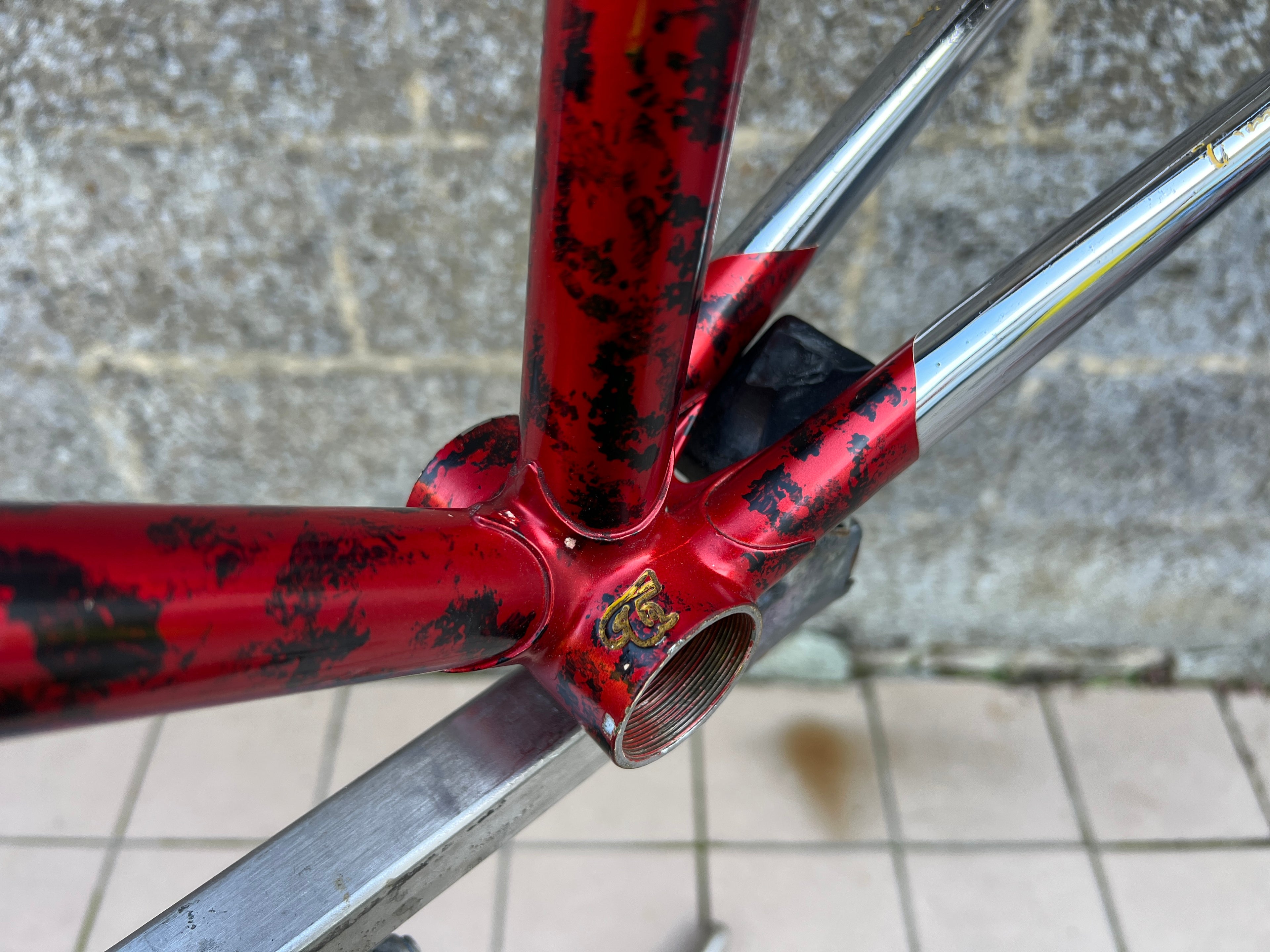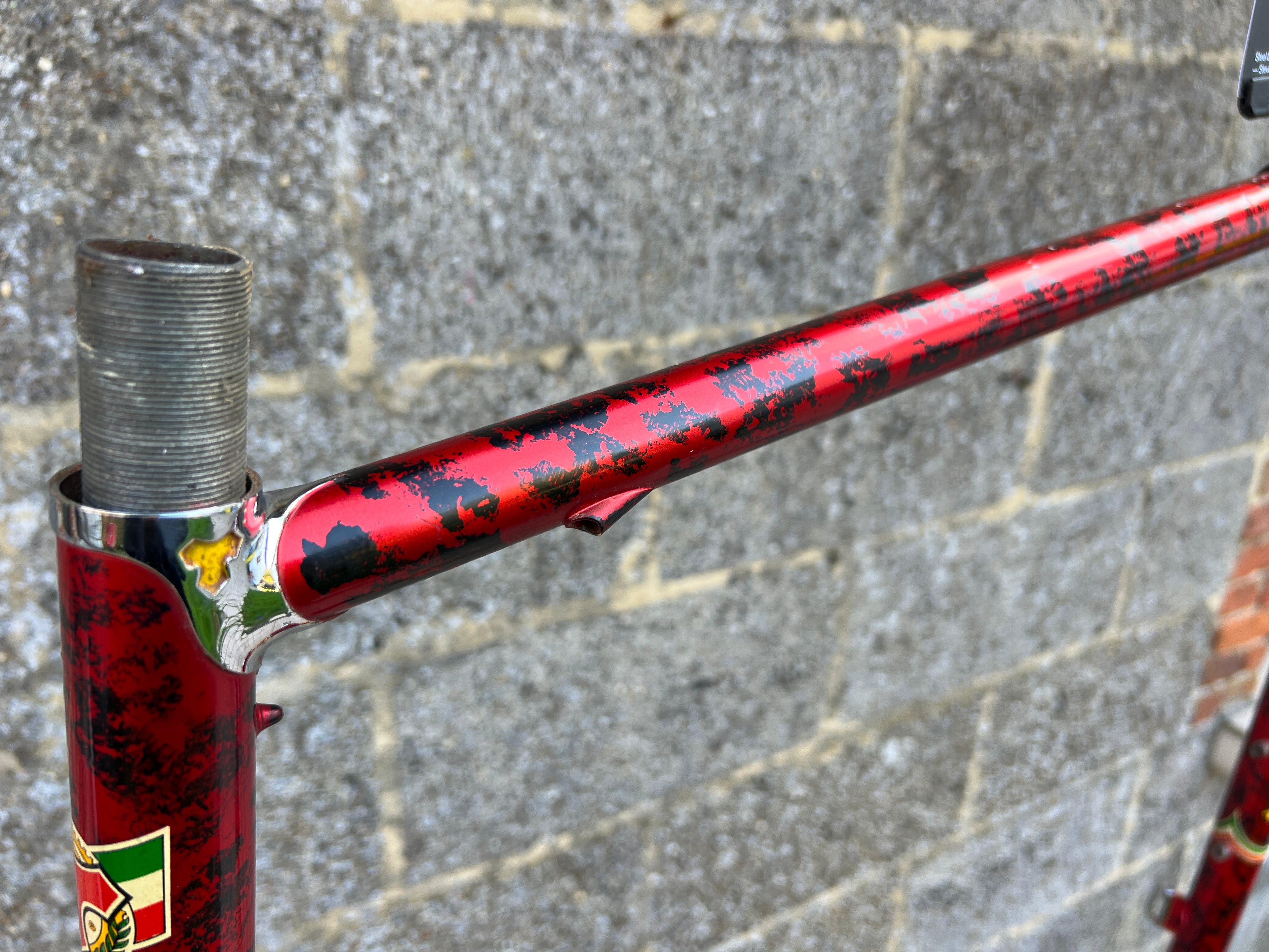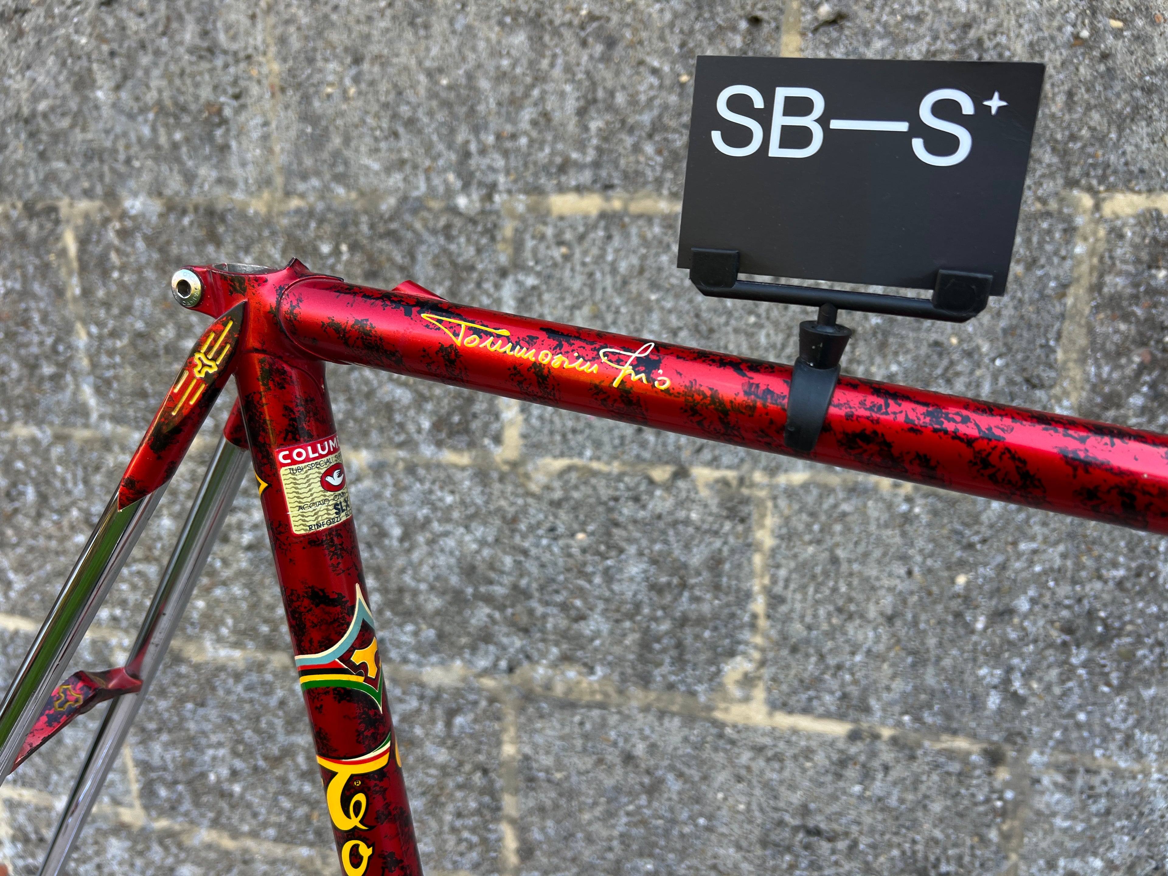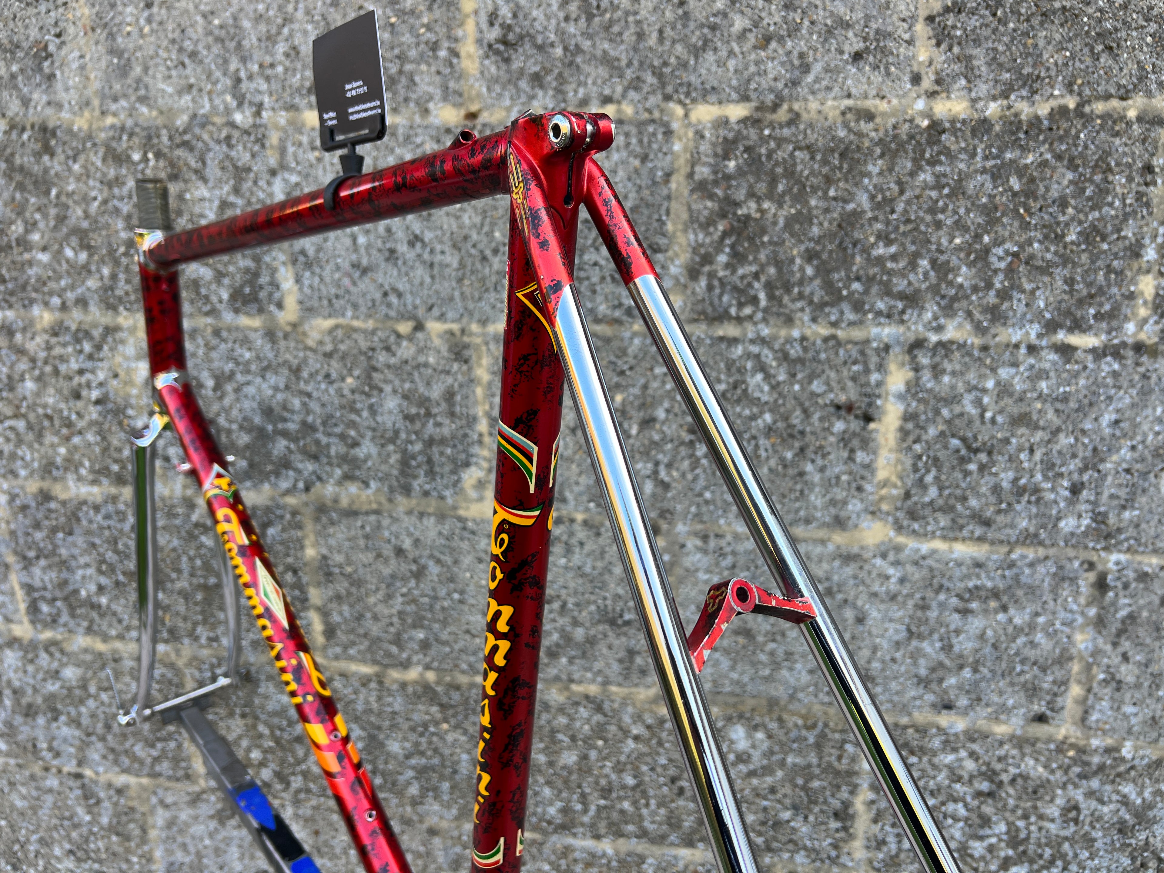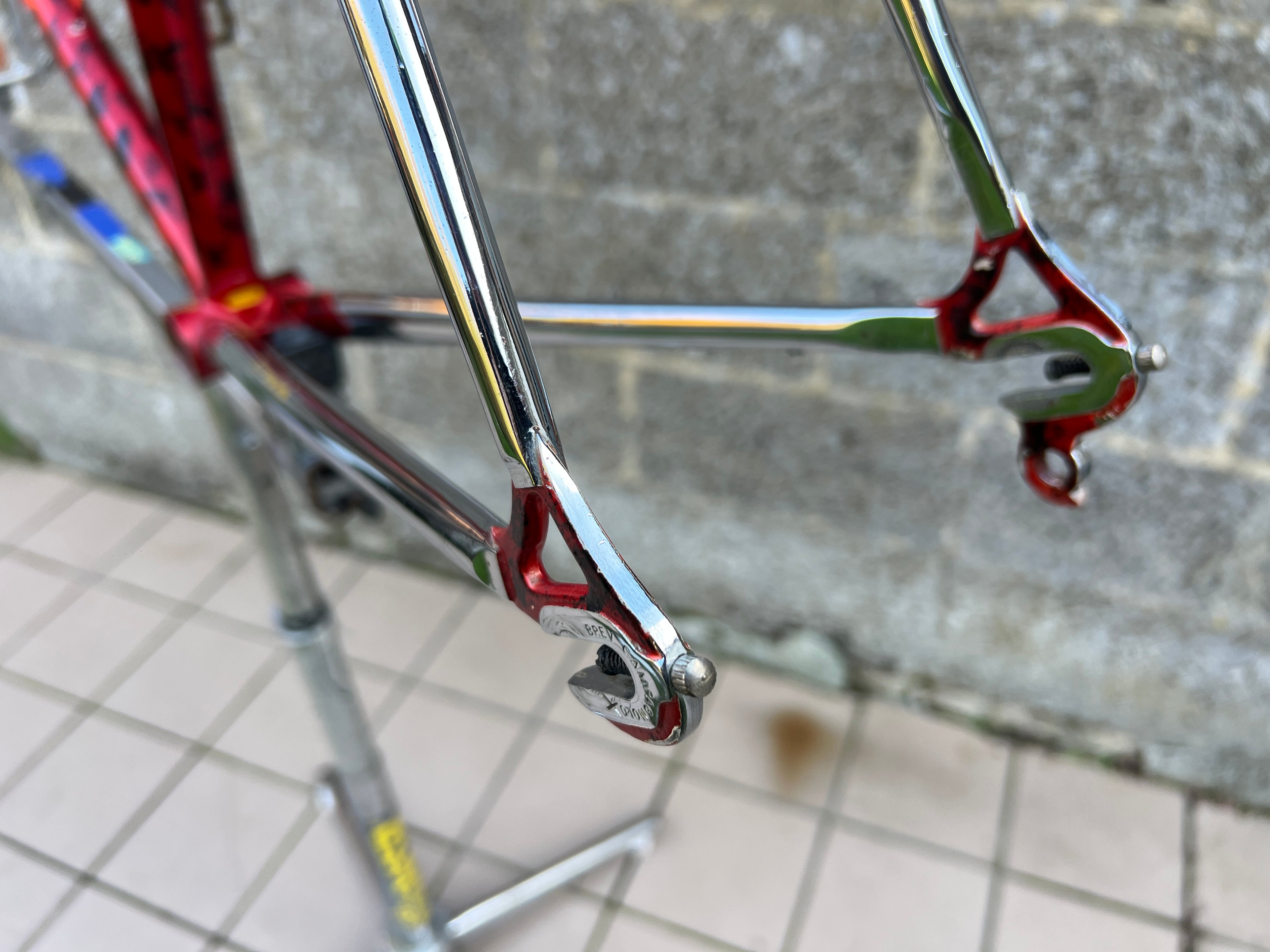 Introduced in the mid 1980s, the Tommasini Super Prestige quickly became the brand’s flagship model and an icon among Italian steel racing frames. Like every Tommasini, it showcases exceptional attention to detail. Beautifully cut and hand-finished lugs, elegant engravings, and precise craftsmanship throughout. This Tommasini Super Prestige SLX is constructed from the legendary Columbus SLX tubing. Renowned for its performance, stiffness, and refined ride quality. The original paint is beautifully preserved, showing only a few small marks acquired over the years. The original chrome also remains in fine condition with minor imperfections that add to its authenticity and timeless charm. Every detail reflects Tommasini’s unwavering dedication to perfection. A true work of Italian art. A timeless piece of cycling history for the discerning collector or rider who appreciates the very finest in Italian framebuilding tradition. The perfect frameset to complete with Record, Super Record, C-Record, Chorus, or Athena groupsets.