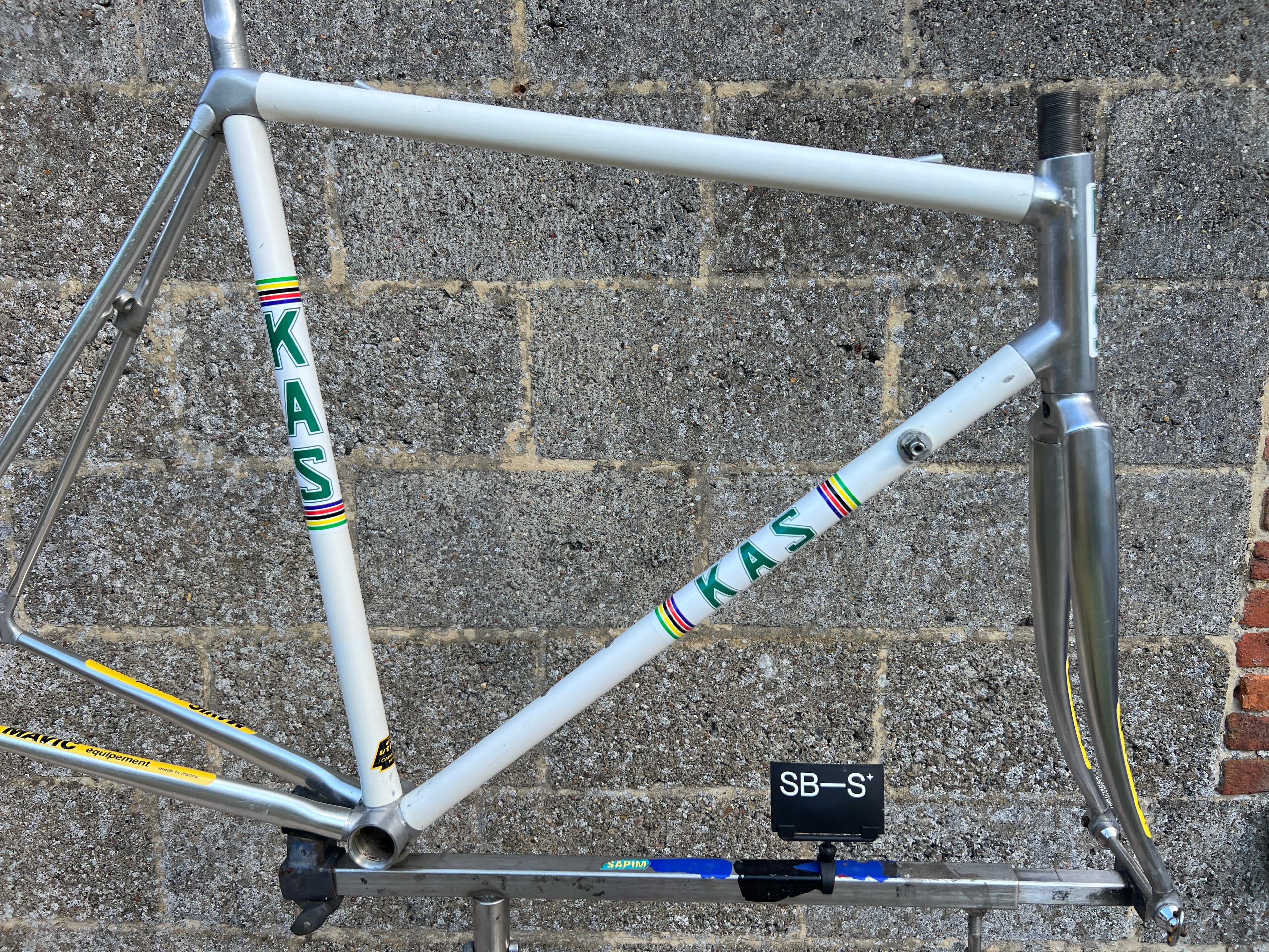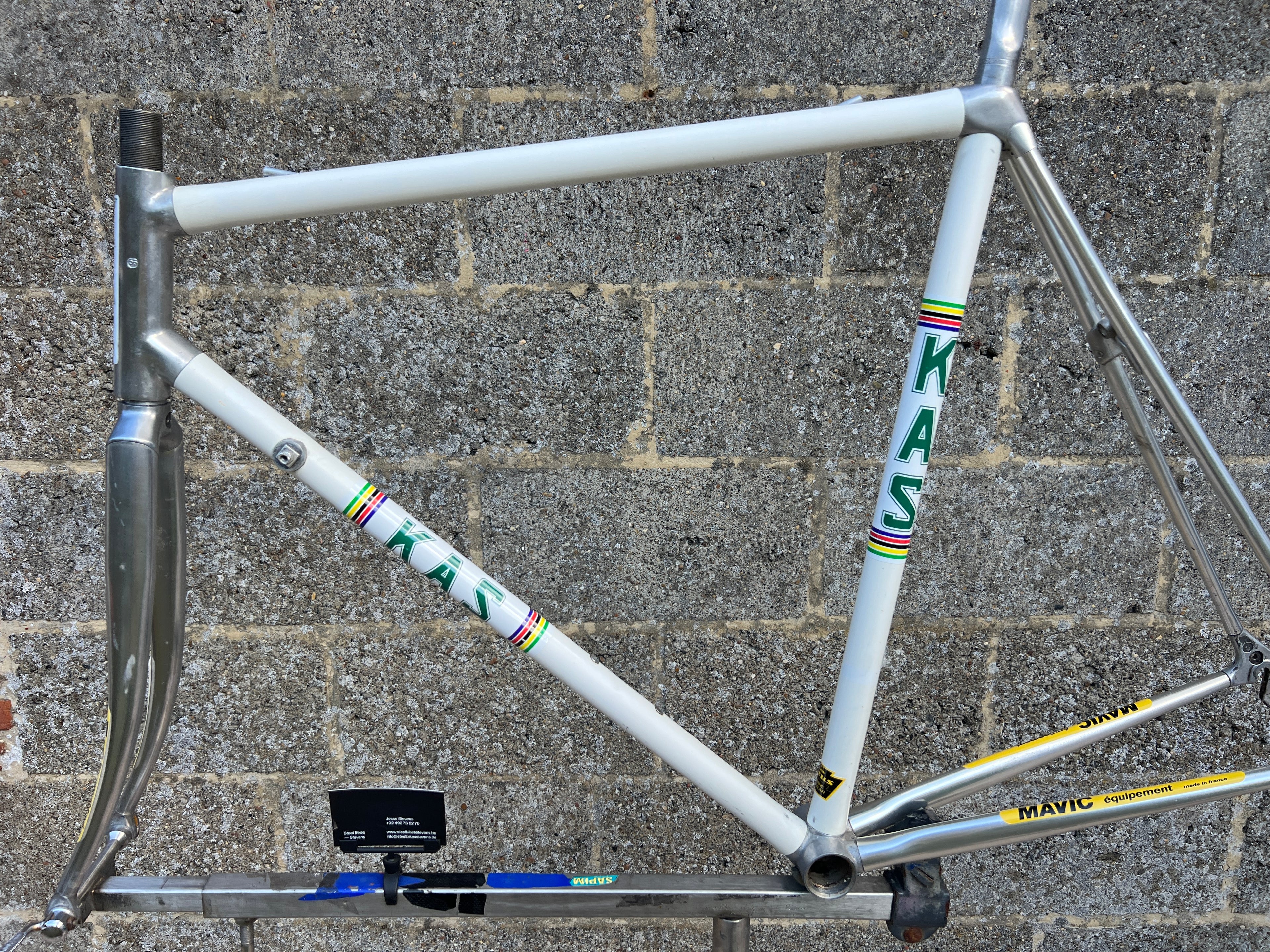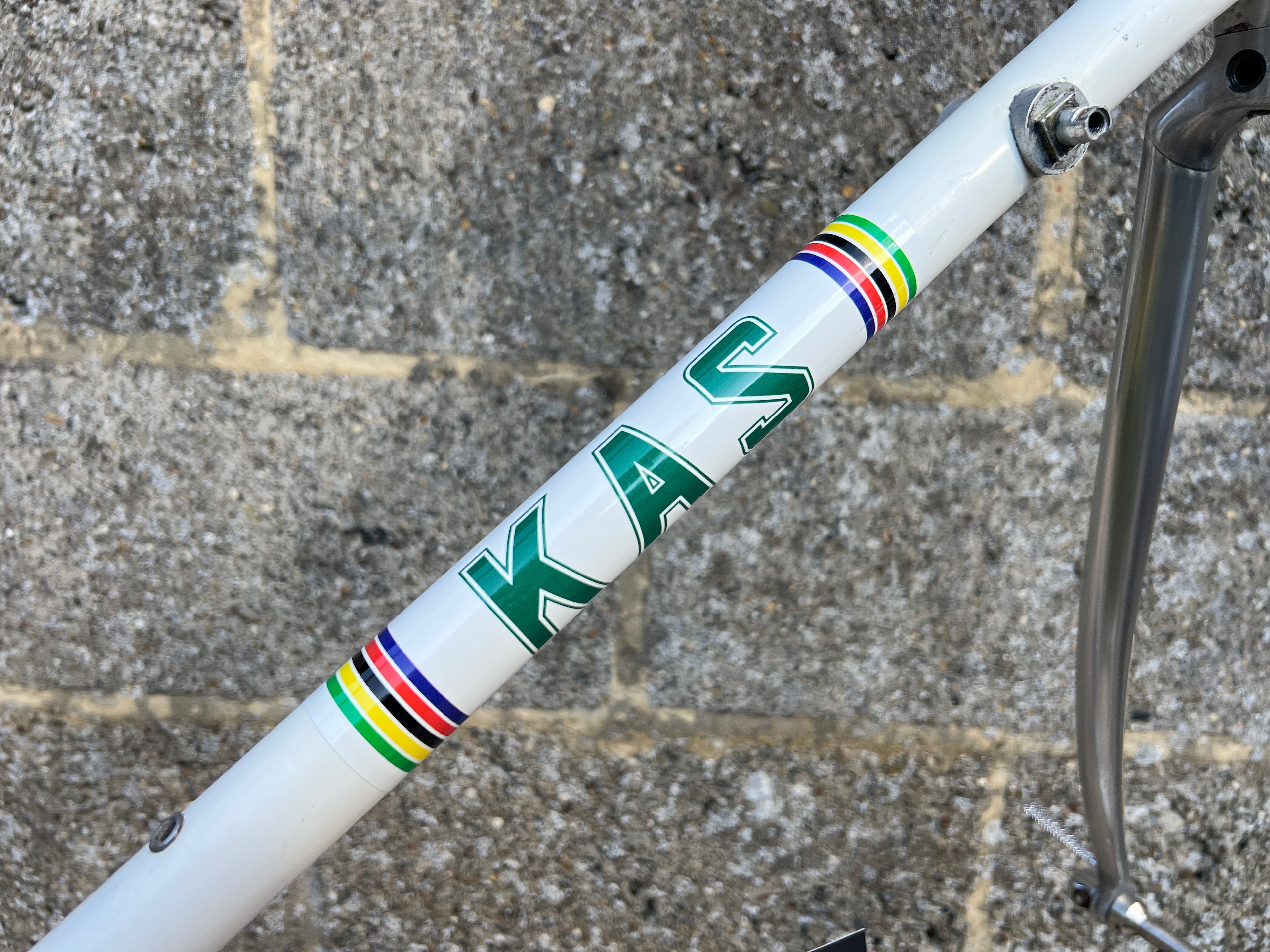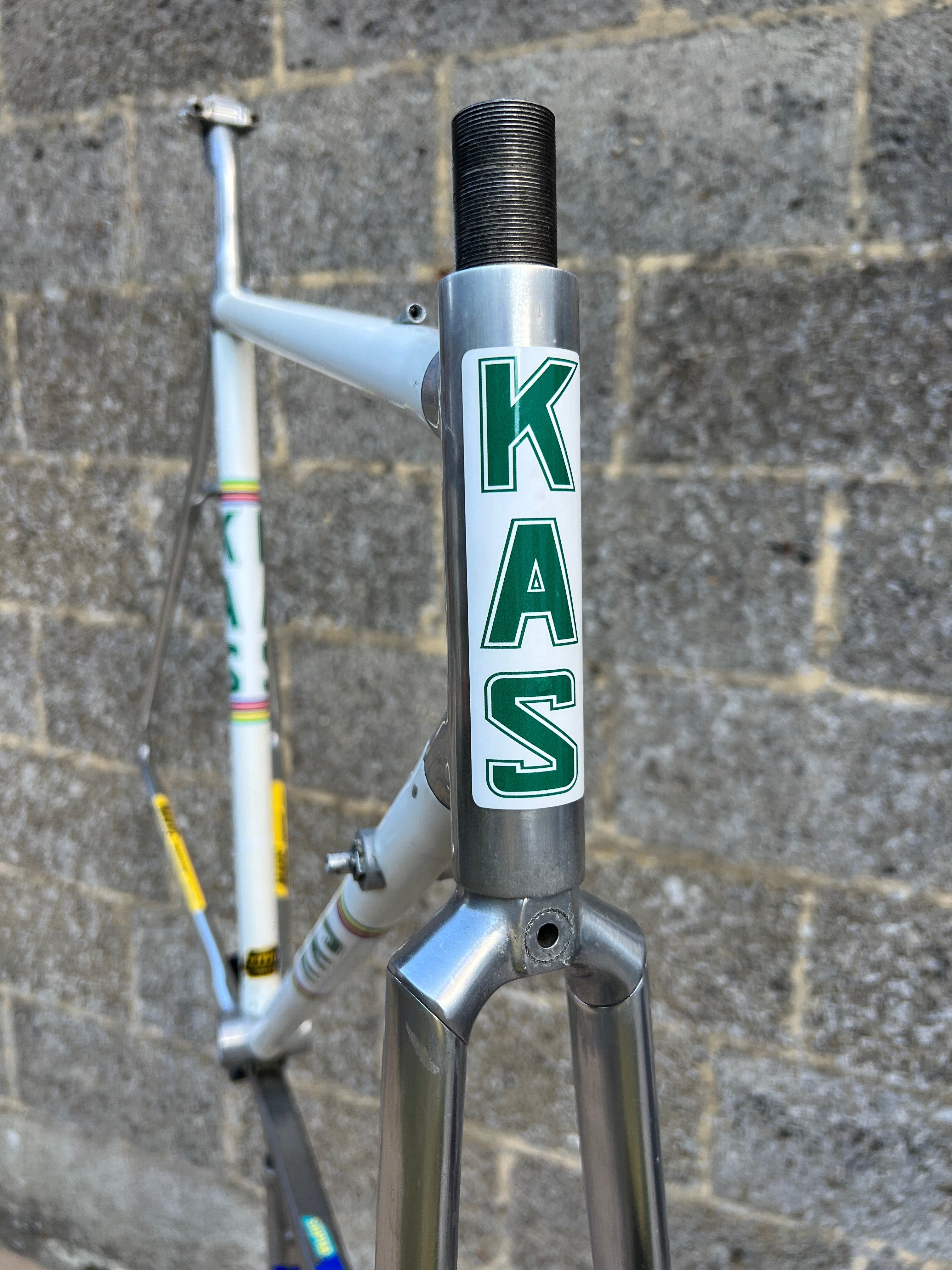 A white Vitus frameset is quite rare to see. Combined with the KAS Team Replica design, this makes the frameset highly collectible and desirable for collectors and cycling enthusiasts. The 25mm Campagnolo seatpost is included in the deal.