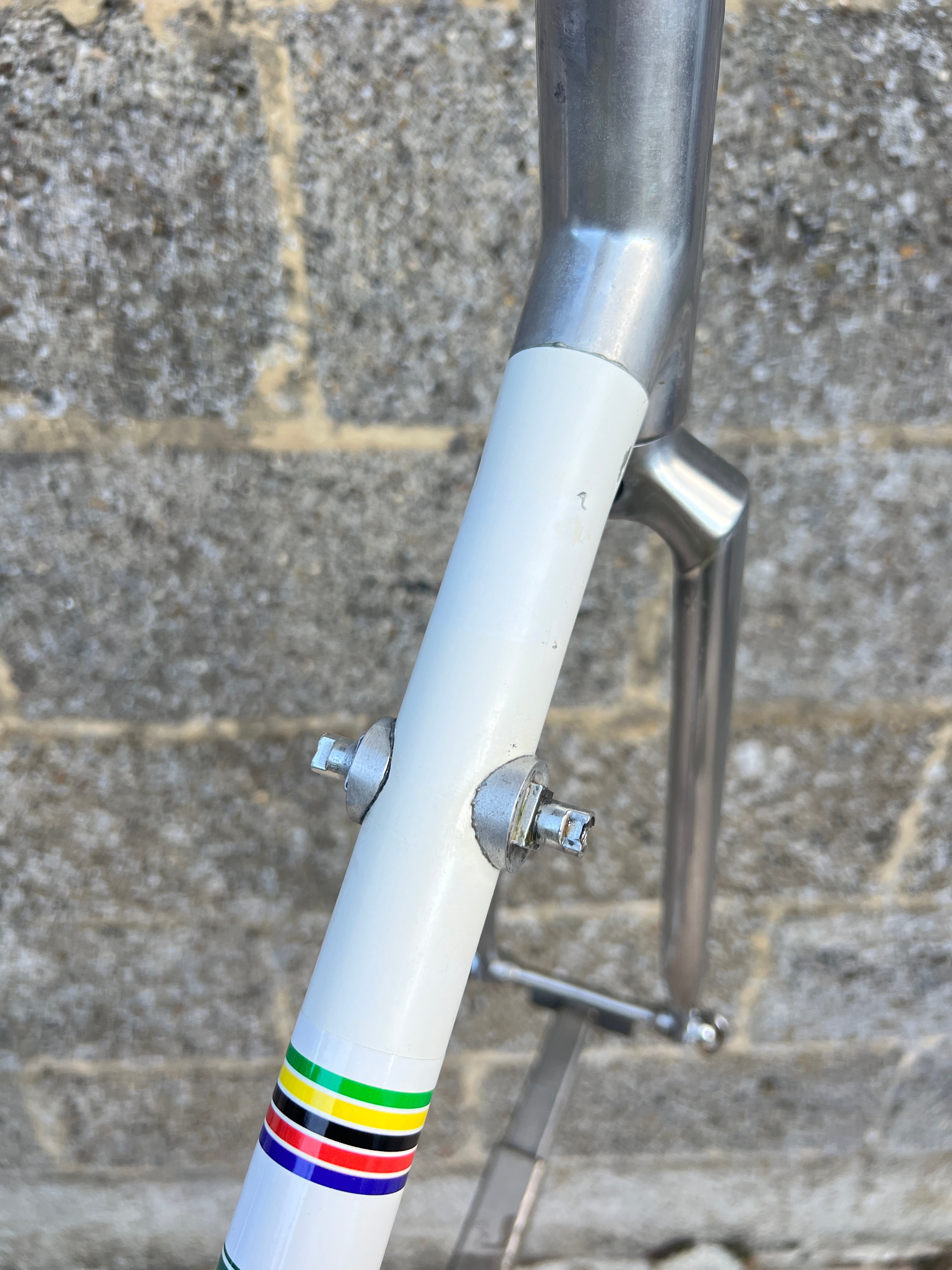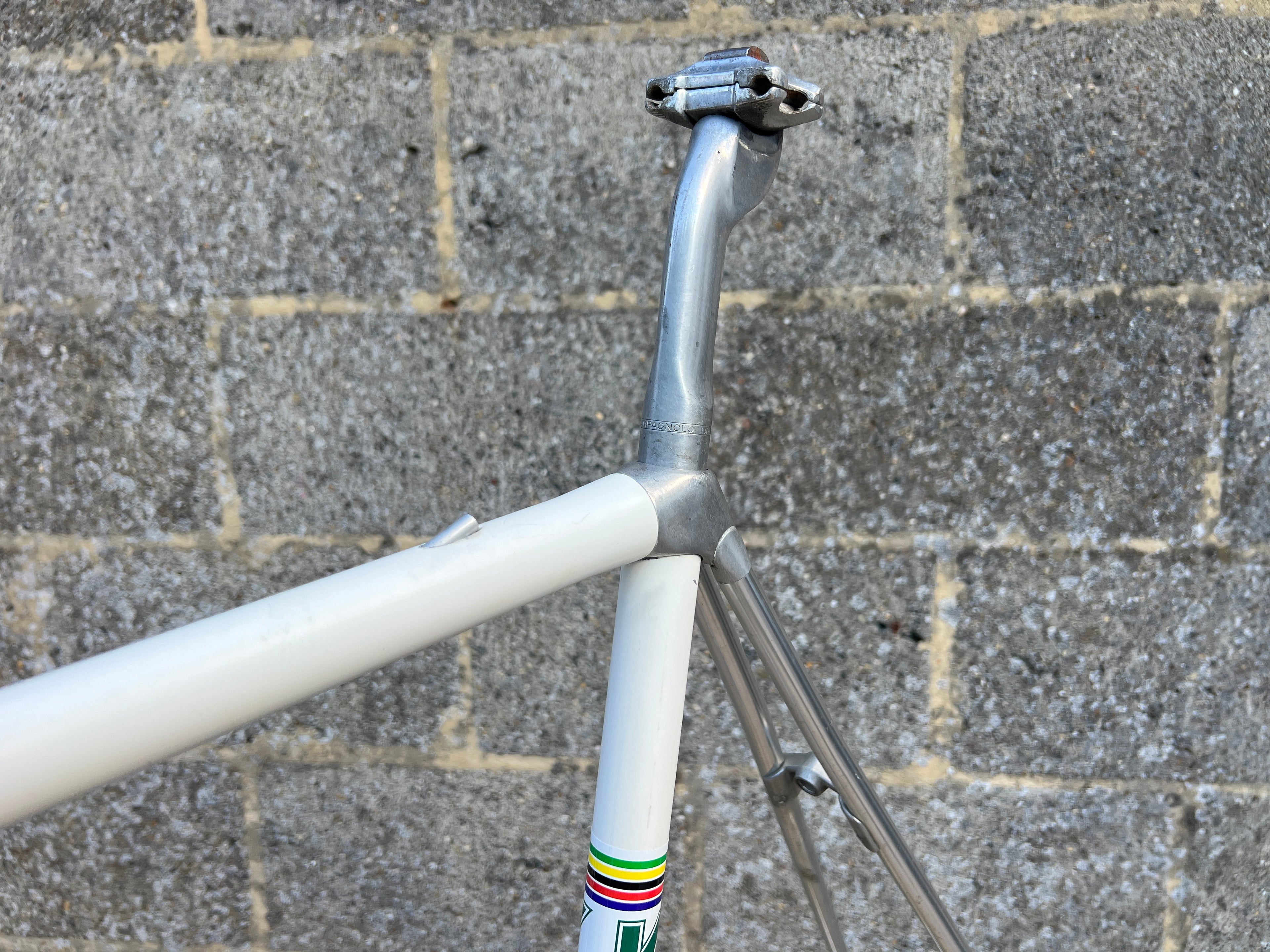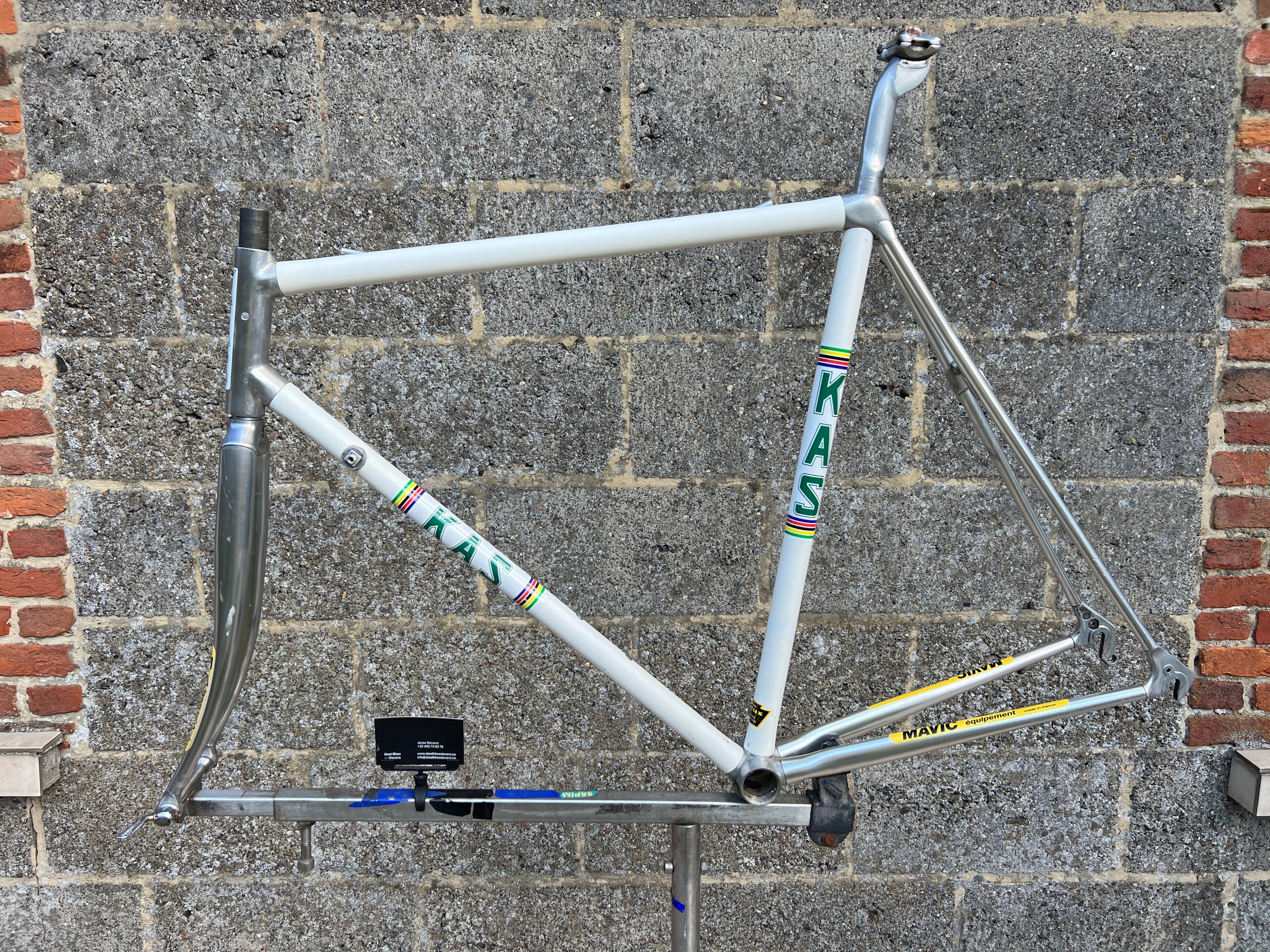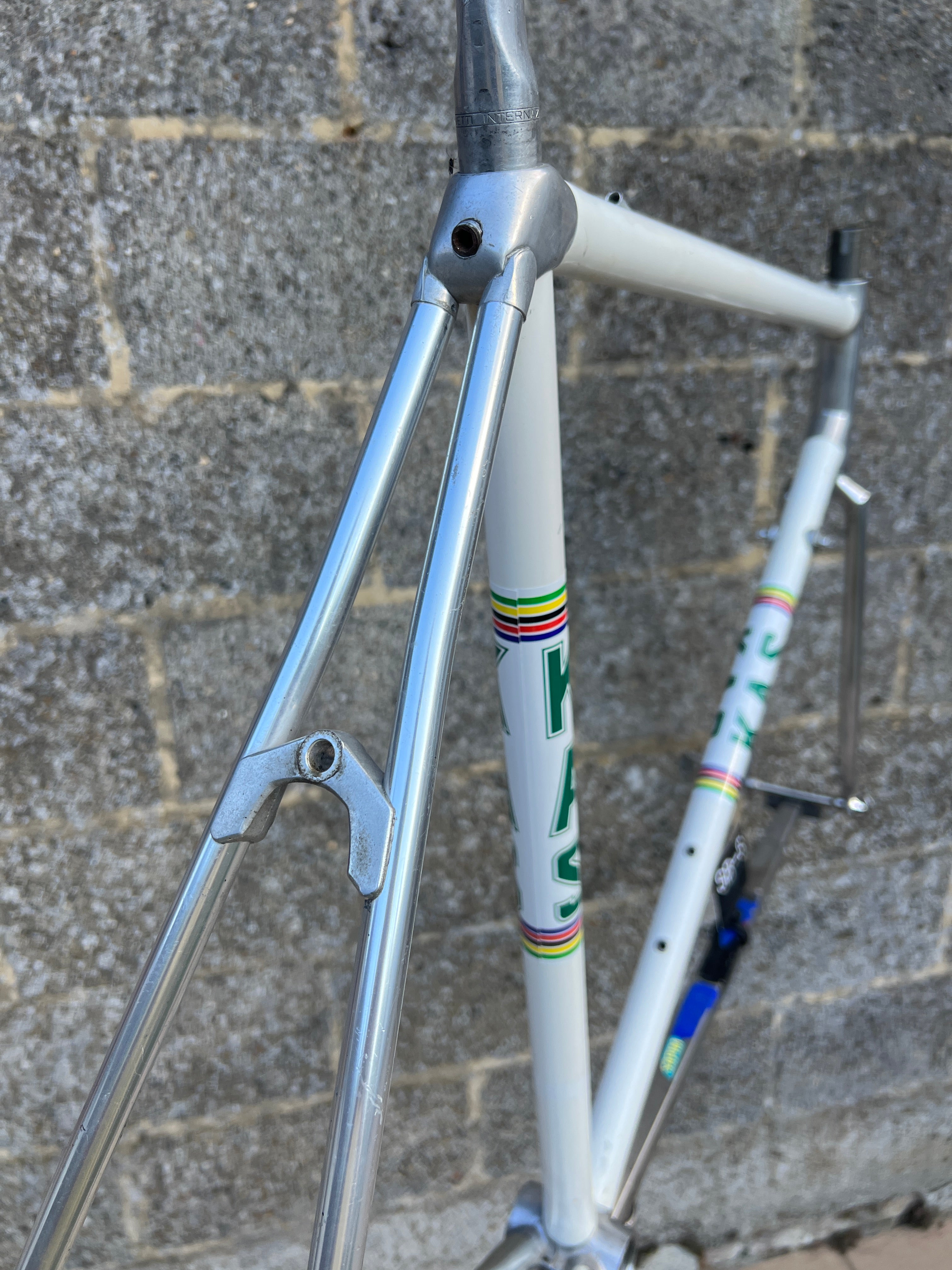 A white Vitus frameset is quite rare to see. Combined with the KAS Team Replica design, this makes the frameset highly collectible and desirable for collectors and cycling enthusiasts. The 25mm Campagnolo seatpost is included in the deal.